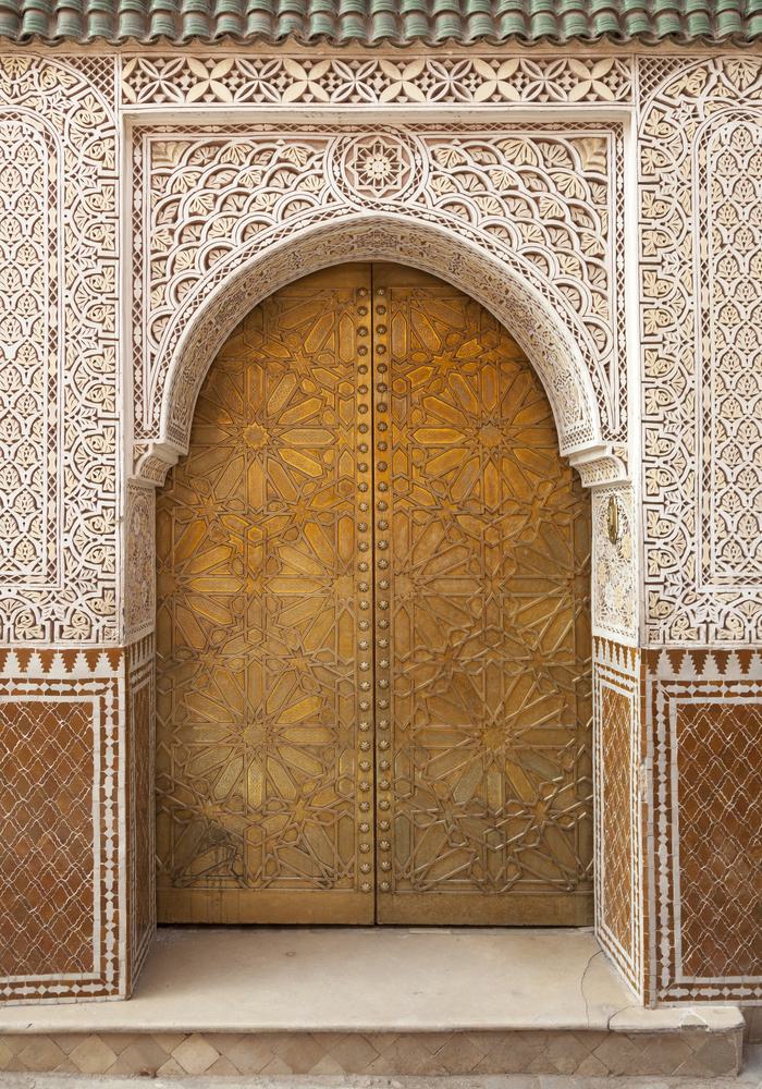 An ornate archway adorned with delicate geometric patterns embraces a splendid golden door, whispering tales of ancient artistry.