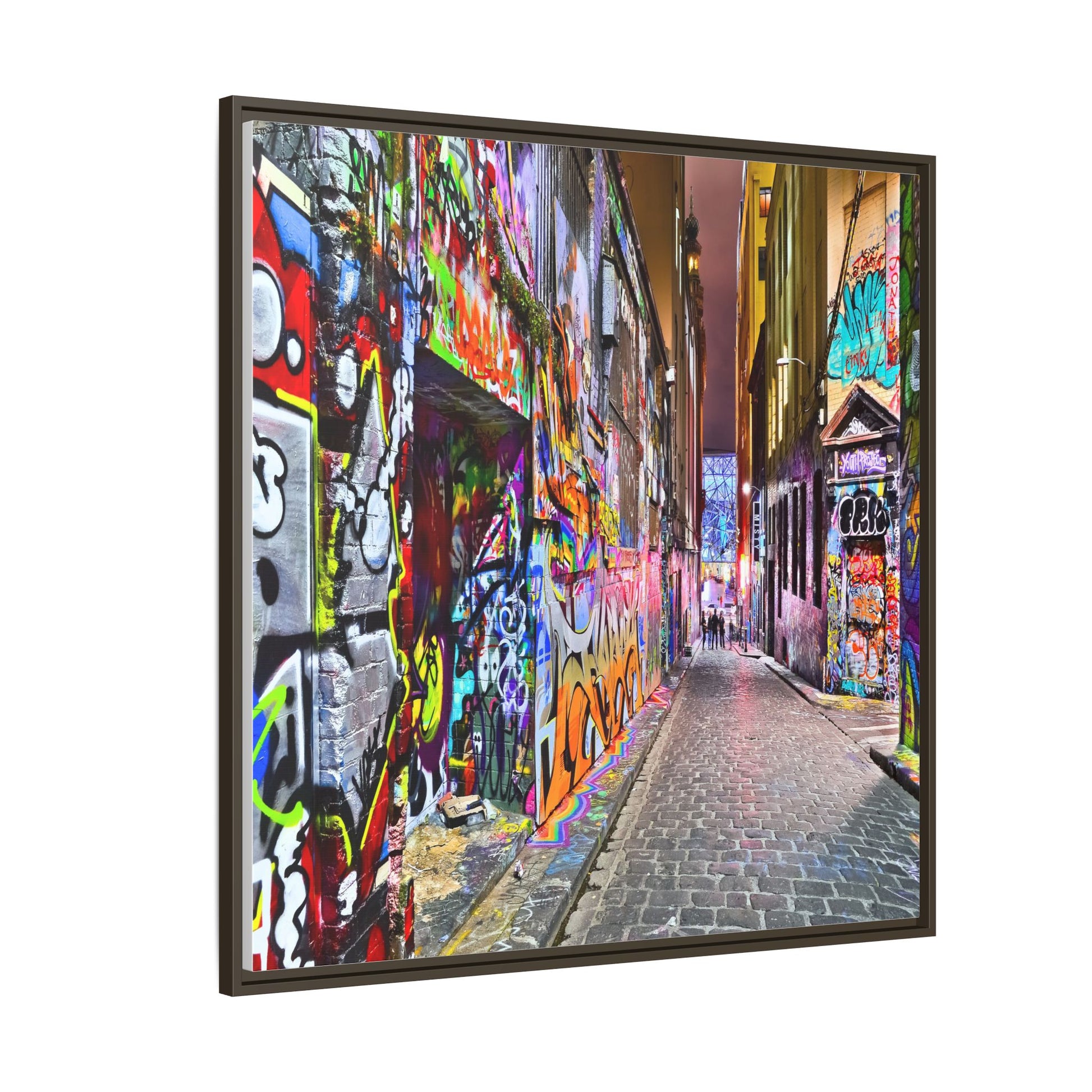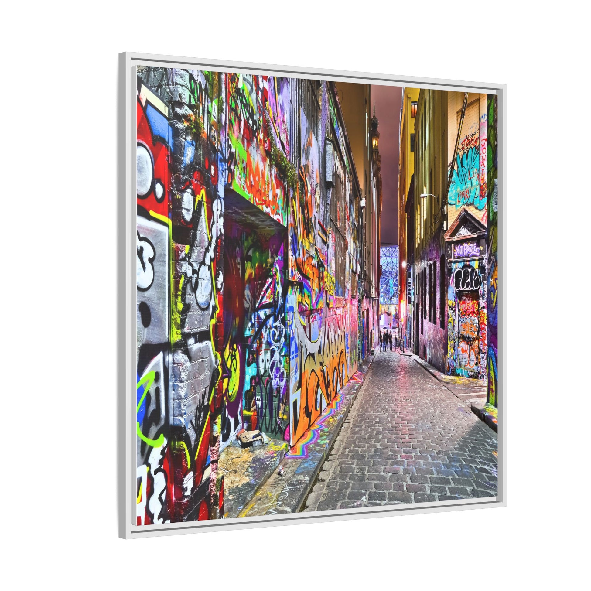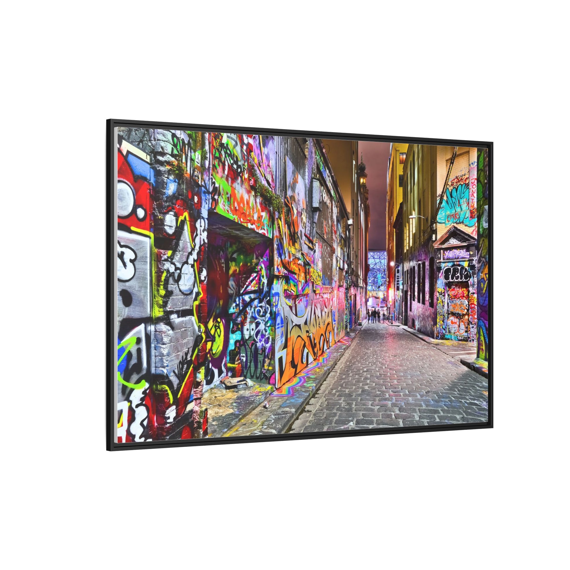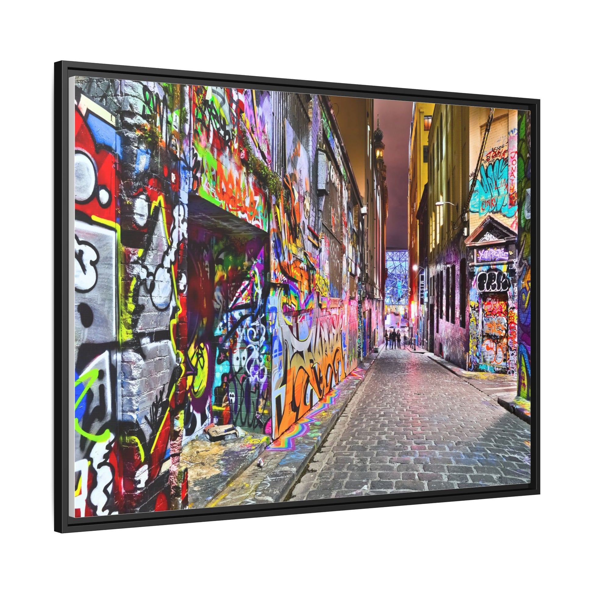 This vibrant image captures a colorful urban laneway completely covered in street art and graffiti, known as Hosier Lane in Melbourne, Australia. The narrow cobblestone street is densely decorated with an explosion of multicolored spray-painted tags, elaborate murals, and intricate street art that covers every visible surface from ground to wall. Brilliant hues of red, blue, green, yellow, and purple intertwine in chaotic yet artistic patterns, creating a visual feast of urban creativity and expression. The lane's textured brick walls serve as a canvas for countless layers of artistic interventions, with graffiti writers and street artists transforming the space into a dynamic, ever-changing public art gallery. In the distance, a few silhouetted figures can be seen walking through the lane, adding a sense of scale and human presence to this extraordinary street art environment.