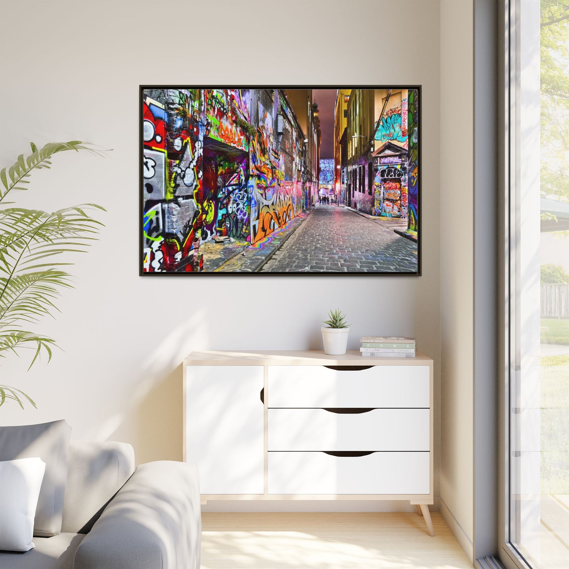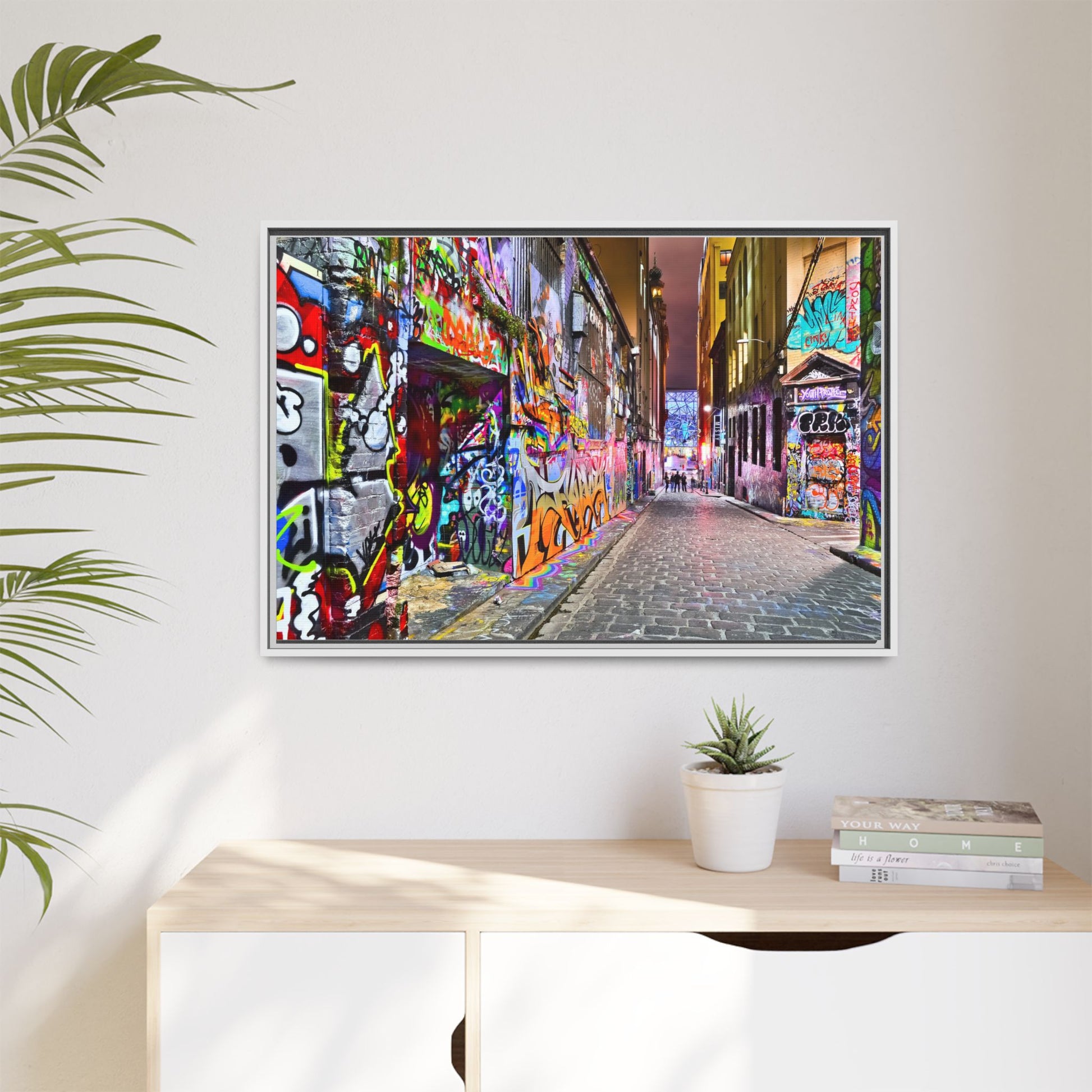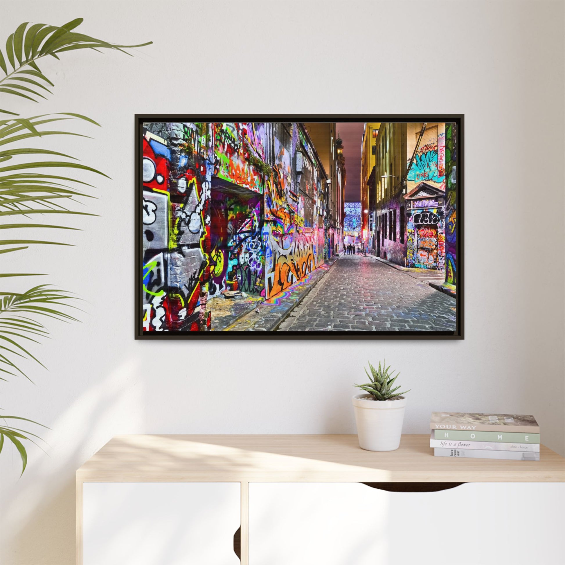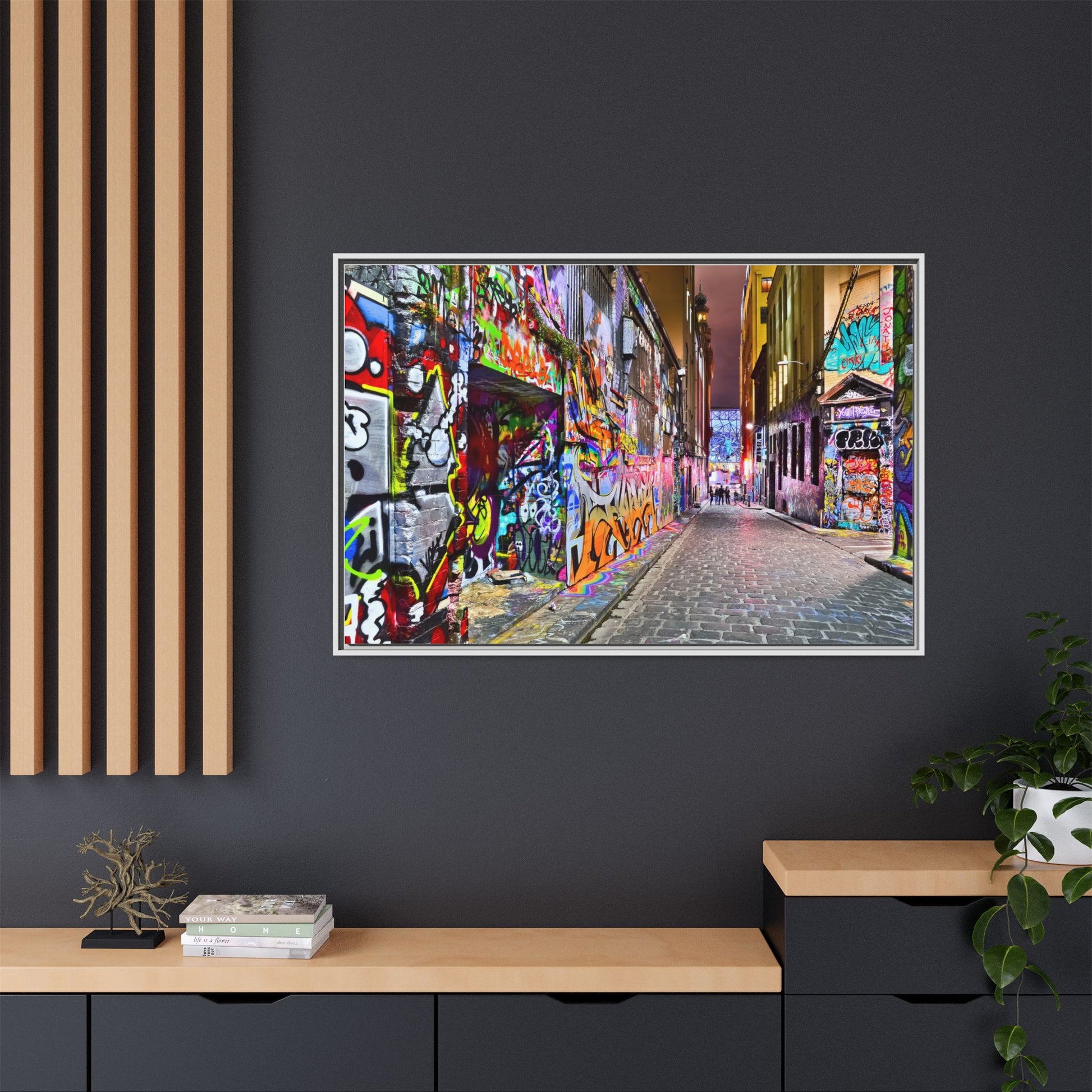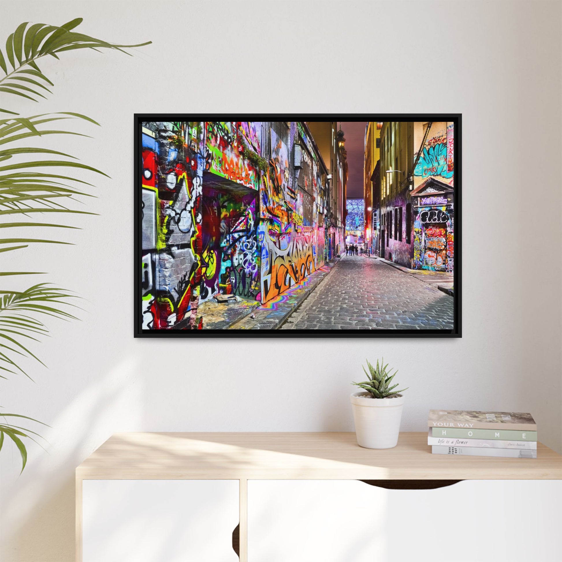 This vibrant image captures a colorful urban laneway completely covered in street art and graffiti, known as Hosier Lane in Melbourne, Australia. The narrow cobblestone street is densely decorated with an explosion of multicolored spray-painted tags, elaborate murals, and intricate street art that covers every visible surface from ground to wall. Brilliant hues of red, blue, green, yellow, and purple intertwine in chaotic yet artistic patterns, creating a visual feast of urban creativity and expression. The lane's textured brick walls serve as a canvas for countless layers of artistic interventions, with graffiti writers and street artists transforming the space into a dynamic, ever-changing public art gallery. In the distance, a few silhouetted figures can be seen walking through the lane, adding a sense of scale and human presence to this extraordinary street art environment.