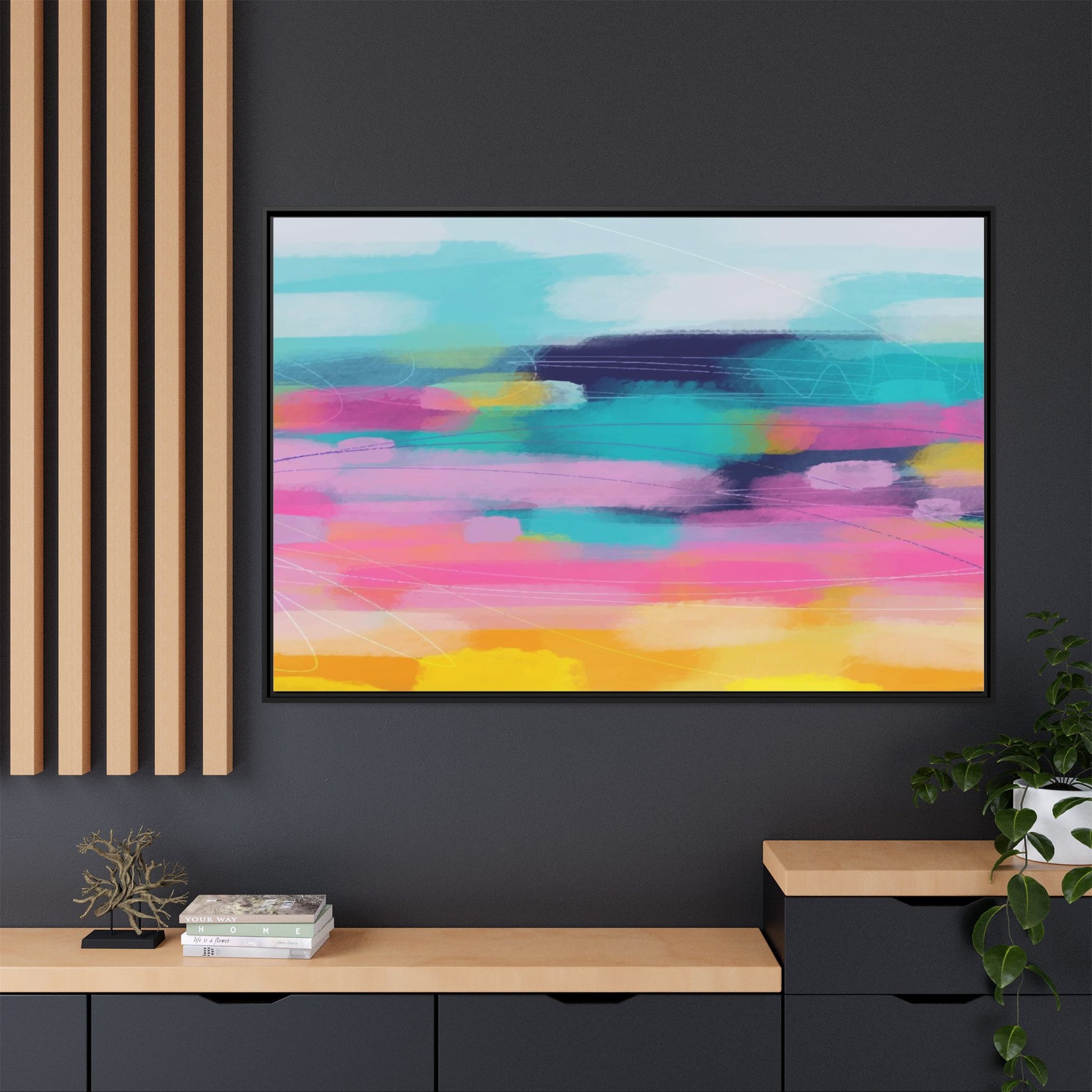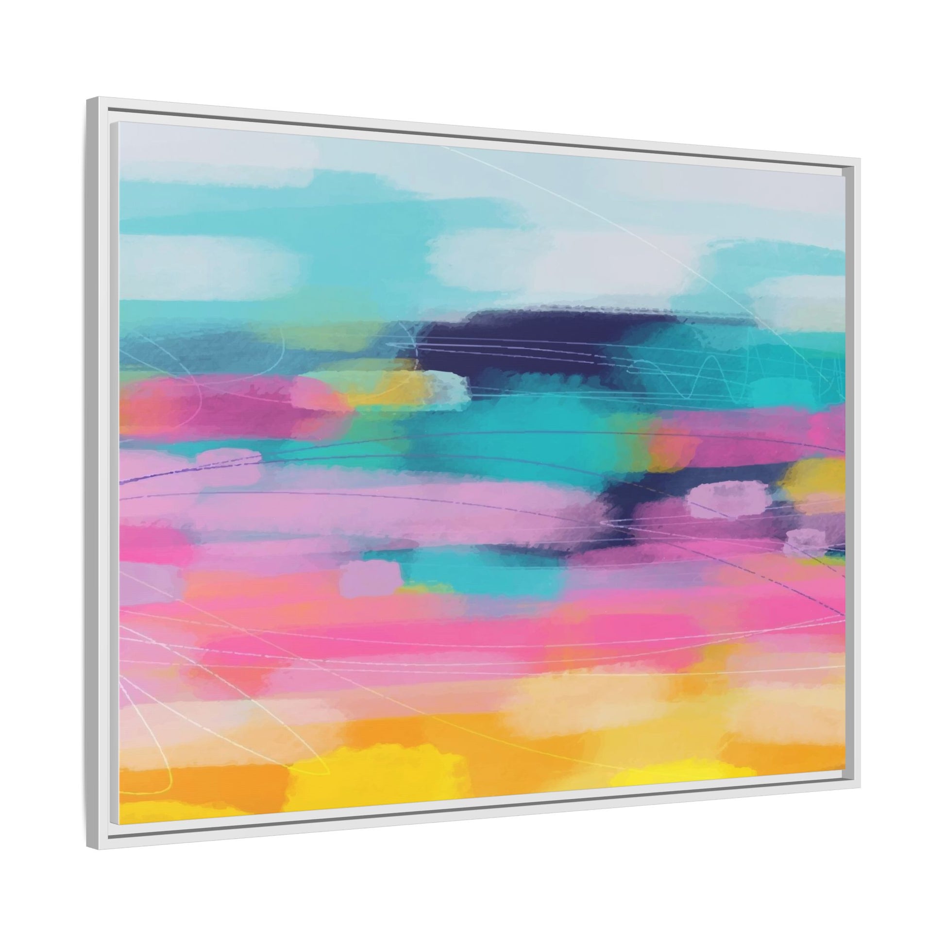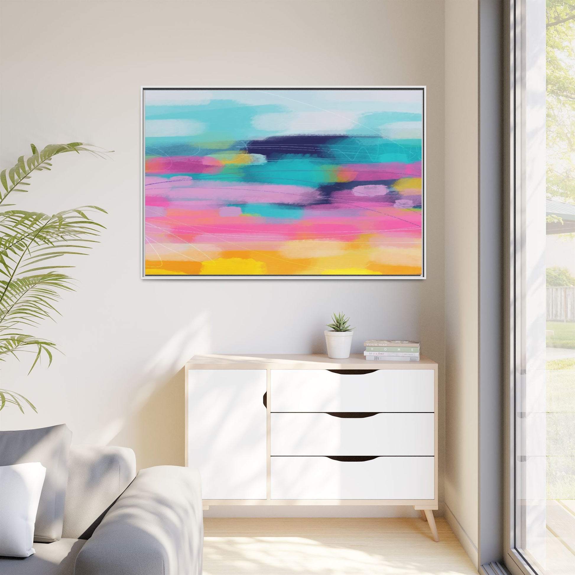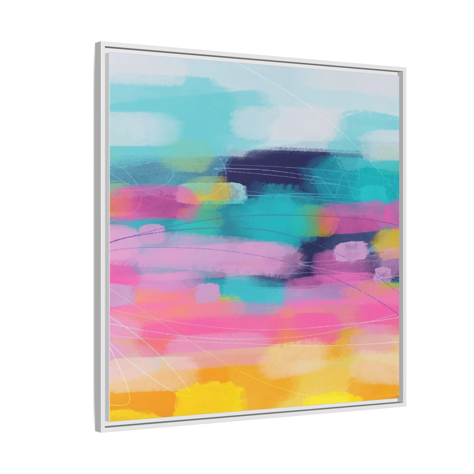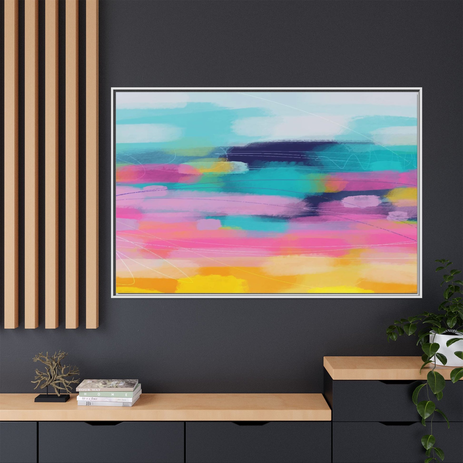 This vibrant abstract digital artwork showcases a dynamic landscape of blended colors and soft, flowing shapes. Brilliant turquoise, hot pink, yellow, and navy blue merge and overlap in ethereal, horizontal bands that suggest a dreamlike interpretation of a horizon or seascape. Delicate white lines weave through the composition, adding subtle texture and movement to the blurred color fields. The image evokes a sense of fluidity and motion, with each color bleeding softly into the next, creating a sense of peaceful transformation. The overall style appears to be a modern, digital painting that explores color relationships and emotional atmospheric qualities.