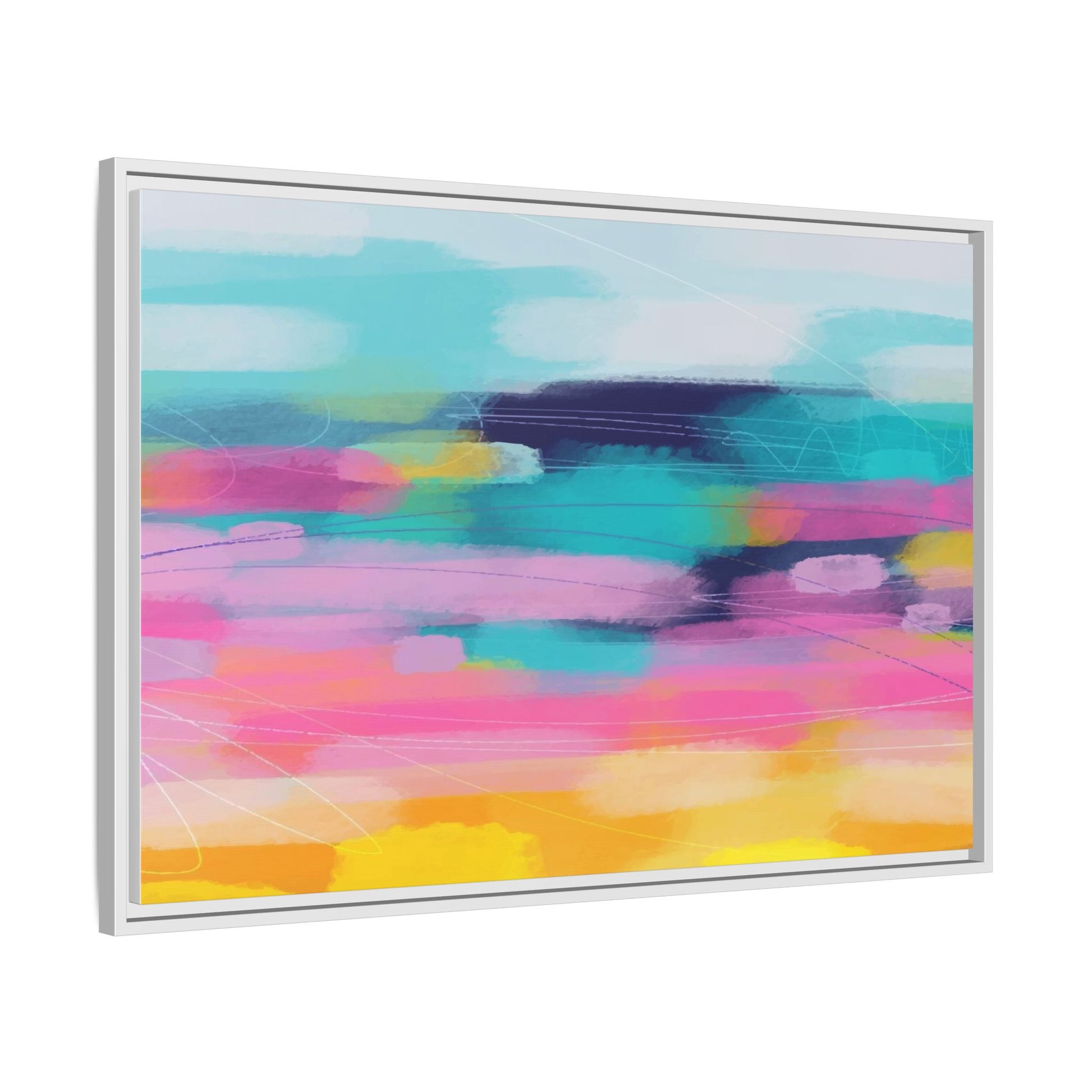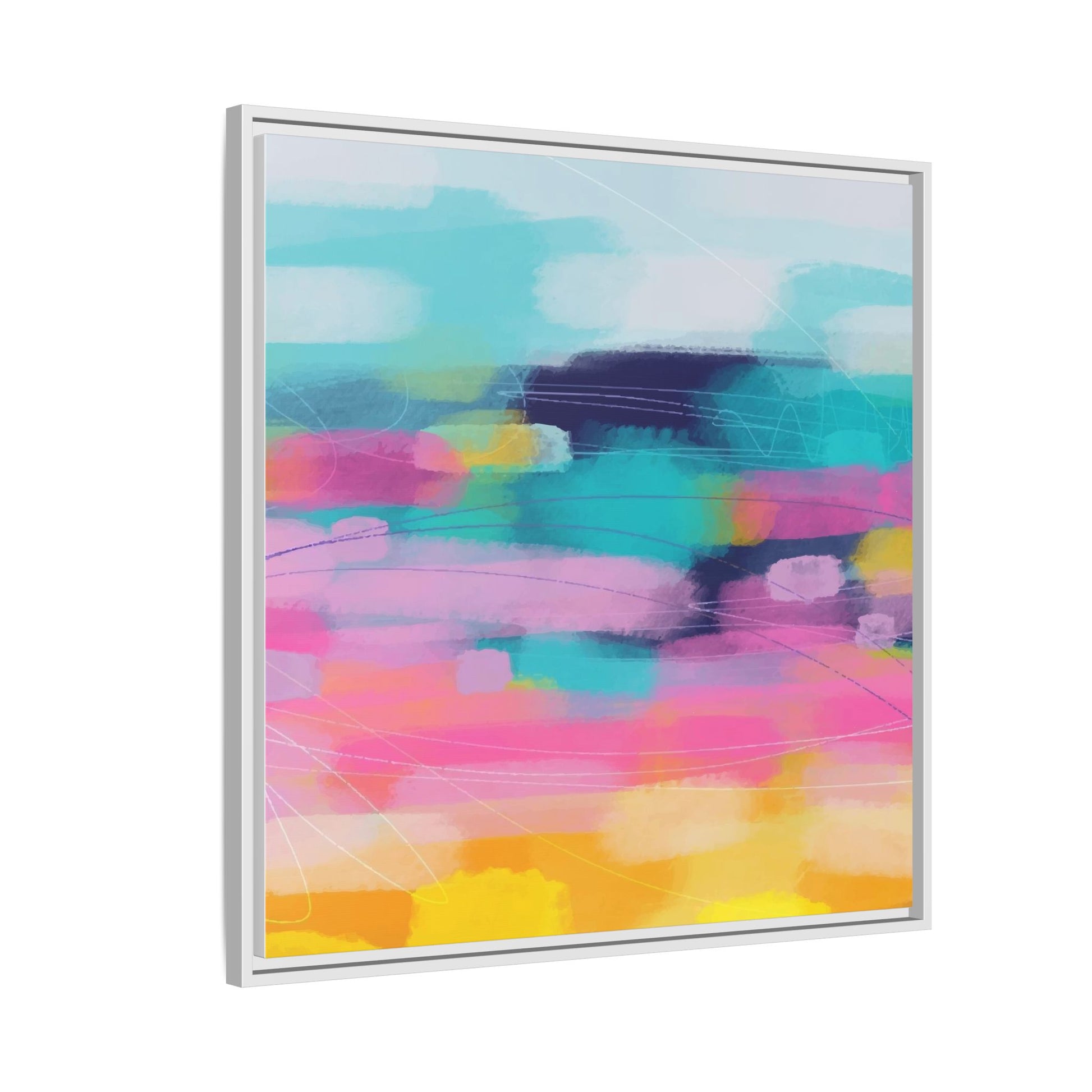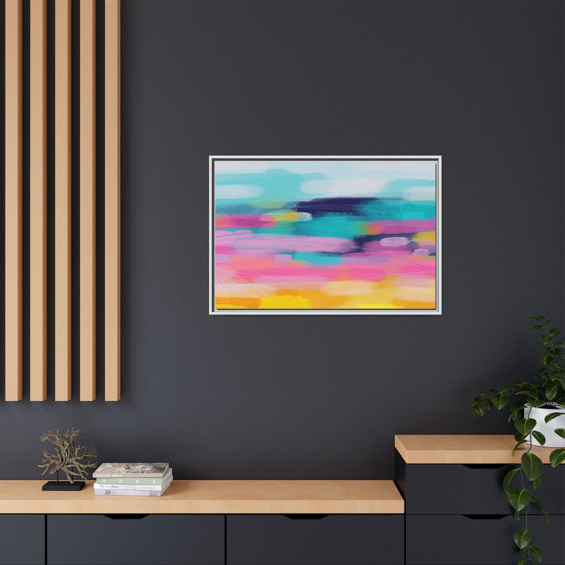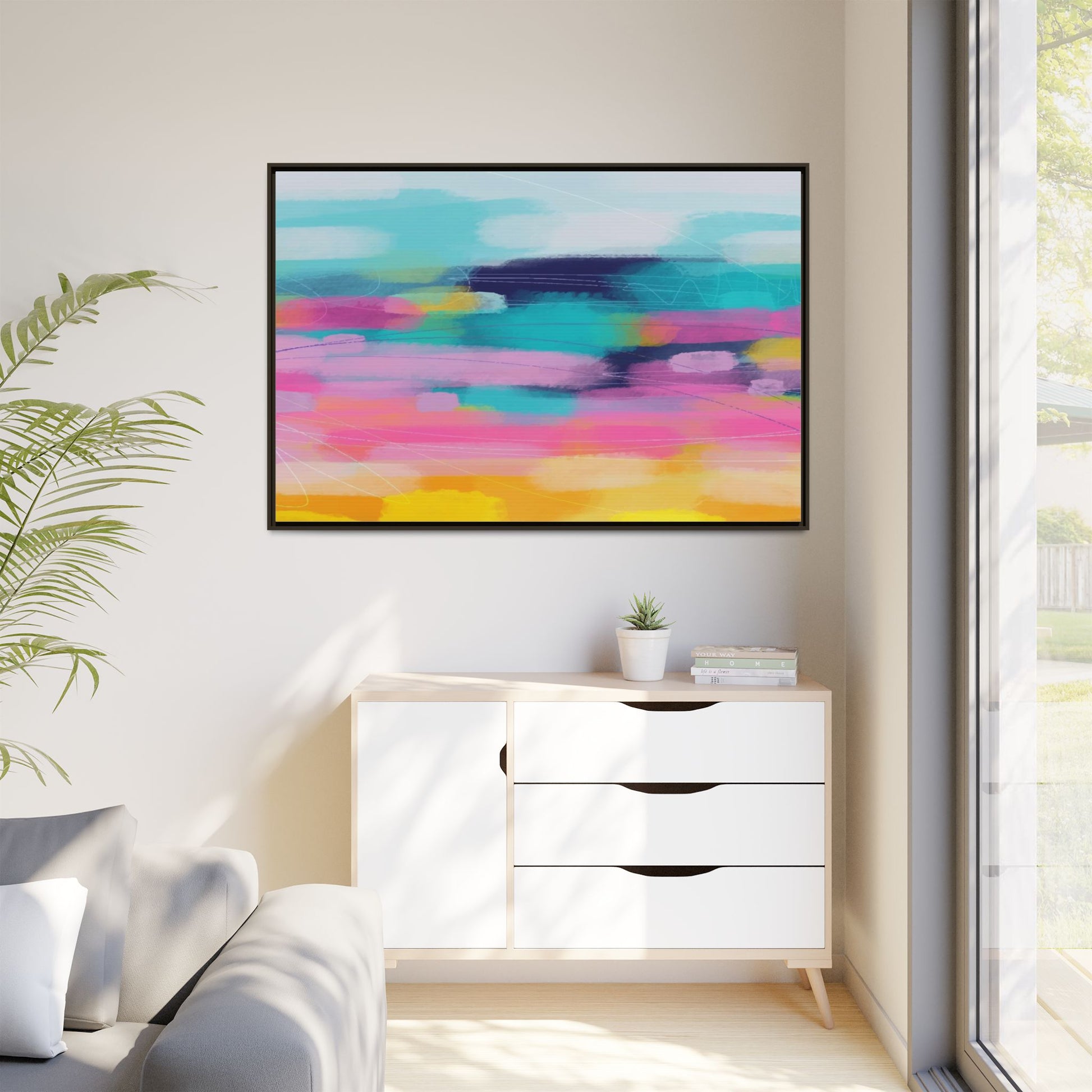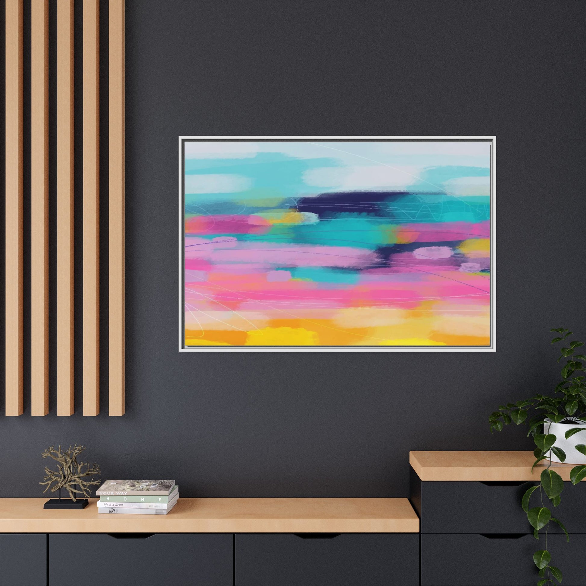 This vibrant abstract digital artwork showcases a dynamic landscape of blended colors and soft, flowing shapes. Brilliant turquoise, hot pink, yellow, and navy blue merge and overlap in ethereal, horizontal bands that suggest a dreamlike interpretation of a horizon or seascape. Delicate white lines weave through the composition, adding subtle texture and movement to the blurred color fields. The image evokes a sense of fluidity and motion, with each color bleeding softly into the next, creating a sense of peaceful transformation. The overall style appears to be a modern, digital painting that explores color relationships and emotional atmospheric qualities.