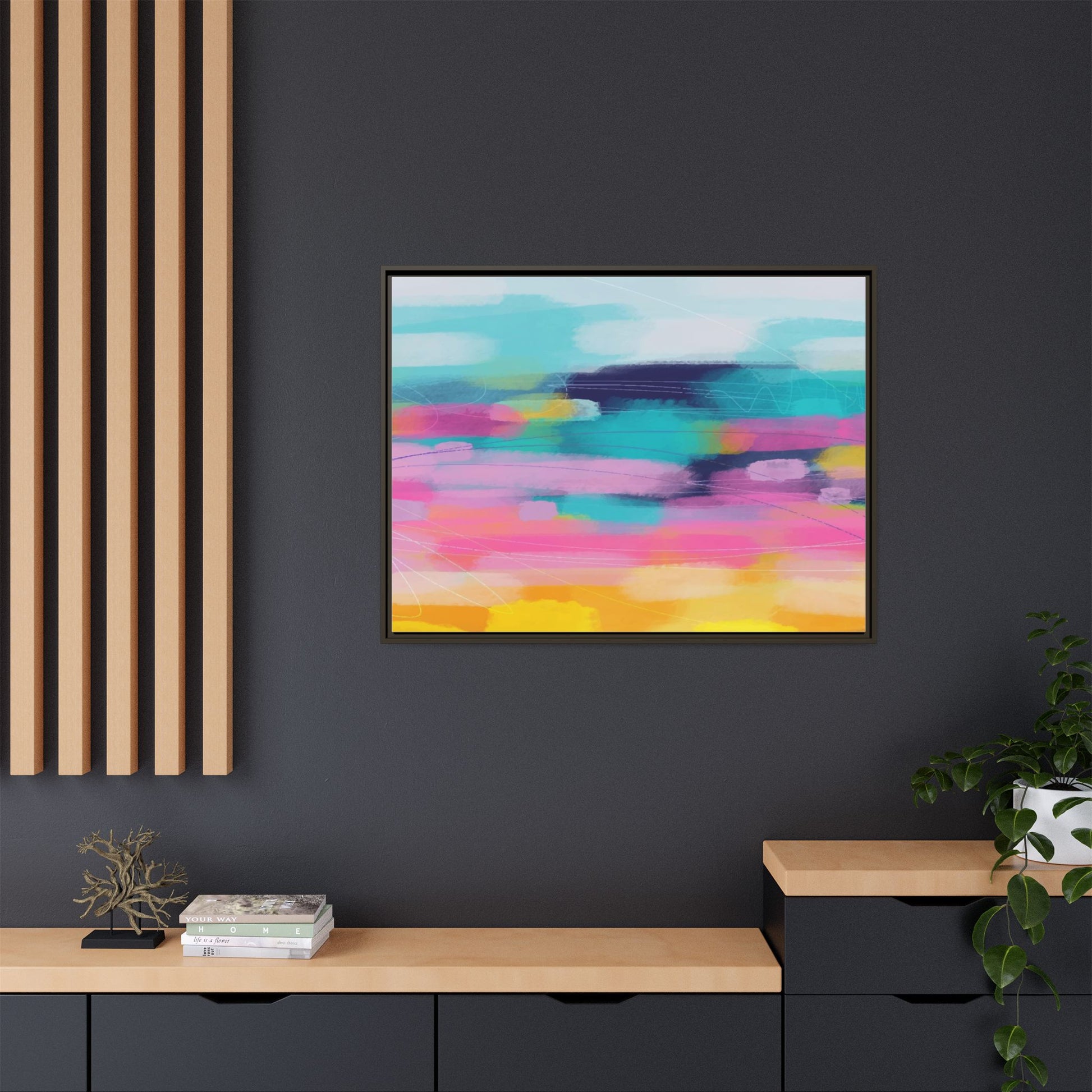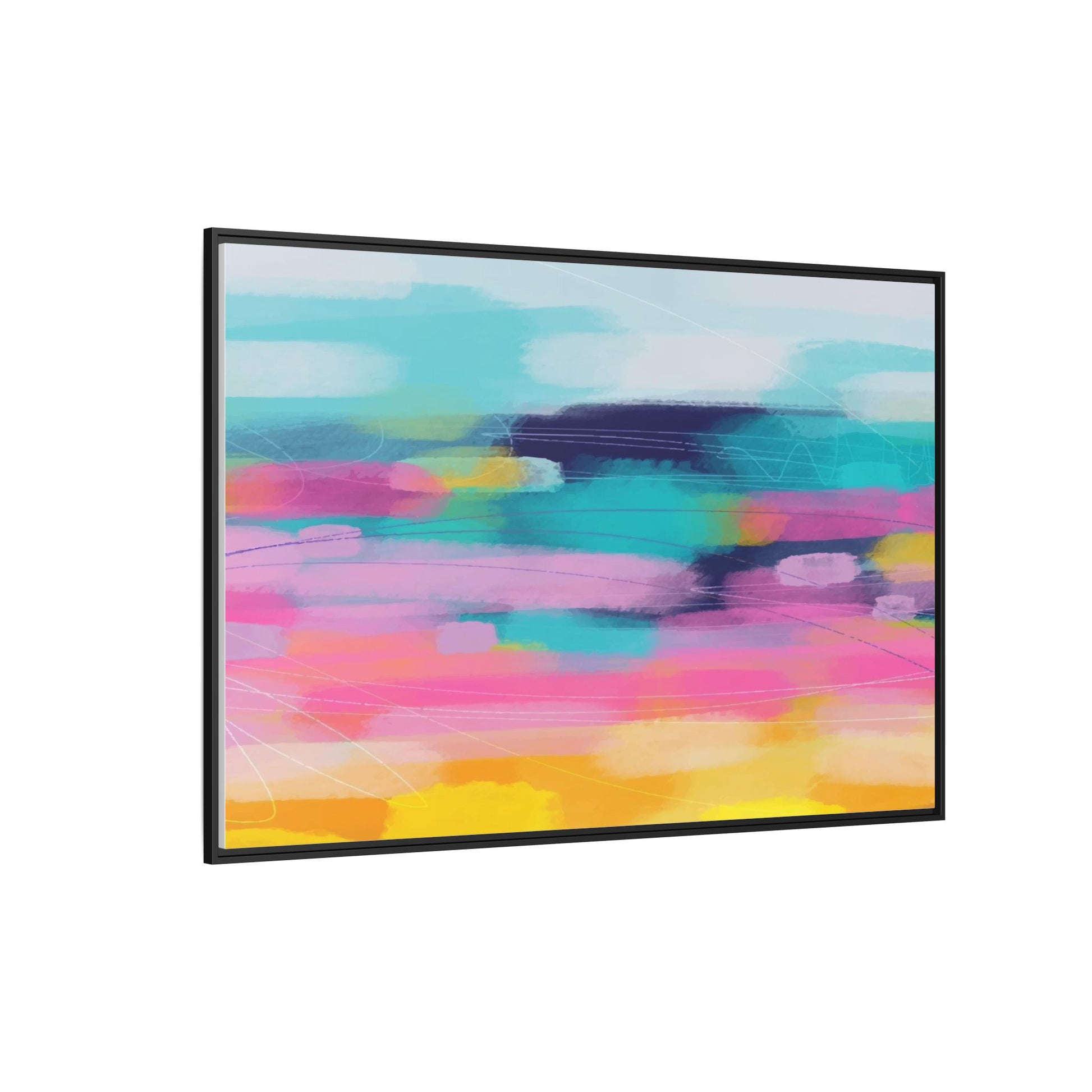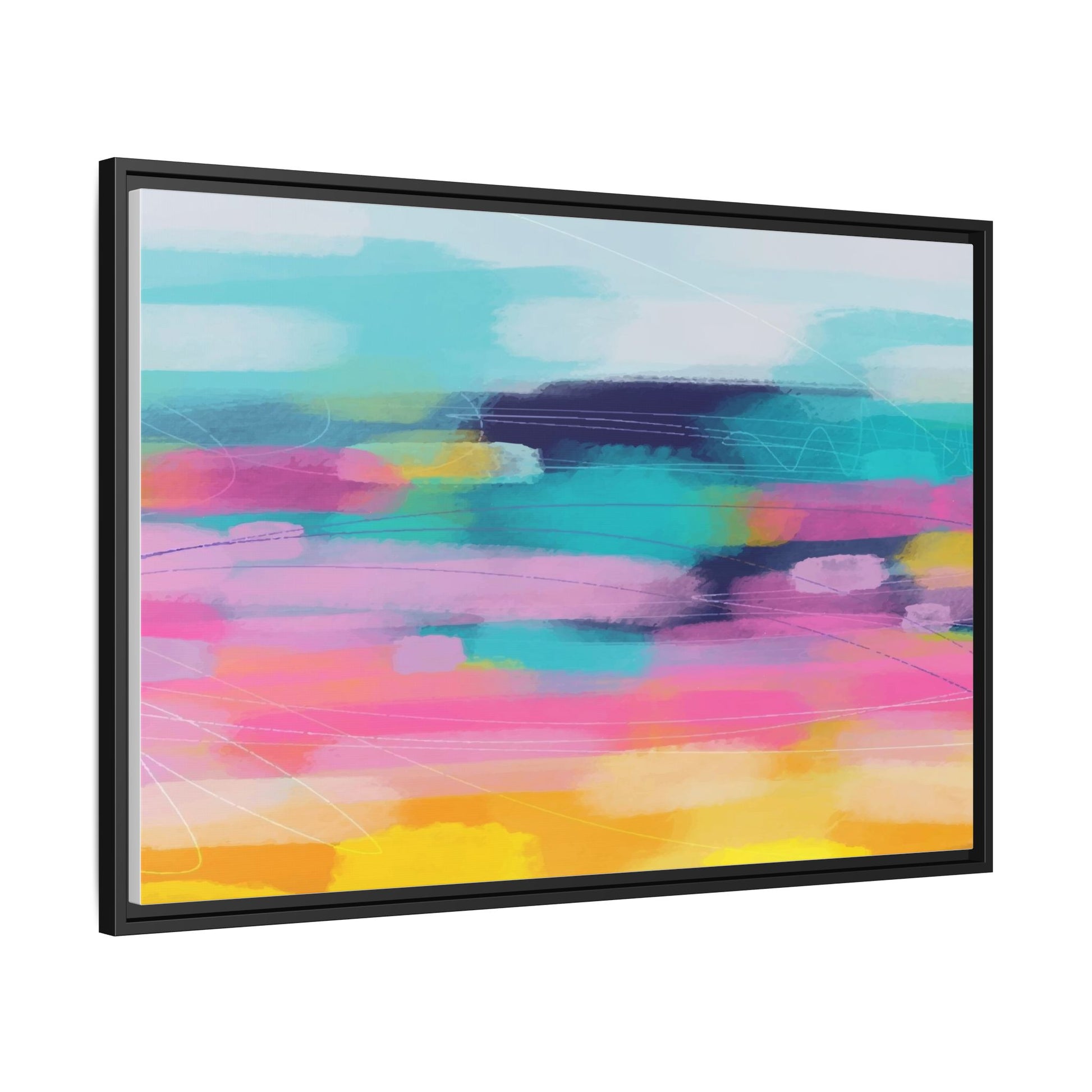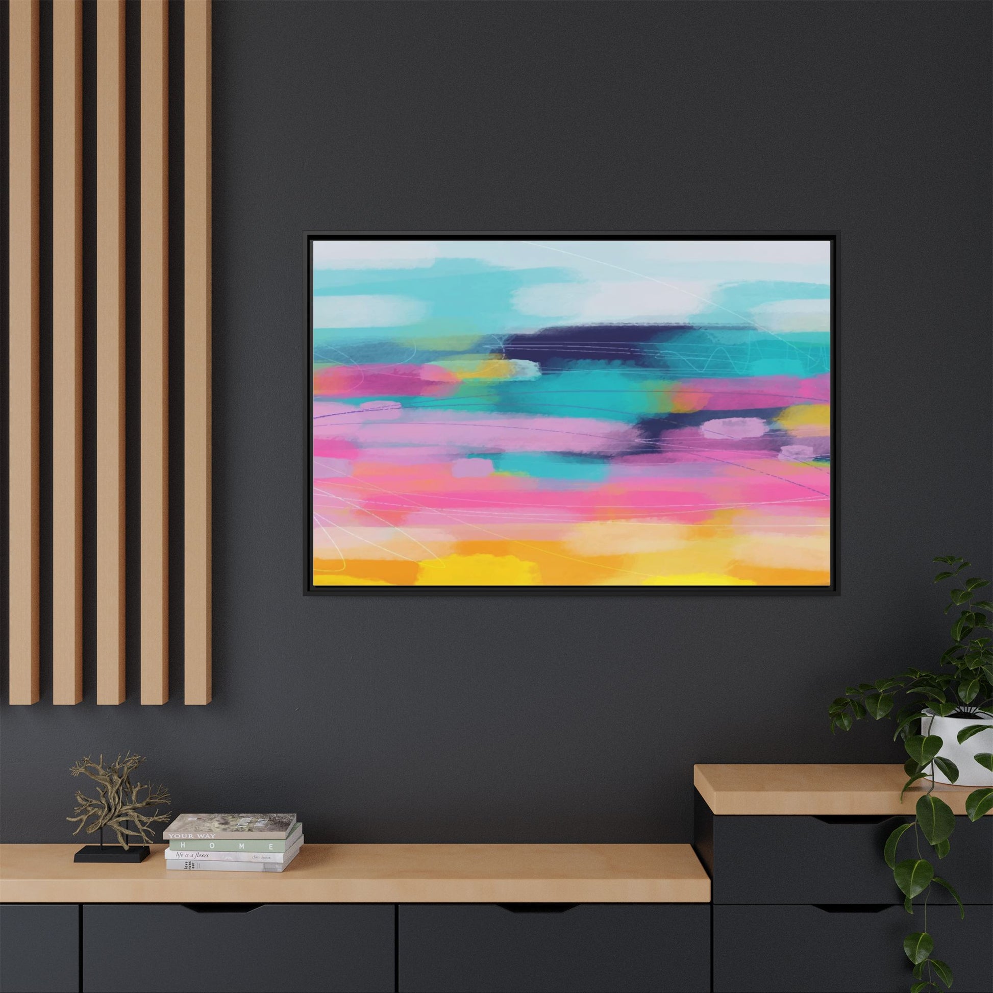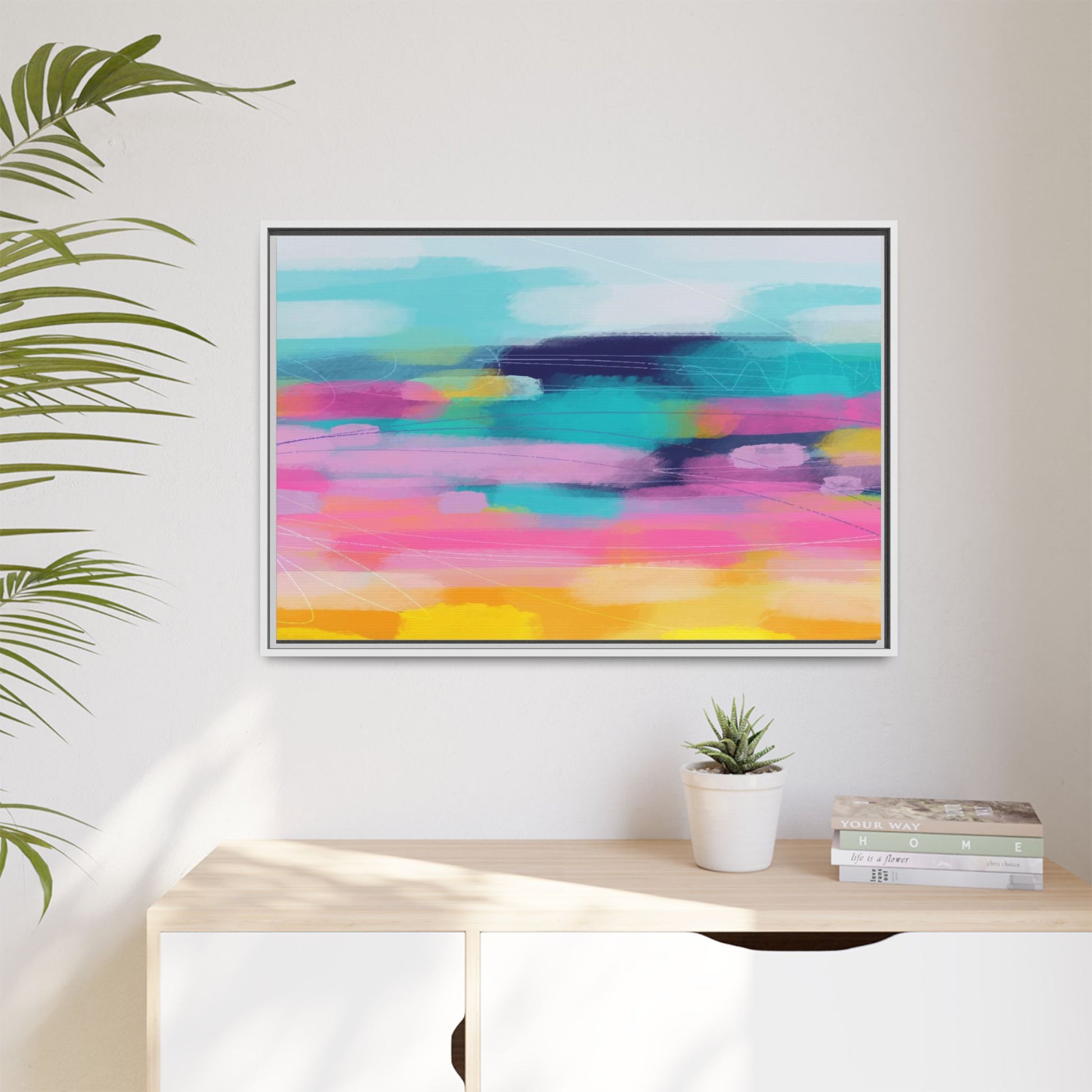 This vibrant abstract digital artwork showcases a dynamic landscape of blended colors and soft, flowing shapes. Brilliant turquoise, hot pink, yellow, and navy blue merge and overlap in ethereal, horizontal bands that suggest a dreamlike interpretation of a horizon or seascape. Delicate white lines weave through the composition, adding subtle texture and movement to the blurred color fields. The image evokes a sense of fluidity and motion, with each color bleeding softly into the next, creating a sense of peaceful transformation. The overall style appears to be a modern, digital painting that explores color relationships and emotional atmospheric qualities.