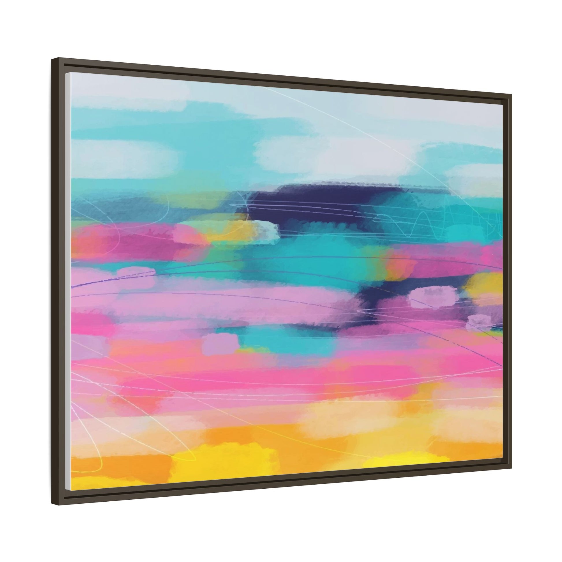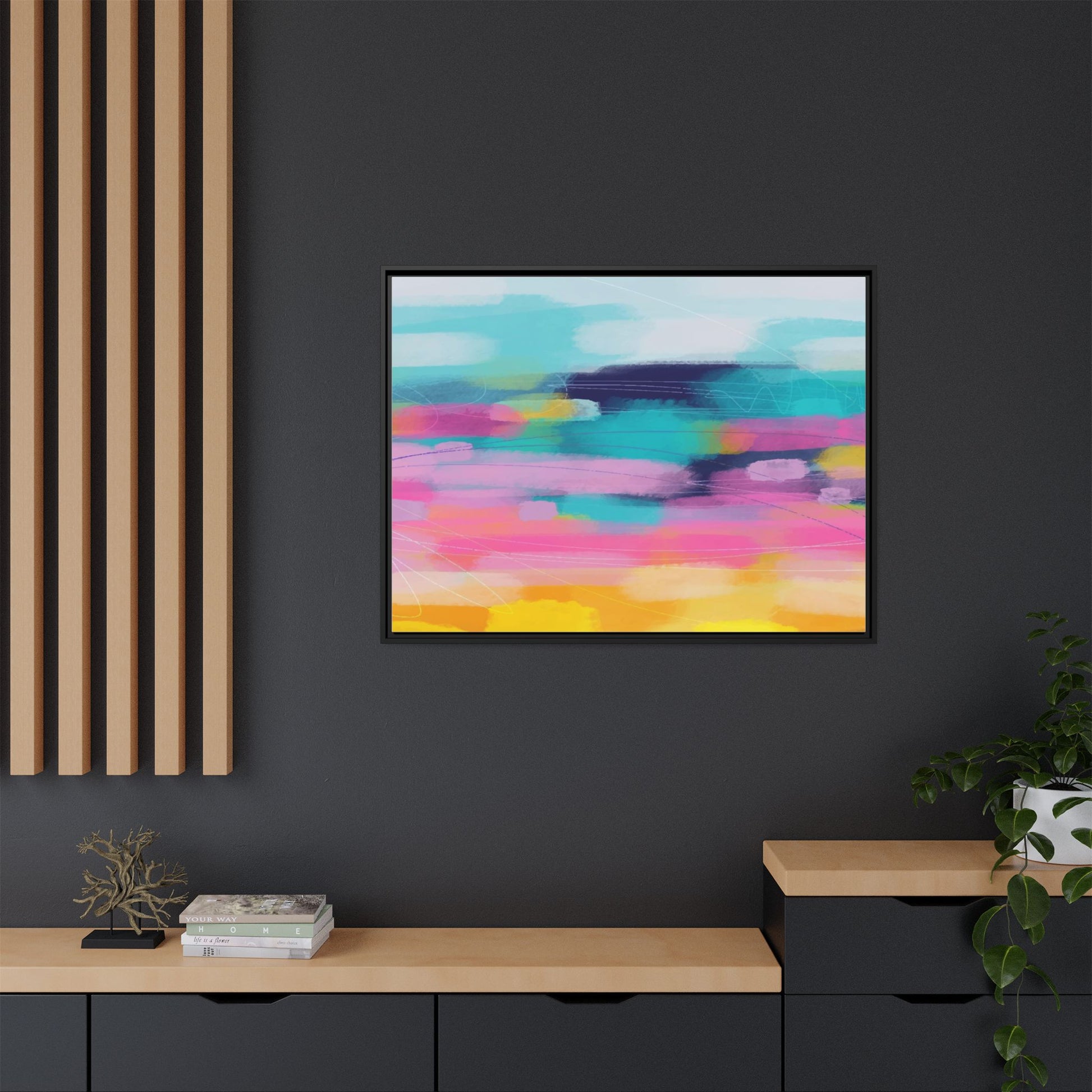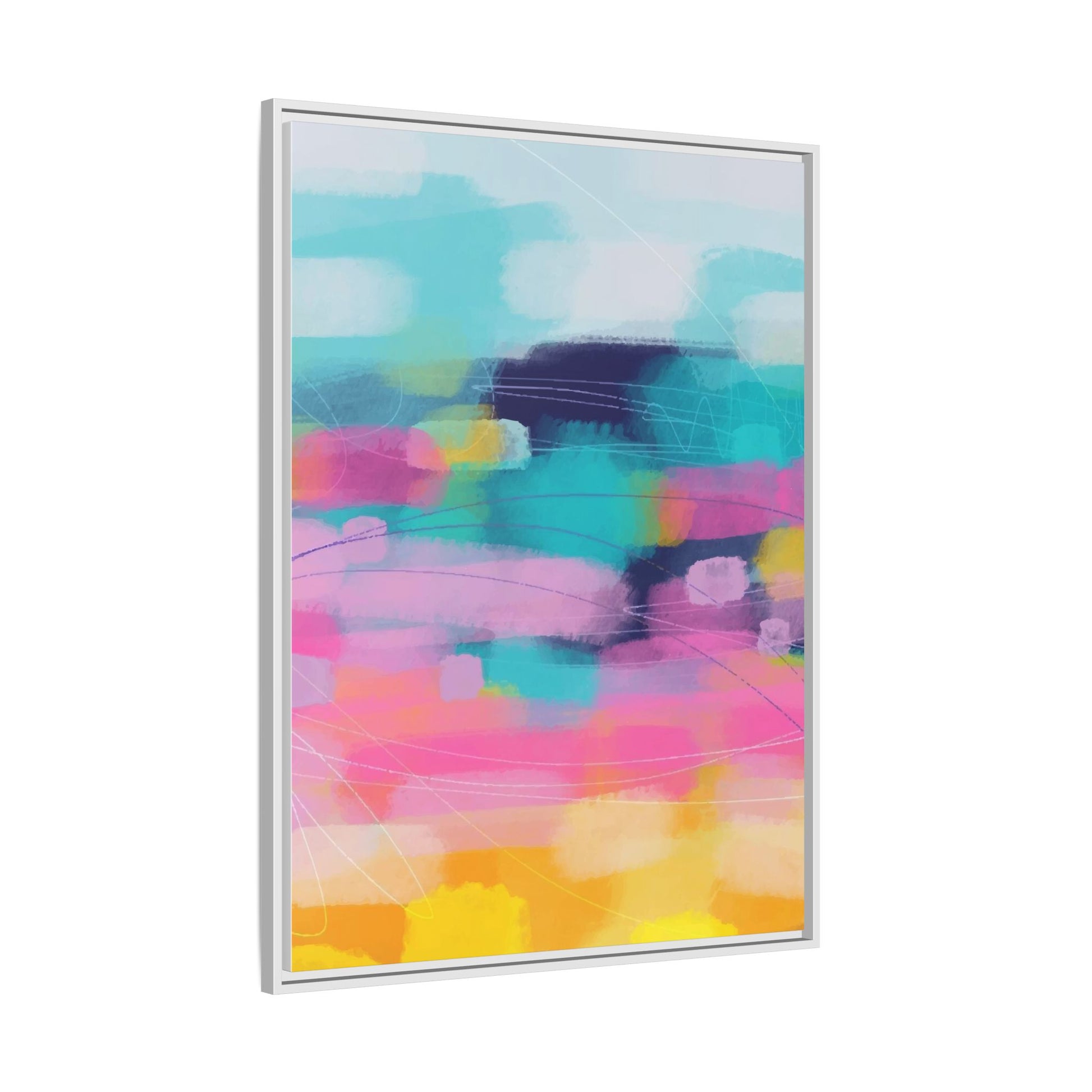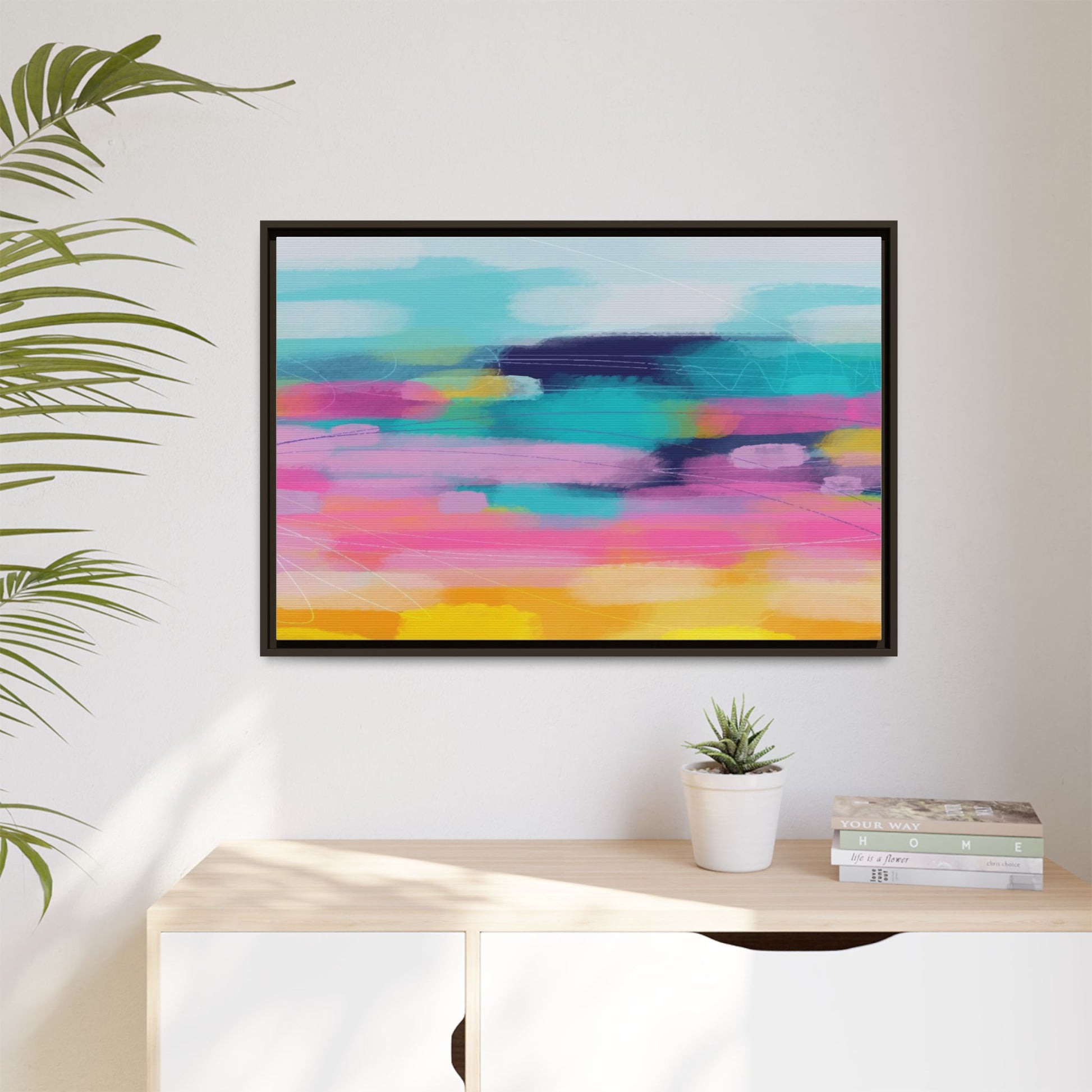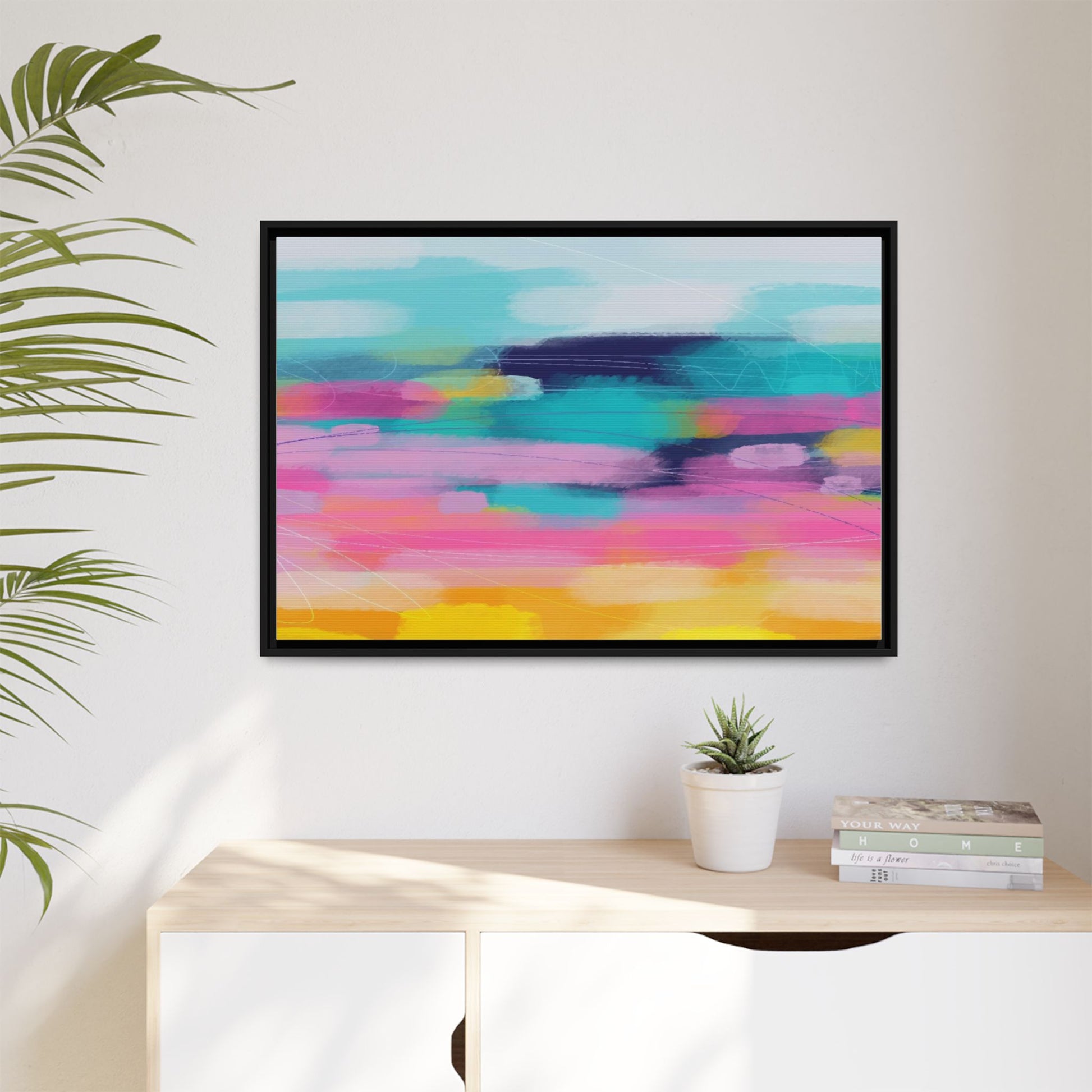 This vibrant abstract digital artwork showcases a dynamic landscape of blended colors and soft, flowing shapes. Brilliant turquoise, hot pink, yellow, and navy blue merge and overlap in ethereal, horizontal bands that suggest a dreamlike interpretation of a horizon or seascape. Delicate white lines weave through the composition, adding subtle texture and movement to the blurred color fields. The image evokes a sense of fluidity and motion, with each color bleeding softly into the next, creating a sense of peaceful transformation. The overall style appears to be a modern, digital painting that explores color relationships and emotional atmospheric qualities.