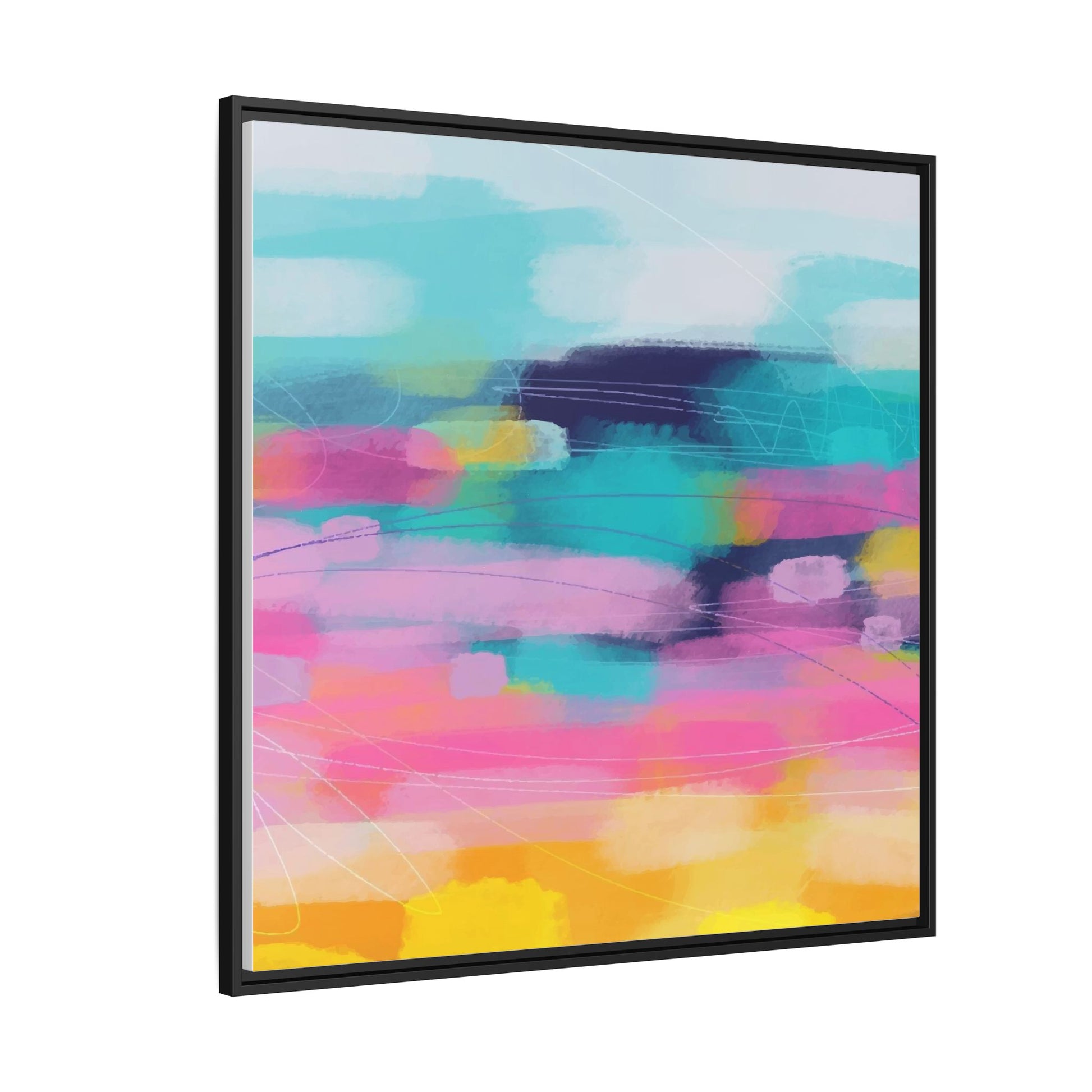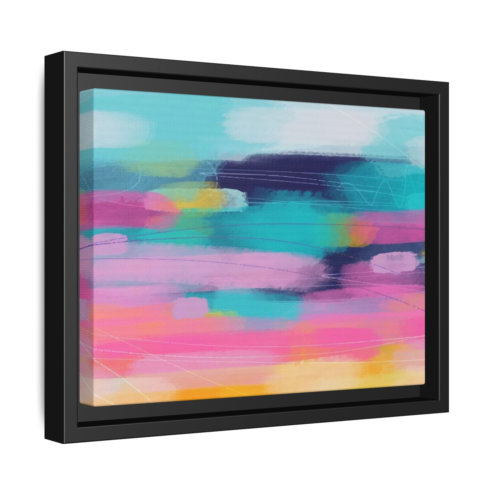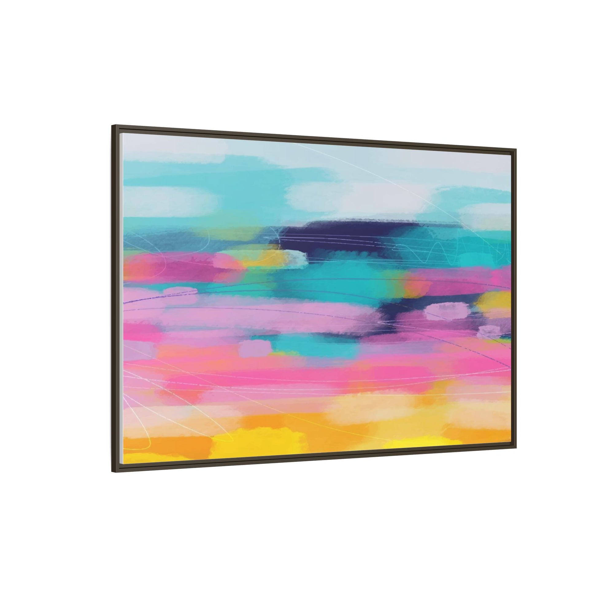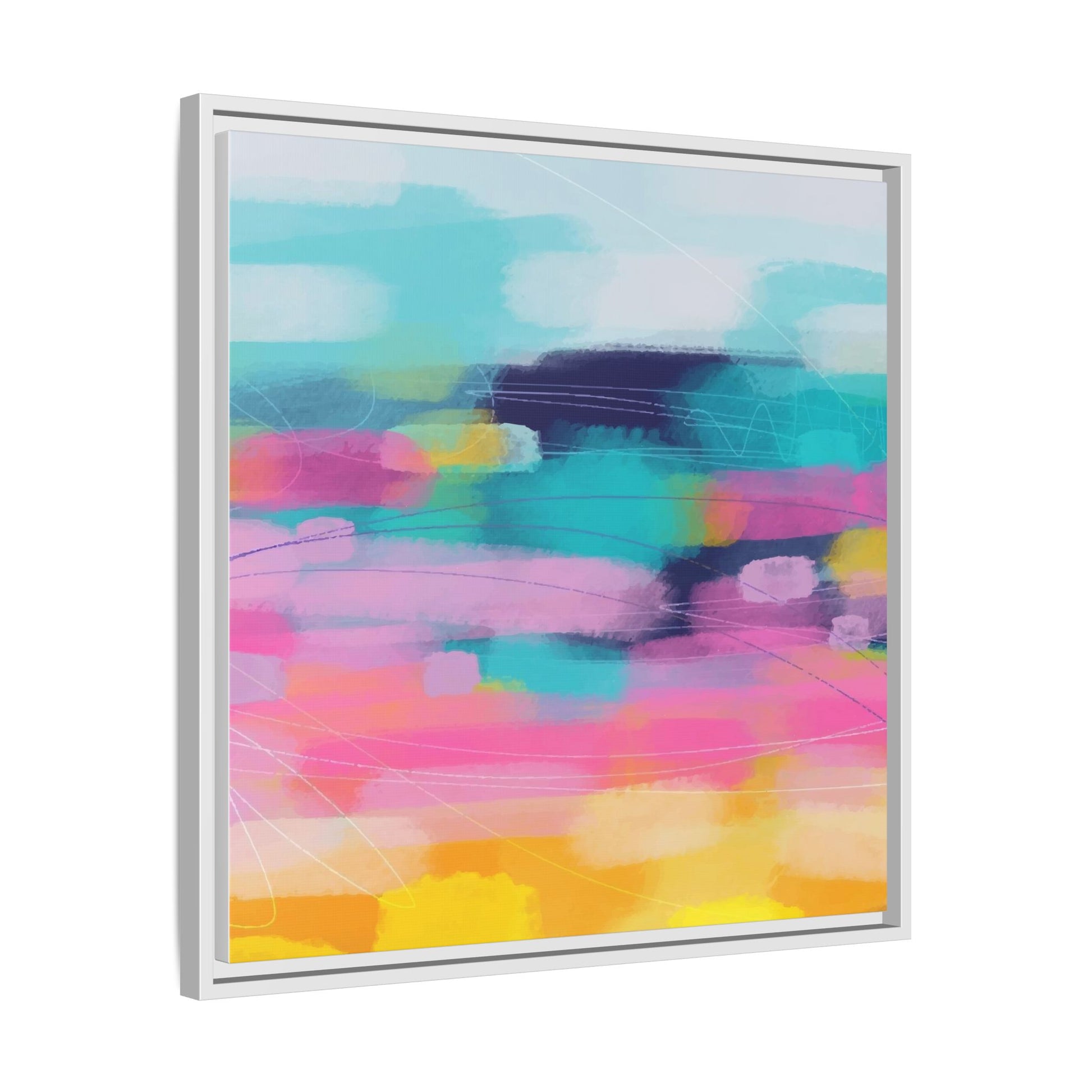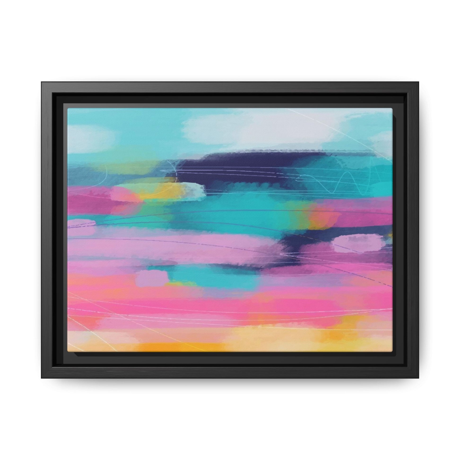This vibrant abstract digital artwork showcases a dynamic landscape of blended colors and soft, flowing shapes. Brilliant turquoise, hot pink, yellow, and navy blue merge and overlap in ethereal, horizontal bands that suggest a dreamlike interpretation of a horizon or seascape. Delicate white lines weave through the composition, adding subtle texture and movement to the blurred color fields. The image evokes a sense of fluidity and motion, with each color bleeding softly into the next, creating a sense of peaceful transformation. The overall style appears to be a modern, digital painting that explores color relationships and emotional atmospheric qualities.