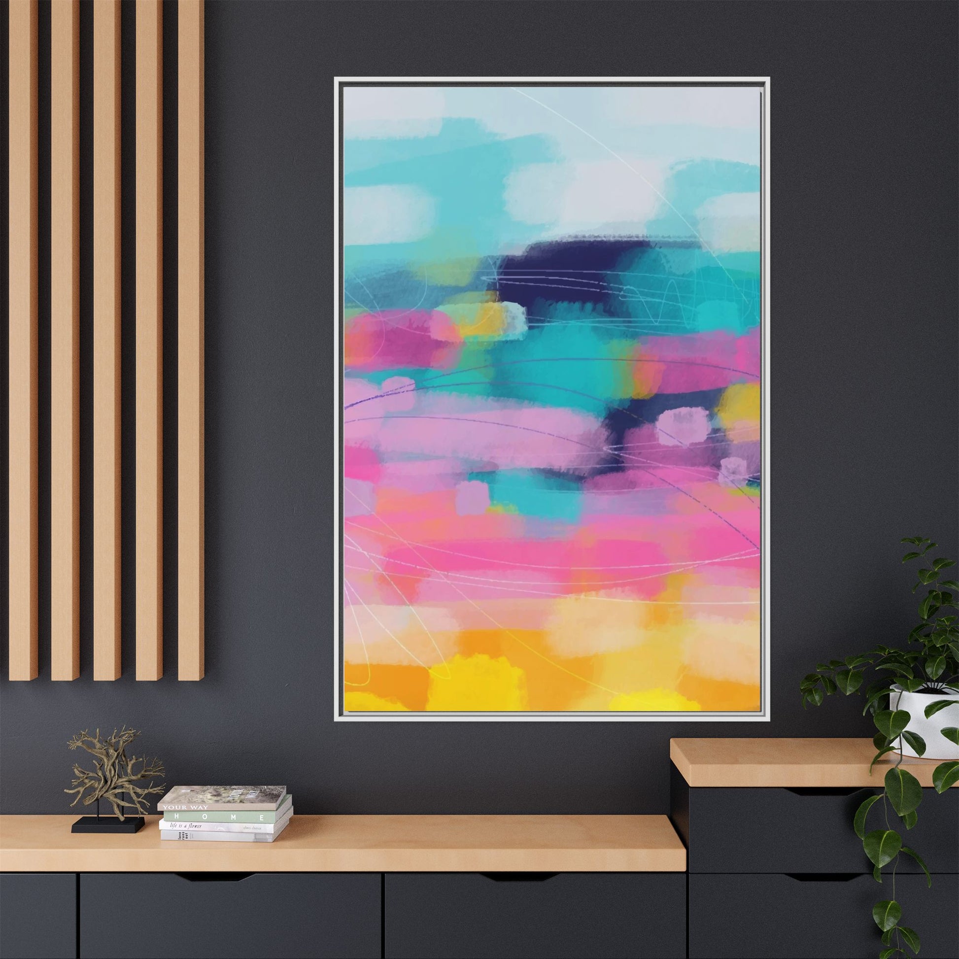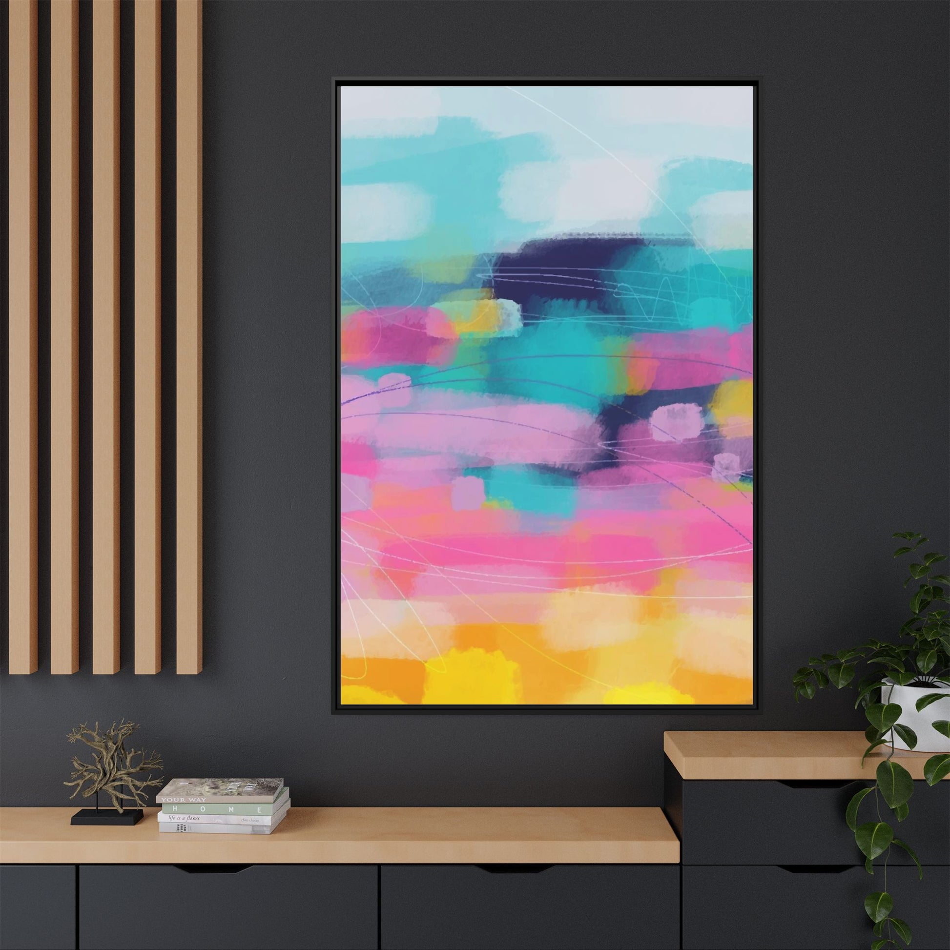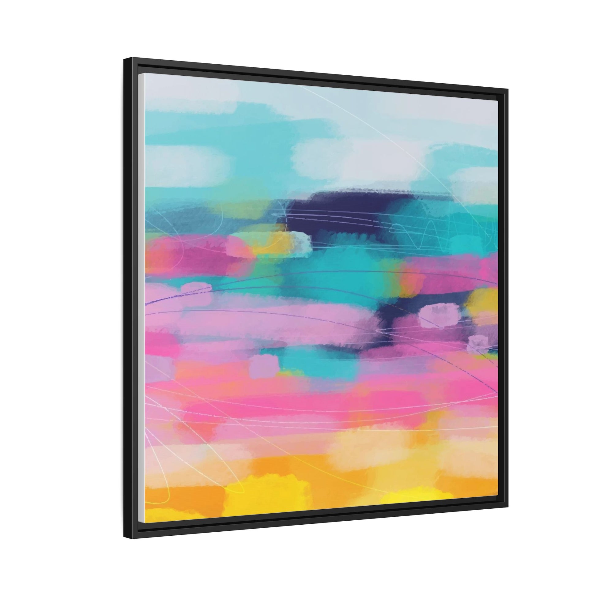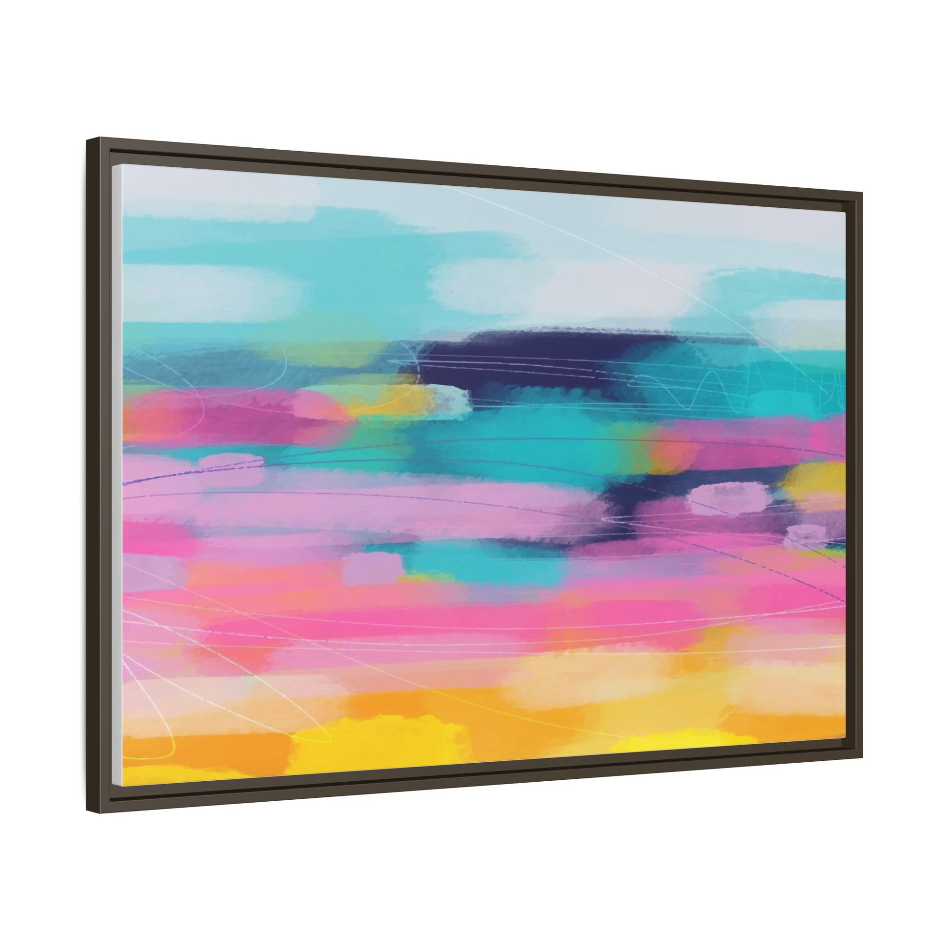 This vibrant abstract digital artwork showcases a dynamic landscape of blended colors and soft, flowing shapes. Brilliant turquoise, hot pink, yellow, and navy blue merge and overlap in ethereal, horizontal bands that suggest a dreamlike interpretation of a horizon or seascape. Delicate white lines weave through the composition, adding subtle texture and movement to the blurred color fields. The image evokes a sense of fluidity and motion, with each color bleeding softly into the next, creating a sense of peaceful transformation. The overall style appears to be a modern, digital painting that explores color relationships and emotional atmospheric qualities.