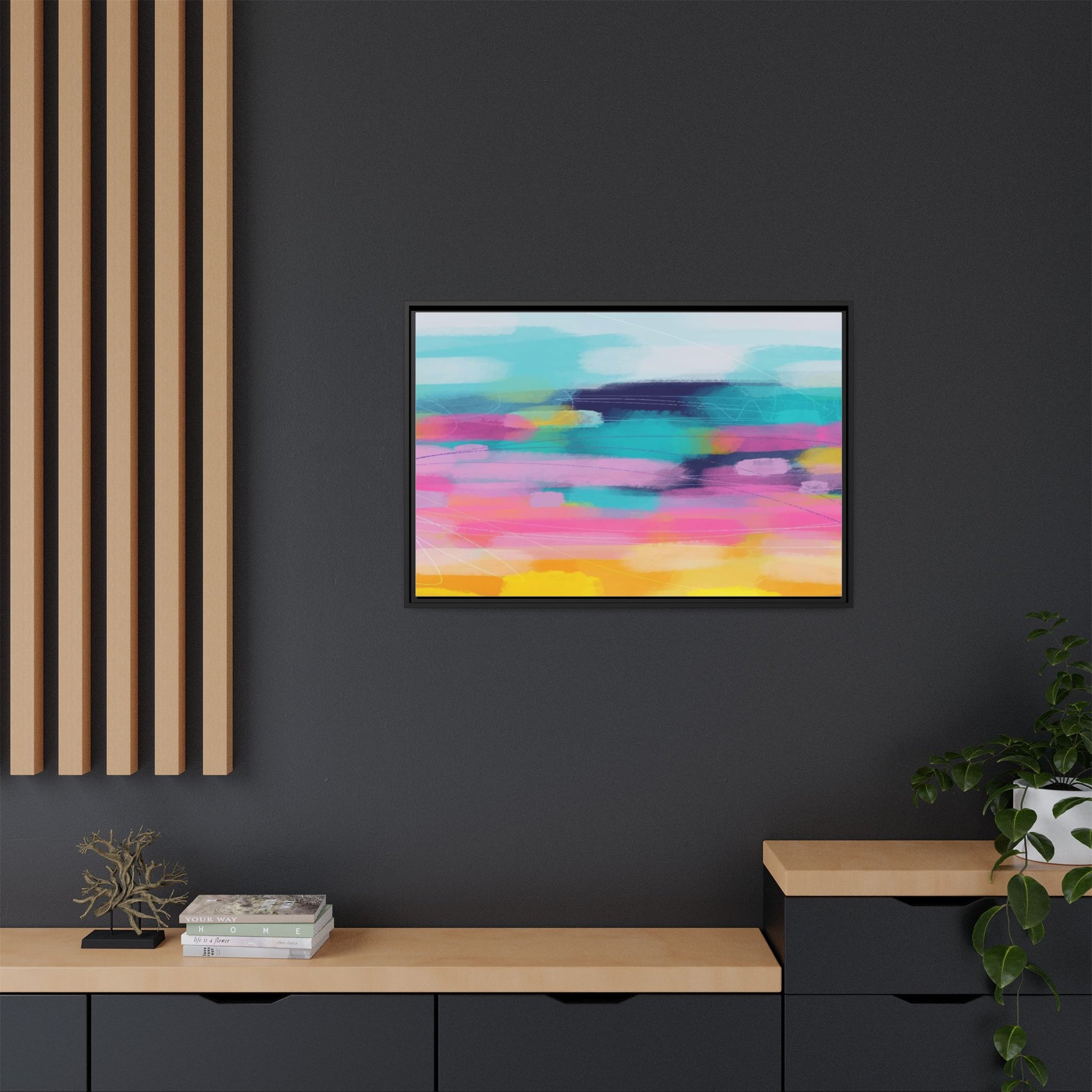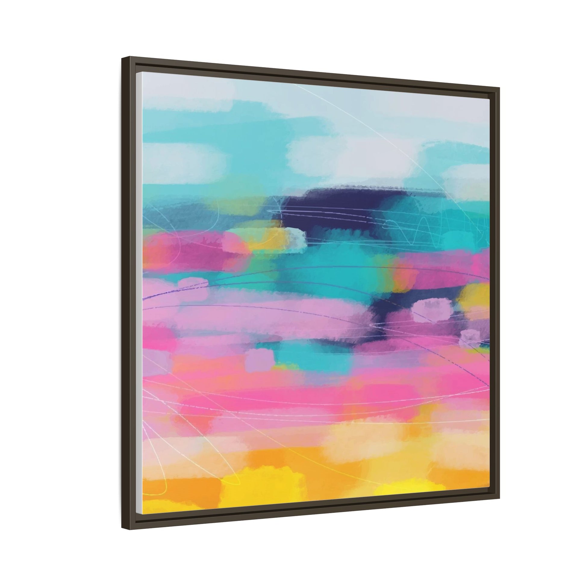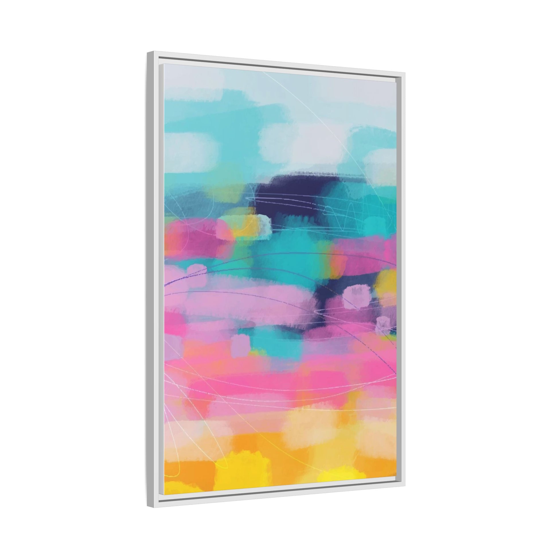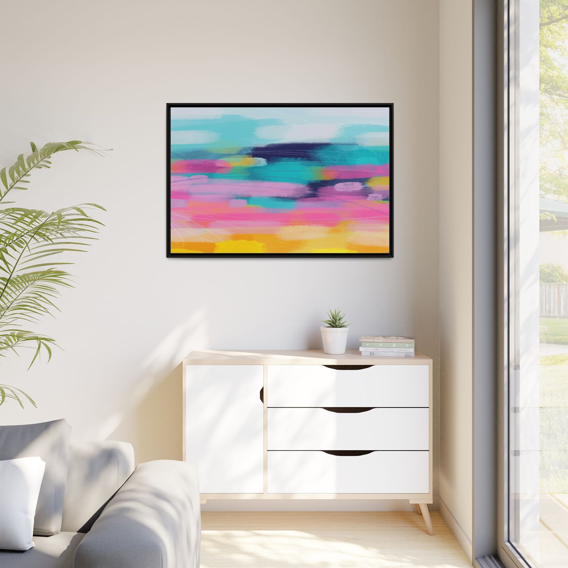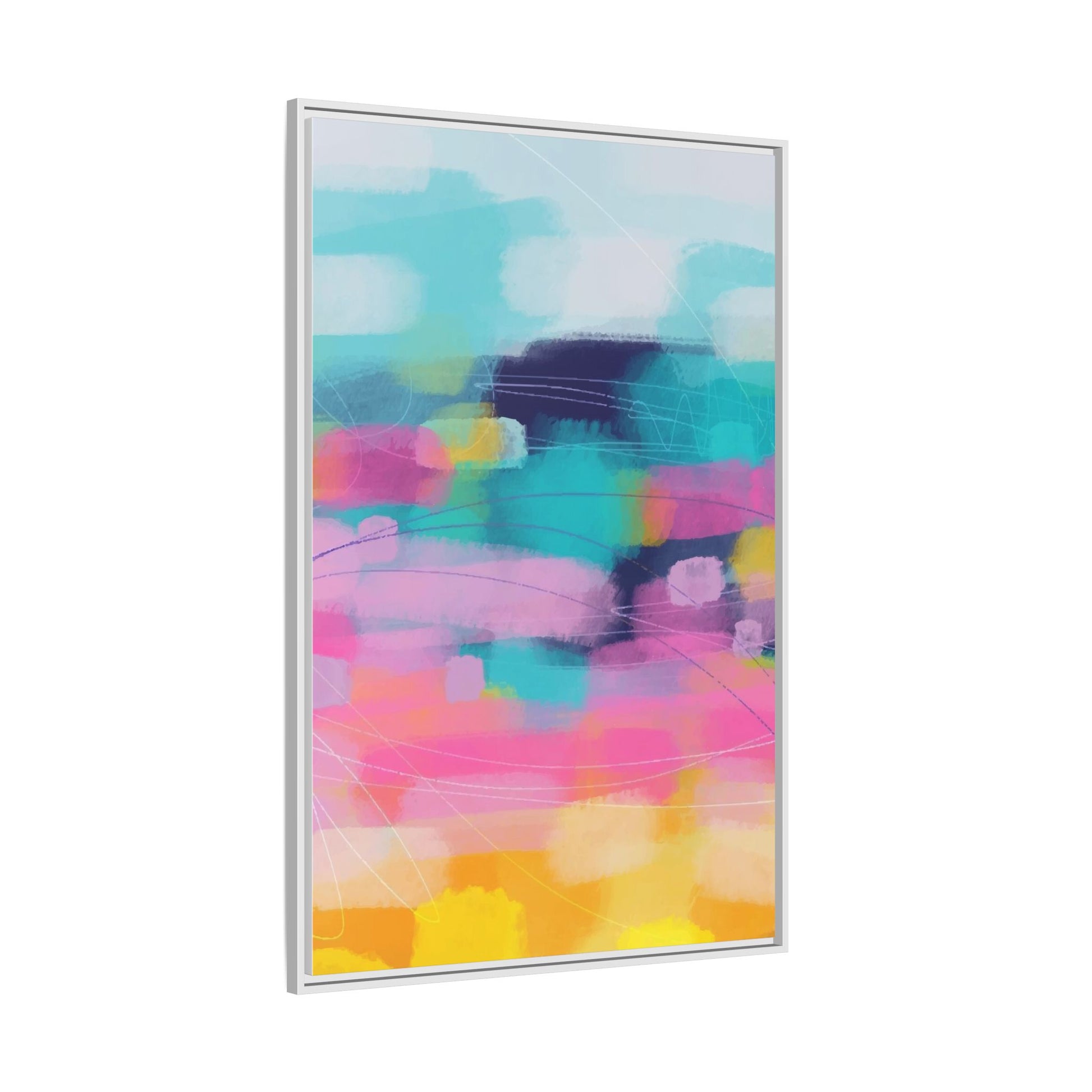 This vibrant abstract digital artwork showcases a dynamic landscape of blended colors and soft, flowing shapes. Brilliant turquoise, hot pink, yellow, and navy blue merge and overlap in ethereal, horizontal bands that suggest a dreamlike interpretation of a horizon or seascape. Delicate white lines weave through the composition, adding subtle texture and movement to the blurred color fields. The image evokes a sense of fluidity and motion, with each color bleeding softly into the next, creating a sense of peaceful transformation. The overall style appears to be a modern, digital painting that explores color relationships and emotional atmospheric qualities.