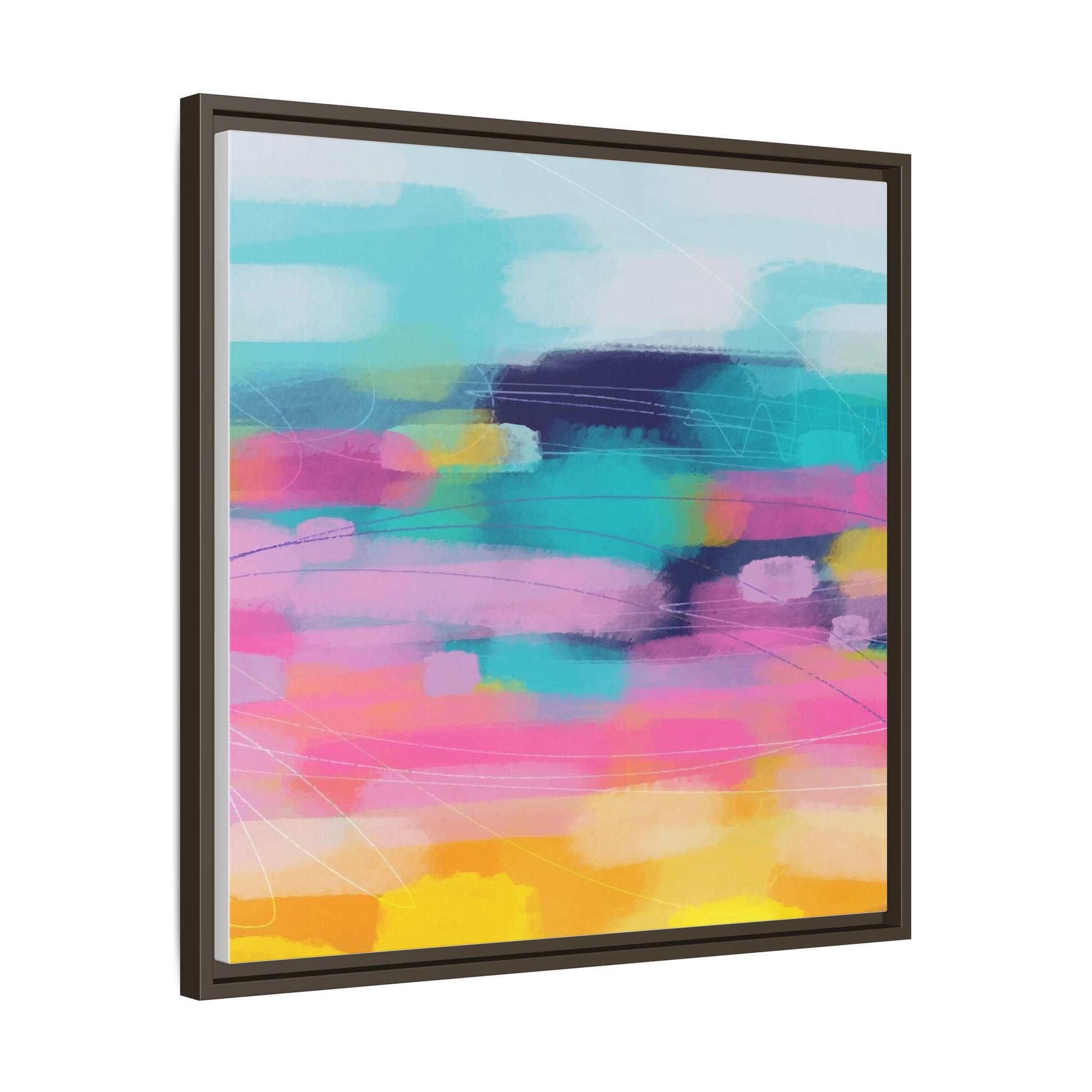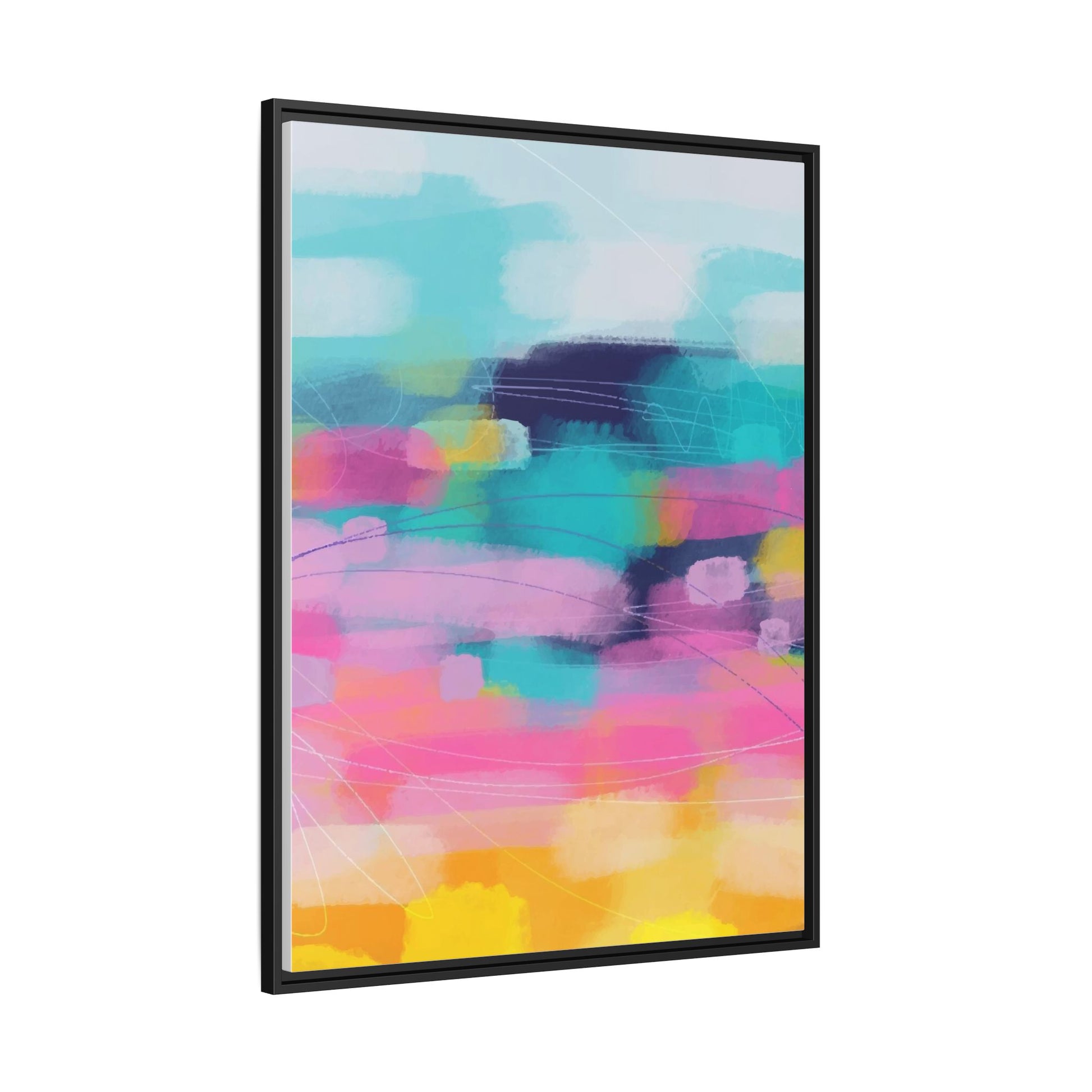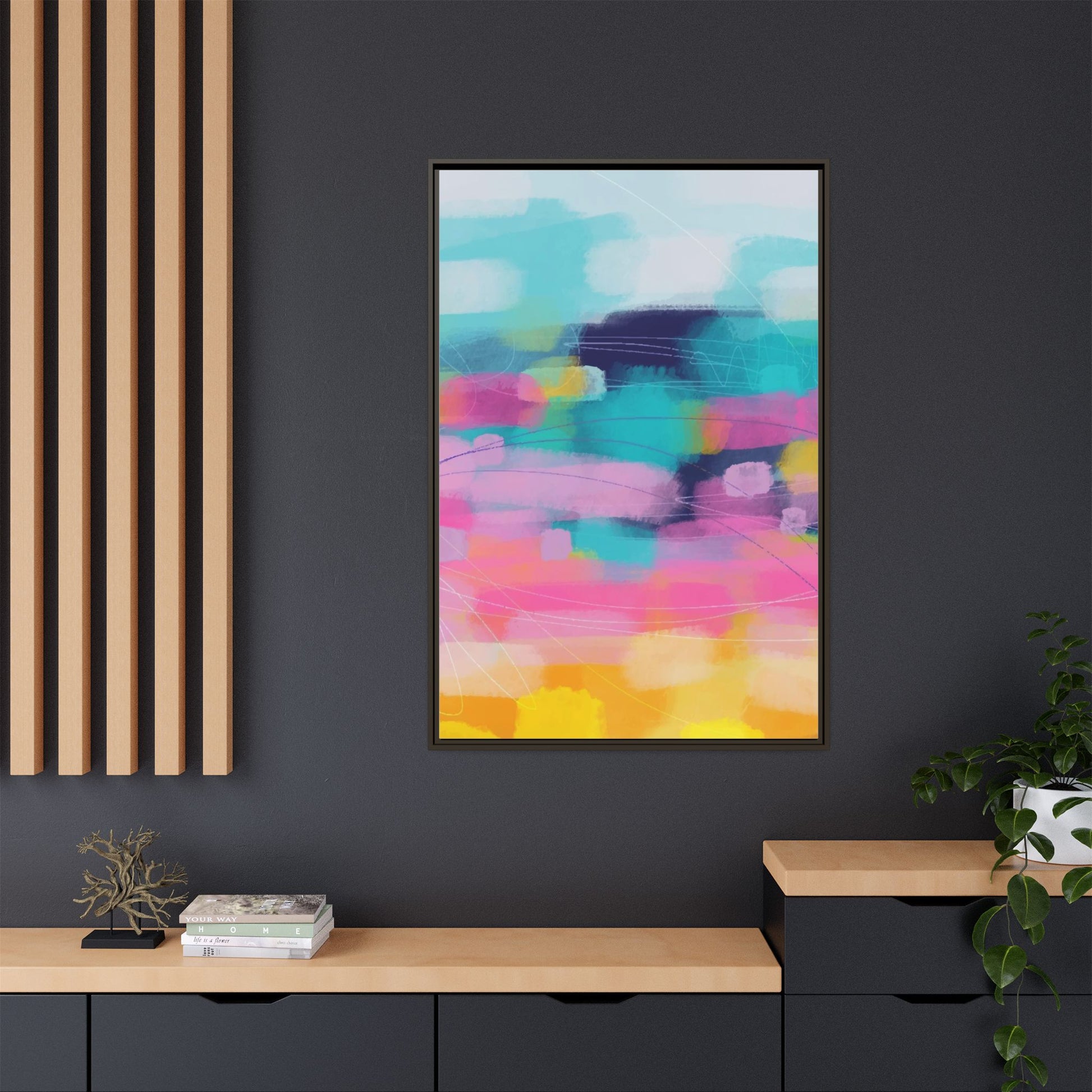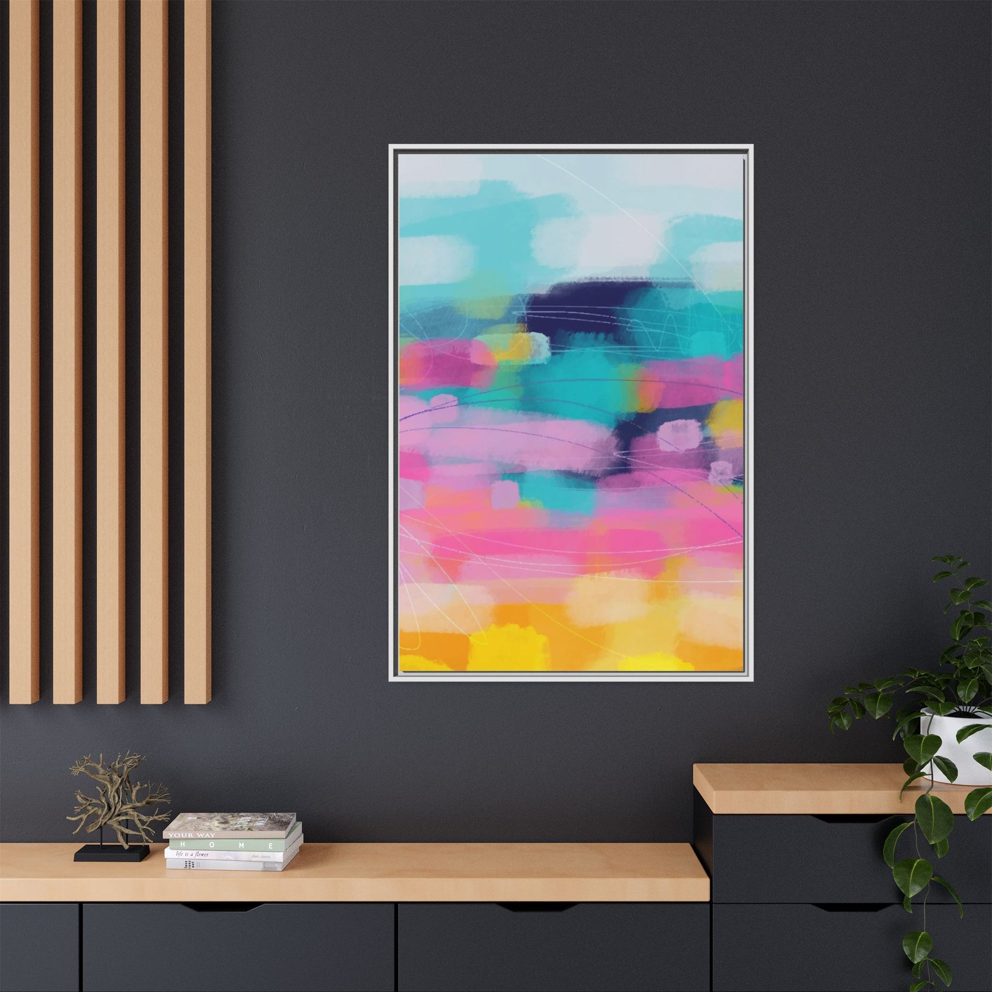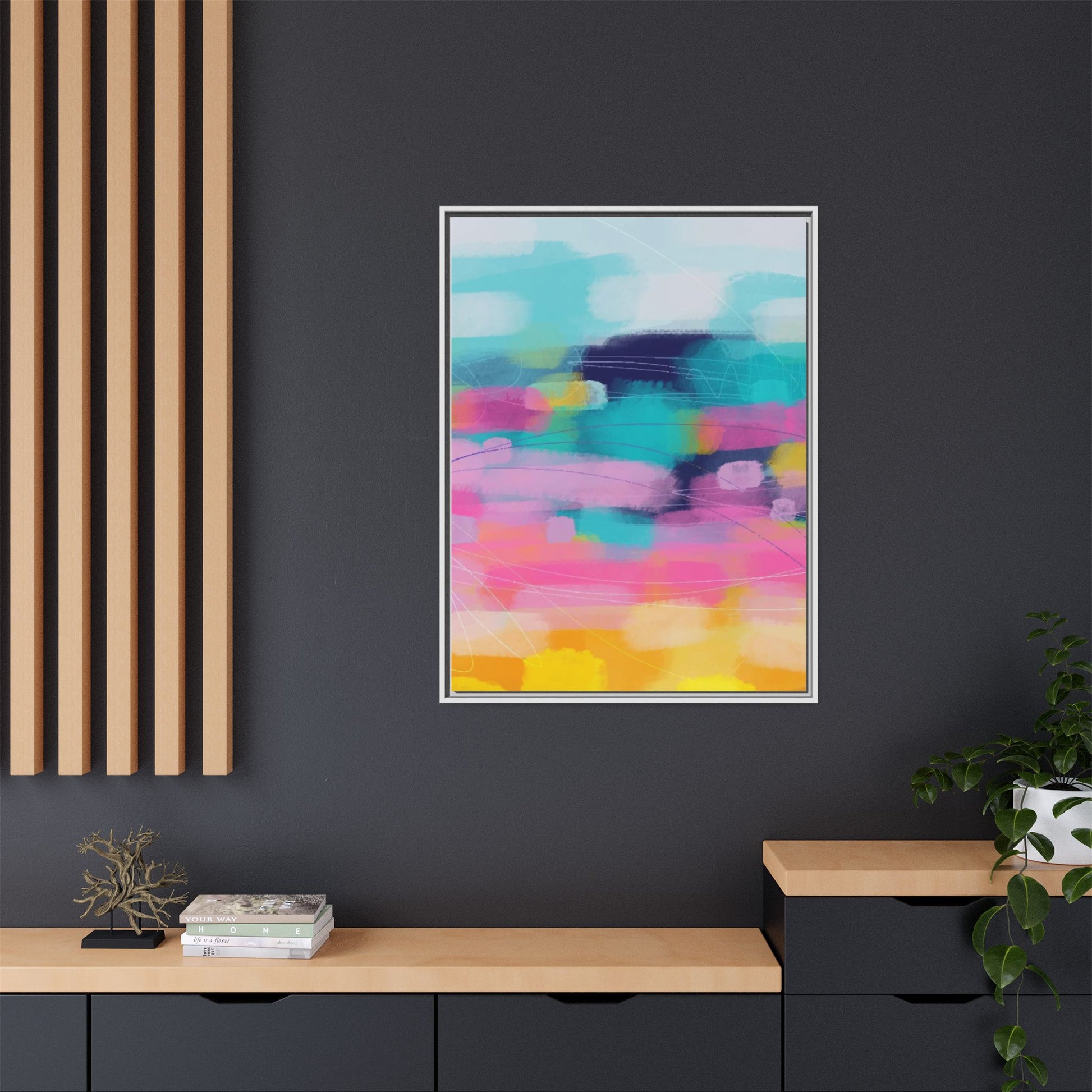 This vibrant abstract digital artwork showcases a dynamic landscape of blended colors and soft, flowing shapes. Brilliant turquoise, hot pink, yellow, and navy blue merge and overlap in ethereal, horizontal bands that suggest a dreamlike interpretation of a horizon or seascape. Delicate white lines weave through the composition, adding subtle texture and movement to the blurred color fields. The image evokes a sense of fluidity and motion, with each color bleeding softly into the next, creating a sense of peaceful transformation. The overall style appears to be a modern, digital painting that explores color relationships and emotional atmospheric qualities.