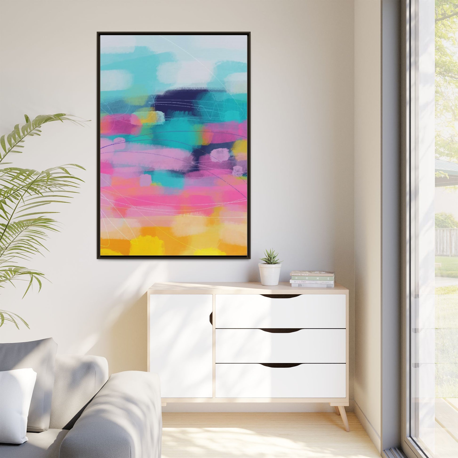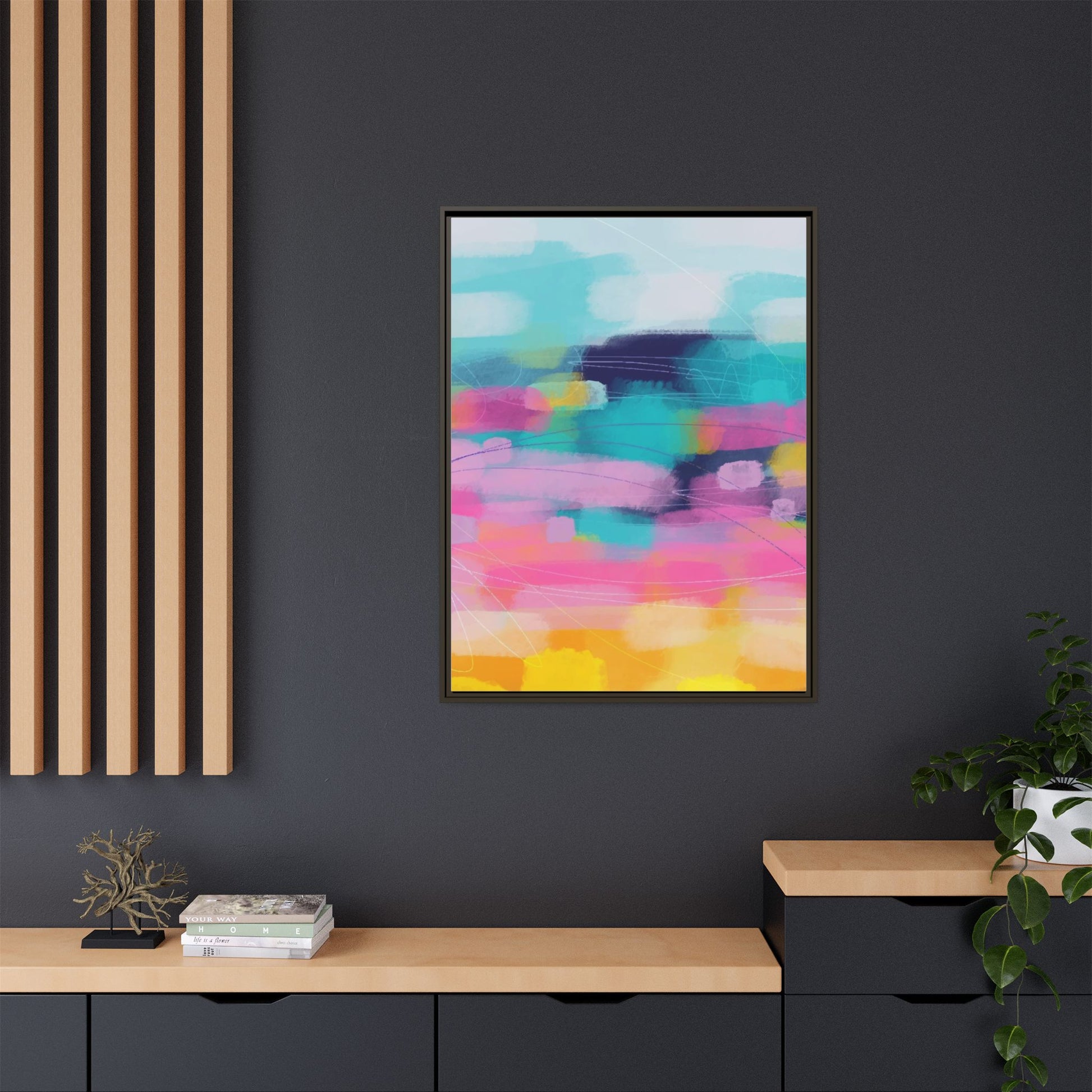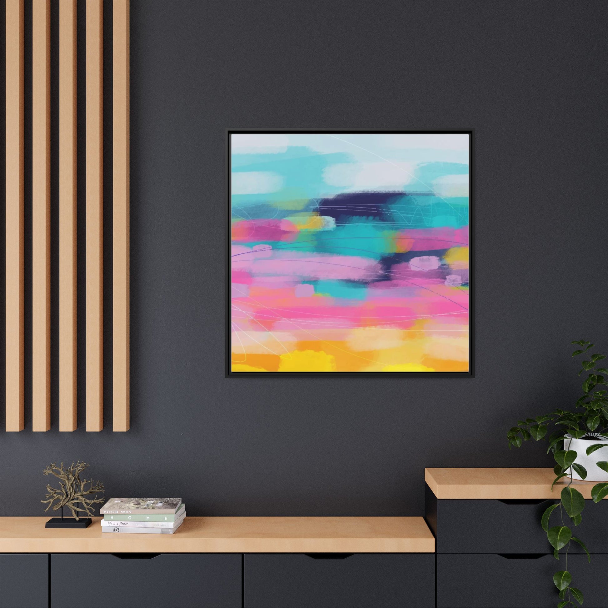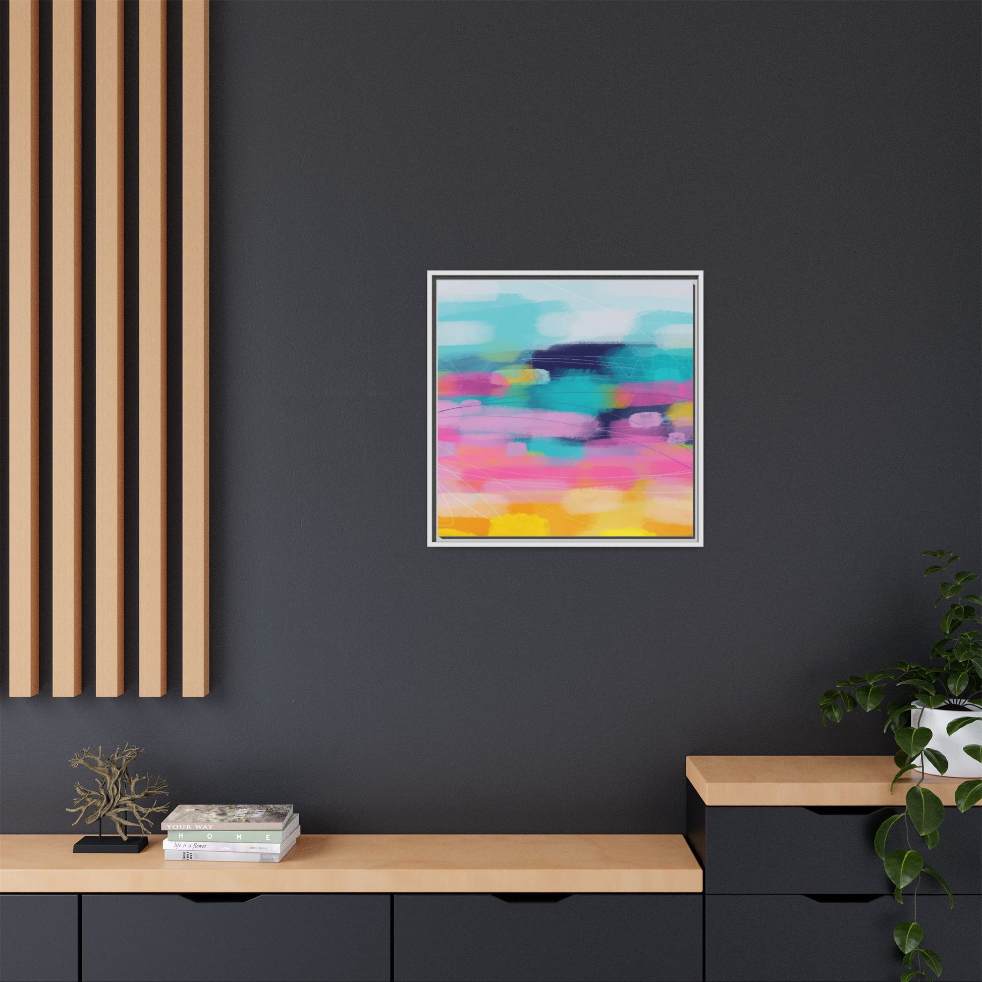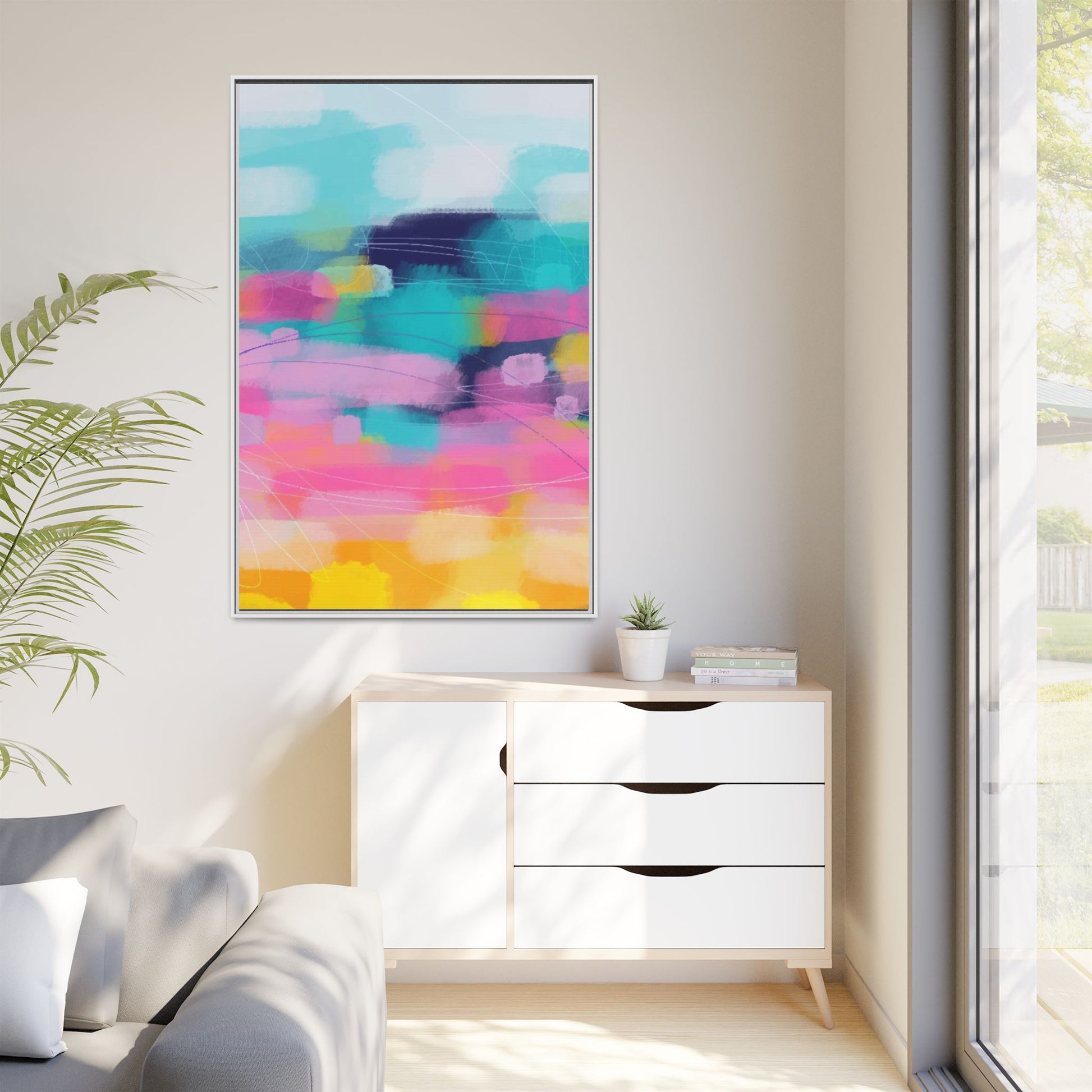 This vibrant abstract digital artwork showcases a dynamic landscape of blended colors and soft, flowing shapes. Brilliant turquoise, hot pink, yellow, and navy blue merge and overlap in ethereal, horizontal bands that suggest a dreamlike interpretation of a horizon or seascape. Delicate white lines weave through the composition, adding subtle texture and movement to the blurred color fields. The image evokes a sense of fluidity and motion, with each color bleeding softly into the next, creating a sense of peaceful transformation. The overall style appears to be a modern, digital painting that explores color relationships and emotional atmospheric qualities.