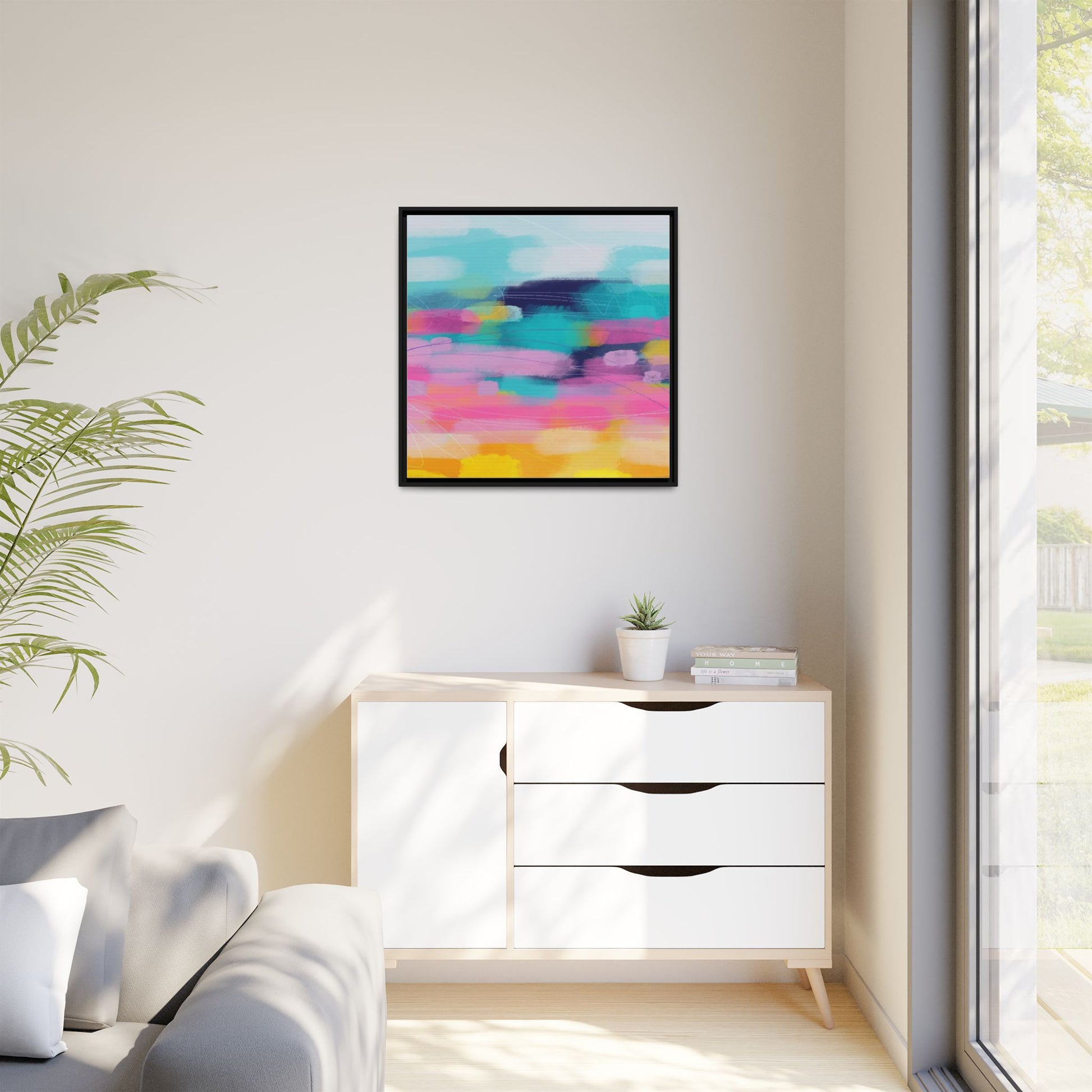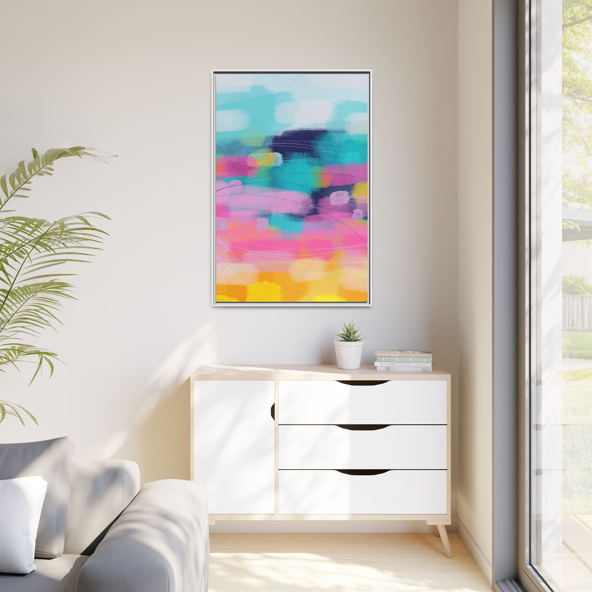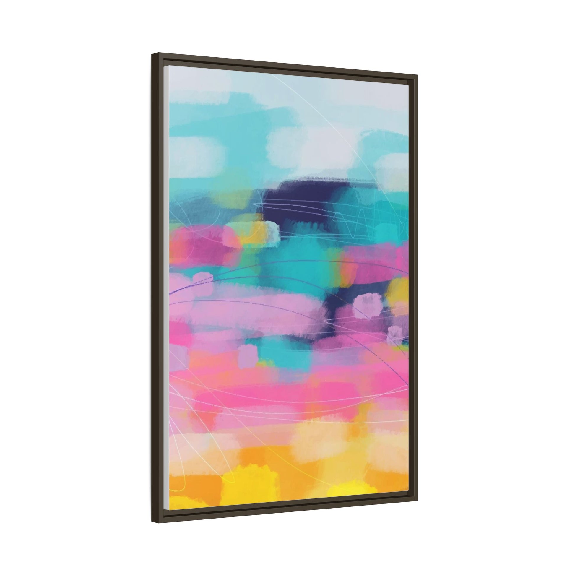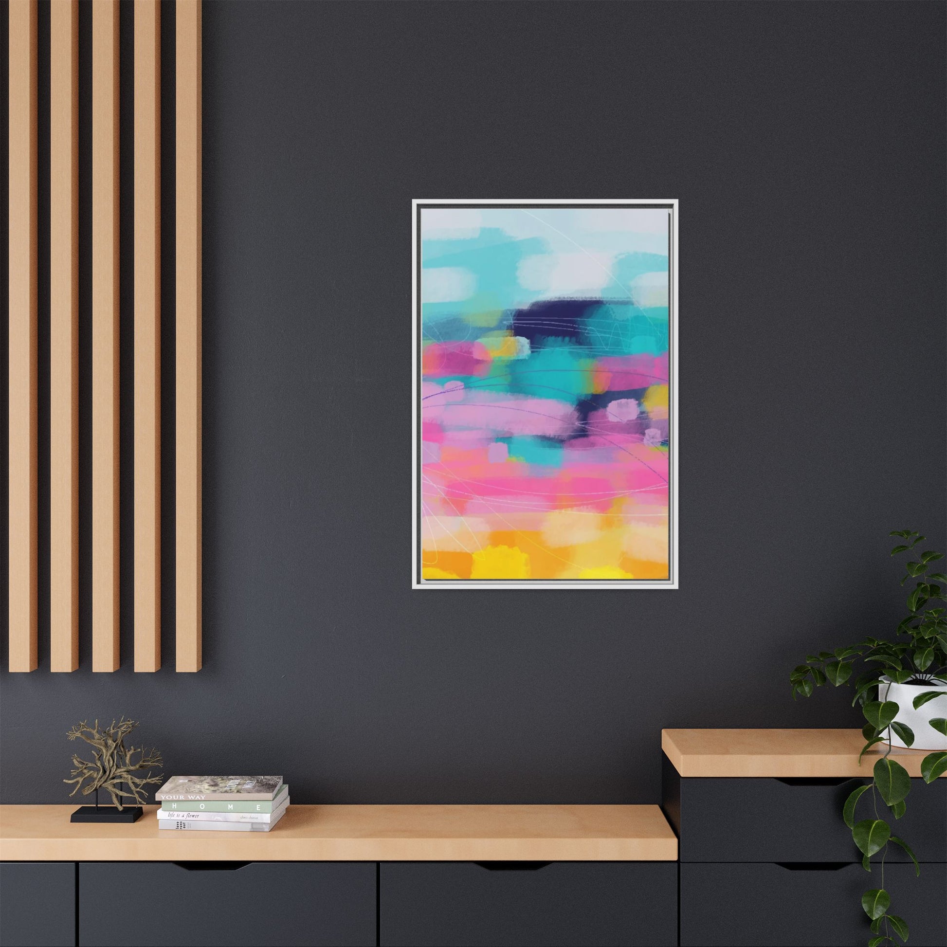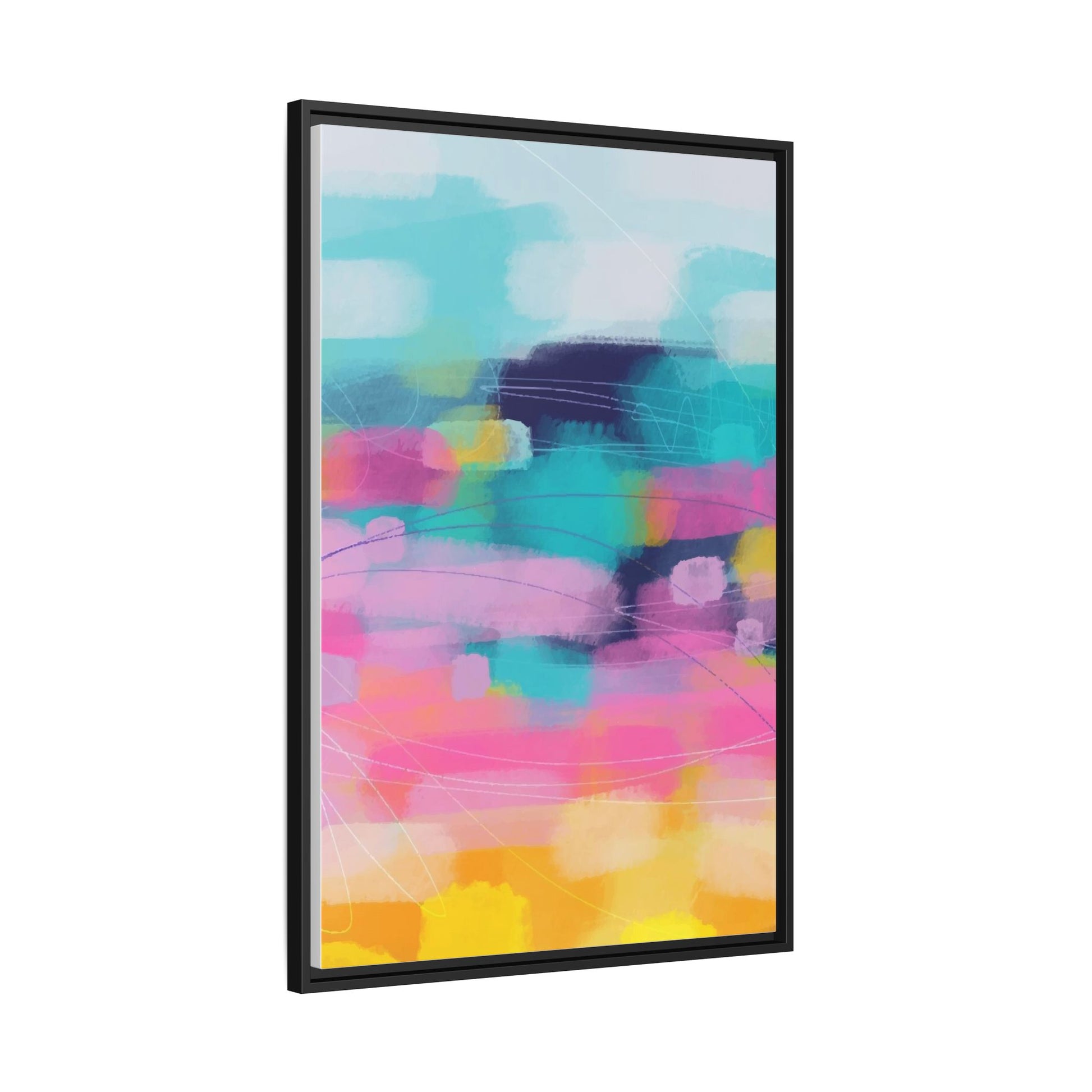 This vibrant abstract digital artwork showcases a dynamic landscape of blended colors and soft, flowing shapes. Brilliant turquoise, hot pink, yellow, and navy blue merge and overlap in ethereal, horizontal bands that suggest a dreamlike interpretation of a horizon or seascape. Delicate white lines weave through the composition, adding subtle texture and movement to the blurred color fields. The image evokes a sense of fluidity and motion, with each color bleeding softly into the next, creating a sense of peaceful transformation. The overall style appears to be a modern, digital painting that explores color relationships and emotional atmospheric qualities.