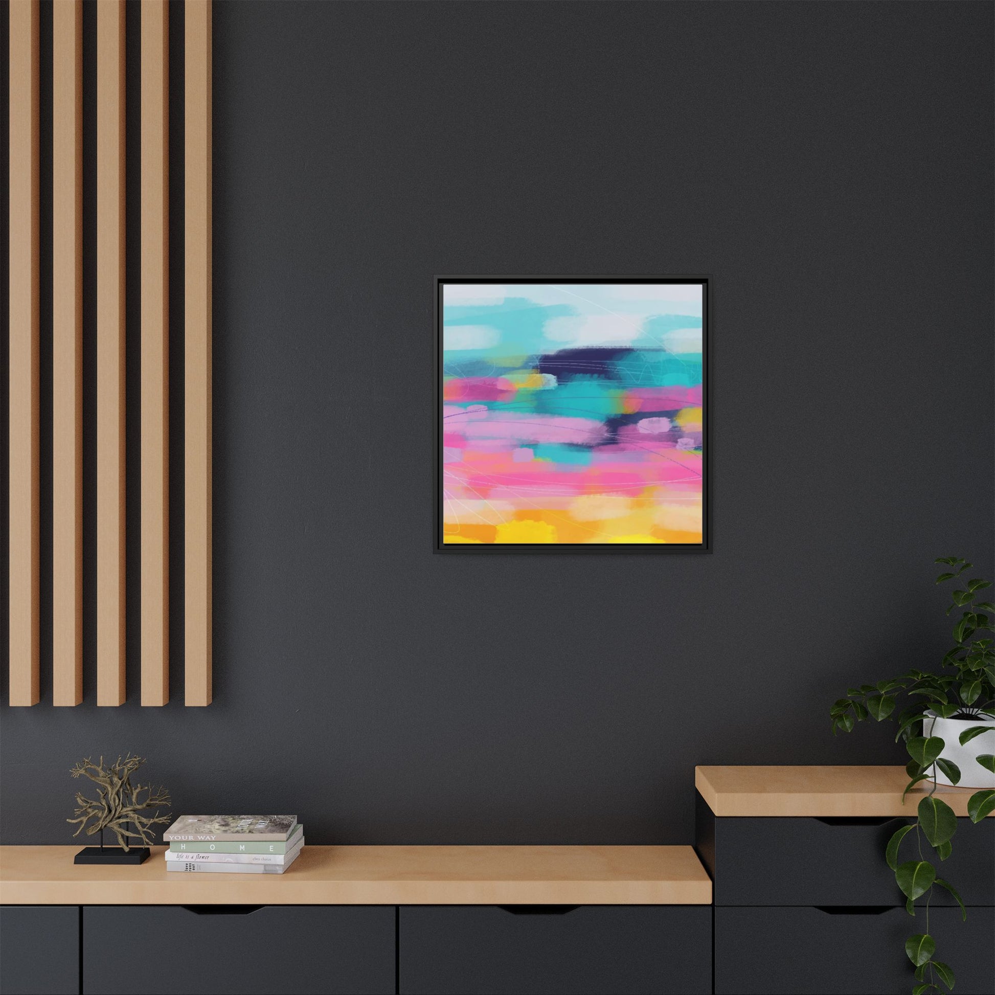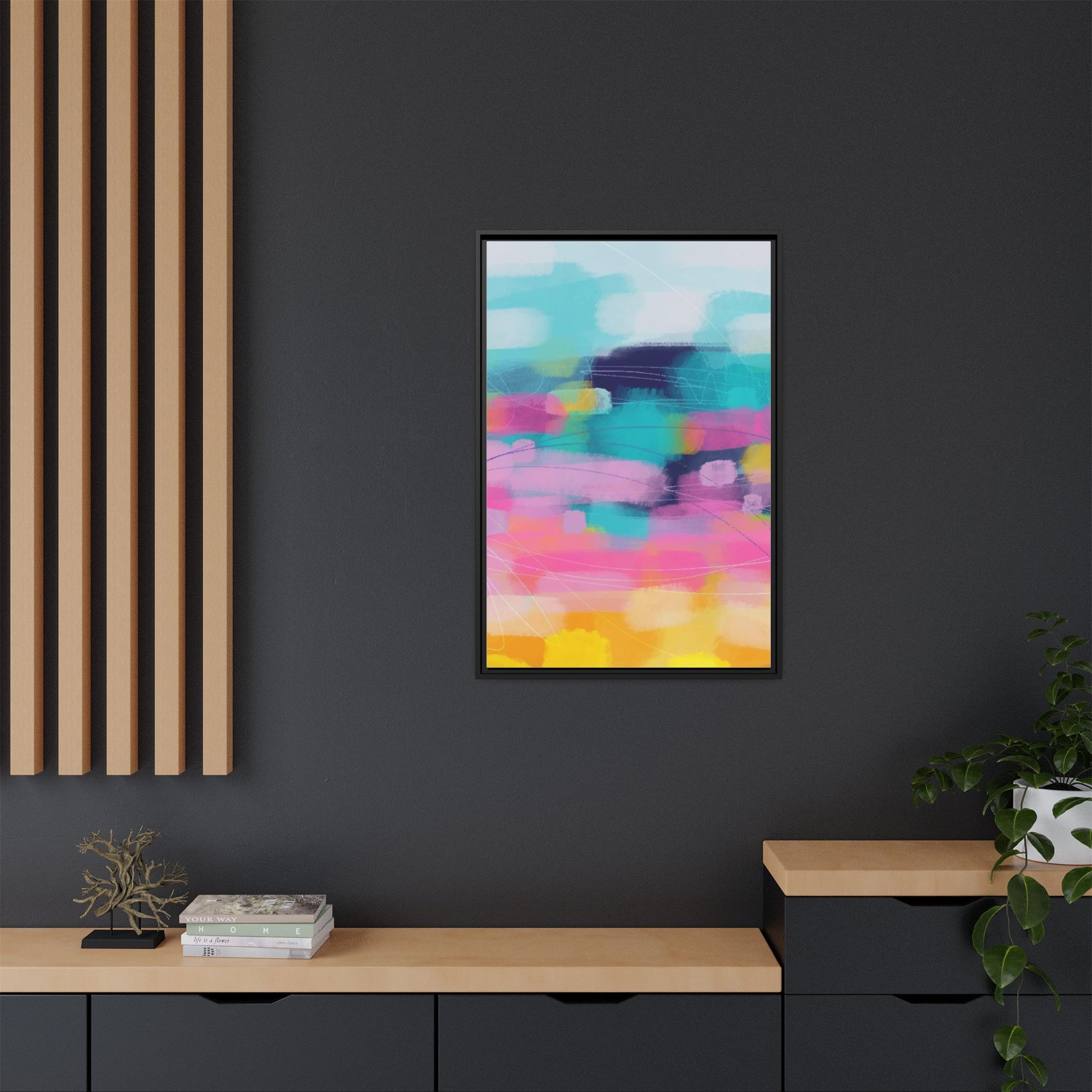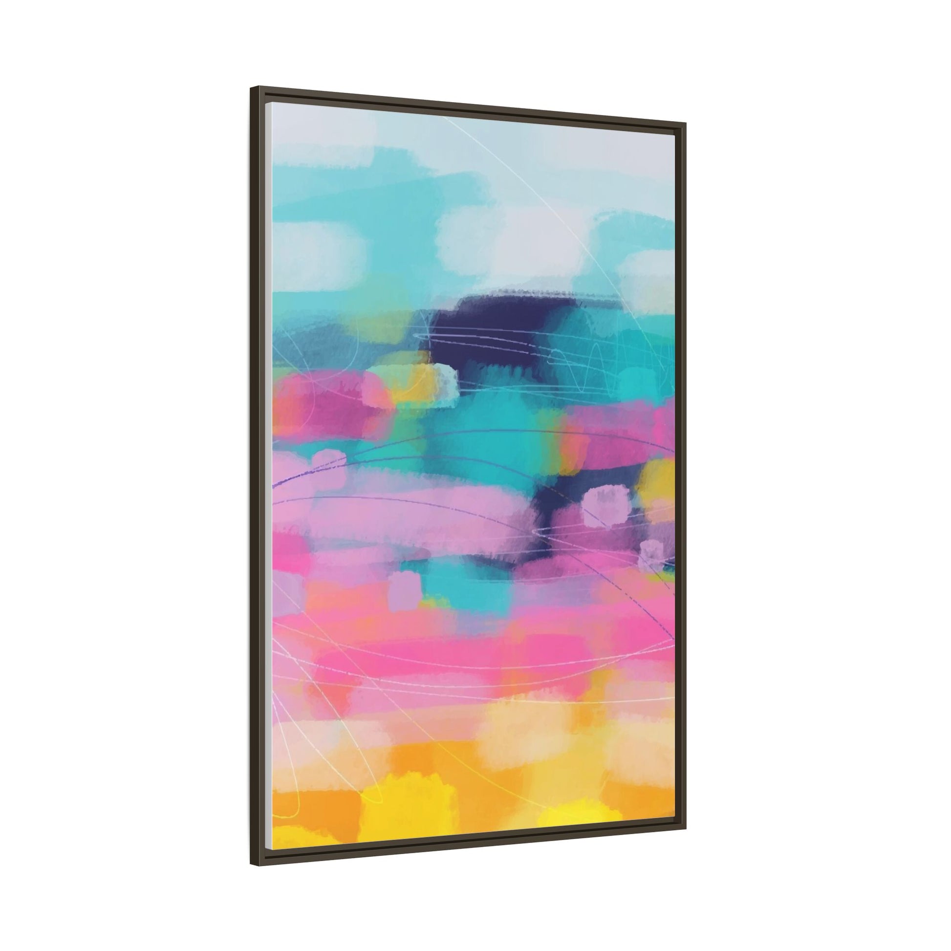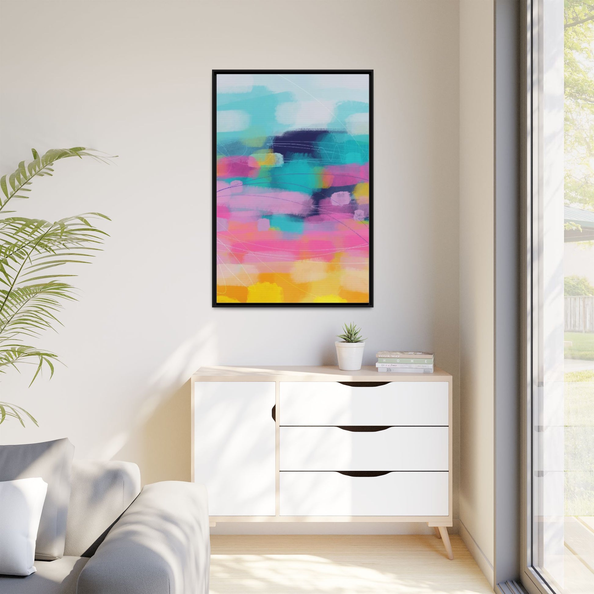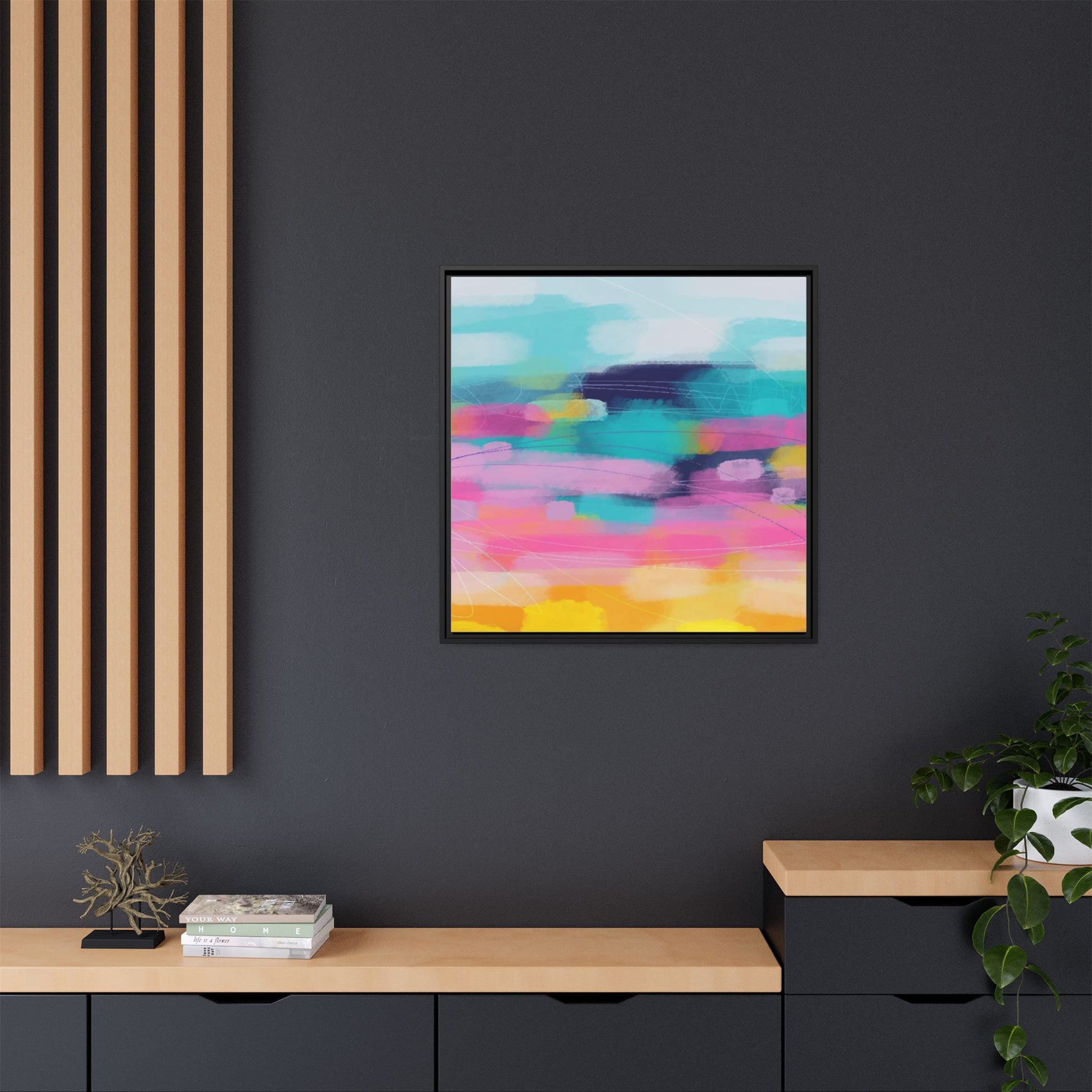 This vibrant abstract digital artwork showcases a dynamic landscape of blended colors and soft, flowing shapes. Brilliant turquoise, hot pink, yellow, and navy blue merge and overlap in ethereal, horizontal bands that suggest a dreamlike interpretation of a horizon or seascape. Delicate white lines weave through the composition, adding subtle texture and movement to the blurred color fields. The image evokes a sense of fluidity and motion, with each color bleeding softly into the next, creating a sense of peaceful transformation. The overall style appears to be a modern, digital painting that explores color relationships and emotional atmospheric qualities.