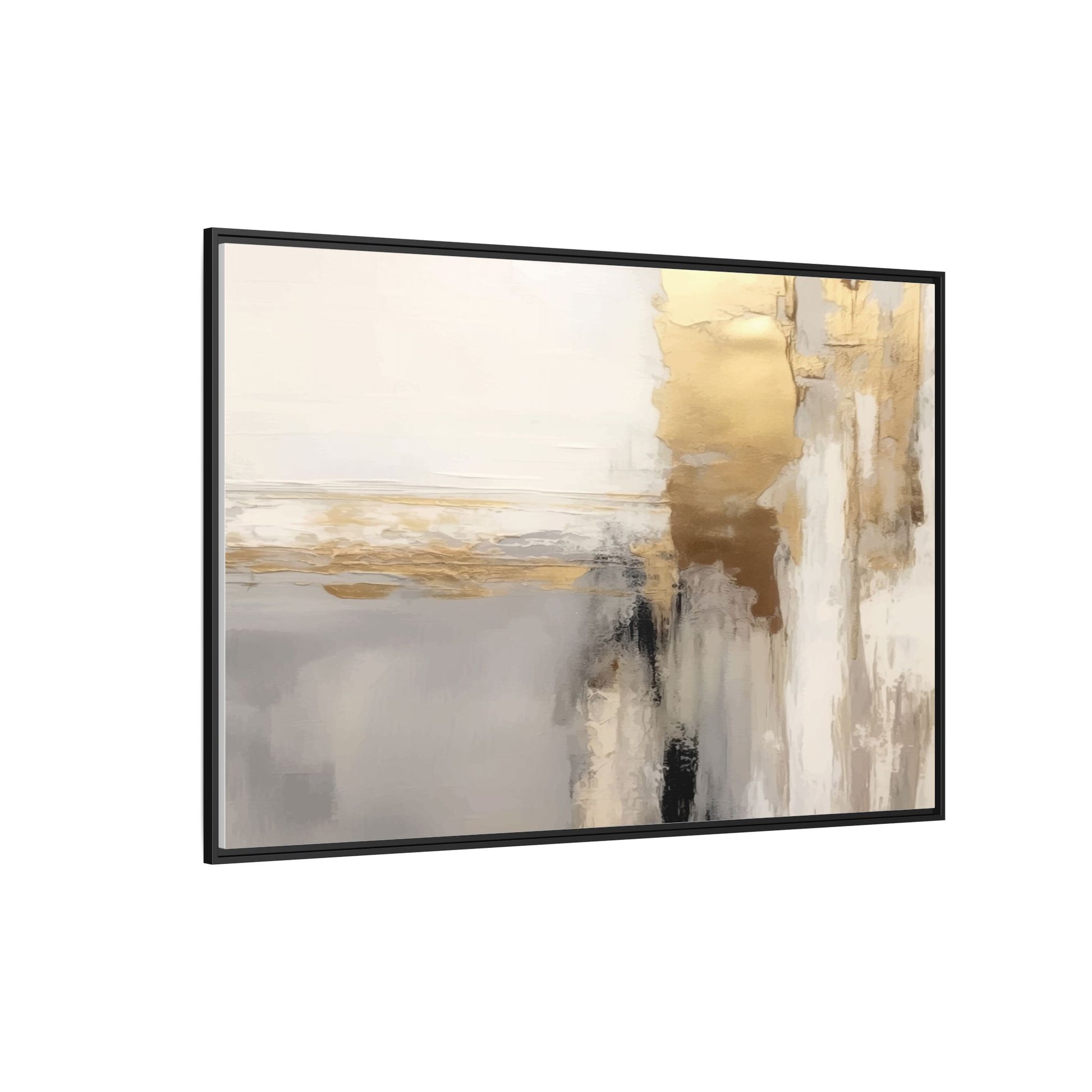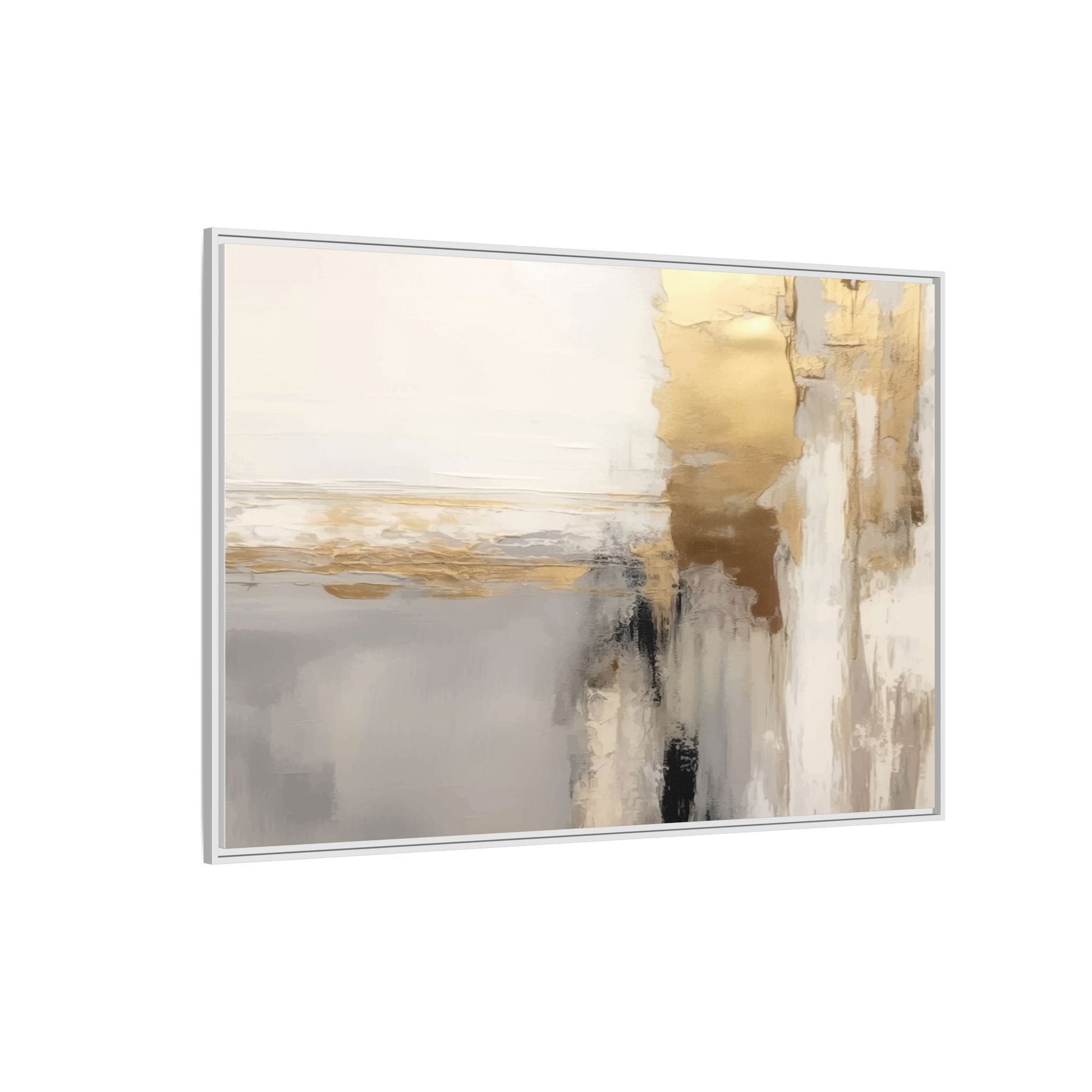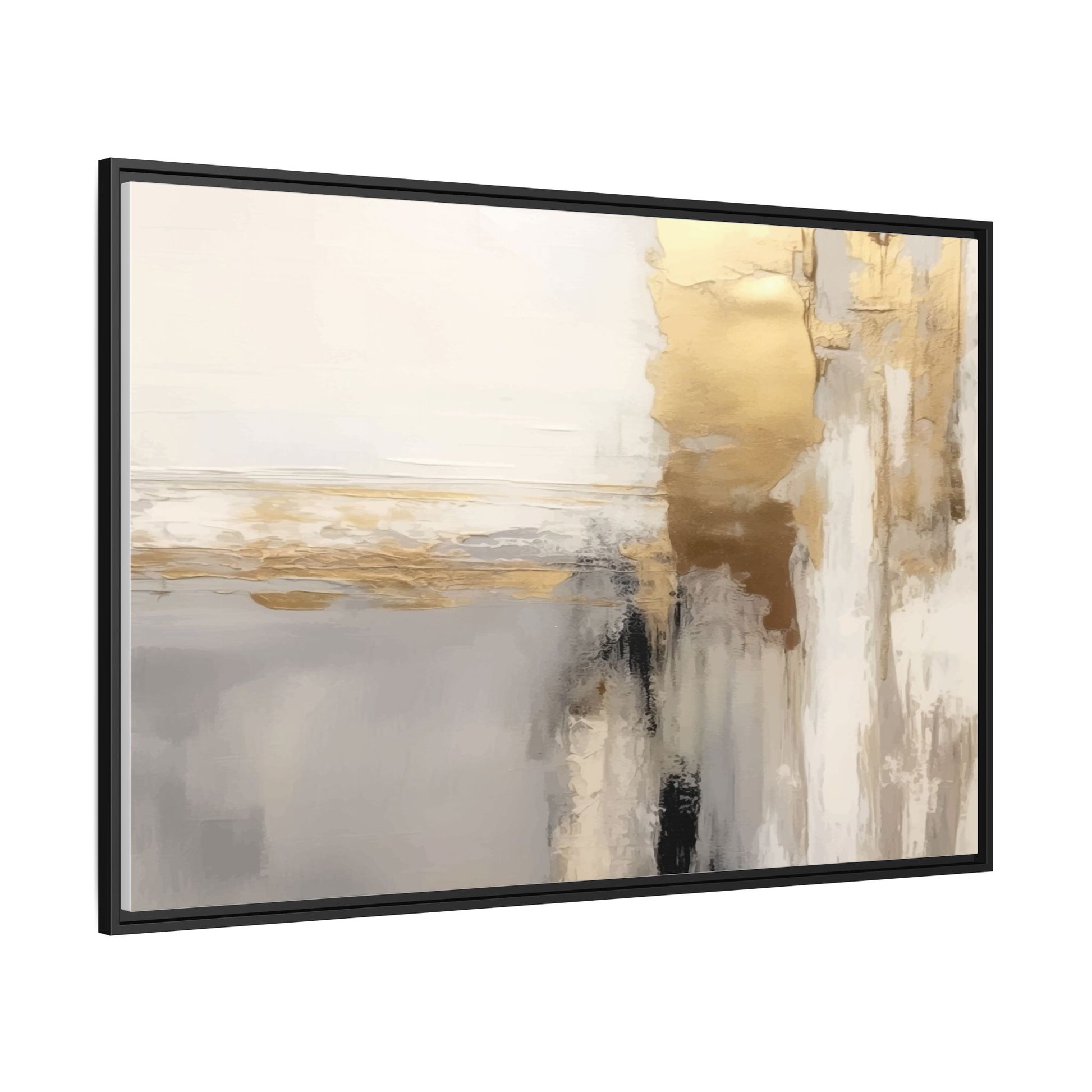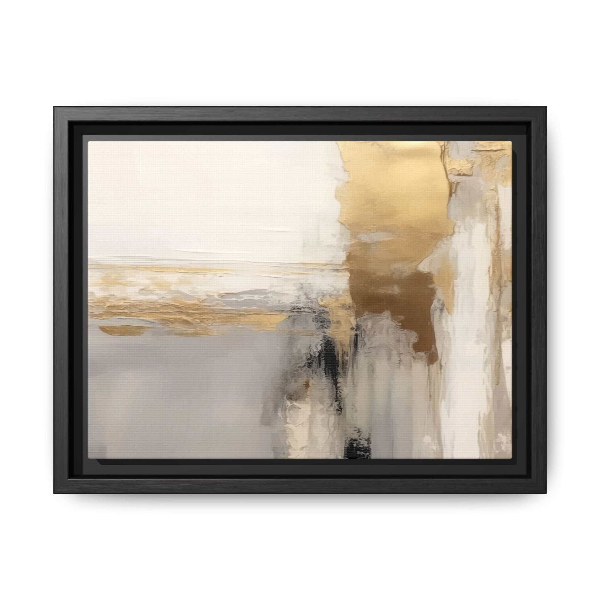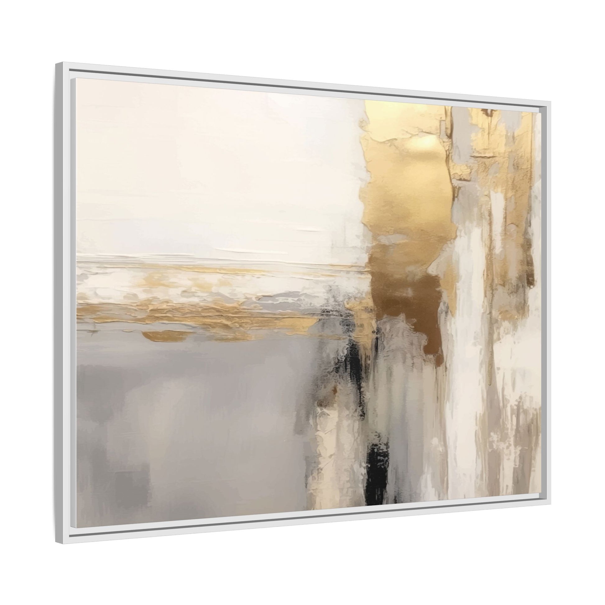 This captivating abstract artwork features a sophisticated palette of gold, white, gray, and black tones blended in a fluid, contemporary style. The painting appears to utilize techniques of layering and blending, creating soft transitions and textural depth across the canvas. Horizontal and vertical elements suggest a landscape-like composition, with sweeping golden hues reminiscent of sunlight or distant horizons intersecting with misty gray and white passages. Bold black brushstrokes provide dramatic contrast and visual anchoring within the ethereal composition. The overall effect is both serene and dynamic, inviting viewers to interpret the painting through their own emotional and visual perspective.