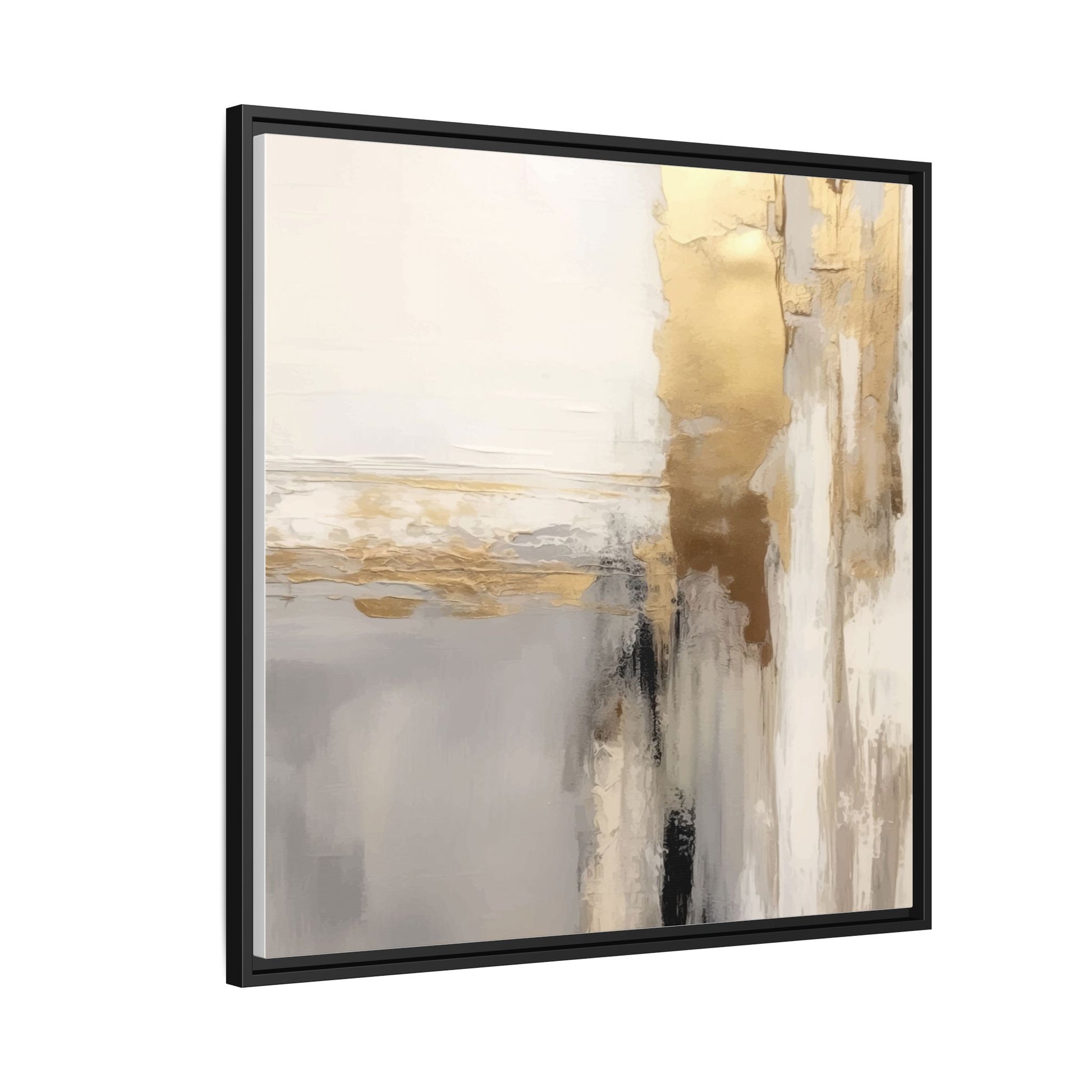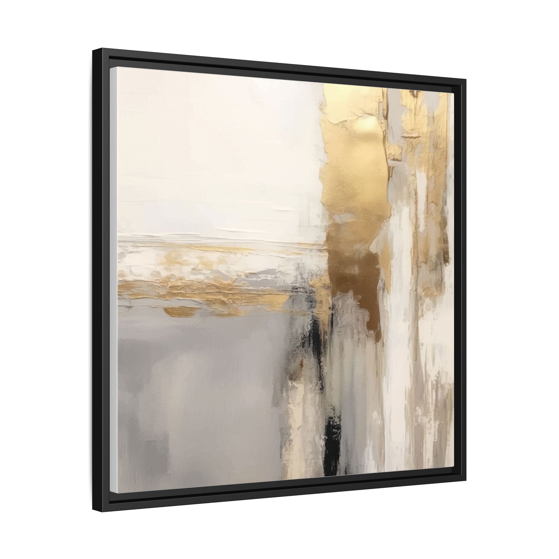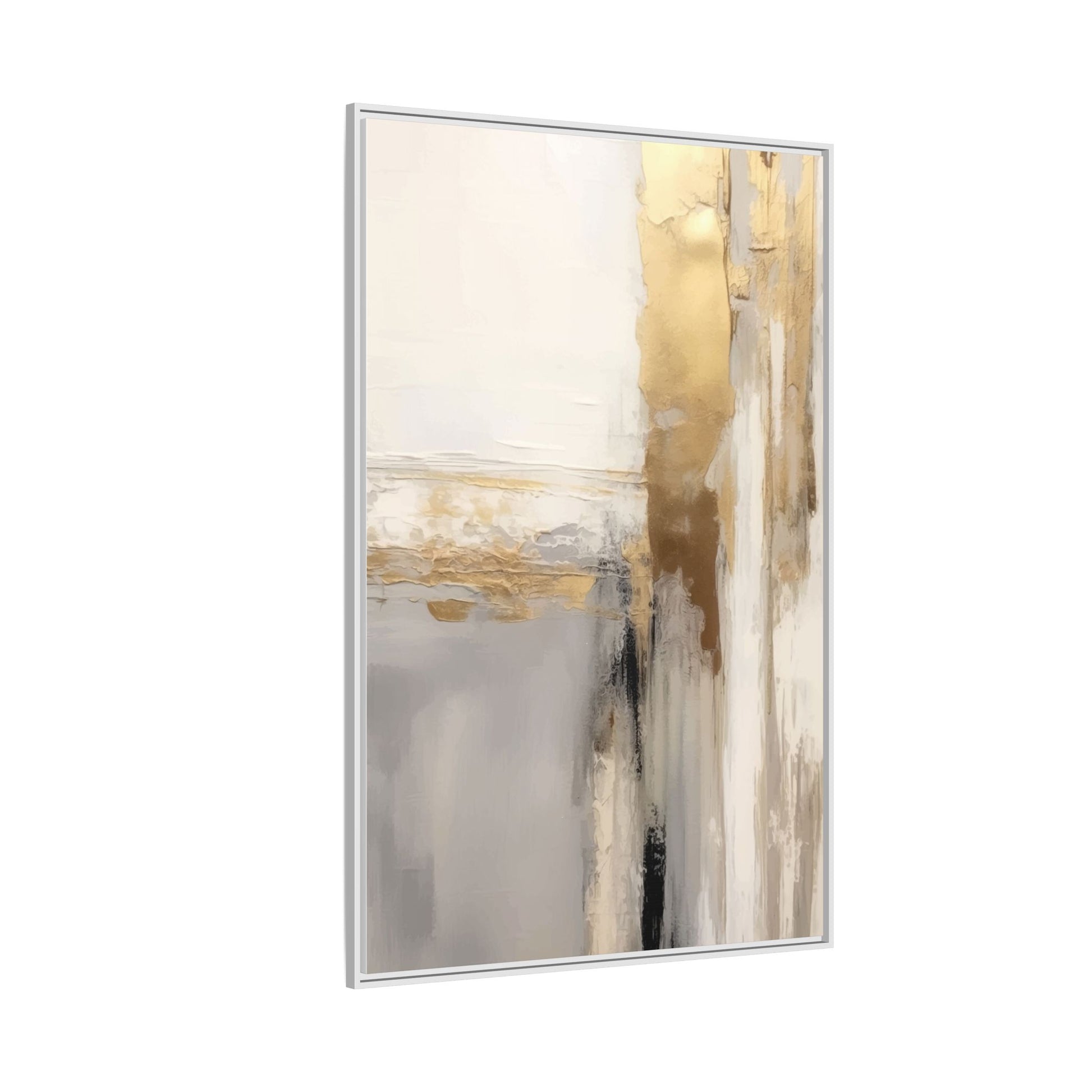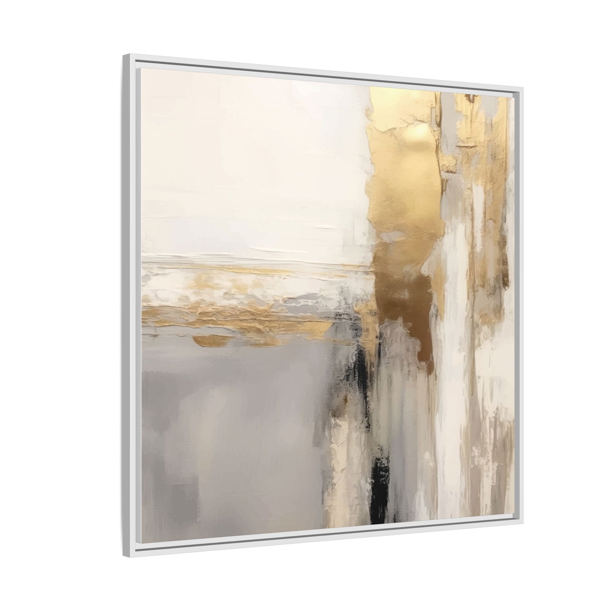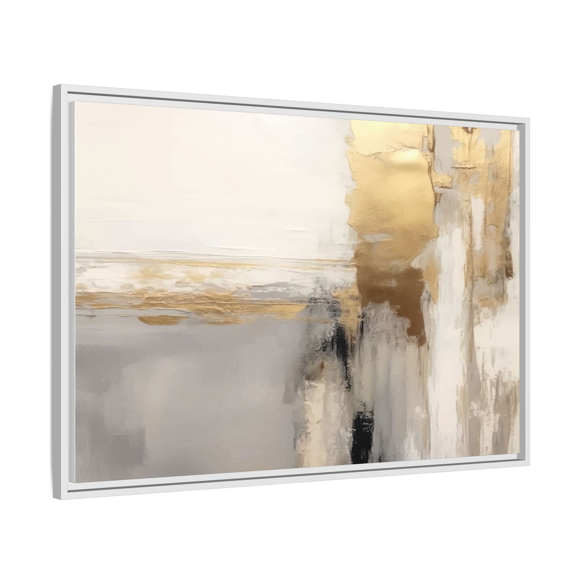 This captivating abstract artwork features a sophisticated palette of gold, white, gray, and black tones blended in a fluid, contemporary style. The painting appears to utilize techniques of layering and blending, creating soft transitions and textural depth across the canvas. Horizontal and vertical elements suggest a landscape-like composition, with sweeping golden hues reminiscent of sunlight or distant horizons intersecting with misty gray and white passages. Bold black brushstrokes provide dramatic contrast and visual anchoring within the ethereal composition. The overall effect is both serene and dynamic, inviting viewers to interpret the painting through their own emotional and visual perspective.