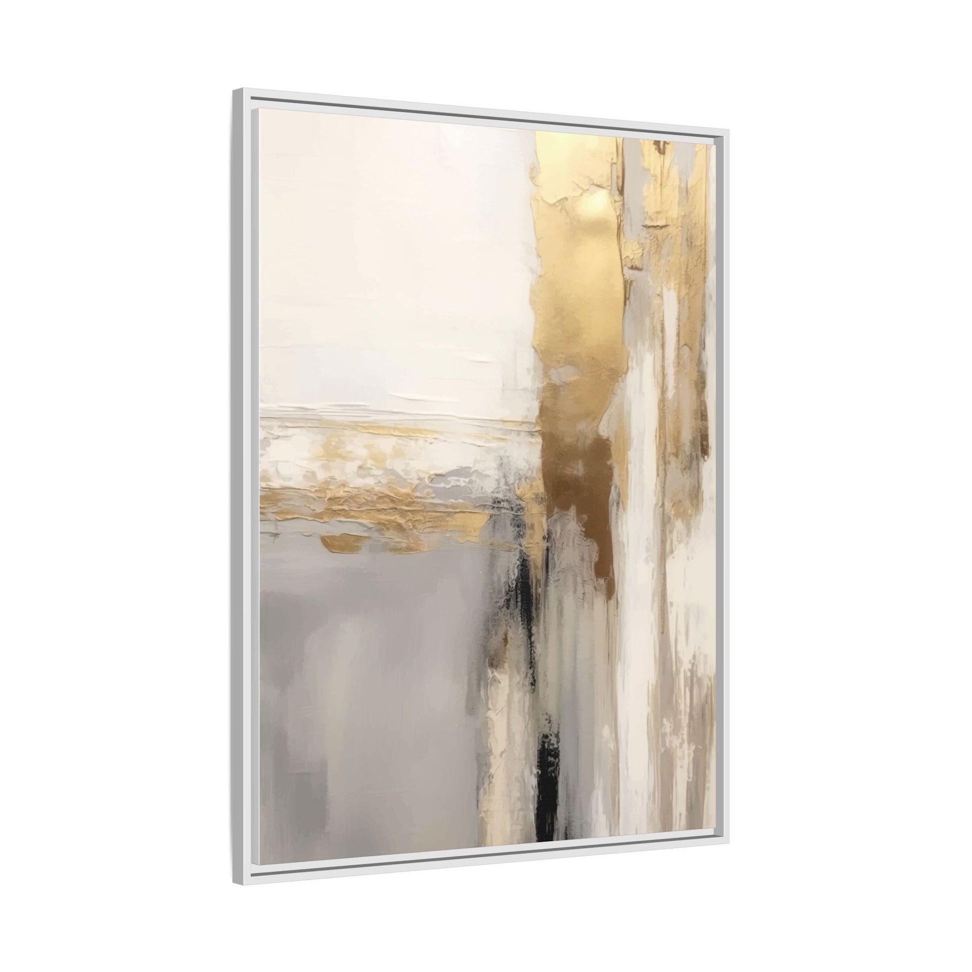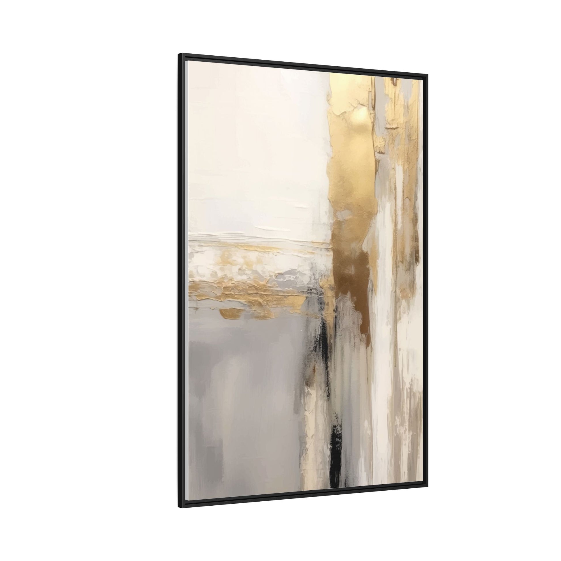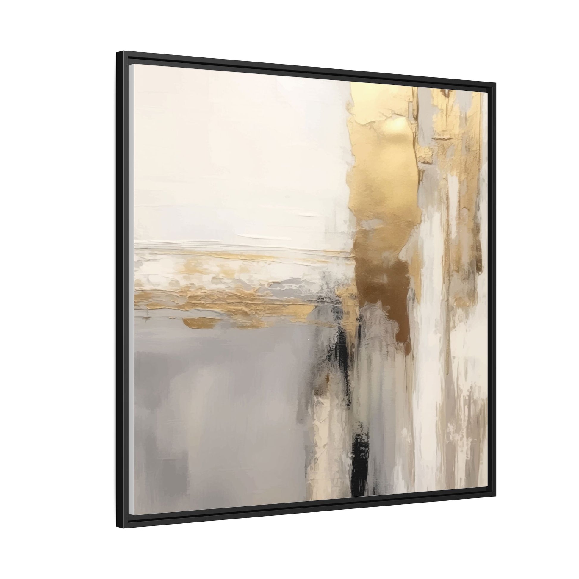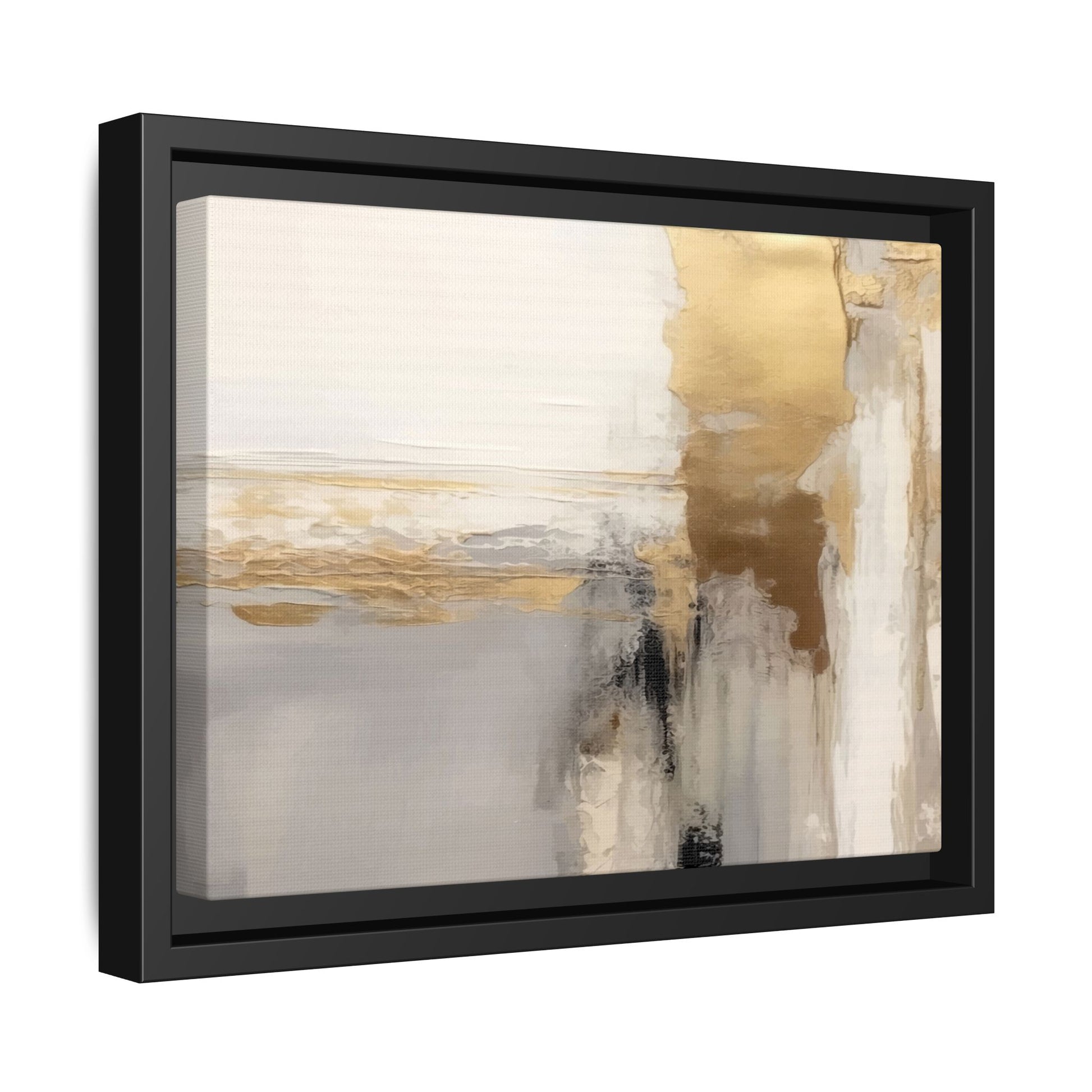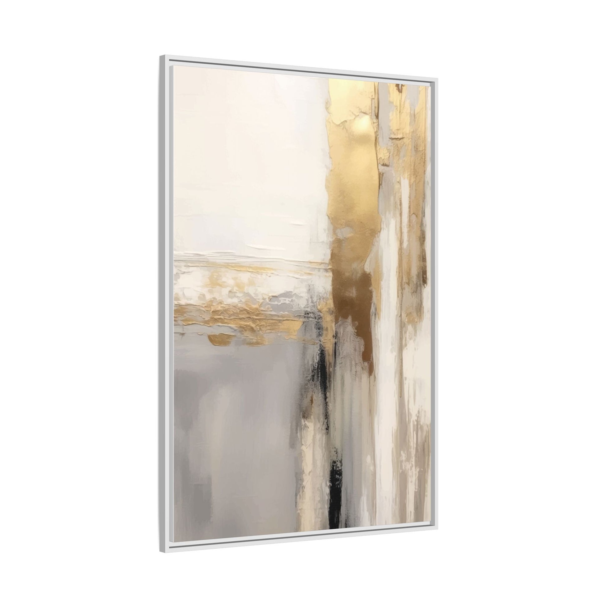 This captivating abstract artwork features a sophisticated palette of gold, white, gray, and black tones blended in a fluid, contemporary style. The painting appears to utilize techniques of layering and blending, creating soft transitions and textural depth across the canvas. Horizontal and vertical elements suggest a landscape-like composition, with sweeping golden hues reminiscent of sunlight or distant horizons intersecting with misty gray and white passages. Bold black brushstrokes provide dramatic contrast and visual anchoring within the ethereal composition. The overall effect is both serene and dynamic, inviting viewers to interpret the painting through their own emotional and visual perspective.