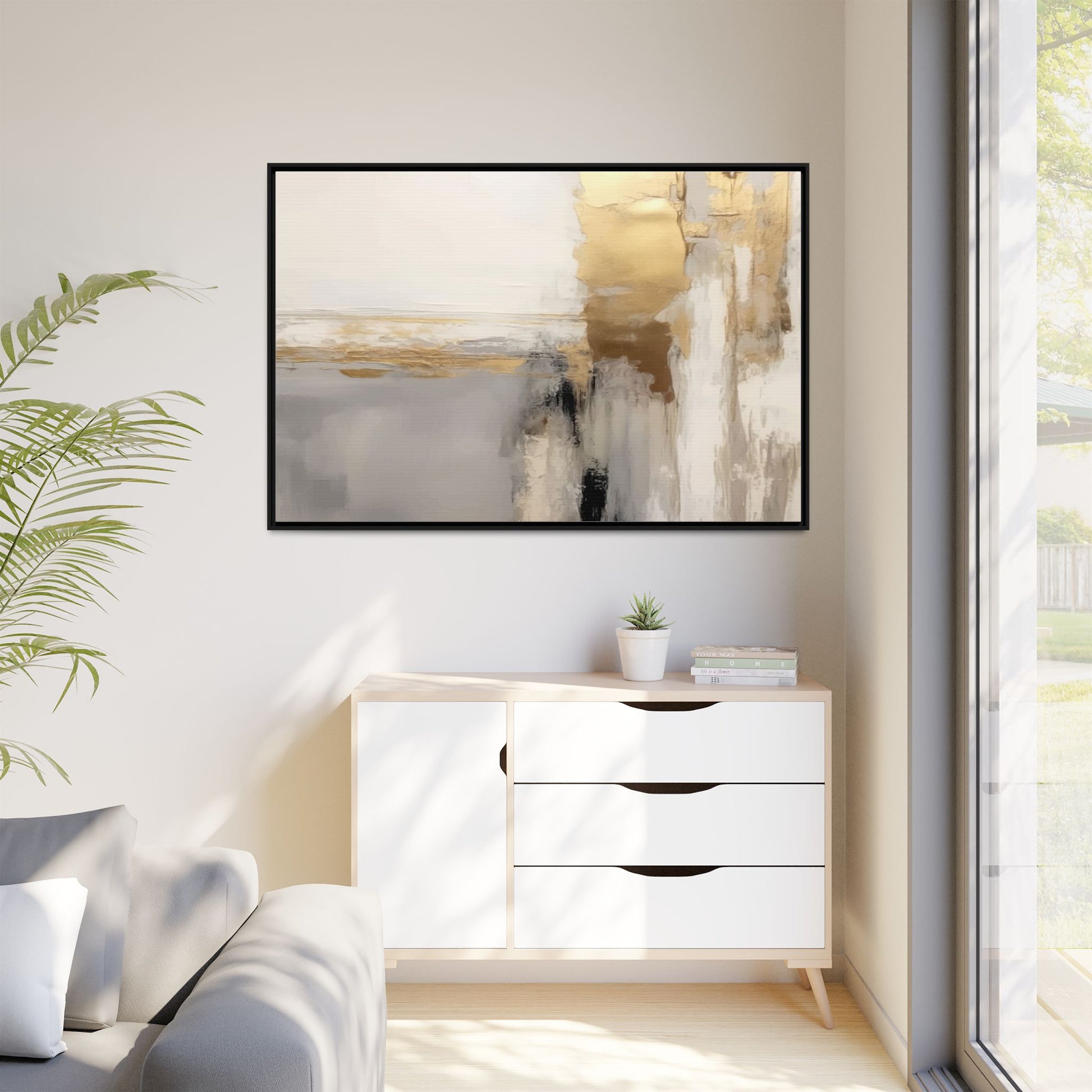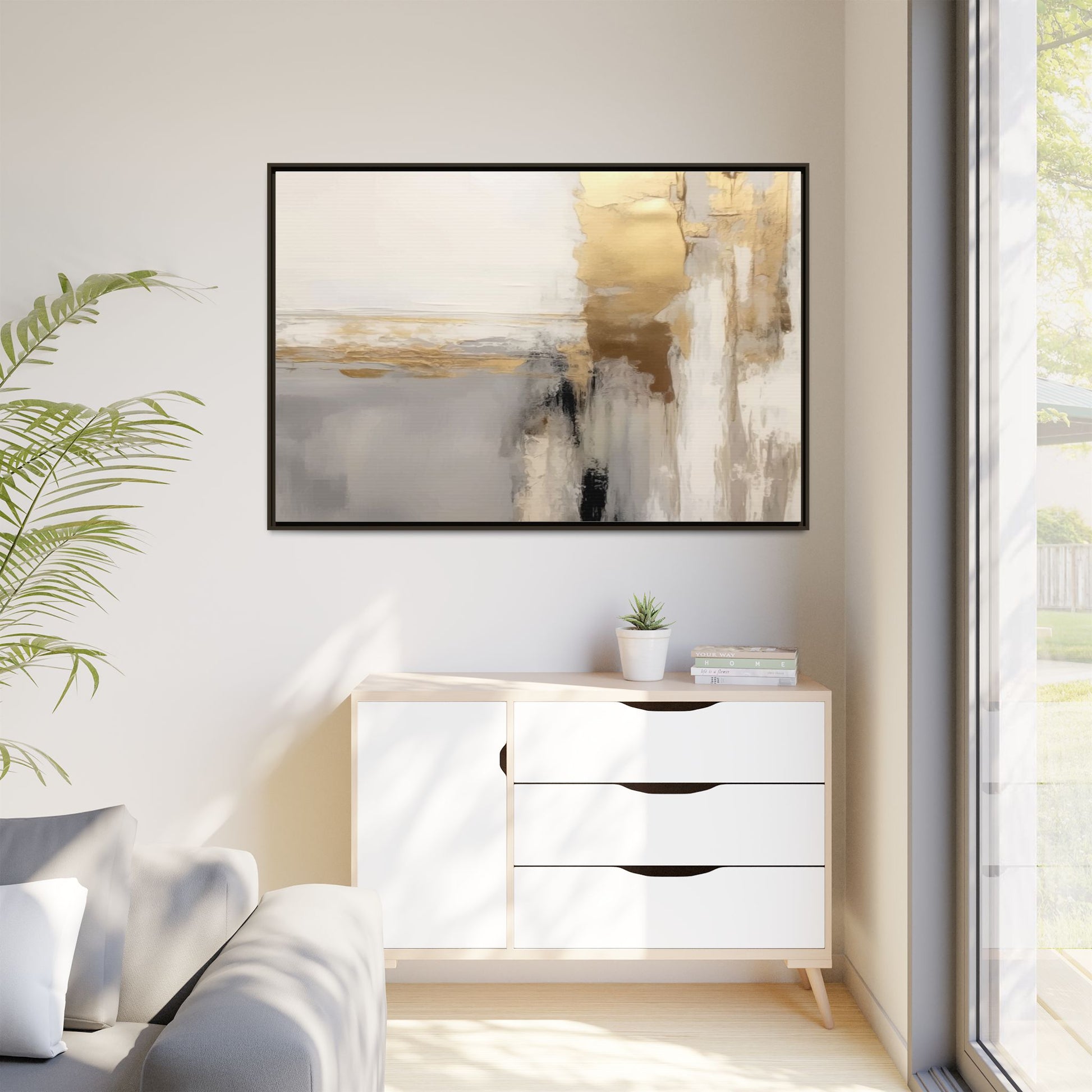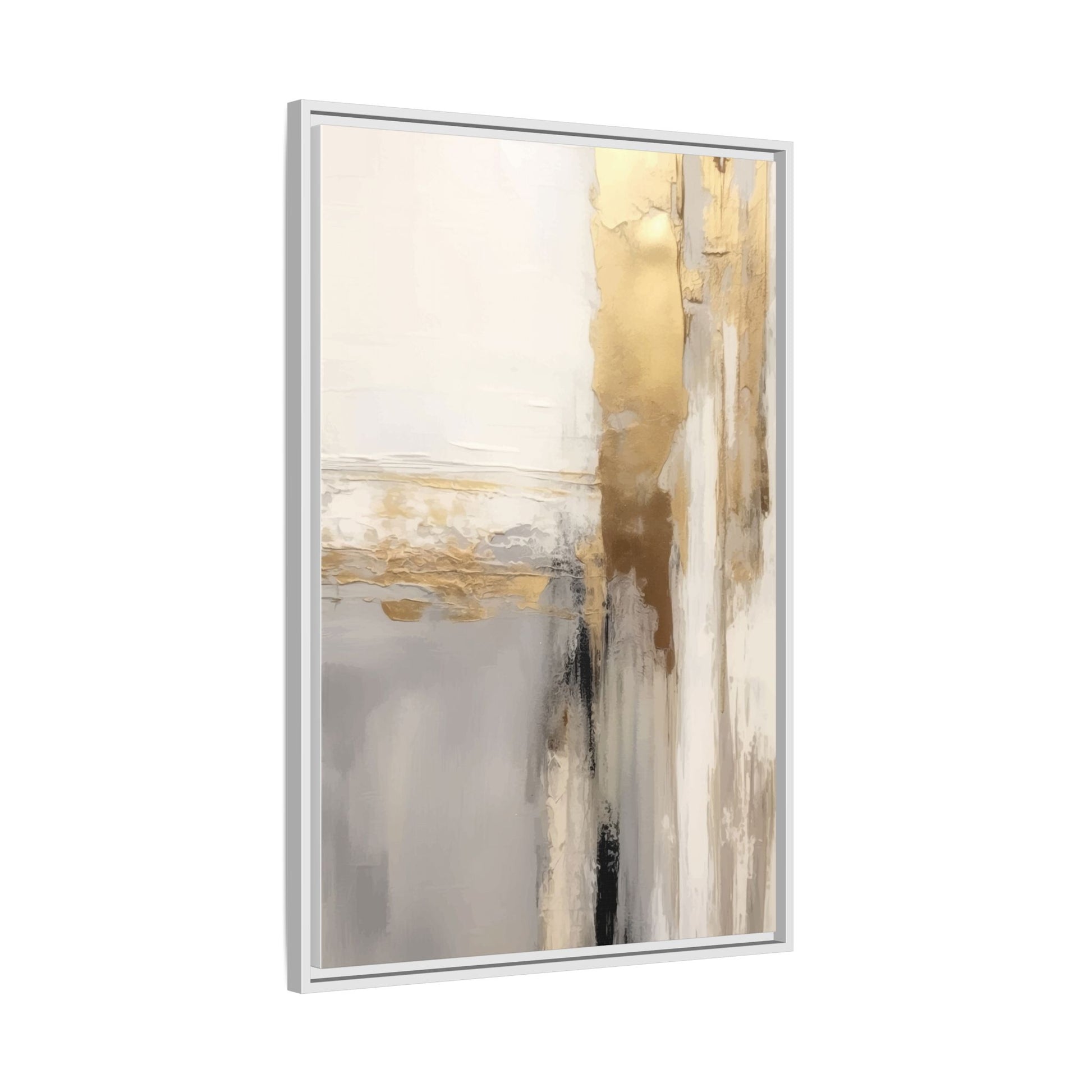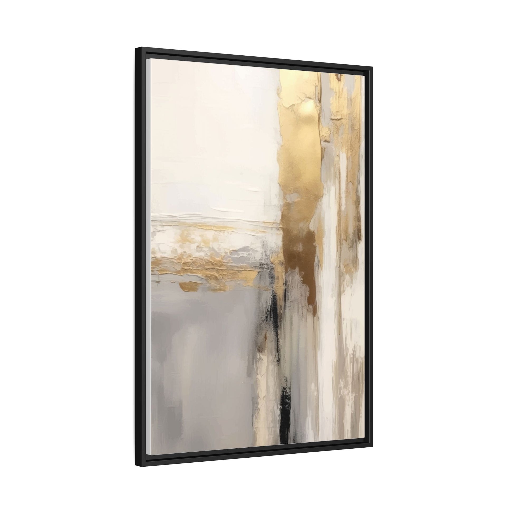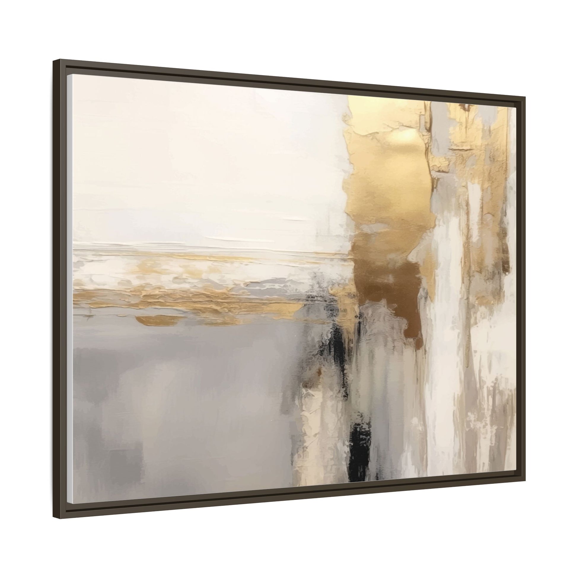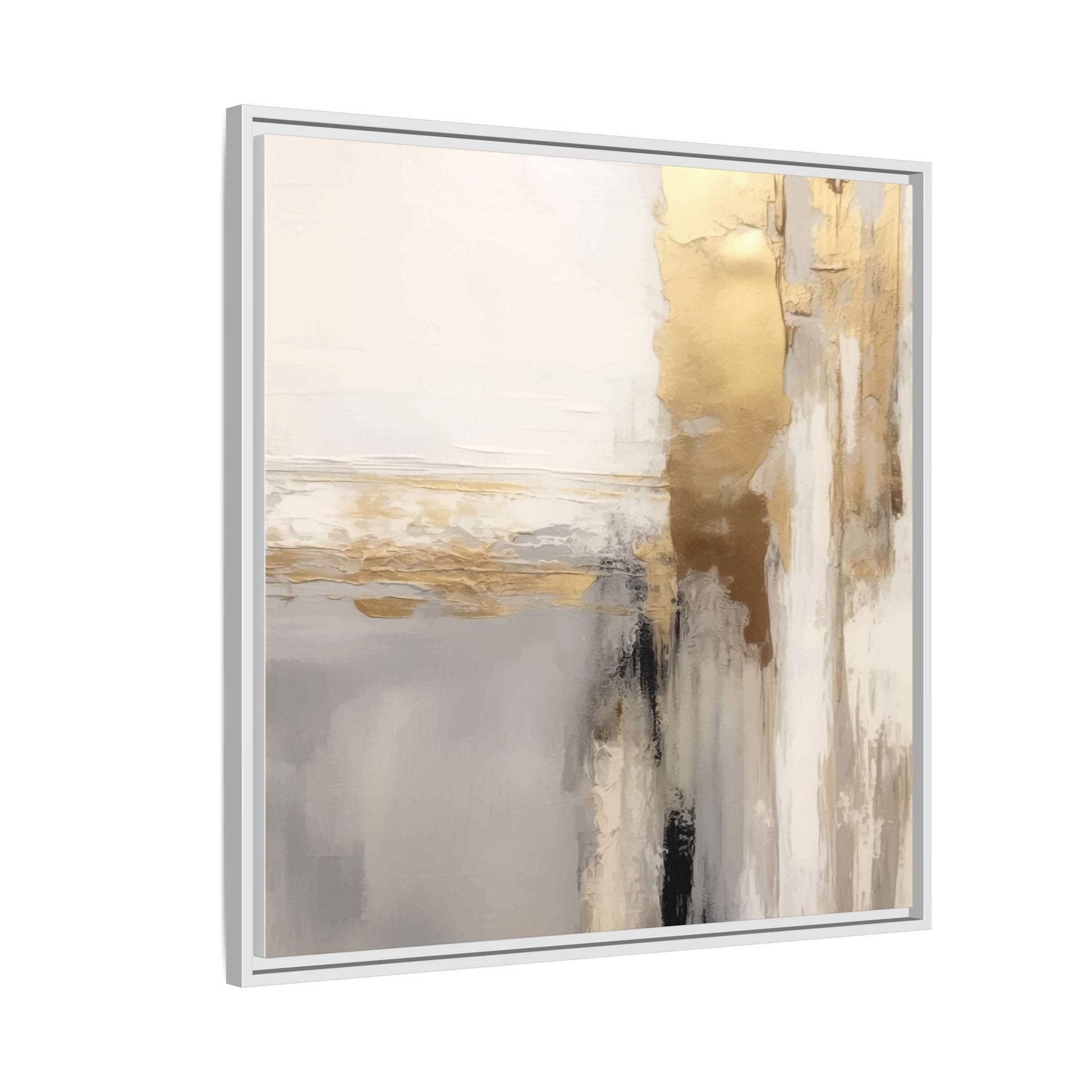 This captivating abstract artwork features a sophisticated palette of gold, white, gray, and black tones blended in a fluid, contemporary style. The painting appears to utilize techniques of layering and blending, creating soft transitions and textural depth across the canvas. Horizontal and vertical elements suggest a landscape-like composition, with sweeping golden hues reminiscent of sunlight or distant horizons intersecting with misty gray and white passages. Bold black brushstrokes provide dramatic contrast and visual anchoring within the ethereal composition. The overall effect is both serene and dynamic, inviting viewers to interpret the painting through their own emotional and visual perspective.
