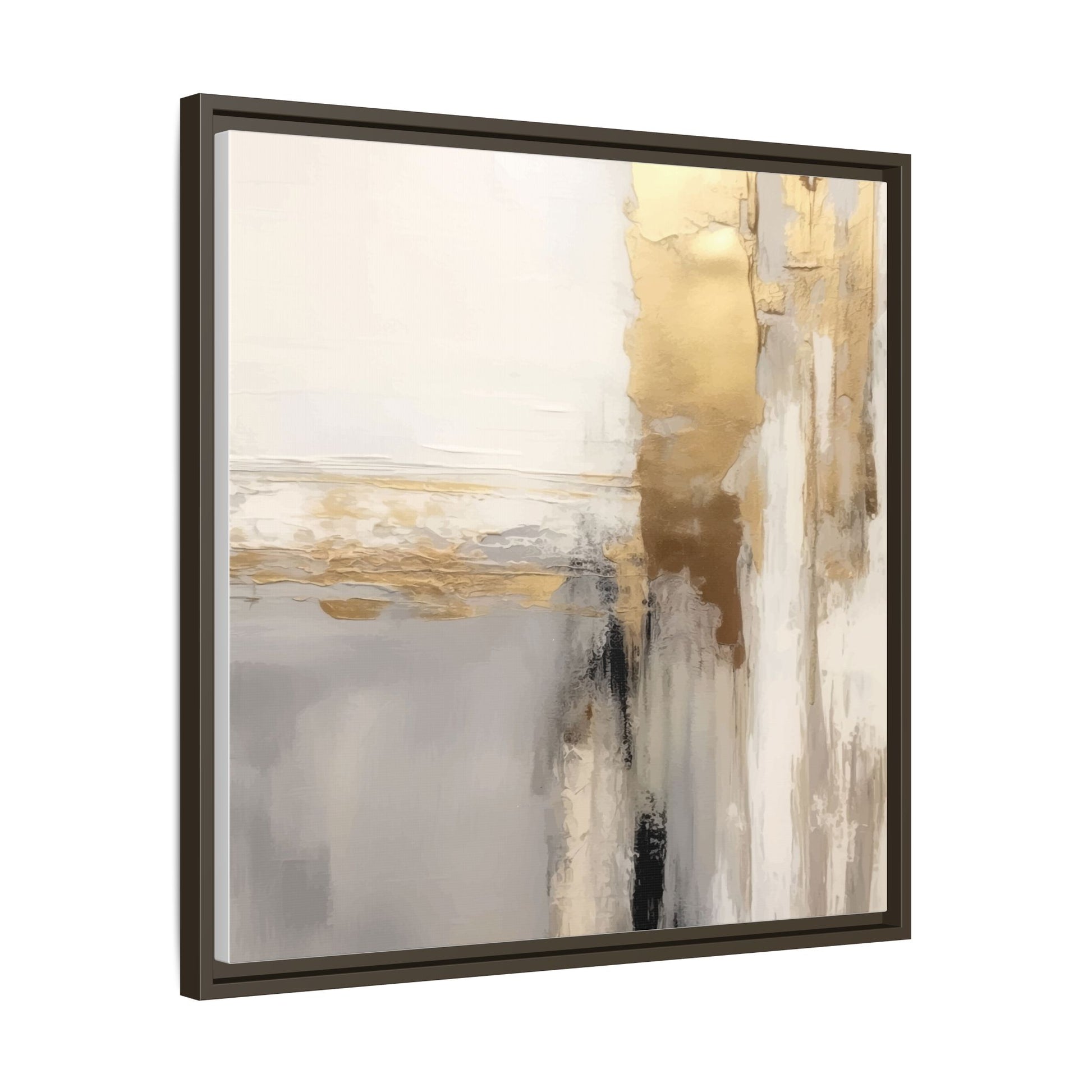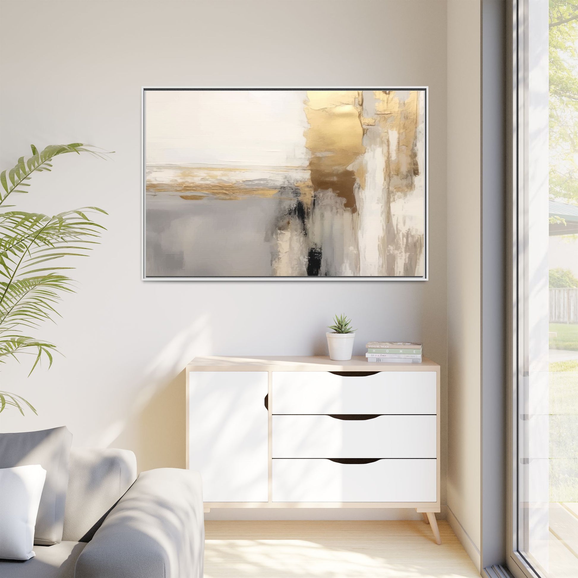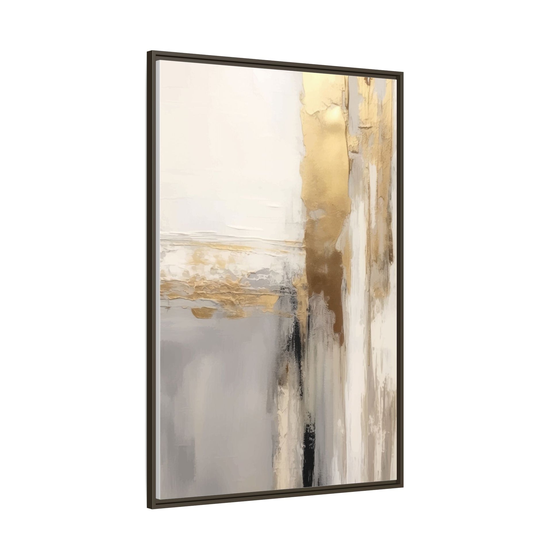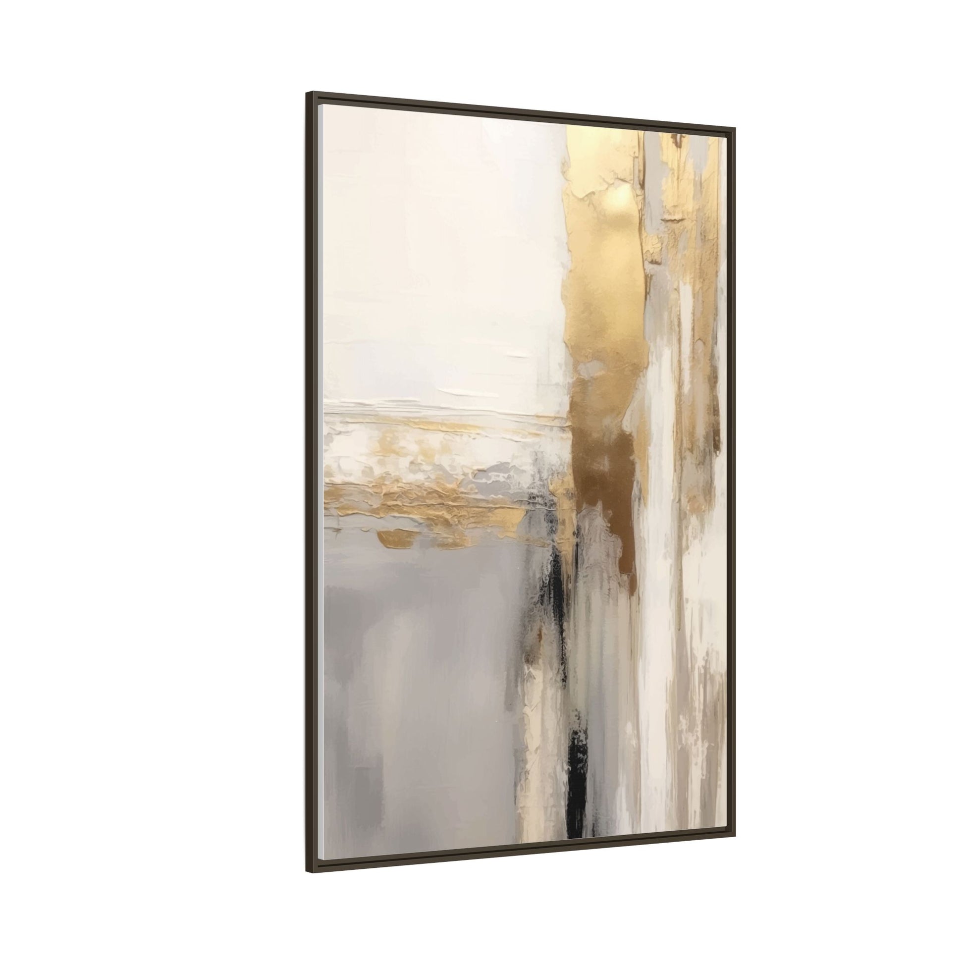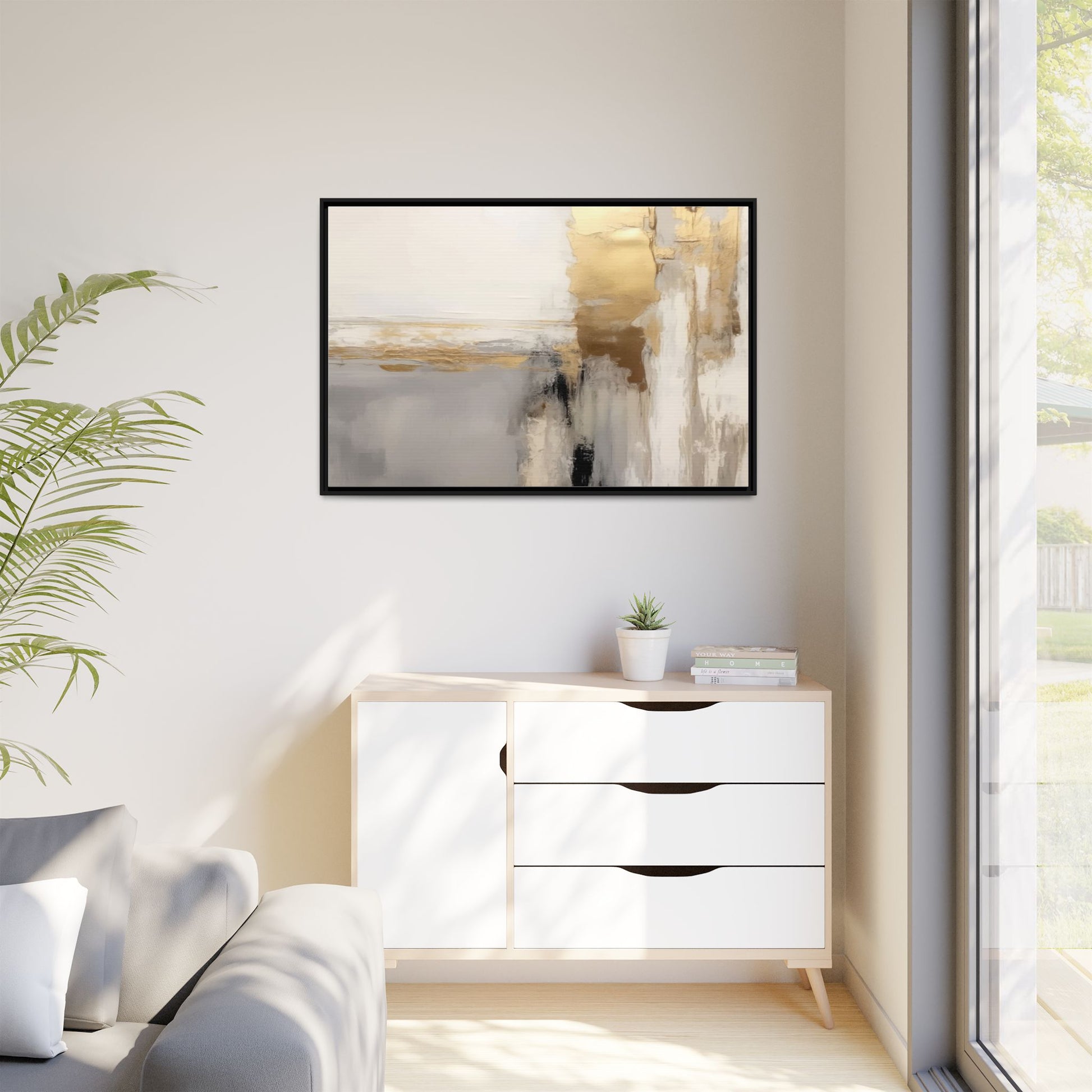 This captivating abstract artwork features a sophisticated palette of gold, white, gray, and black tones blended in a fluid, contemporary style. The painting appears to utilize techniques of layering and blending, creating soft transitions and textural depth across the canvas. Horizontal and vertical elements suggest a landscape-like composition, with sweeping golden hues reminiscent of sunlight or distant horizons intersecting with misty gray and white passages. Bold black brushstrokes provide dramatic contrast and visual anchoring within the ethereal composition. The overall effect is both serene and dynamic, inviting viewers to interpret the painting through their own emotional and visual perspective.