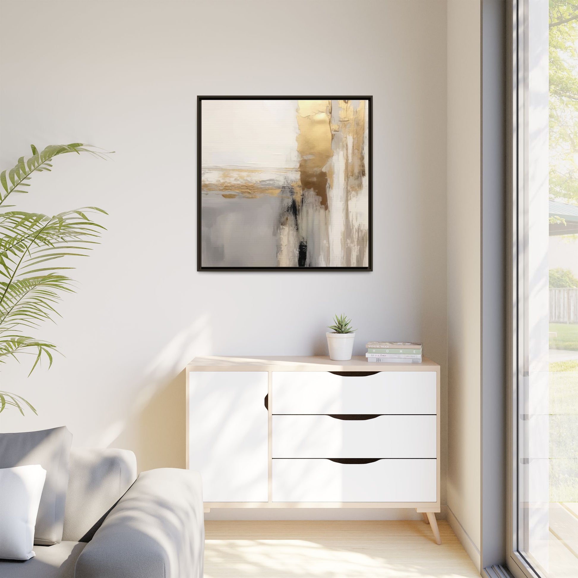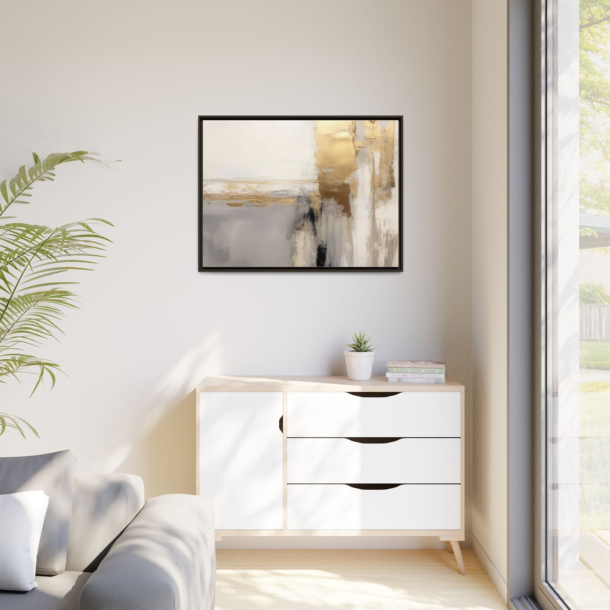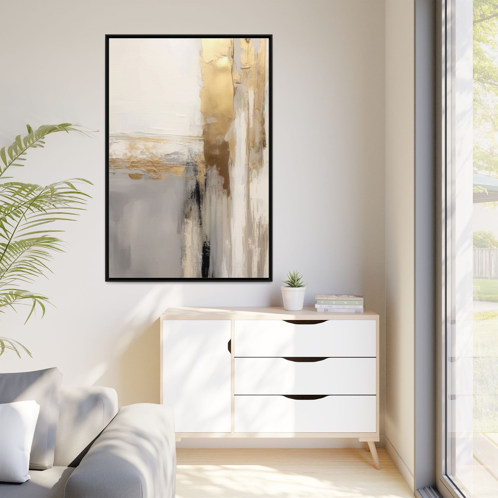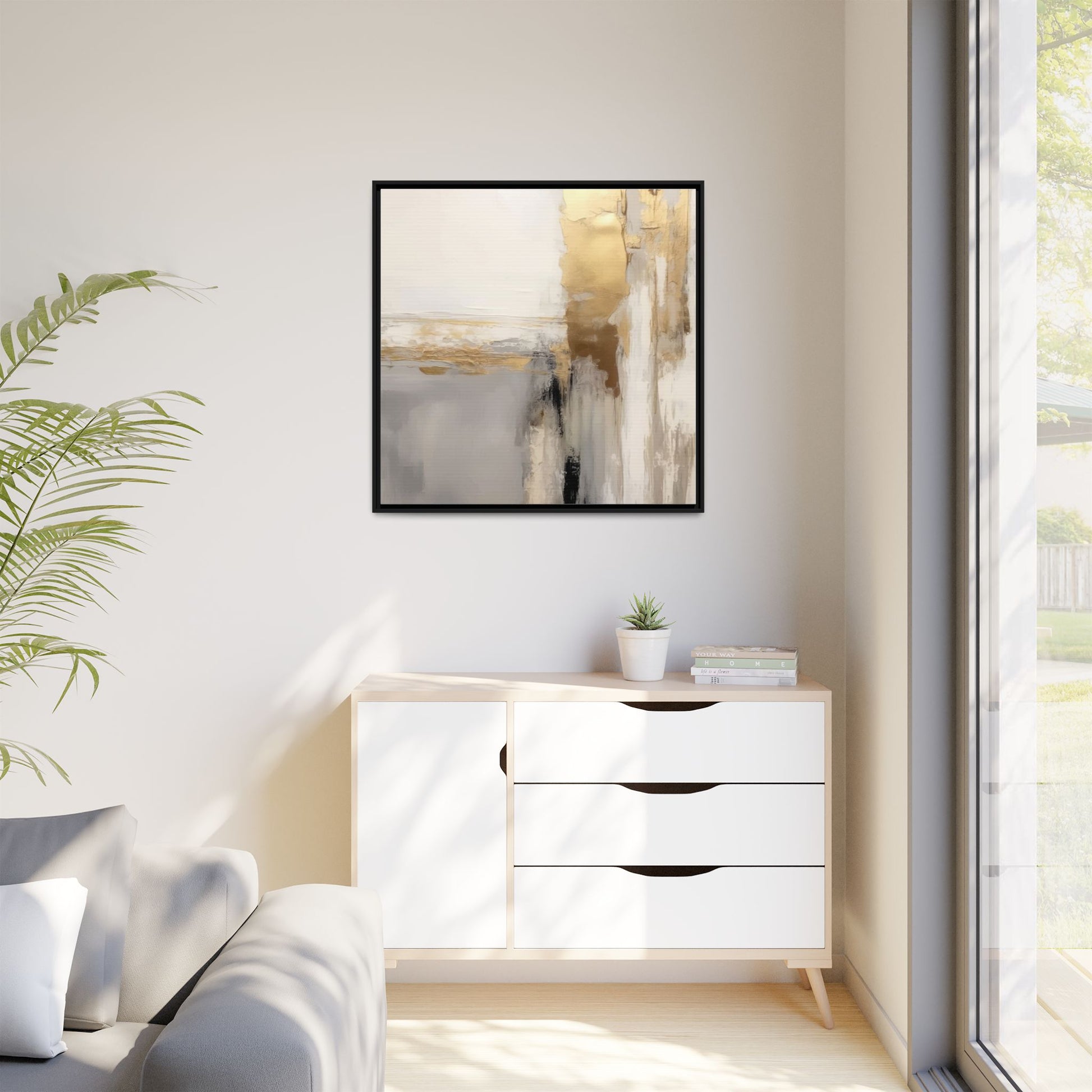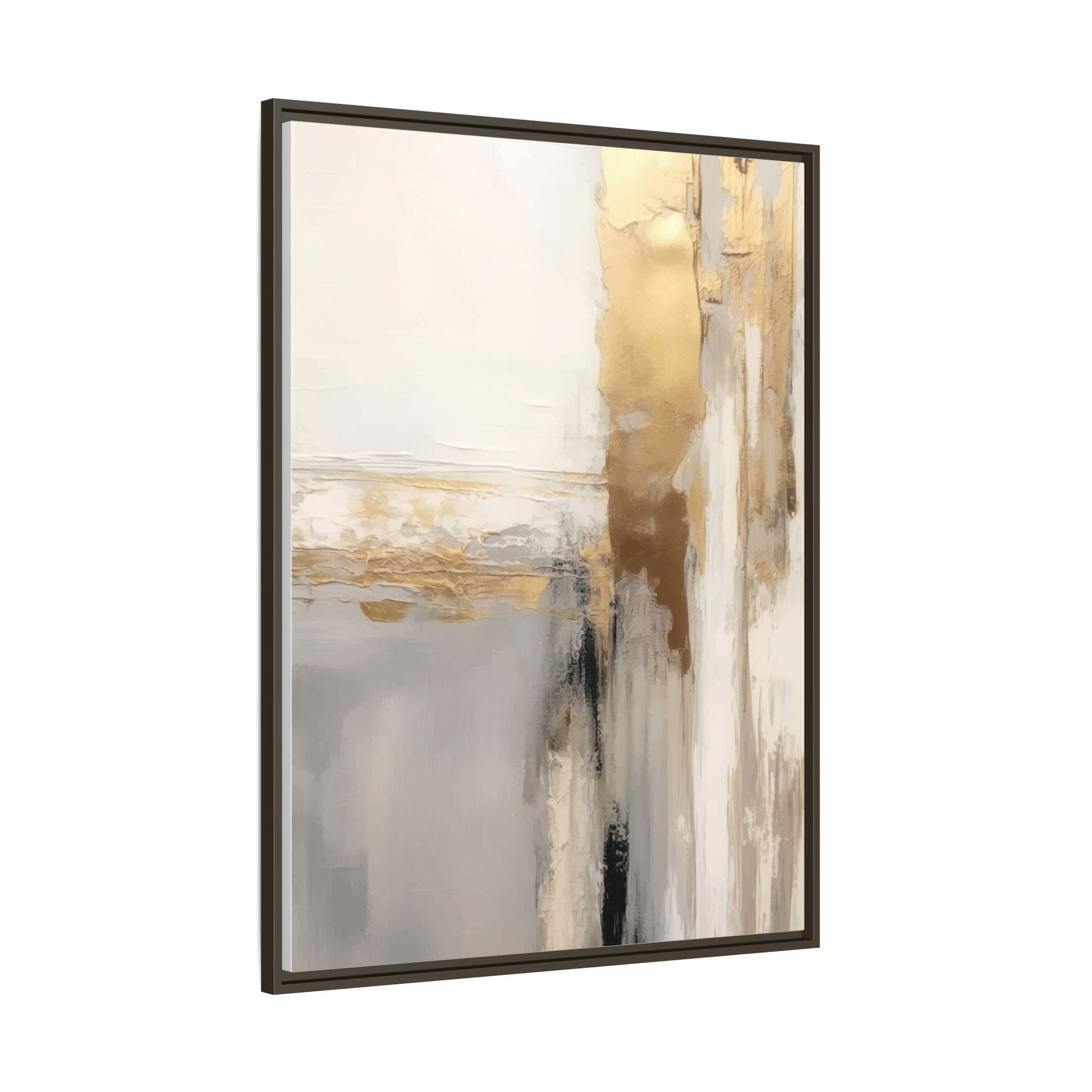 This captivating abstract artwork features a sophisticated palette of gold, white, gray, and black tones blended in a fluid, contemporary style. The painting appears to utilize techniques of layering and blending, creating soft transitions and textural depth across the canvas. Horizontal and vertical elements suggest a landscape-like composition, with sweeping golden hues reminiscent of sunlight or distant horizons intersecting with misty gray and white passages. Bold black brushstrokes provide dramatic contrast and visual anchoring within the ethereal composition. The overall effect is both serene and dynamic, inviting viewers to interpret the painting through their own emotional and visual perspective.