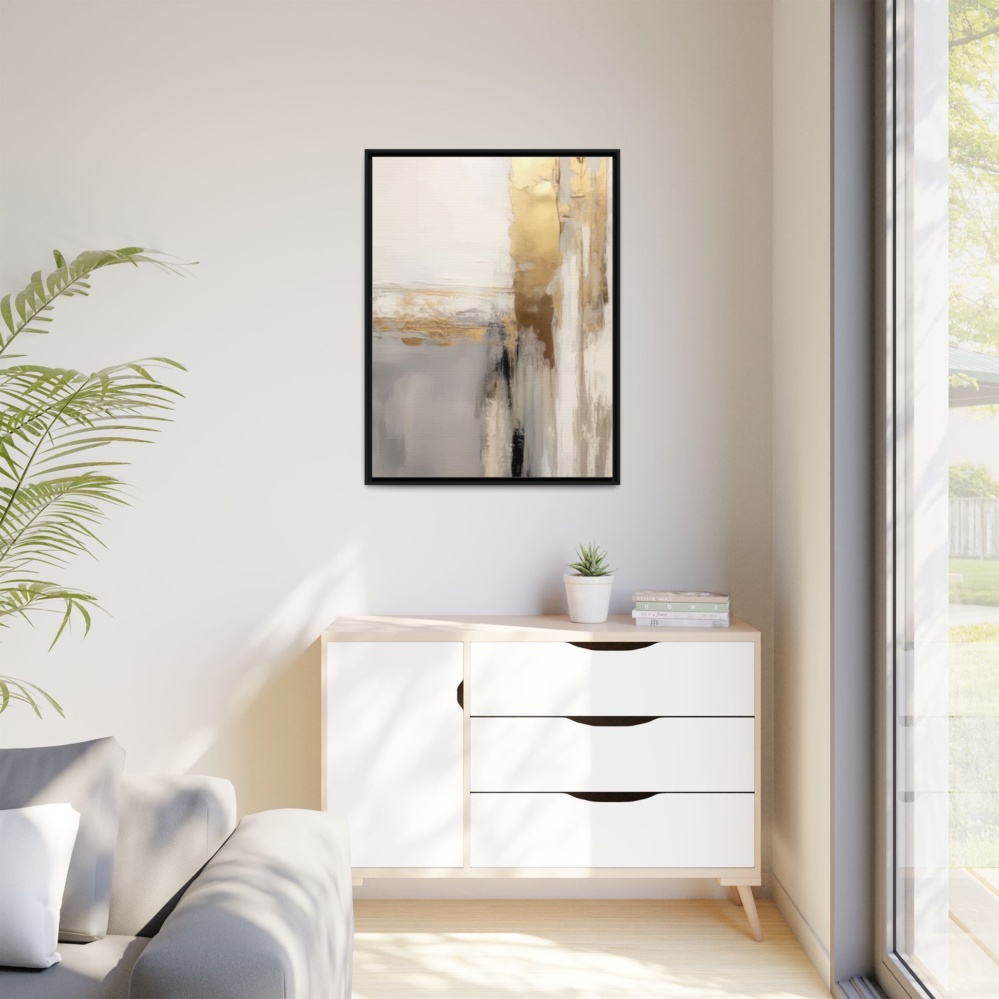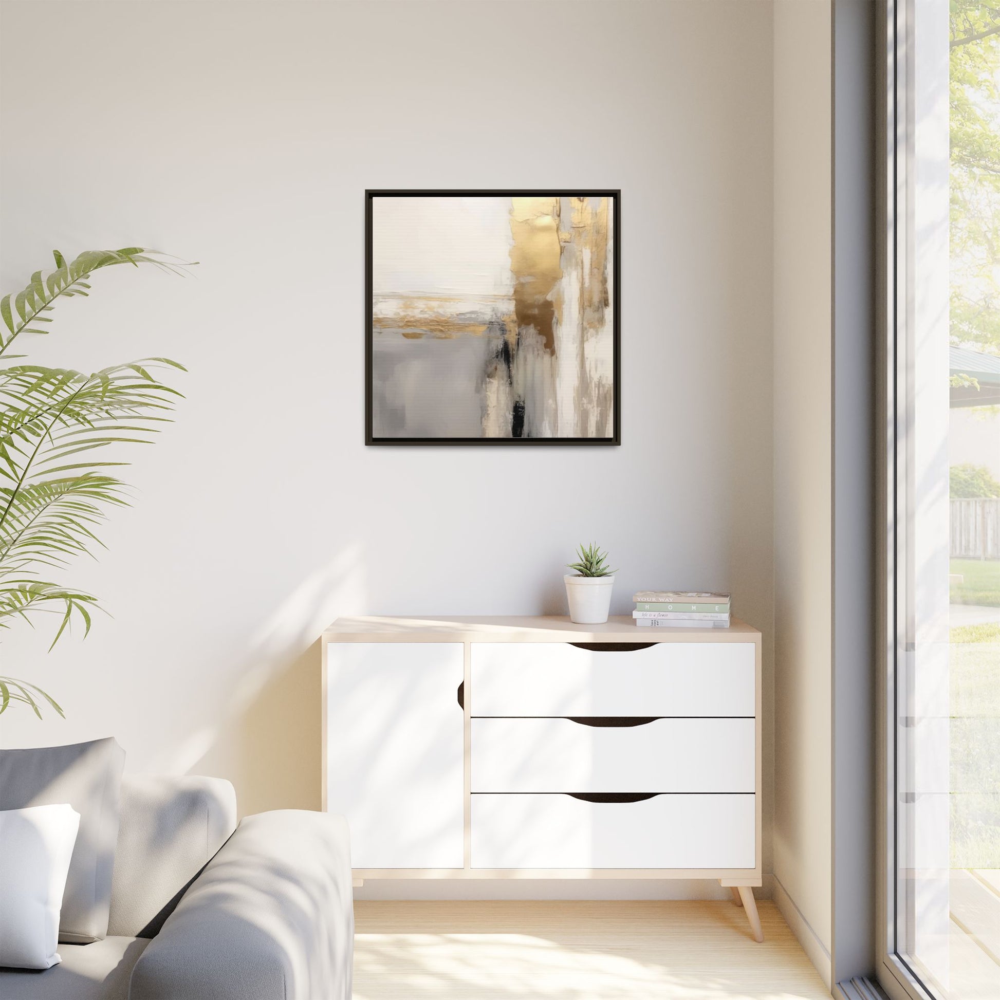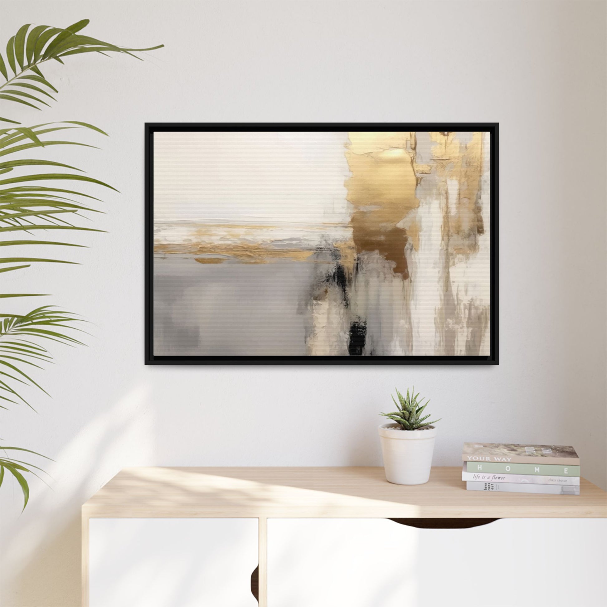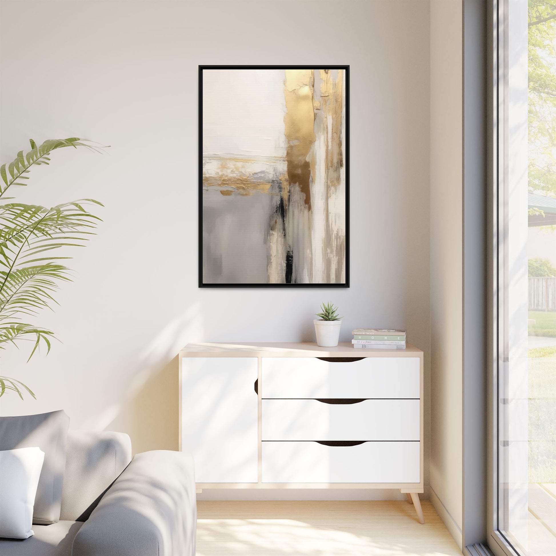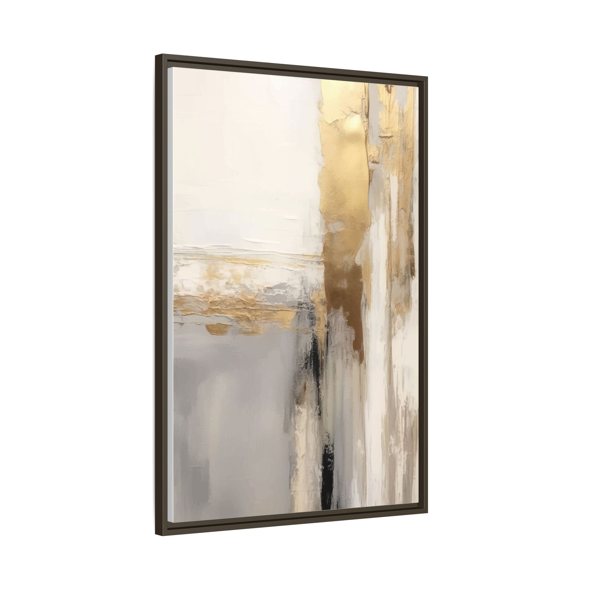 This captivating abstract artwork features a sophisticated palette of gold, white, gray, and black tones blended in a fluid, contemporary style. The painting appears to utilize techniques of layering and blending, creating soft transitions and textural depth across the canvas. Horizontal and vertical elements suggest a landscape-like composition, with sweeping golden hues reminiscent of sunlight or distant horizons intersecting with misty gray and white passages. Bold black brushstrokes provide dramatic contrast and visual anchoring within the ethereal composition. The overall effect is both serene and dynamic, inviting viewers to interpret the painting through their own emotional and visual perspective.
