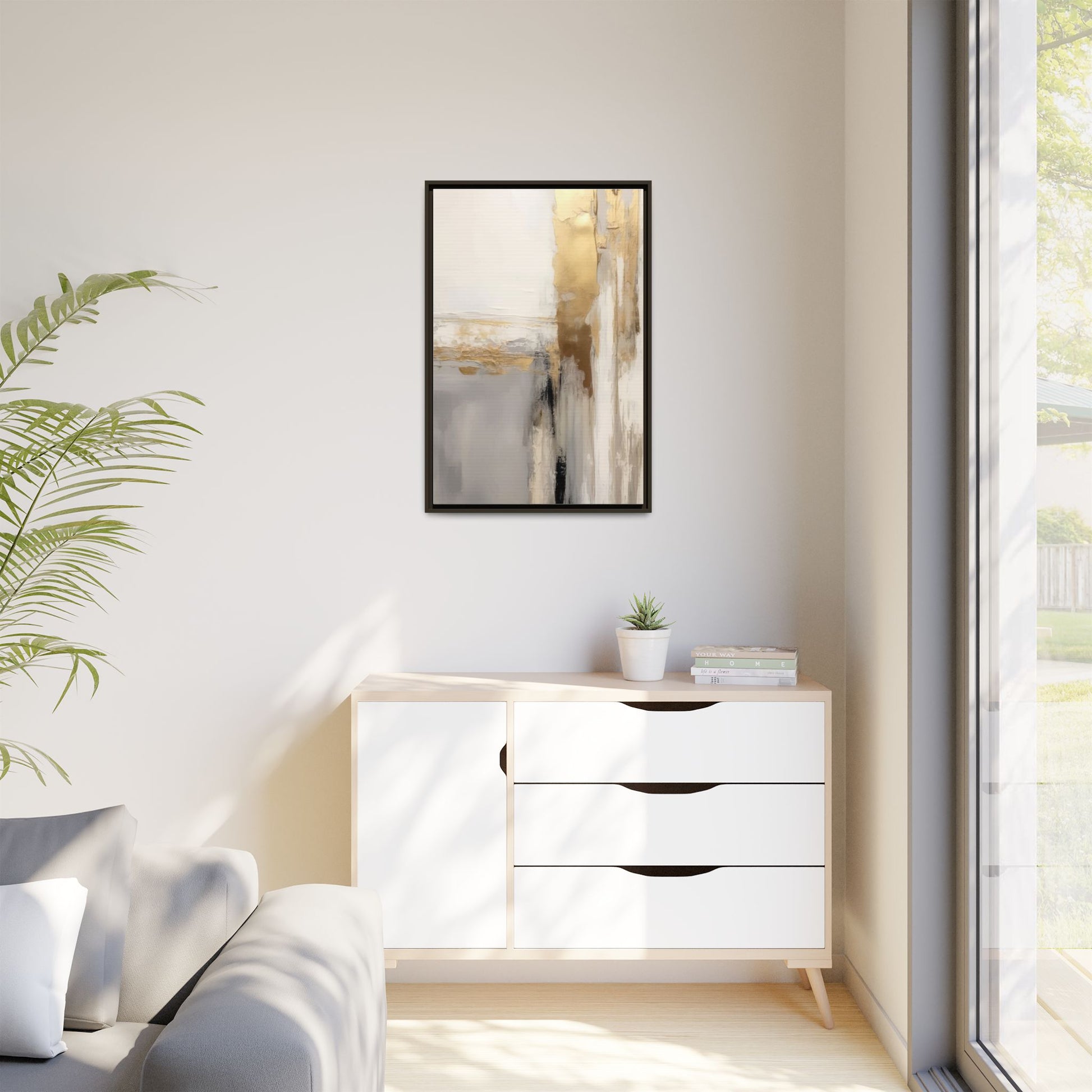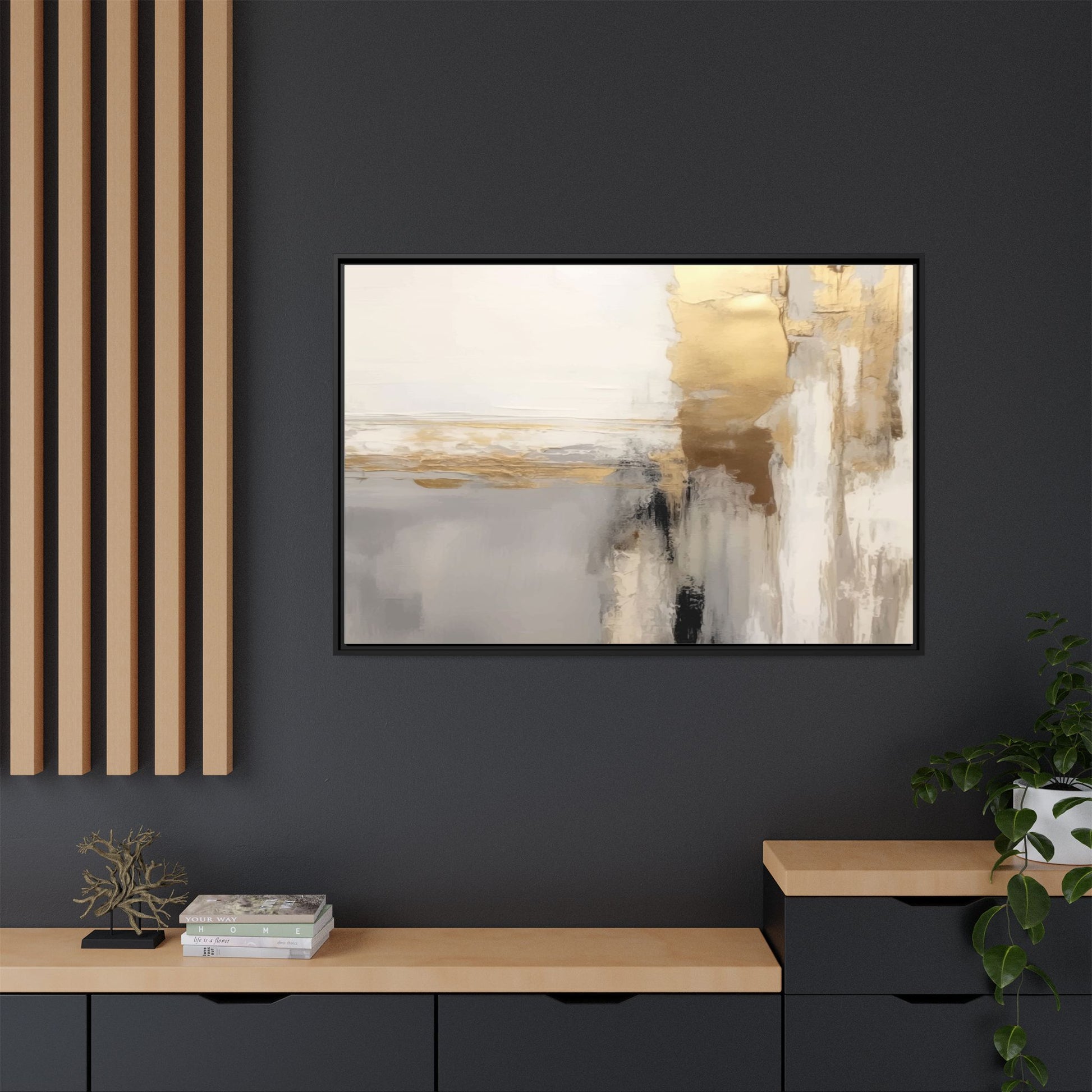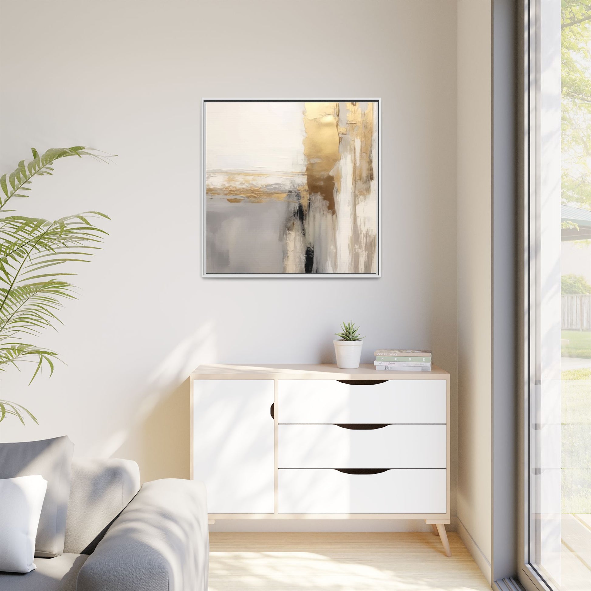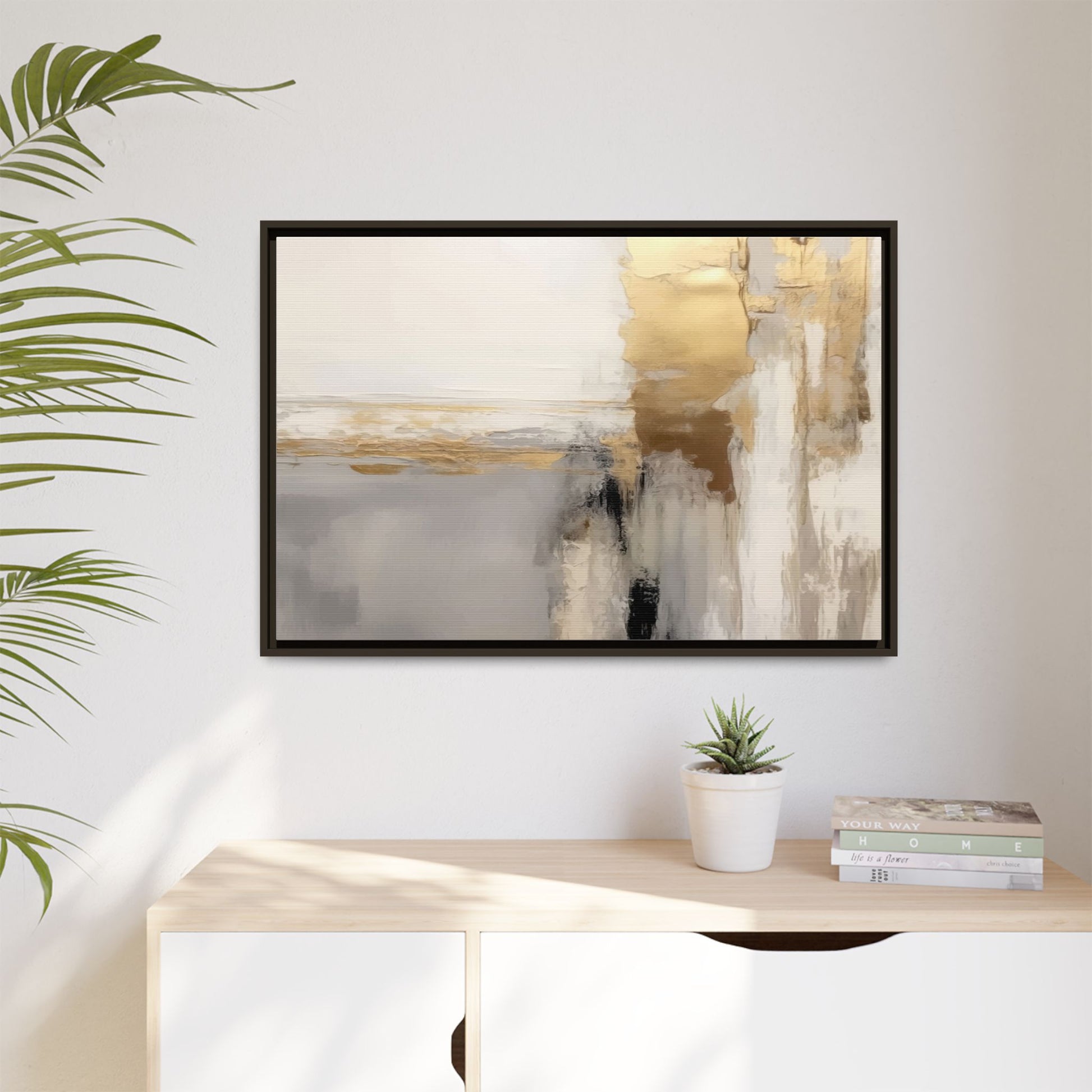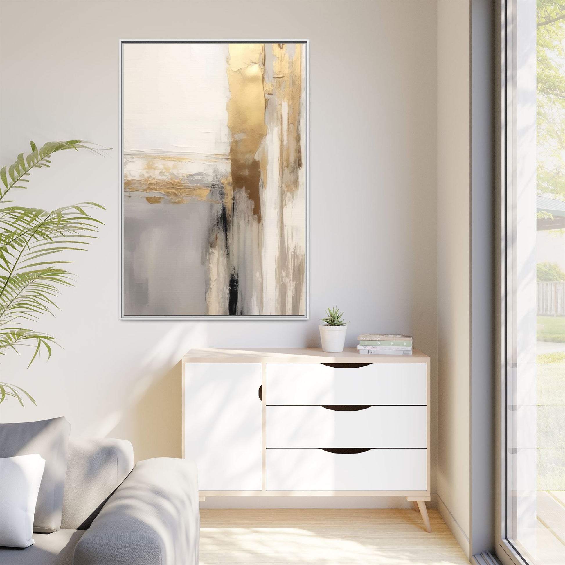 This captivating abstract artwork features a sophisticated palette of gold, white, gray, and black tones blended in a fluid, contemporary style. The painting appears to utilize techniques of layering and blending, creating soft transitions and textural depth across the canvas. Horizontal and vertical elements suggest a landscape-like composition, with sweeping golden hues reminiscent of sunlight or distant horizons intersecting with misty gray and white passages. Bold black brushstrokes provide dramatic contrast and visual anchoring within the ethereal composition. The overall effect is both serene and dynamic, inviting viewers to interpret the painting through their own emotional and visual perspective.