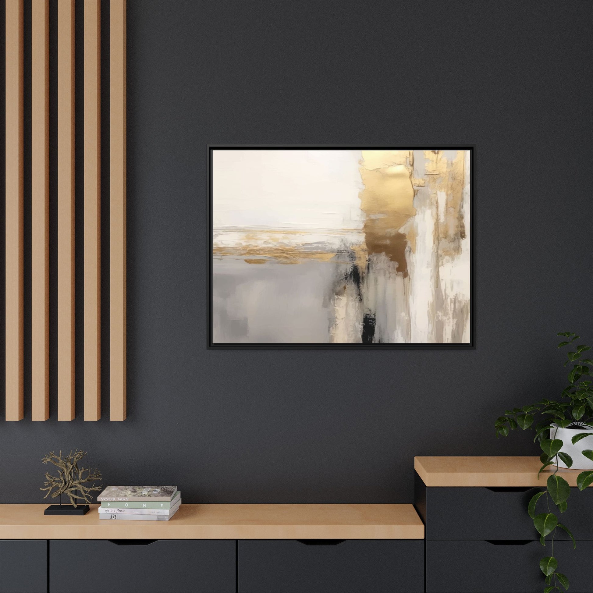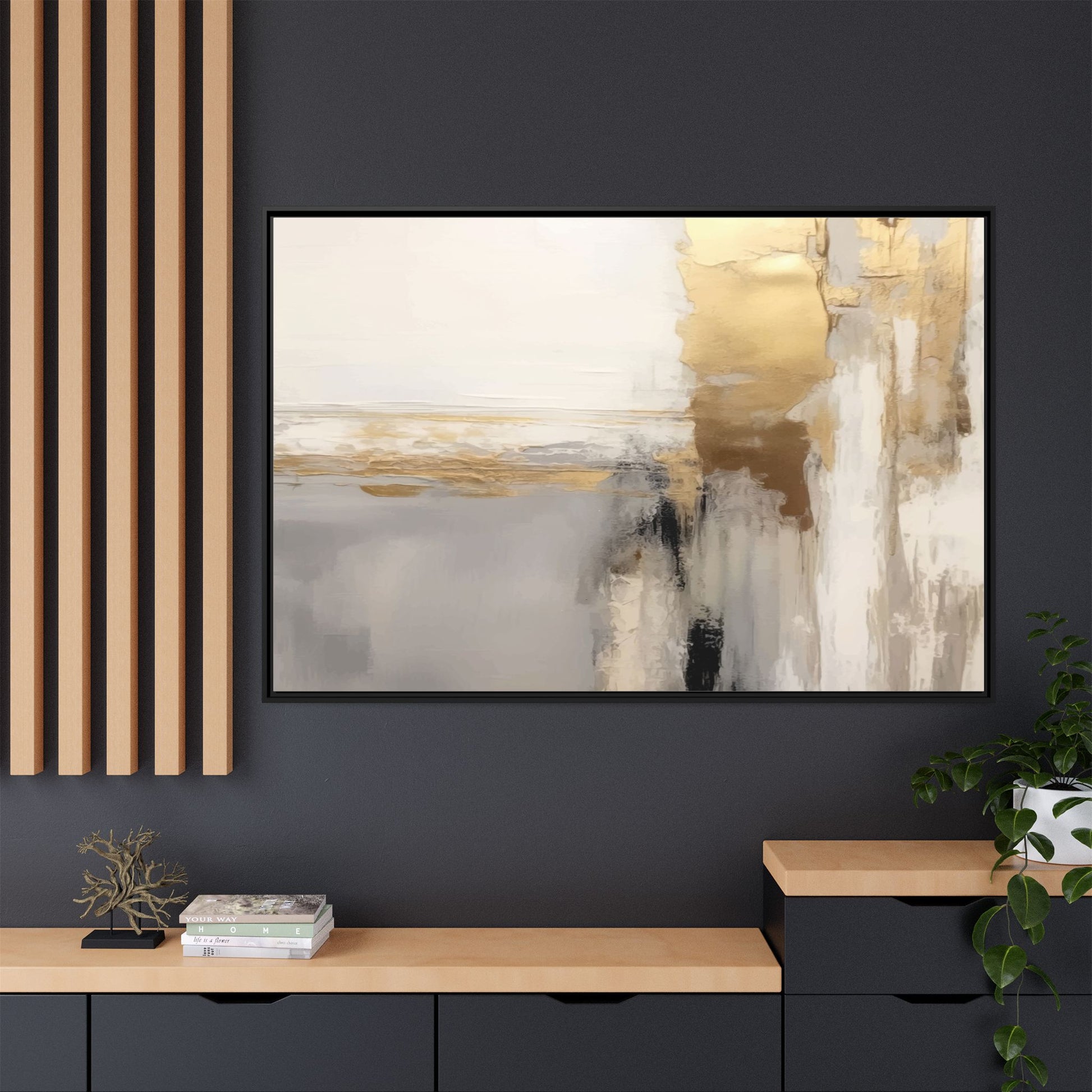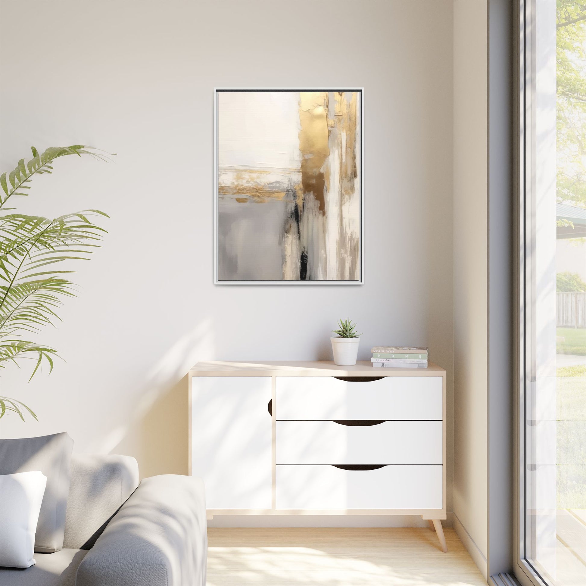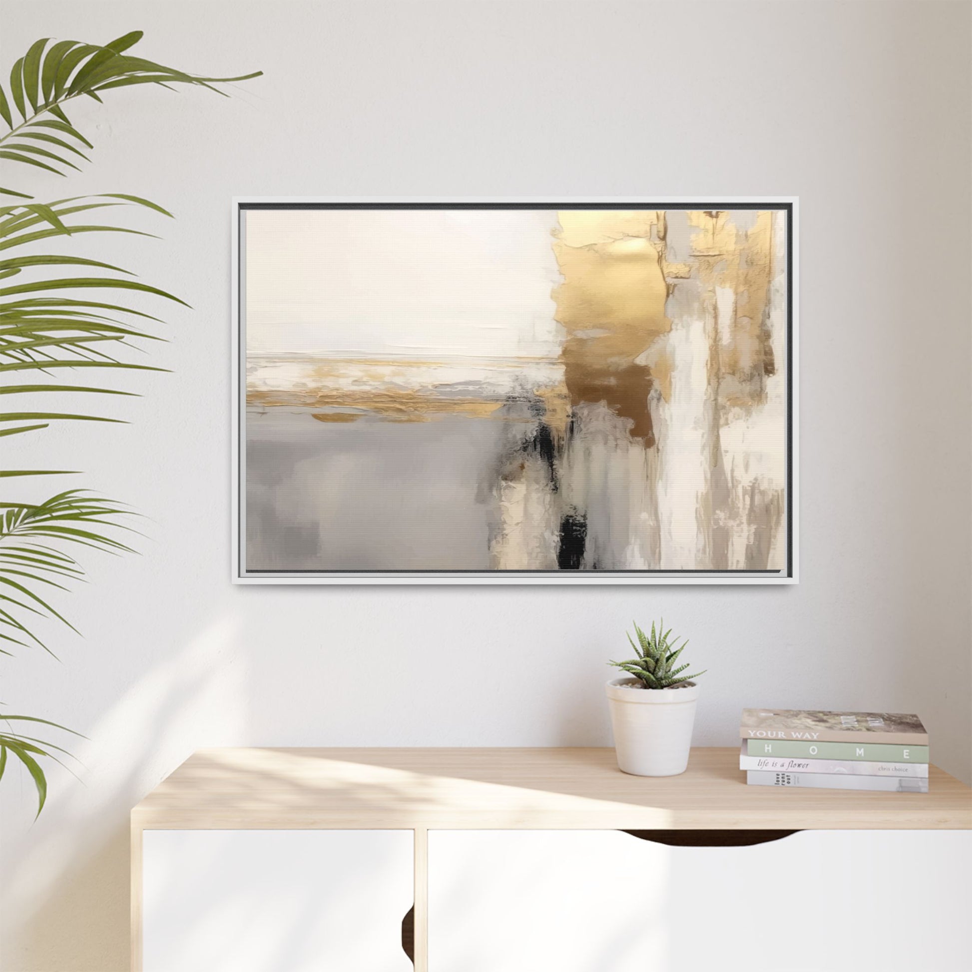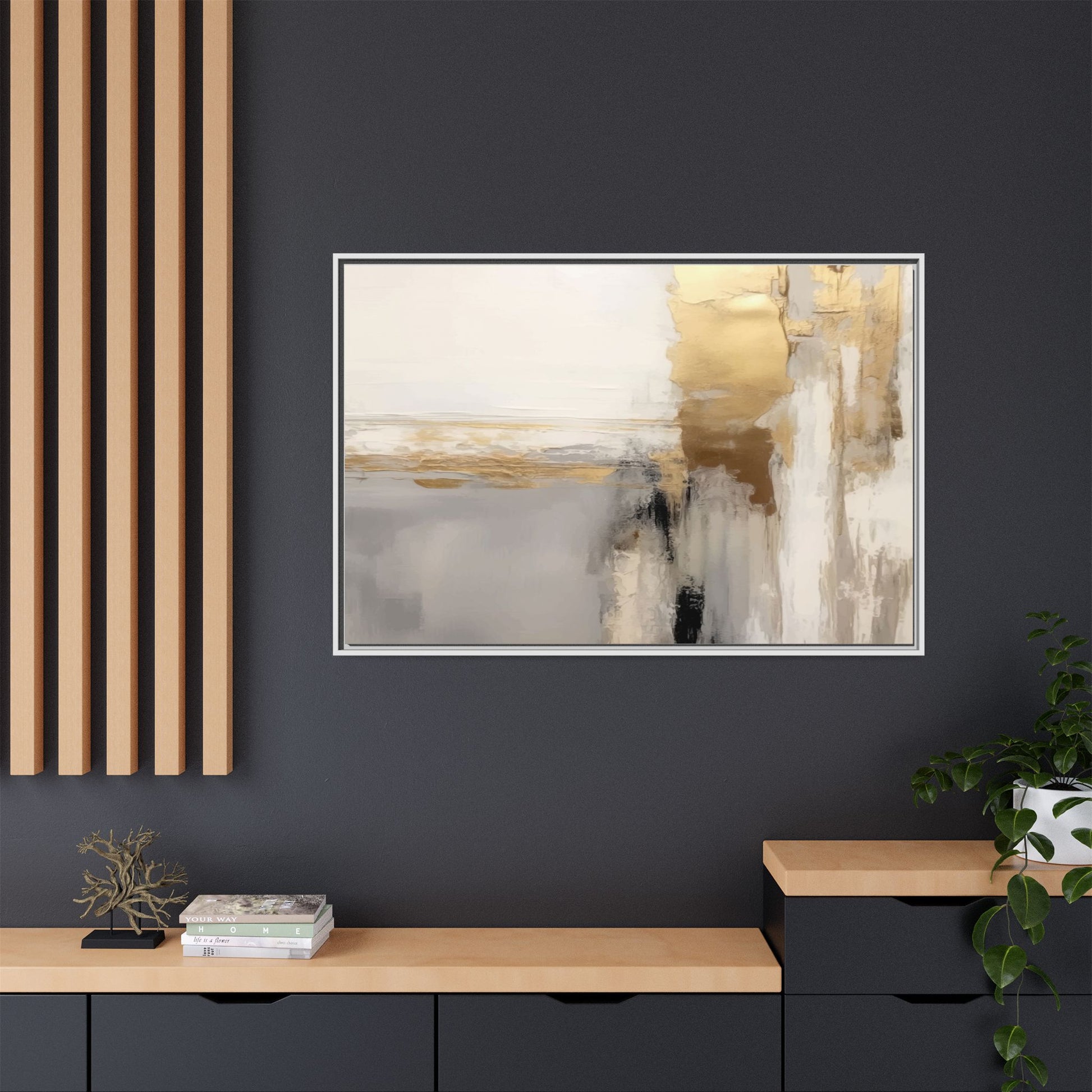 This captivating abstract artwork features a sophisticated palette of gold, white, gray, and black tones blended in a fluid, contemporary style. The painting appears to utilize techniques of layering and blending, creating soft transitions and textural depth across the canvas. Horizontal and vertical elements suggest a landscape-like composition, with sweeping golden hues reminiscent of sunlight or distant horizons intersecting with misty gray and white passages. Bold black brushstrokes provide dramatic contrast and visual anchoring within the ethereal composition. The overall effect is both serene and dynamic, inviting viewers to interpret the painting through their own emotional and visual perspective.