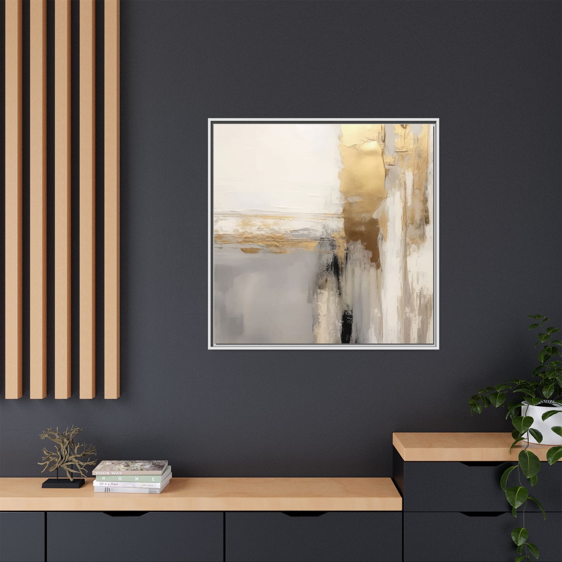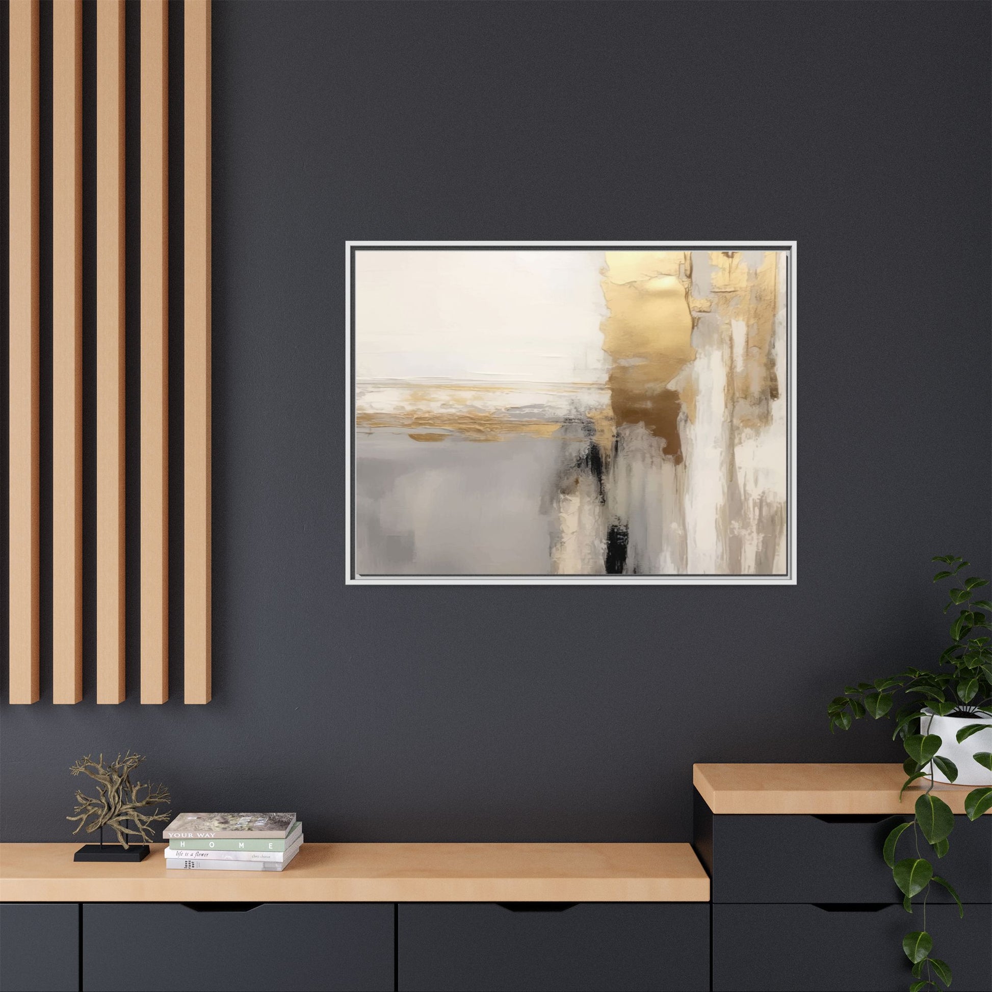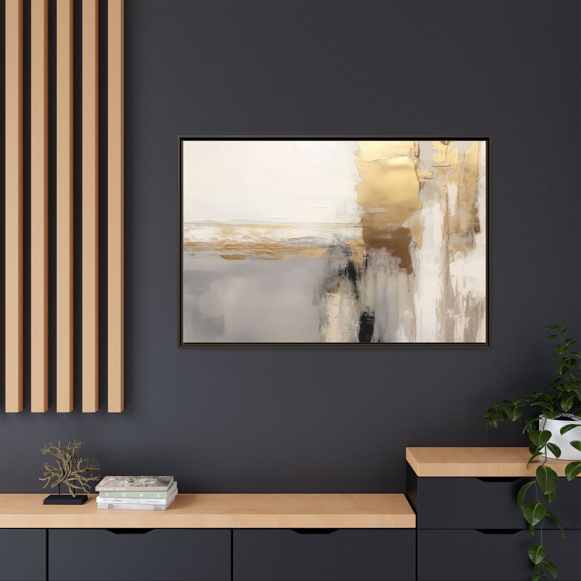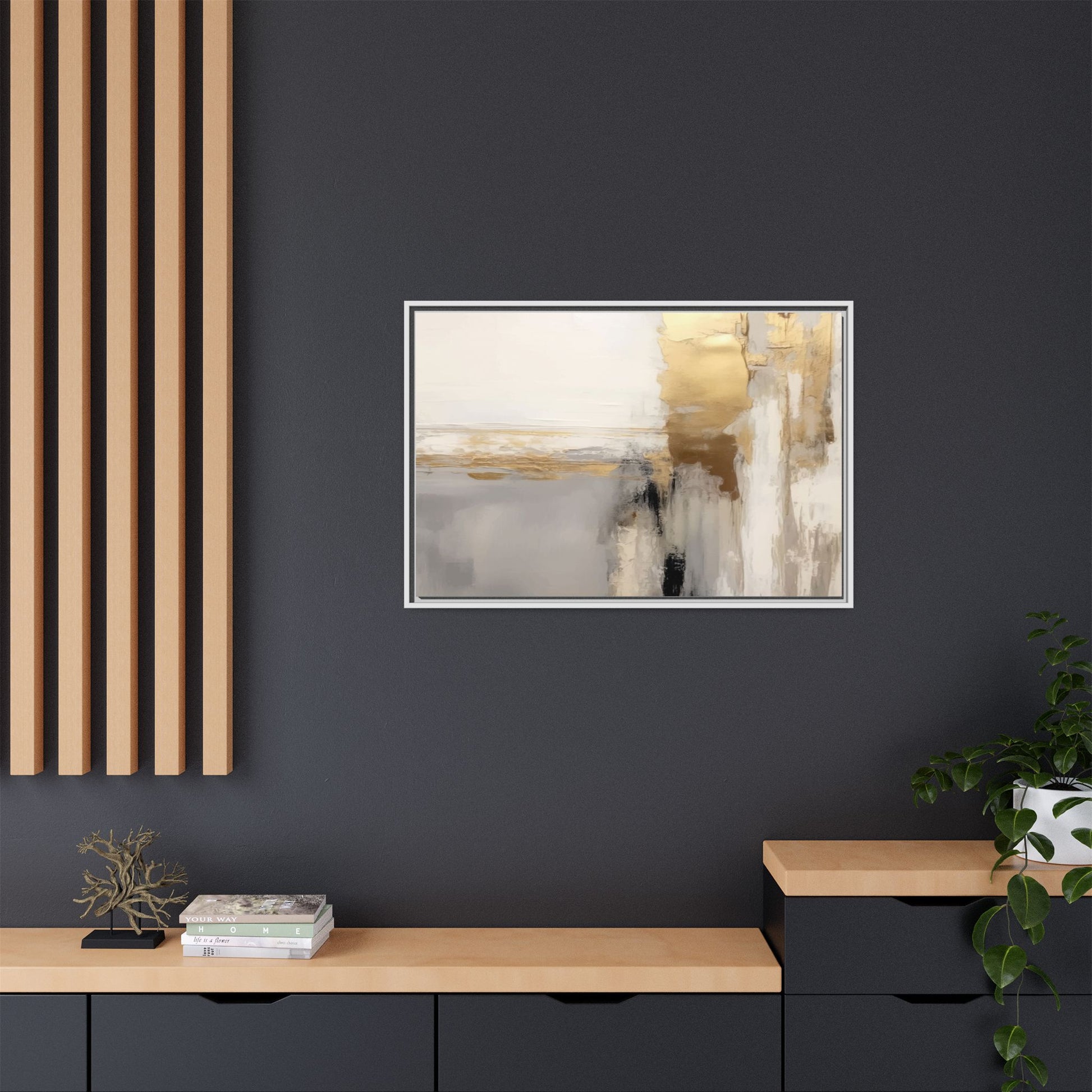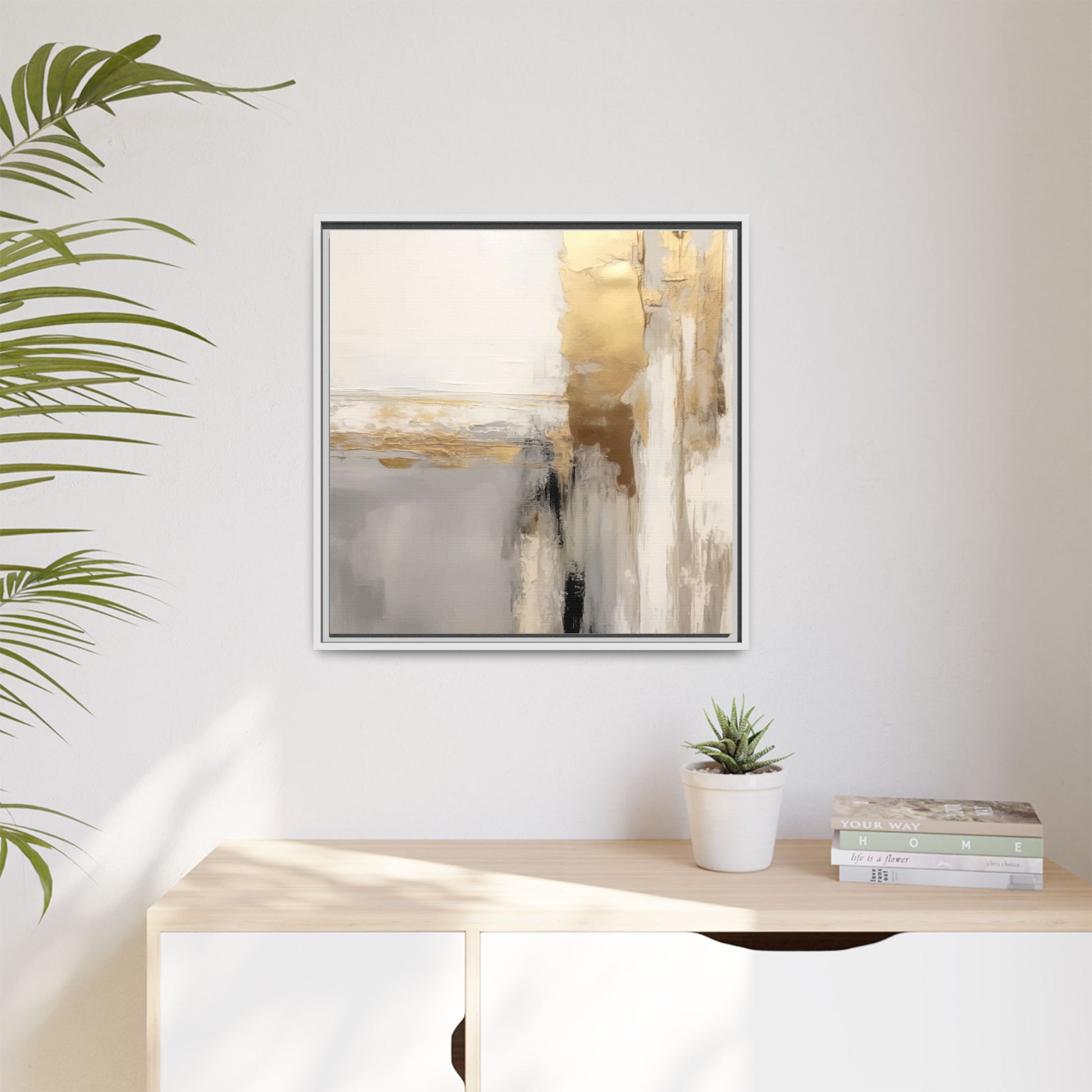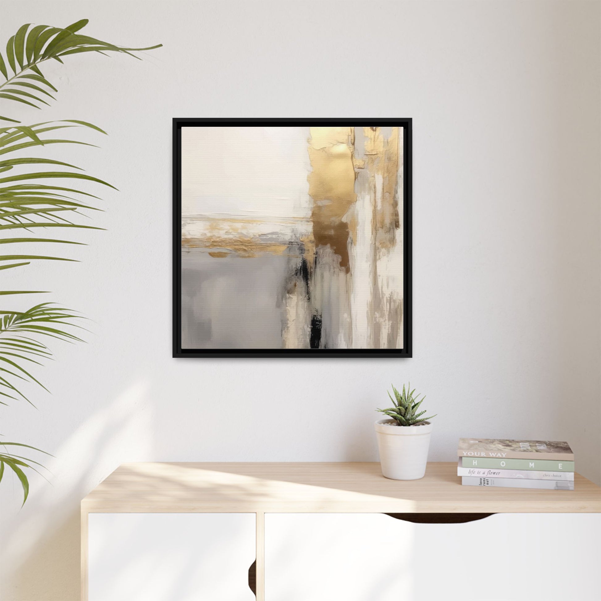 This captivating abstract artwork features a sophisticated palette of gold, white, gray, and black tones blended in a fluid, contemporary style. The painting appears to utilize techniques of layering and blending, creating soft transitions and textural depth across the canvas. Horizontal and vertical elements suggest a landscape-like composition, with sweeping golden hues reminiscent of sunlight or distant horizons intersecting with misty gray and white passages. Bold black brushstrokes provide dramatic contrast and visual anchoring within the ethereal composition. The overall effect is both serene and dynamic, inviting viewers to interpret the painting through their own emotional and visual perspective.