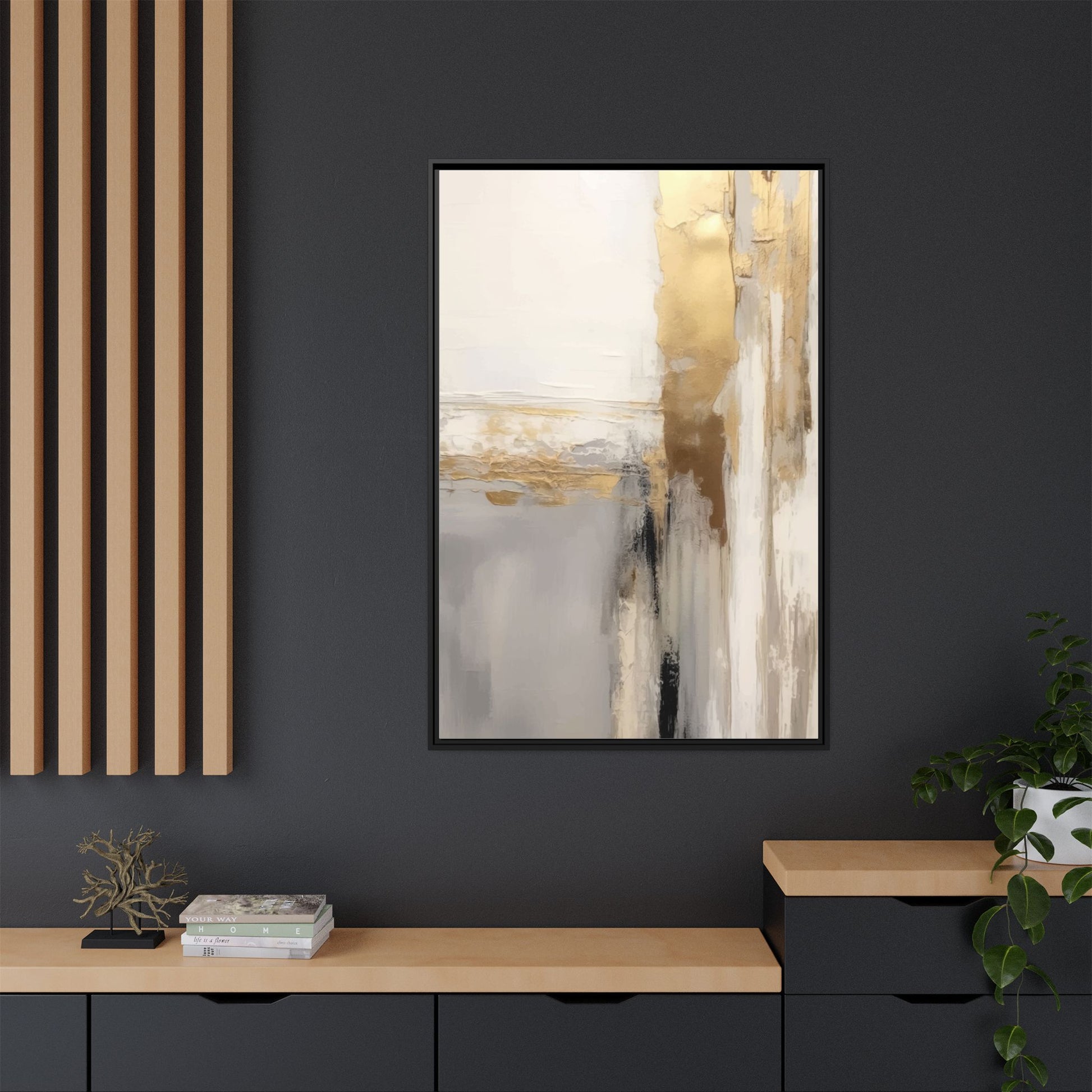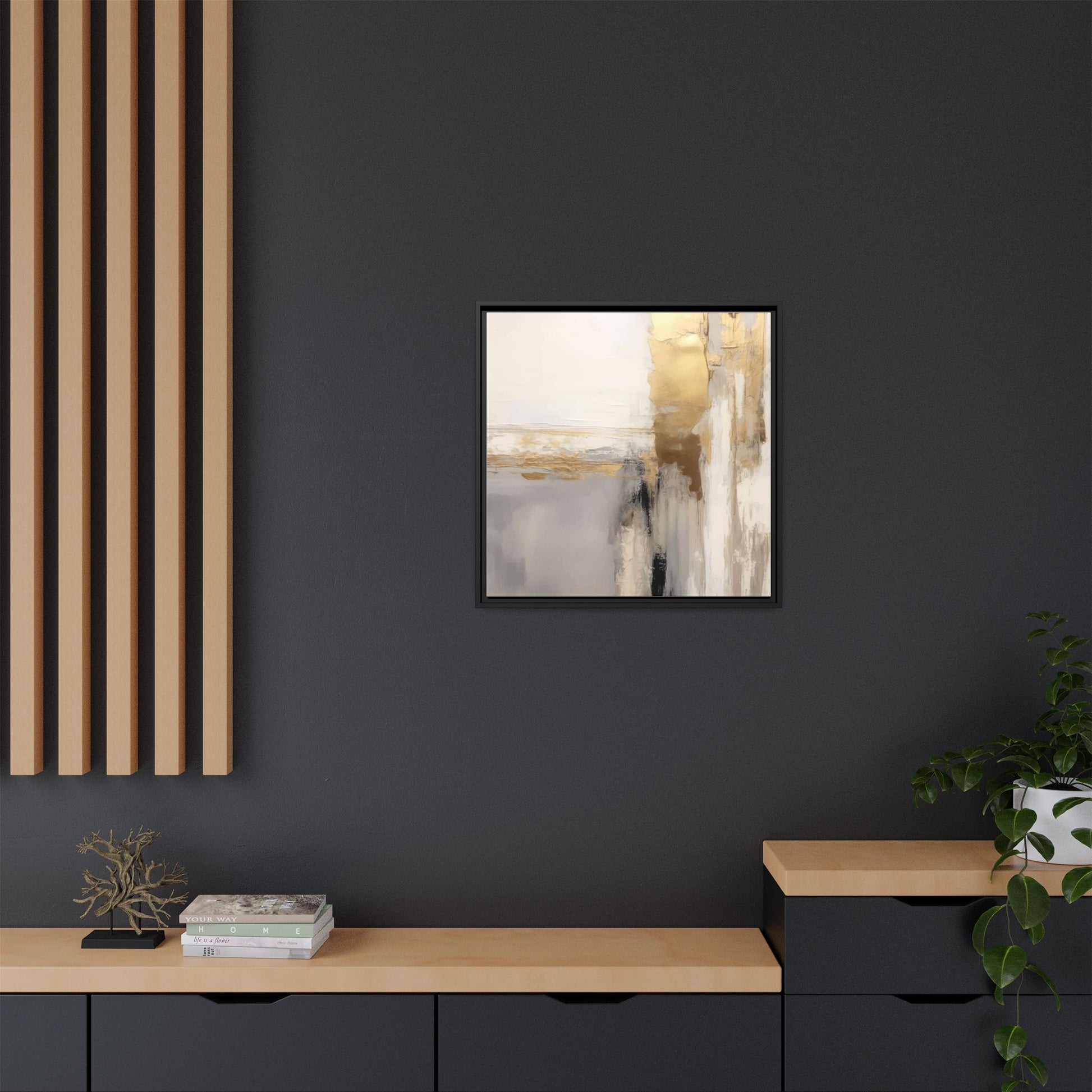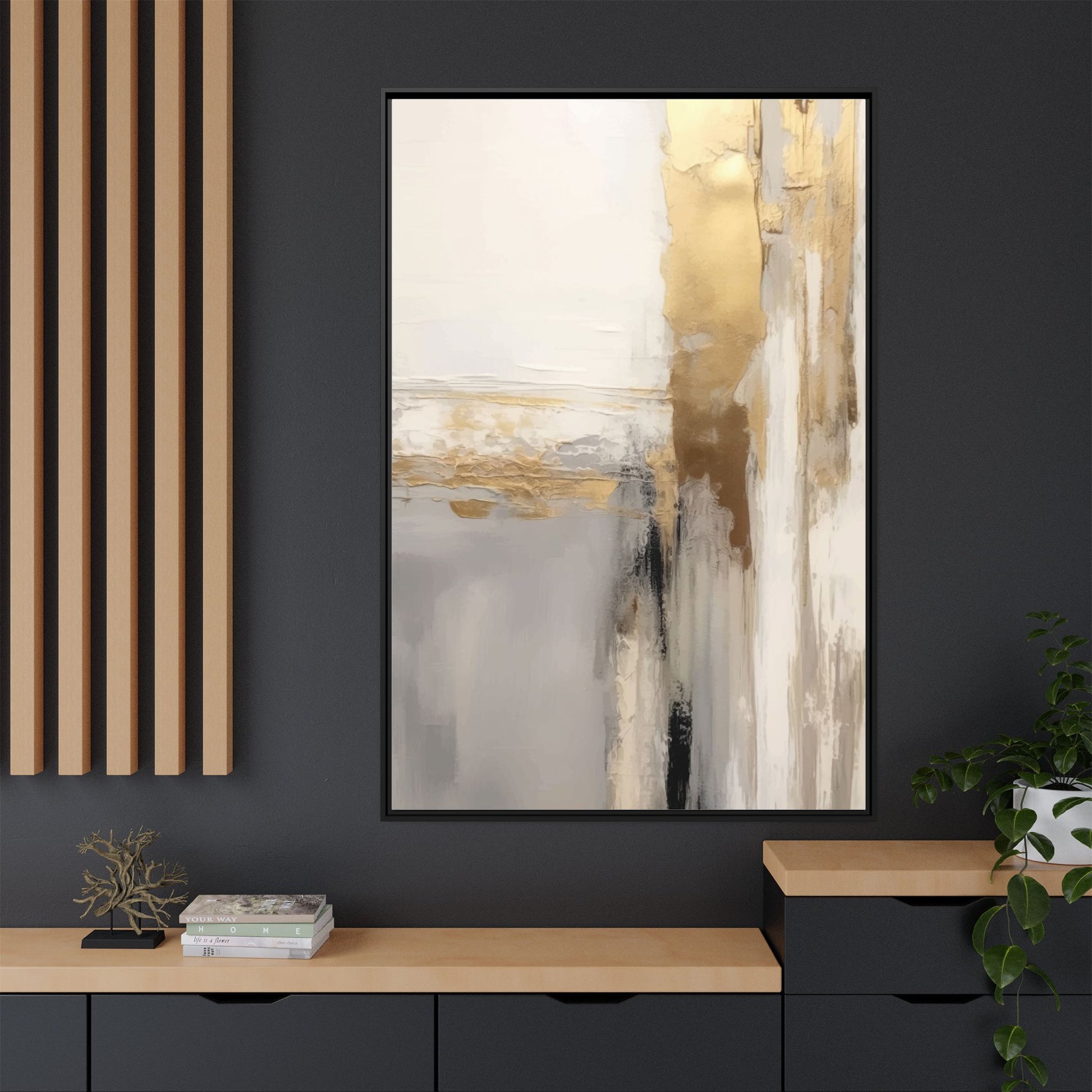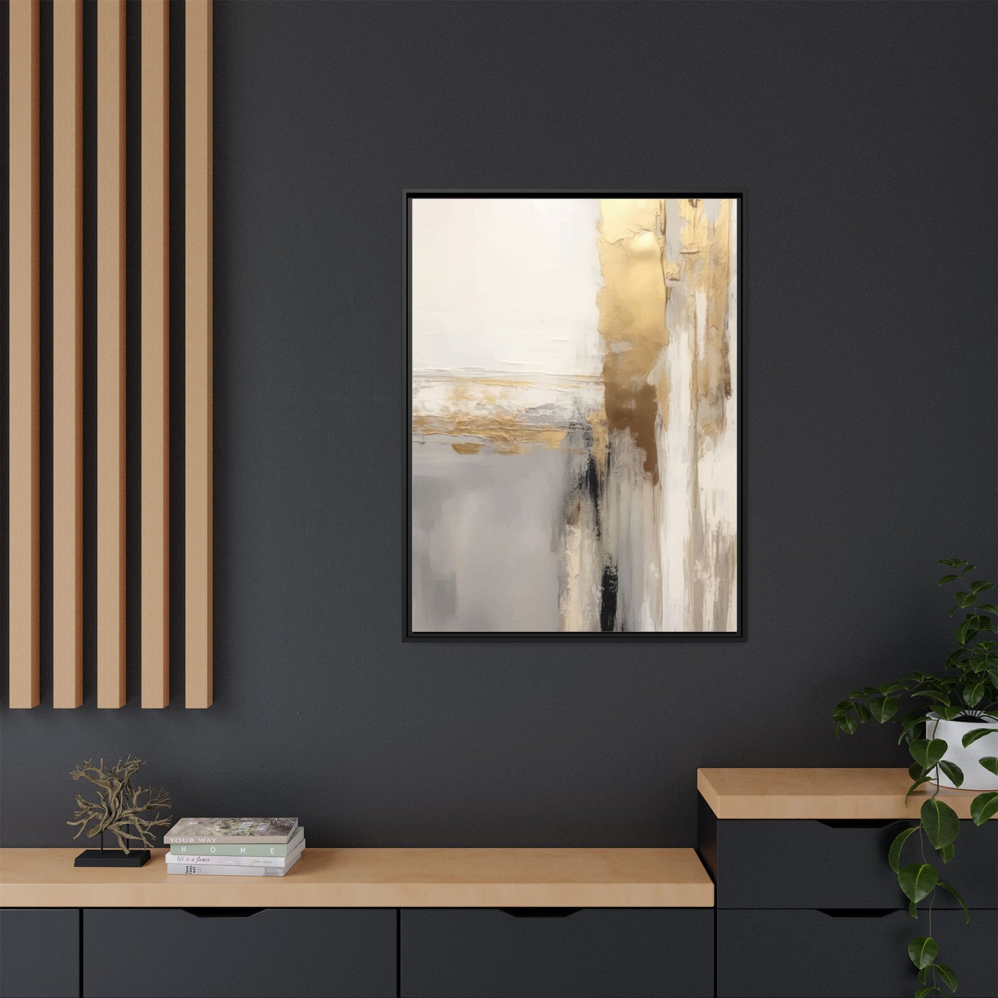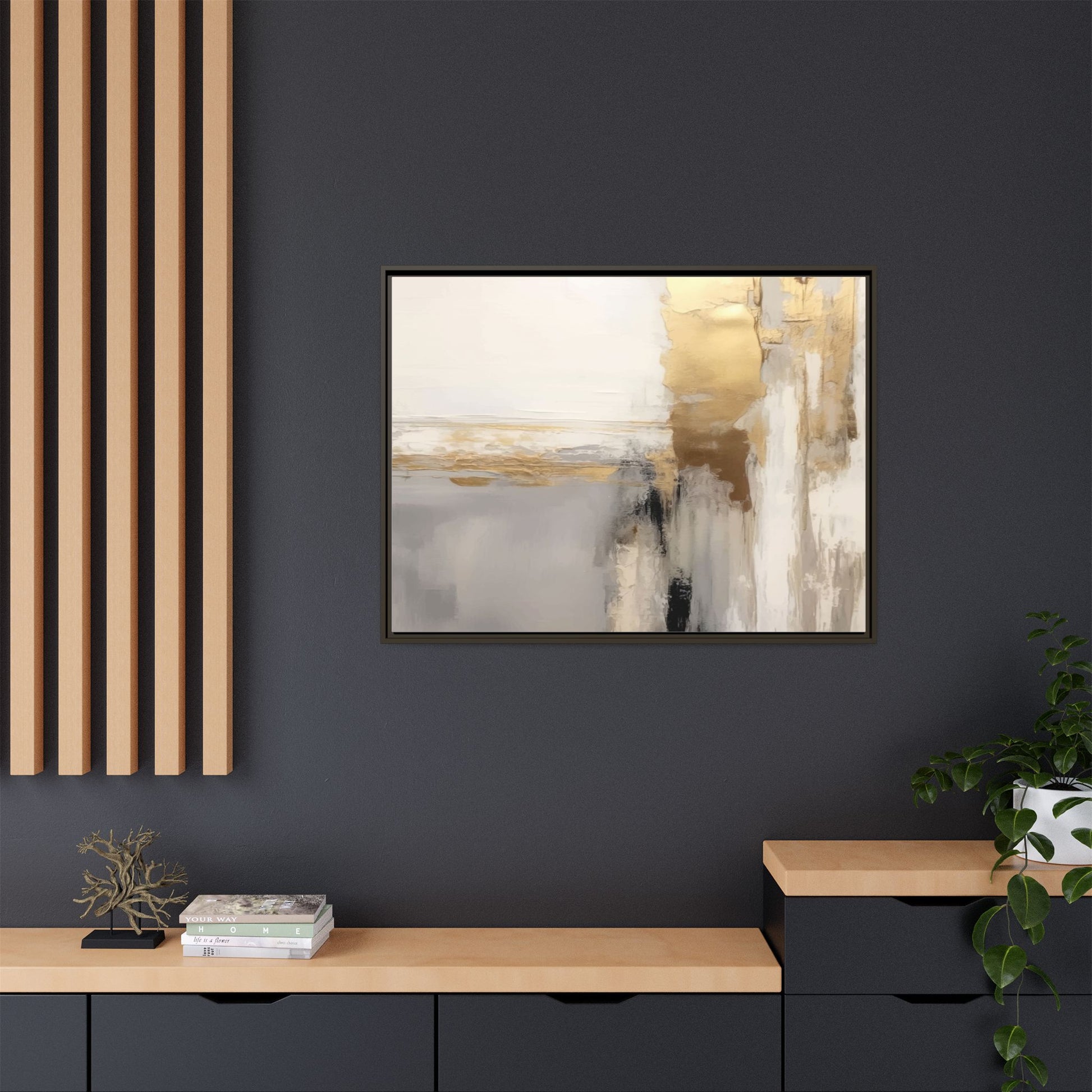 This captivating abstract artwork features a sophisticated palette of gold, white, gray, and black tones blended in a fluid, contemporary style. The painting appears to utilize techniques of layering and blending, creating soft transitions and textural depth across the canvas. Horizontal and vertical elements suggest a landscape-like composition, with sweeping golden hues reminiscent of sunlight or distant horizons intersecting with misty gray and white passages. Bold black brushstrokes provide dramatic contrast and visual anchoring within the ethereal composition. The overall effect is both serene and dynamic, inviting viewers to interpret the painting through their own emotional and visual perspective.
