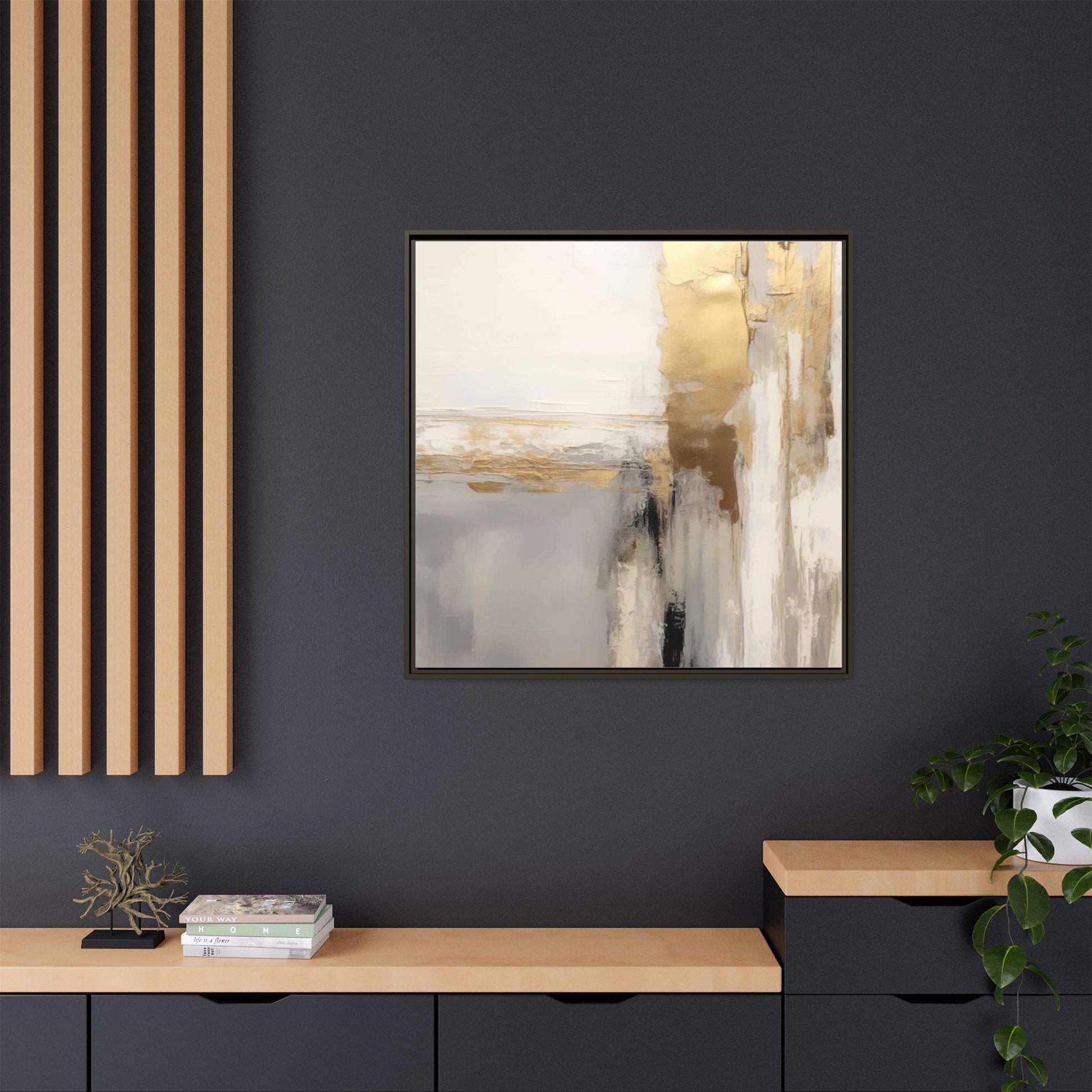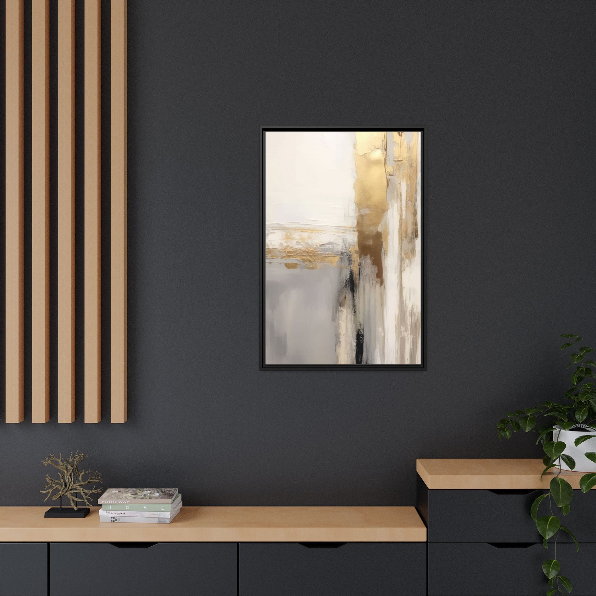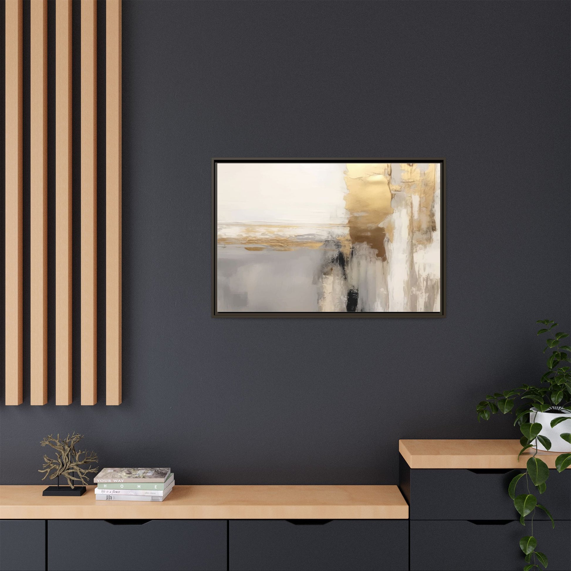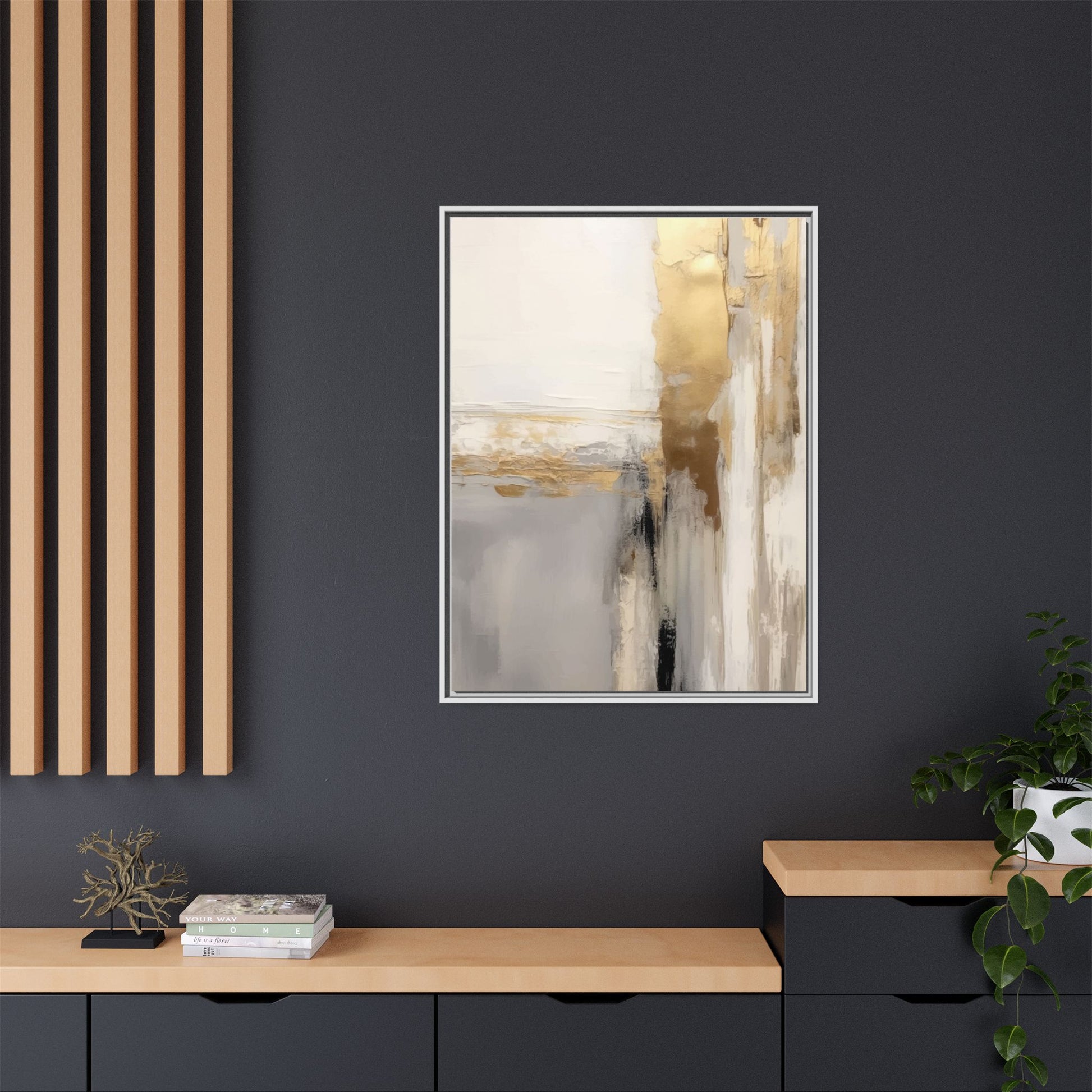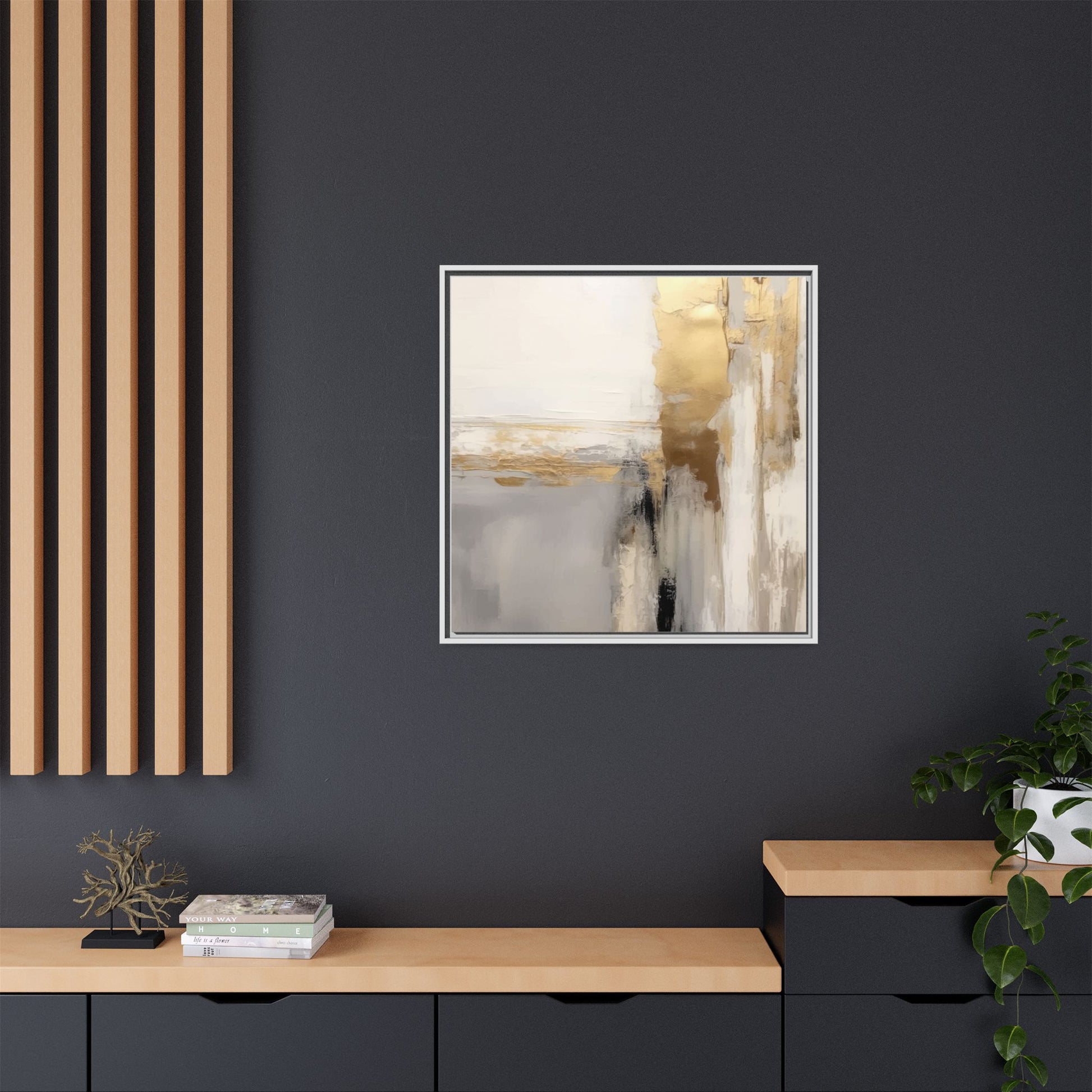 This captivating abstract artwork features a sophisticated palette of gold, white, gray, and black tones blended in a fluid, contemporary style. The painting appears to utilize techniques of layering and blending, creating soft transitions and textural depth across the canvas. Horizontal and vertical elements suggest a landscape-like composition, with sweeping golden hues reminiscent of sunlight or distant horizons intersecting with misty gray and white passages. Bold black brushstrokes provide dramatic contrast and visual anchoring within the ethereal composition. The overall effect is both serene and dynamic, inviting viewers to interpret the painting through their own emotional and visual perspective.