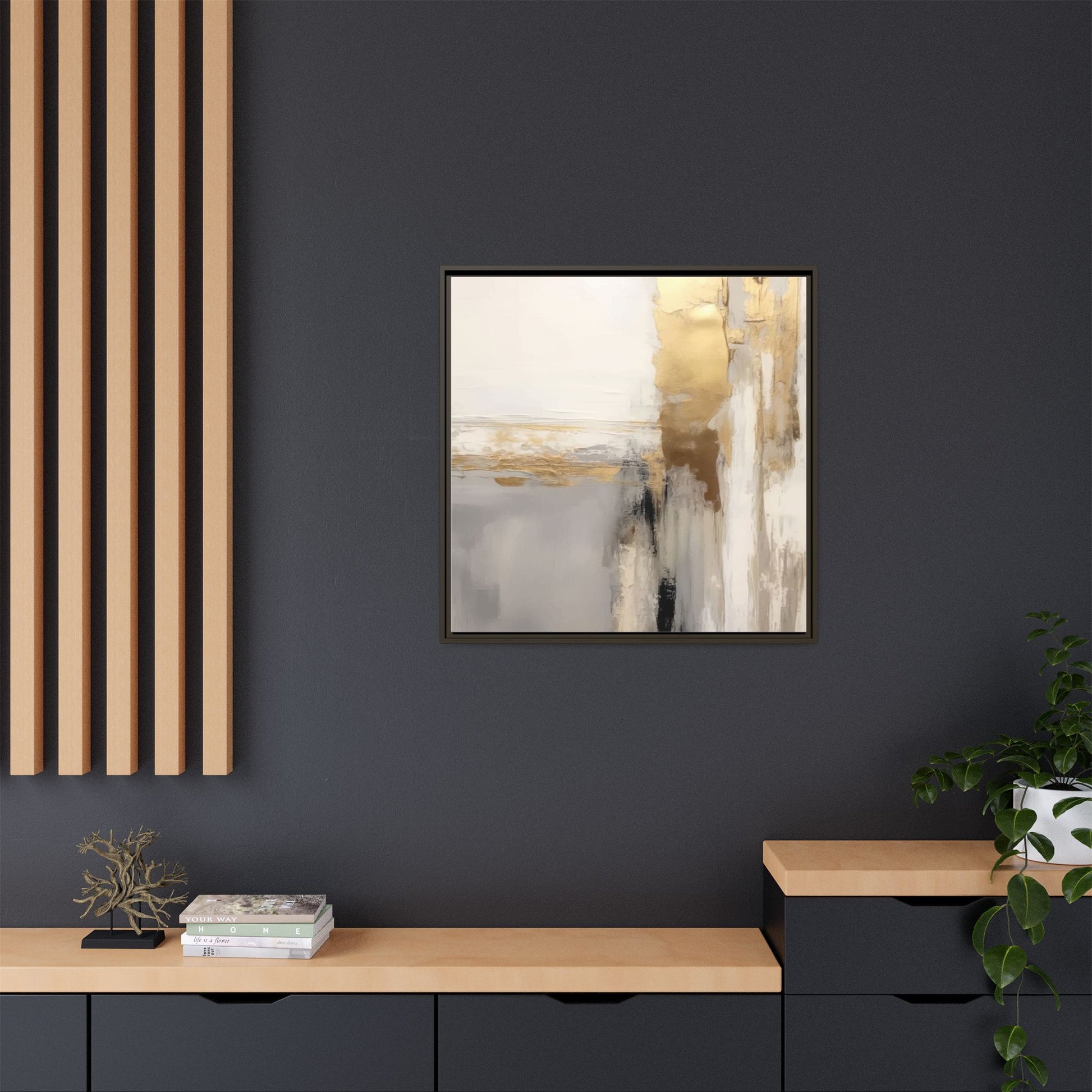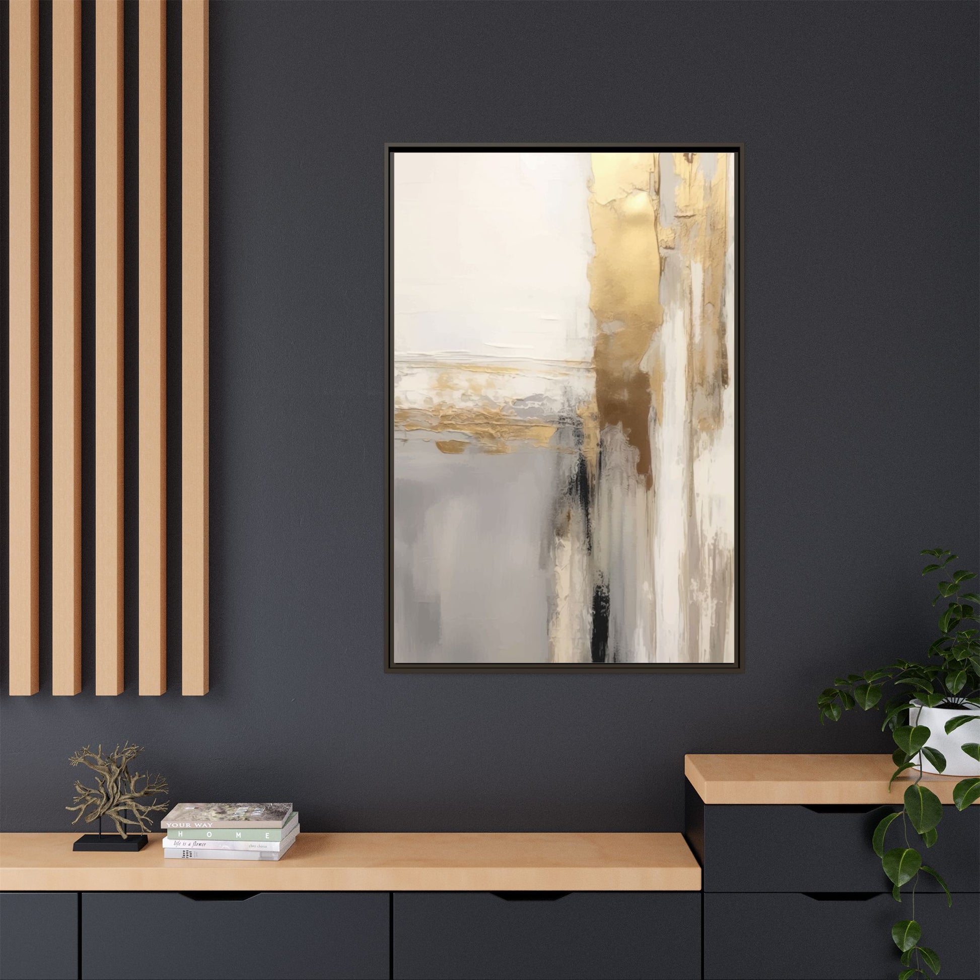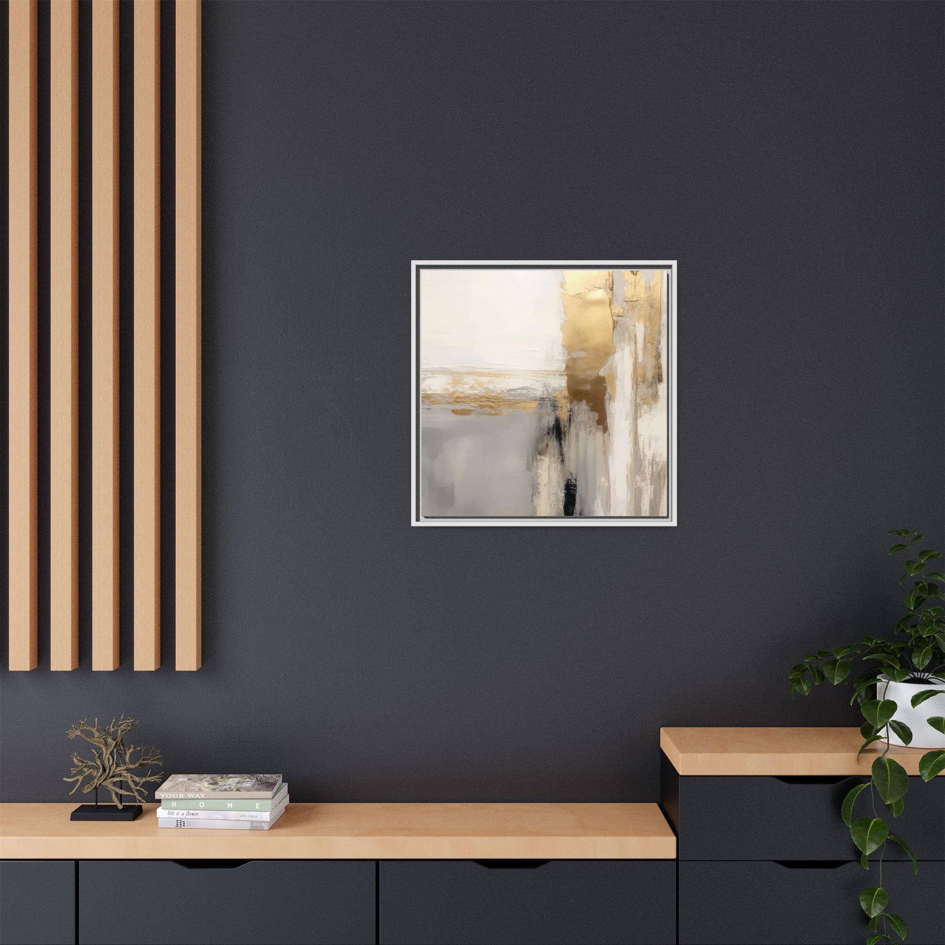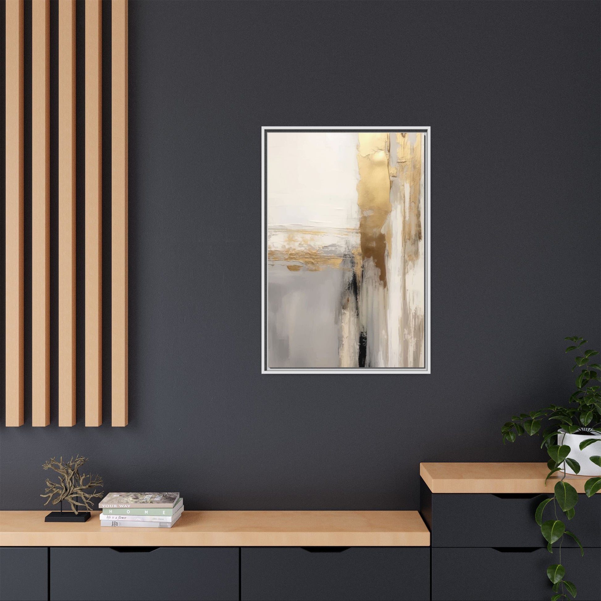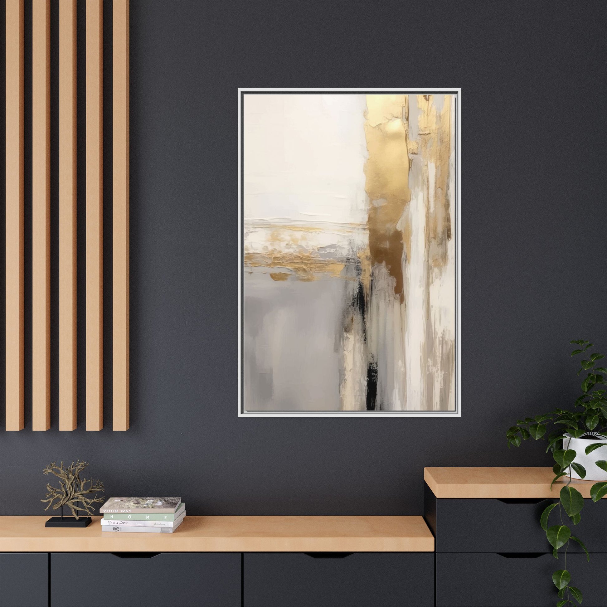 This captivating abstract artwork features a sophisticated palette of gold, white, gray, and black tones blended in a fluid, contemporary style. The painting appears to utilize techniques of layering and blending, creating soft transitions and textural depth across the canvas. Horizontal and vertical elements suggest a landscape-like composition, with sweeping golden hues reminiscent of sunlight or distant horizons intersecting with misty gray and white passages. Bold black brushstrokes provide dramatic contrast and visual anchoring within the ethereal composition. The overall effect is both serene and dynamic, inviting viewers to interpret the painting through their own emotional and visual perspective.