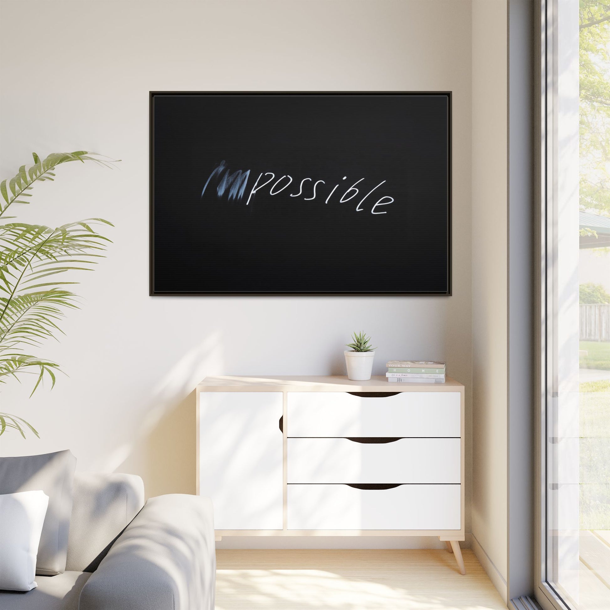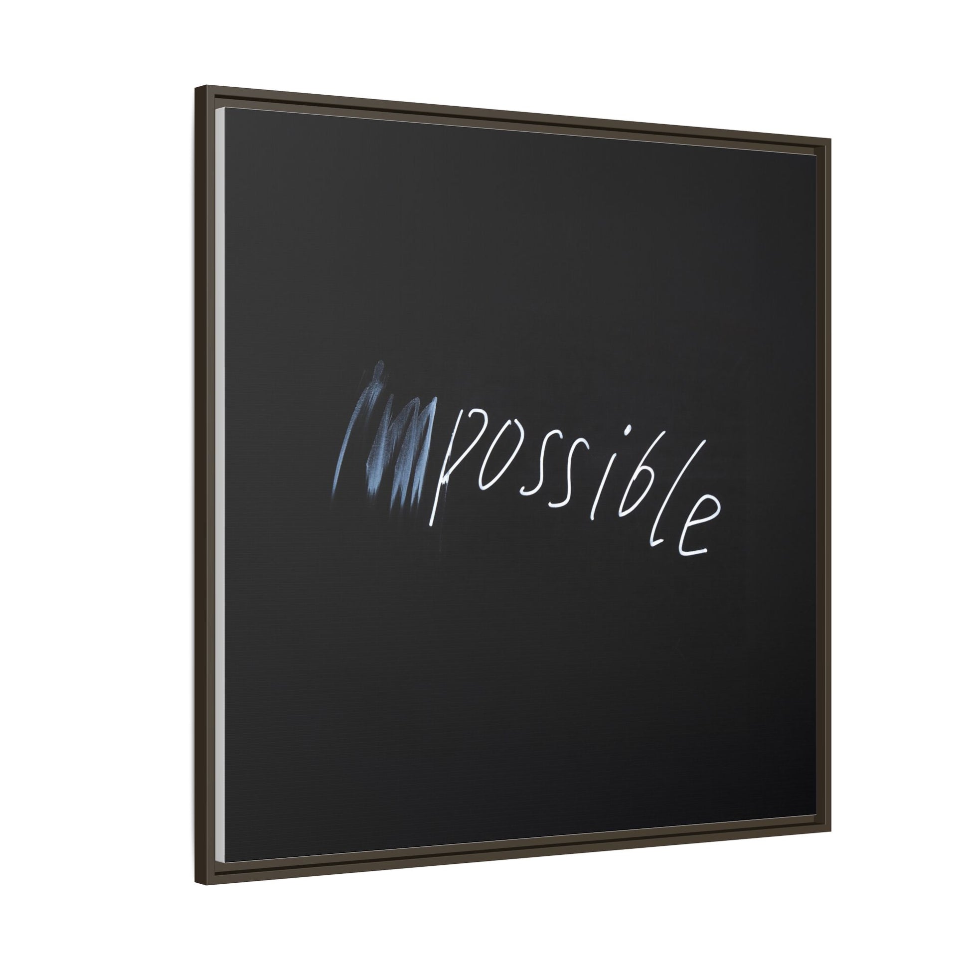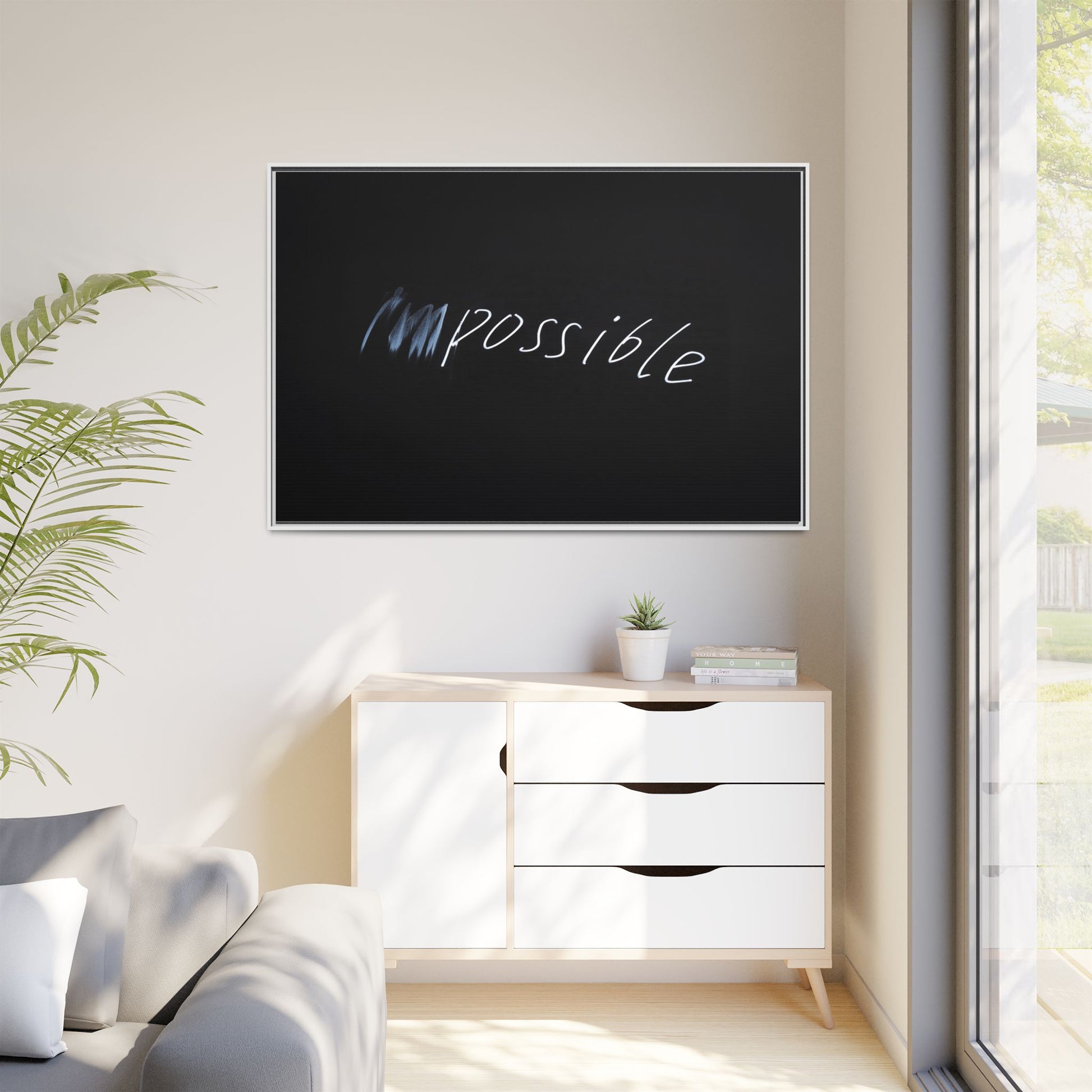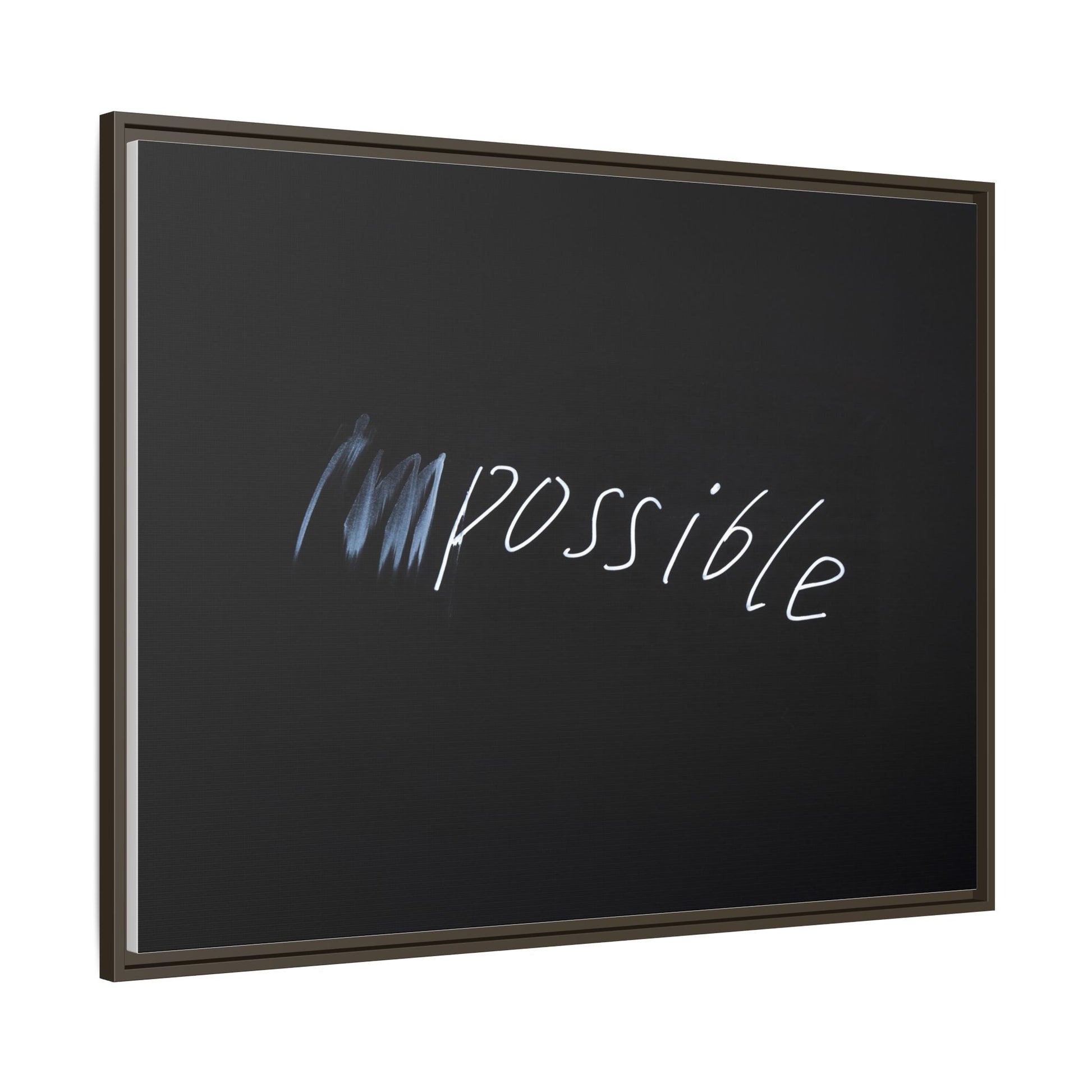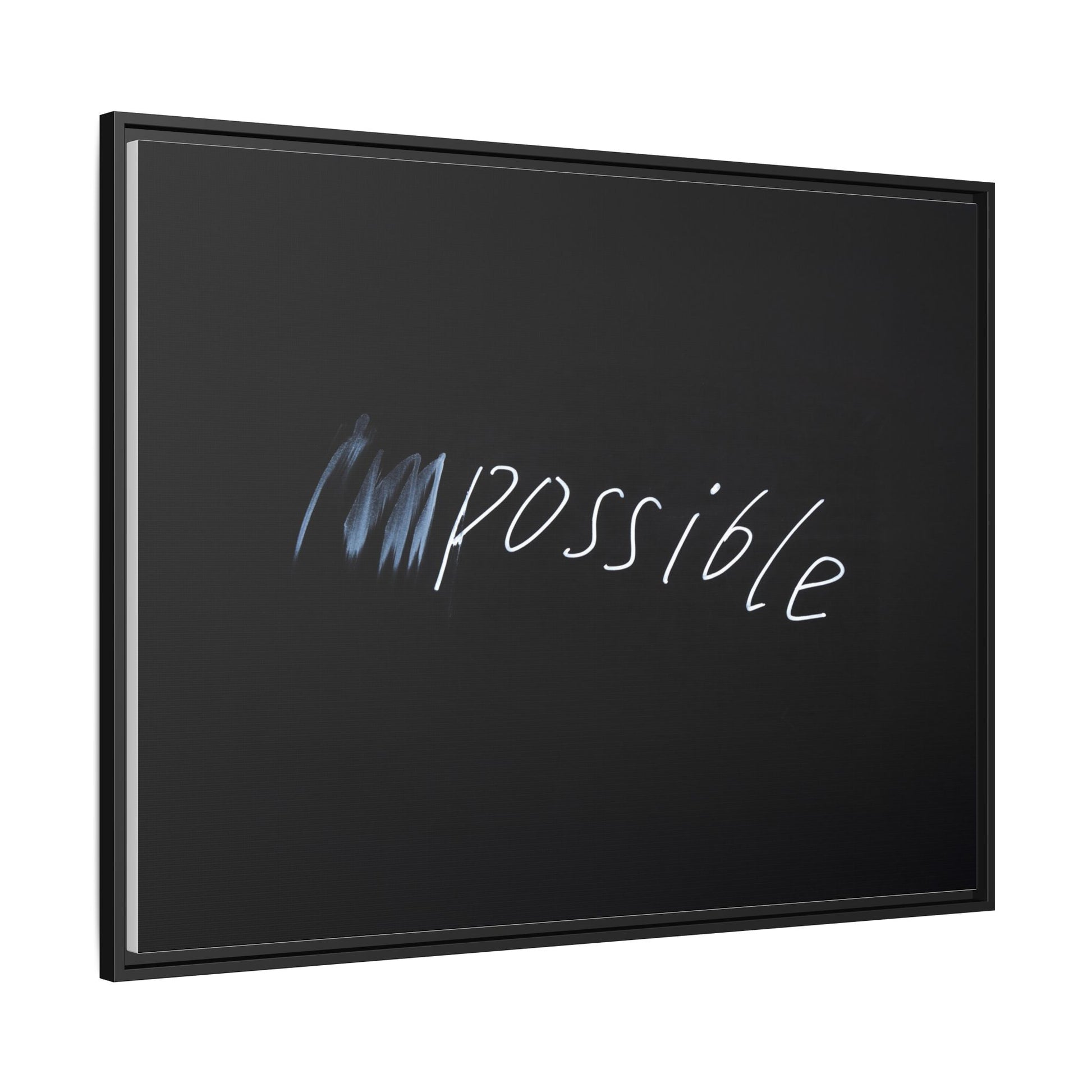 This striking image depicts the word "Impossible" written in white, luminescent lettering against a deep black background. The text appears to be hand-drawn with a glowing effect, creating a sense of dynamism and movement. The first part of the word seems to be slightly blurred or smeared, giving an impression of transformation or breaking through barriers. The high-contrast design emphasizes the visual impact of the word, making it stand out dramatically against the dark backdrop. The overall aesthetic suggests a conceptual or motivational theme, hinting at overcoming limitations and challenging perceived boundaries.