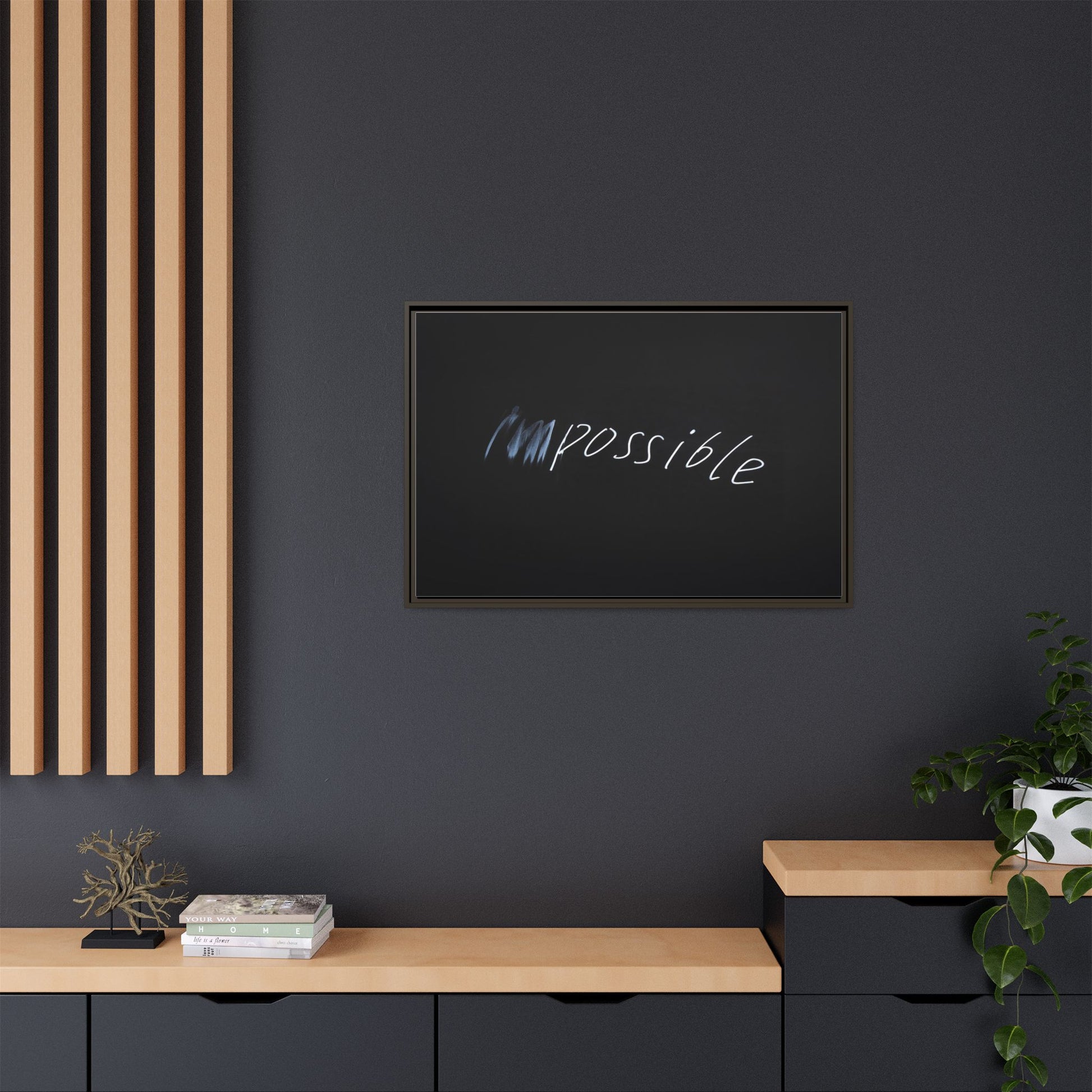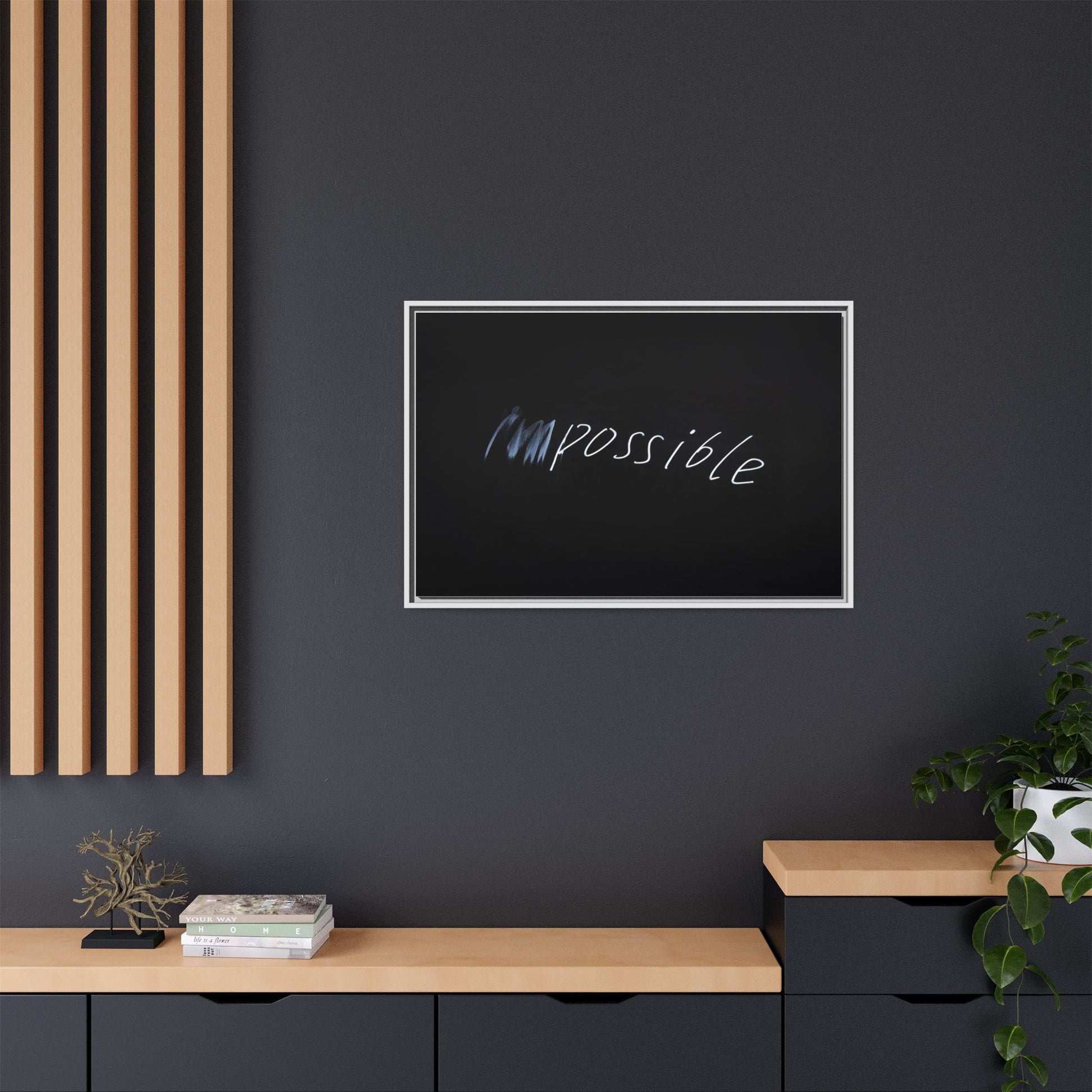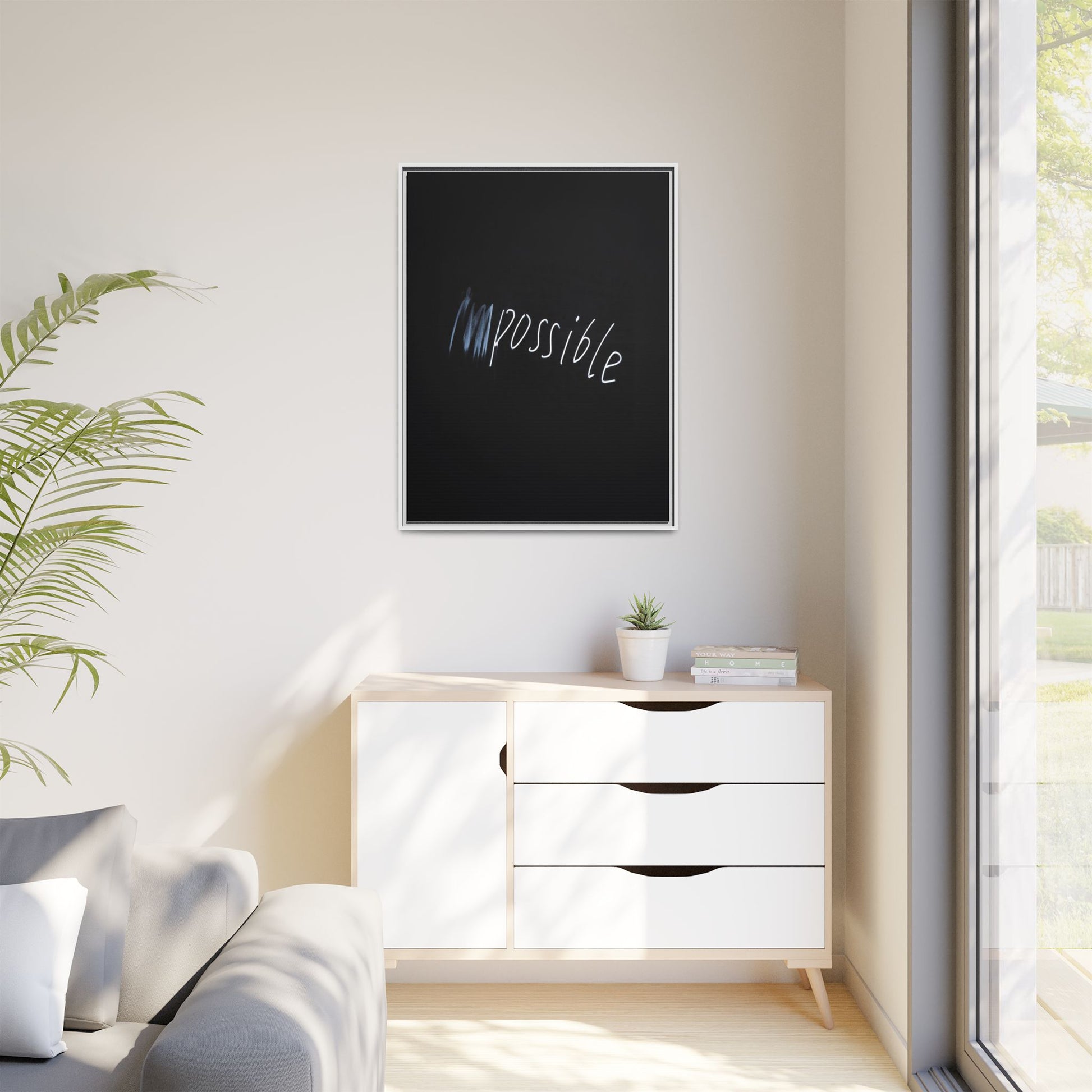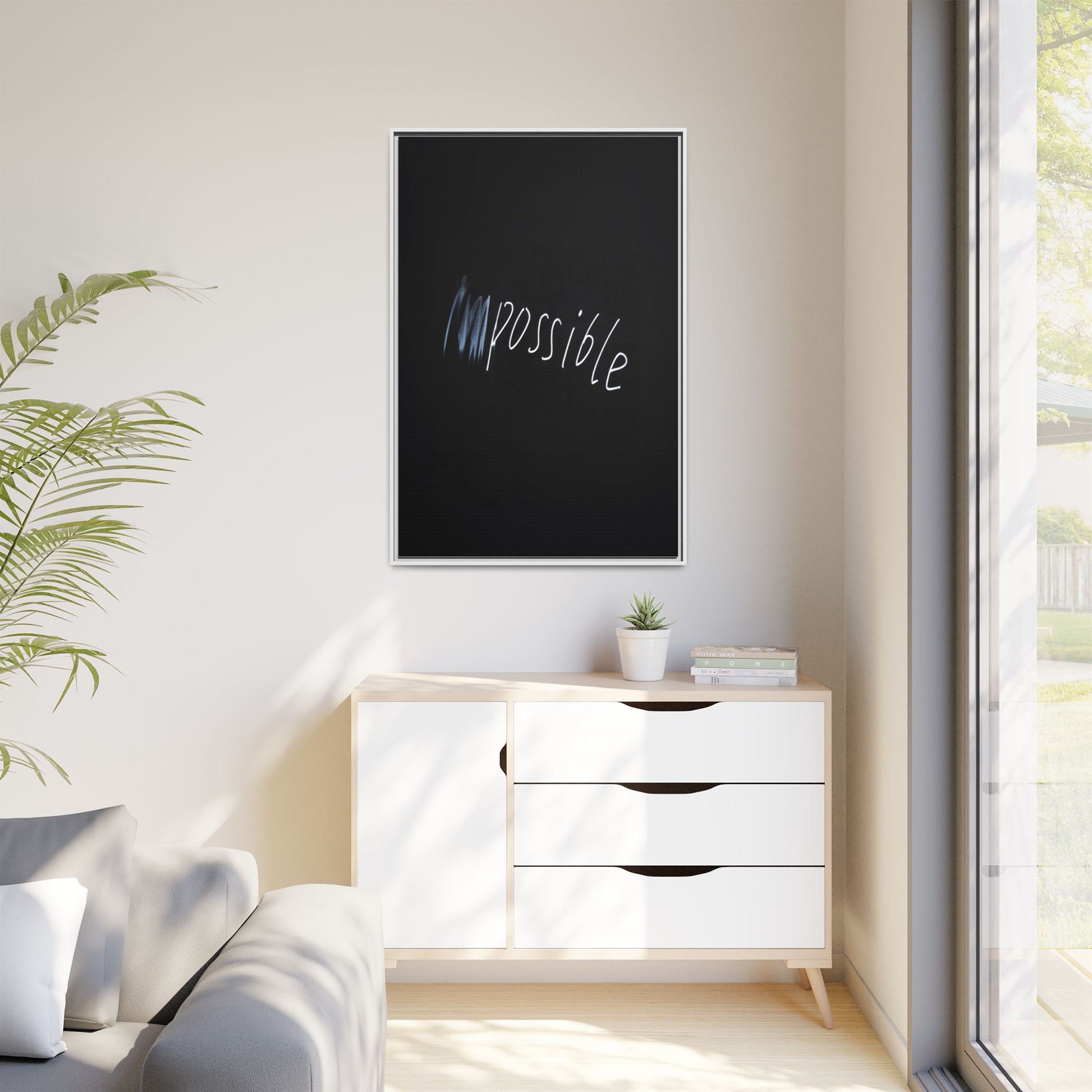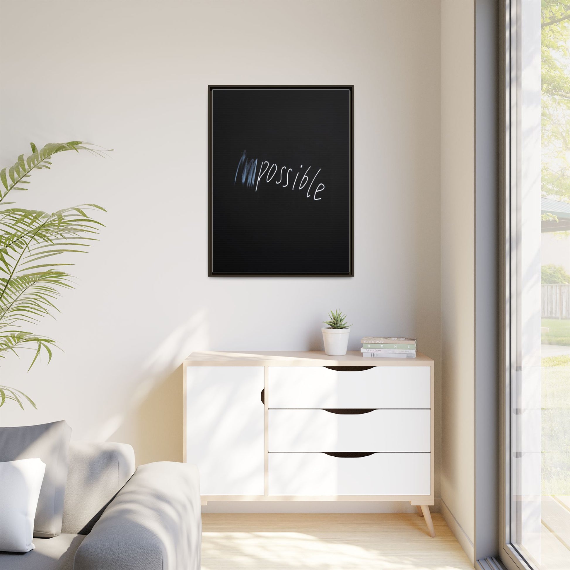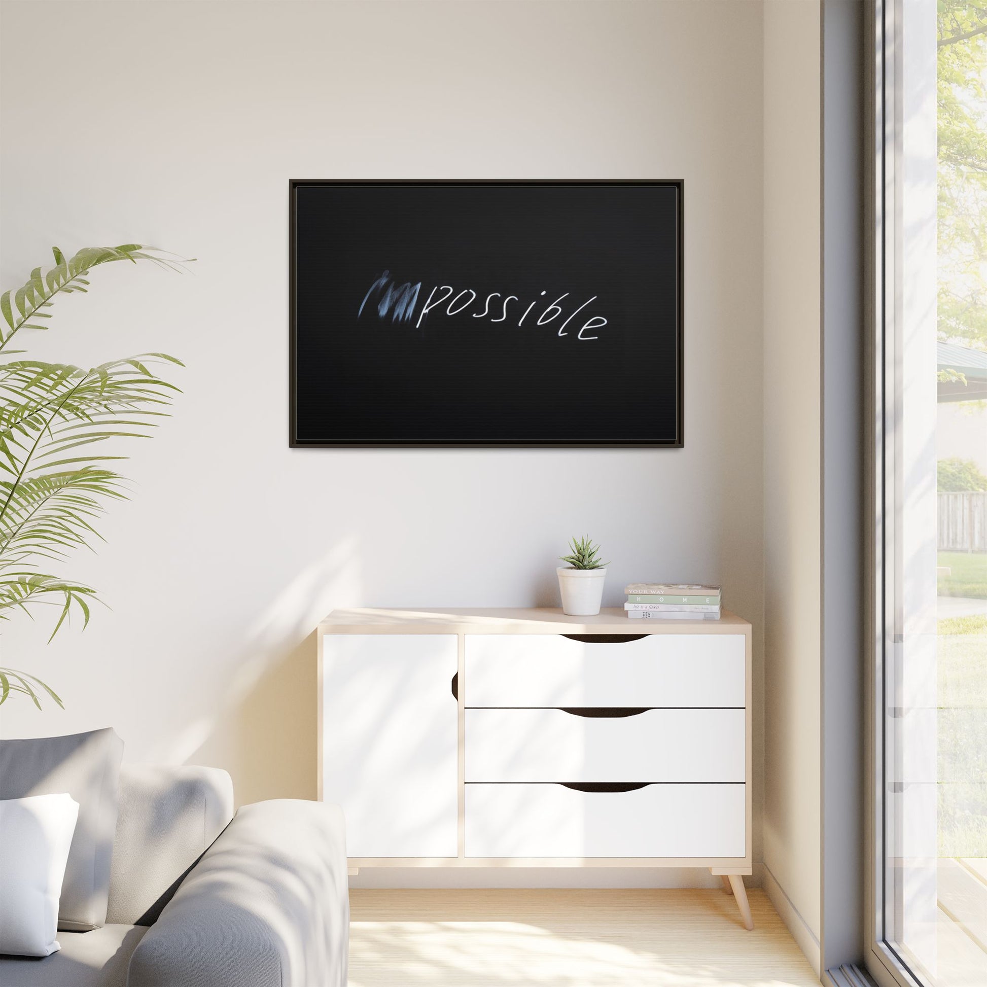 This striking image depicts the word "Impossible" written in white, luminescent lettering against a deep black background. The text appears to be hand-drawn with a glowing effect, creating a sense of dynamism and movement. The first part of the word seems to be slightly blurred or smeared, giving an impression of transformation or breaking through barriers. The high-contrast design emphasizes the visual impact of the word, making it stand out dramatically against the dark backdrop. The overall aesthetic suggests a conceptual or motivational theme, hinting at overcoming limitations and challenging perceived boundaries.