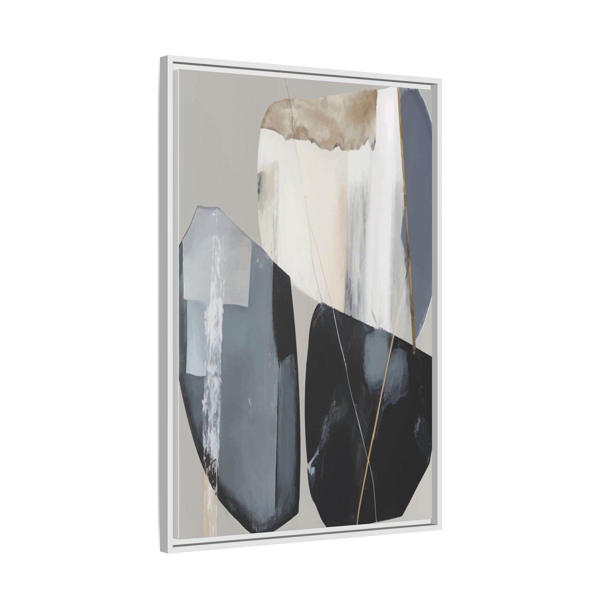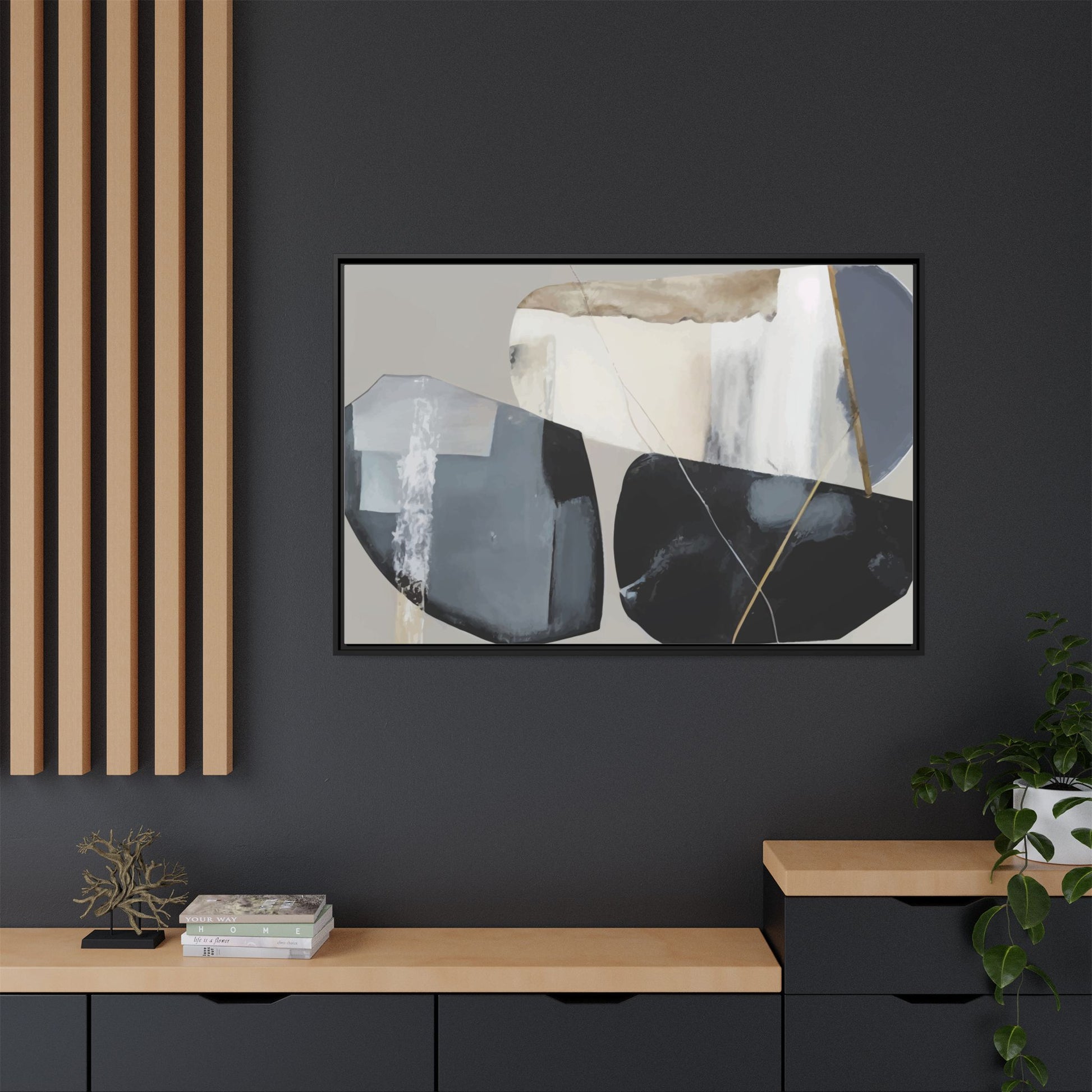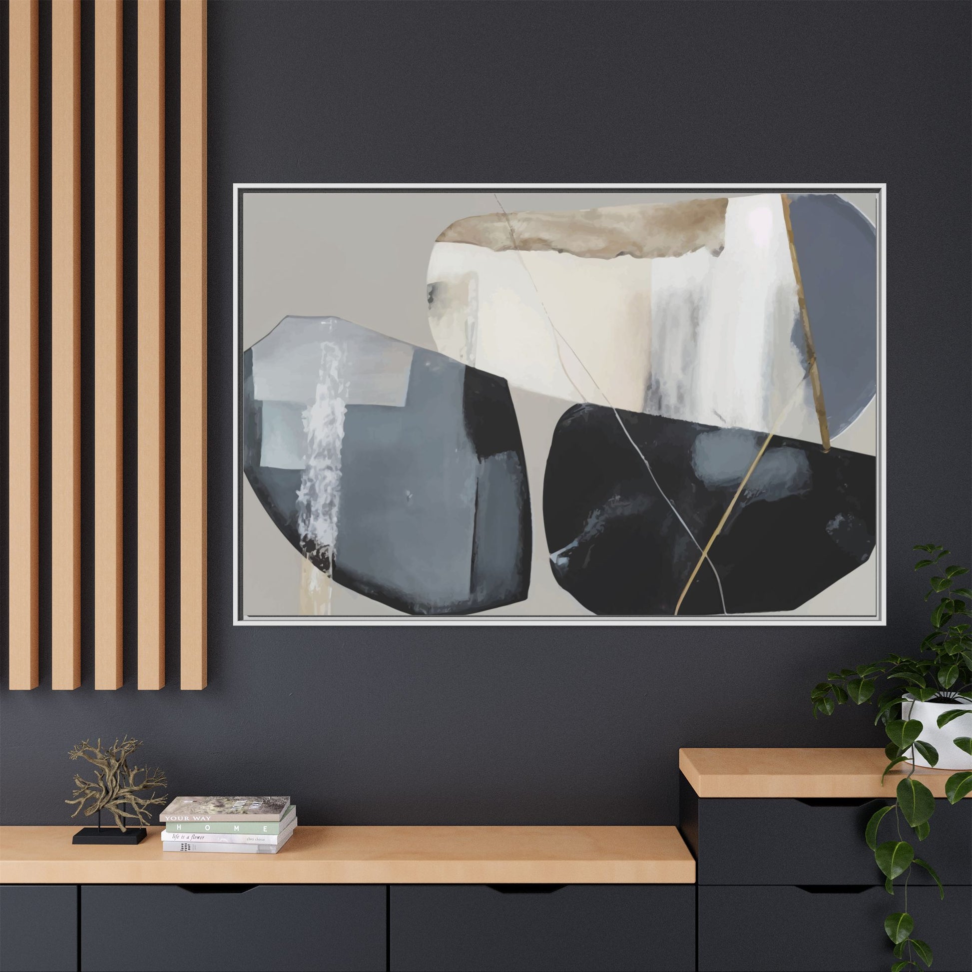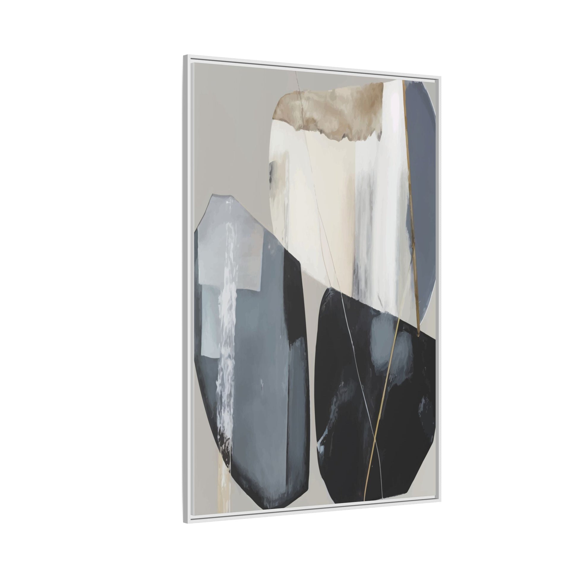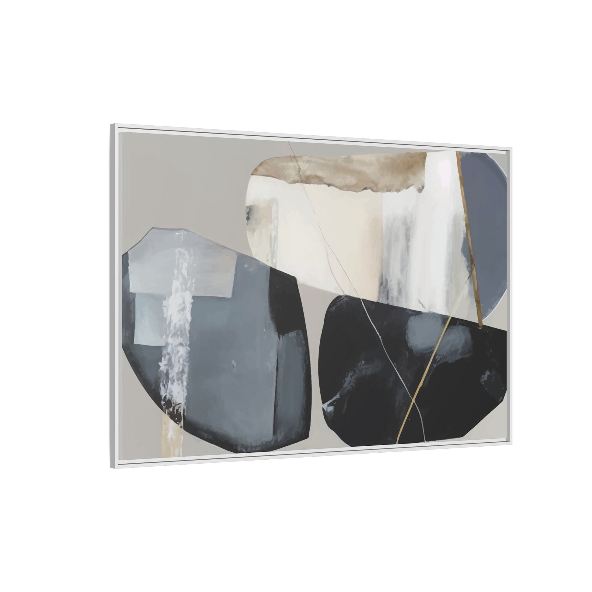 This contemporary abstract painting features a sophisticated composition of geometric shapes in a muted color palette of whites, grays, and blacks. The artwork appears to be divided into curved, irregular sections that overlap and intersect, creating a sense of depth and visual complexity. Soft, blended edges and translucent layers give the piece a fluid, ethereal quality, with hints of beige and silvery tones adding nuanced texture. Thin, precise golden or white lines traverse the canvas, providing linear contrast to the organic, rounded forms. The painting evokes a sense of balance and harmony through its careful arrangement of shapes and deliberate use of negative space, embodying a minimalist yet dynamic aesthetic.