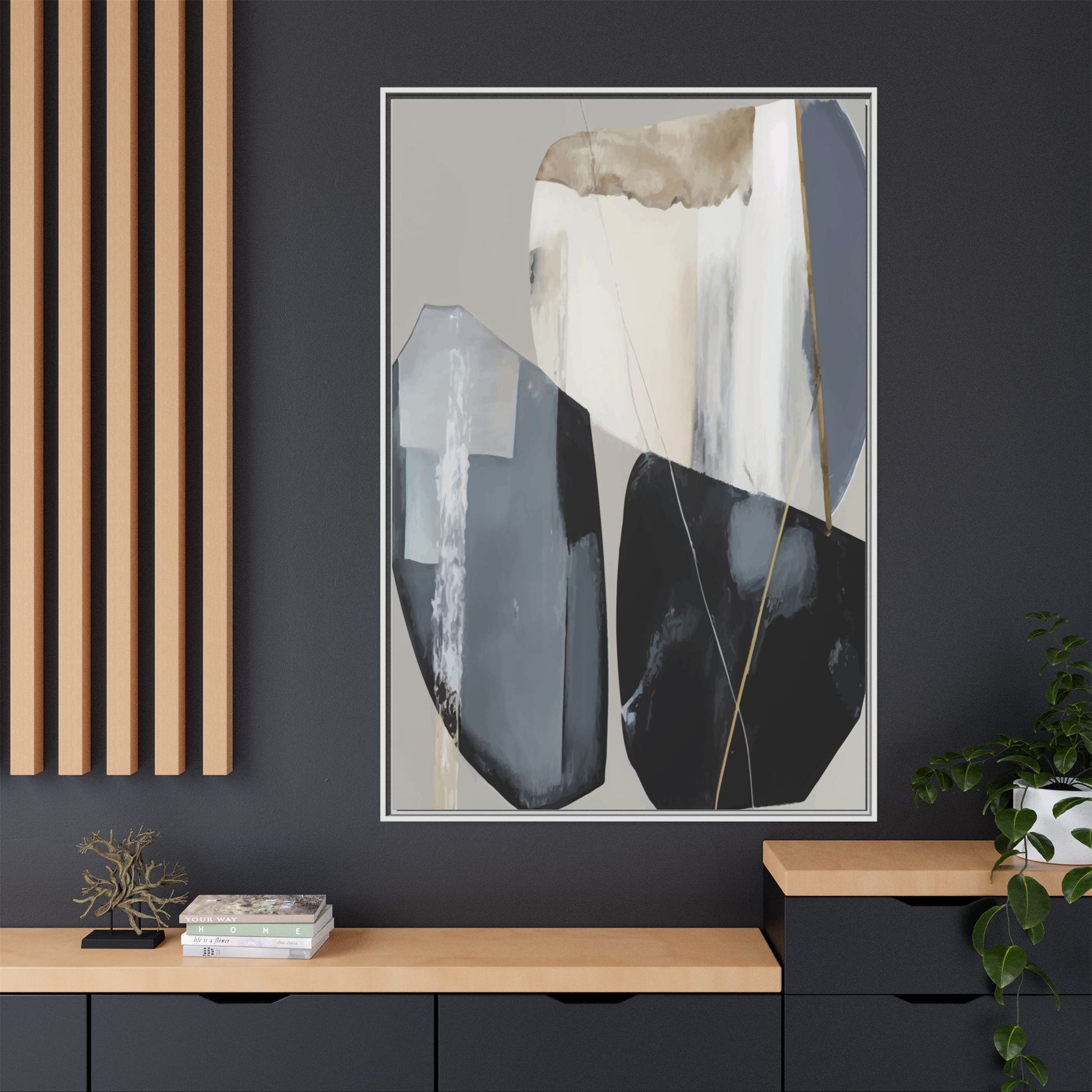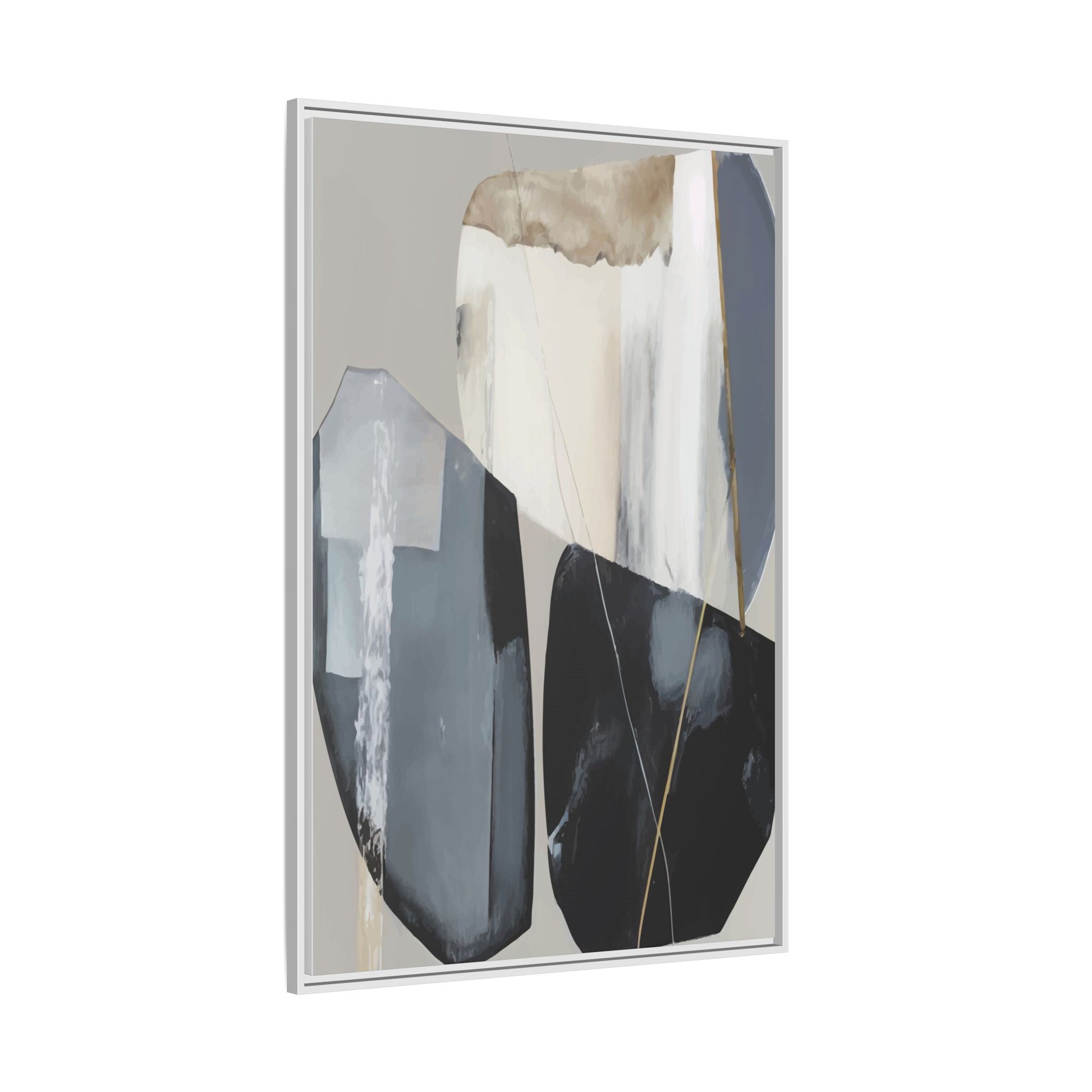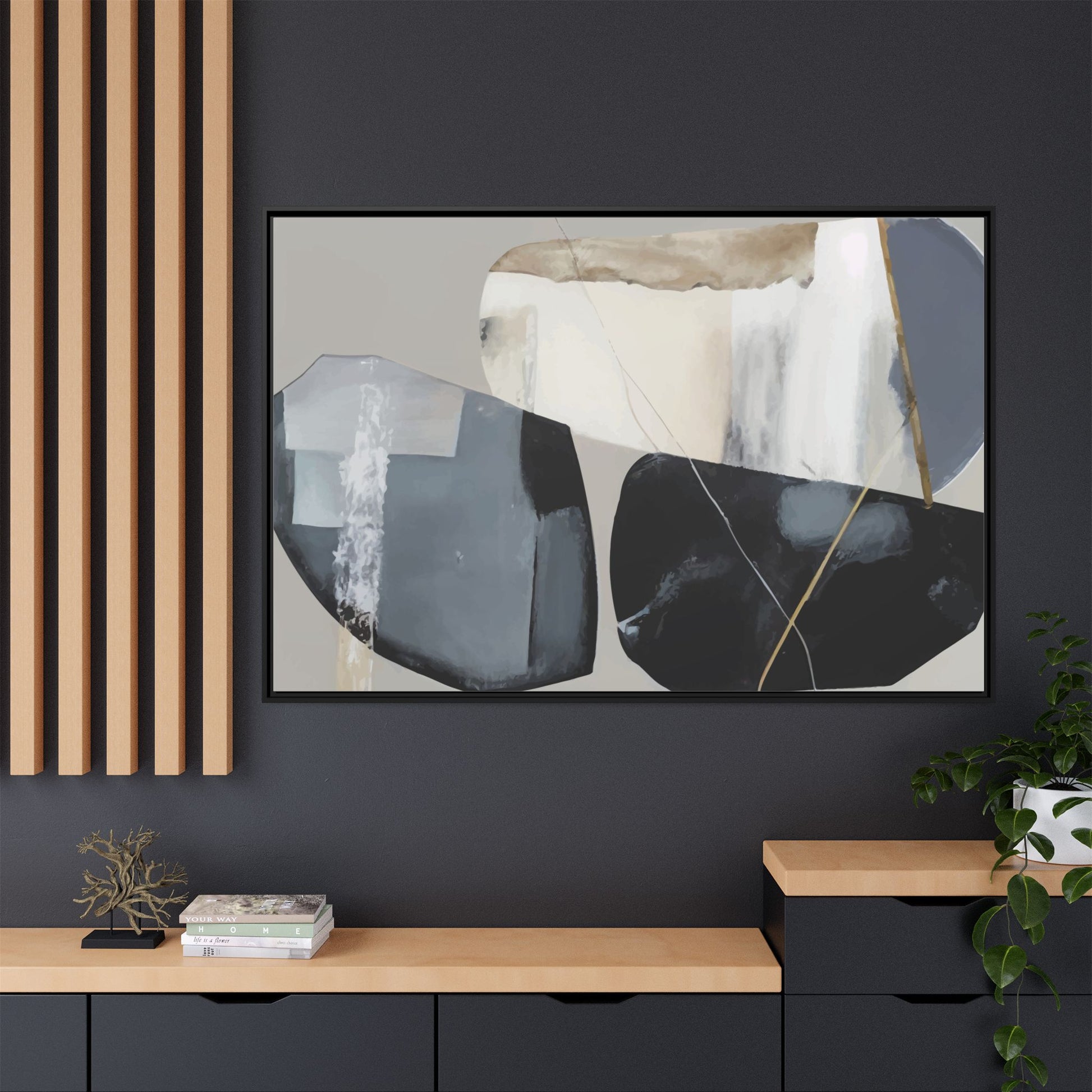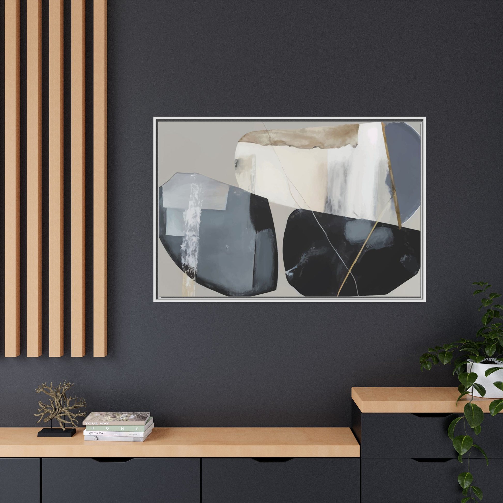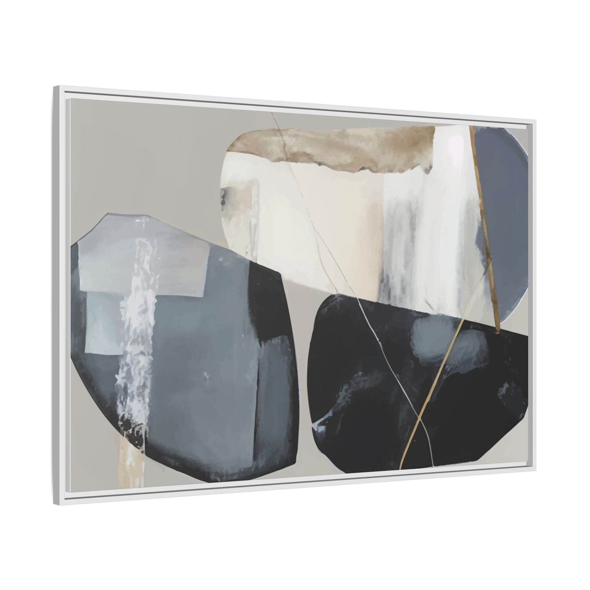 This contemporary abstract painting features a sophisticated composition of geometric shapes in a muted color palette of whites, grays, and blacks. The artwork appears to be divided into curved, irregular sections that overlap and intersect, creating a sense of depth and visual complexity. Soft, blended edges and translucent layers give the piece a fluid, ethereal quality, with hints of beige and silvery tones adding nuanced texture. Thin, precise golden or white lines traverse the canvas, providing linear contrast to the organic, rounded forms. The painting evokes a sense of balance and harmony through its careful arrangement of shapes and deliberate use of negative space, embodying a minimalist yet dynamic aesthetic.