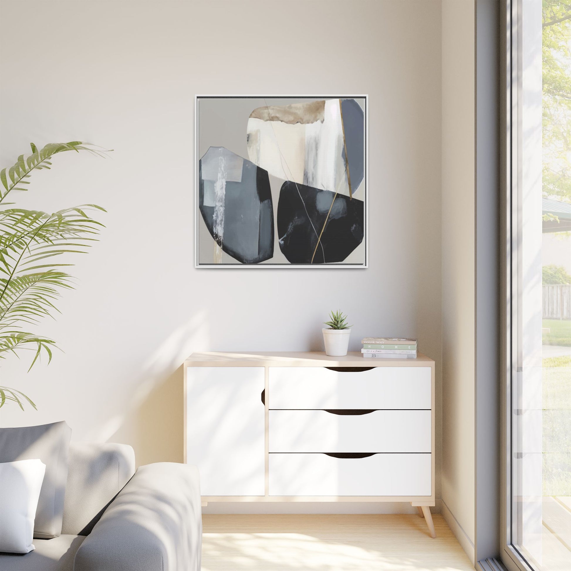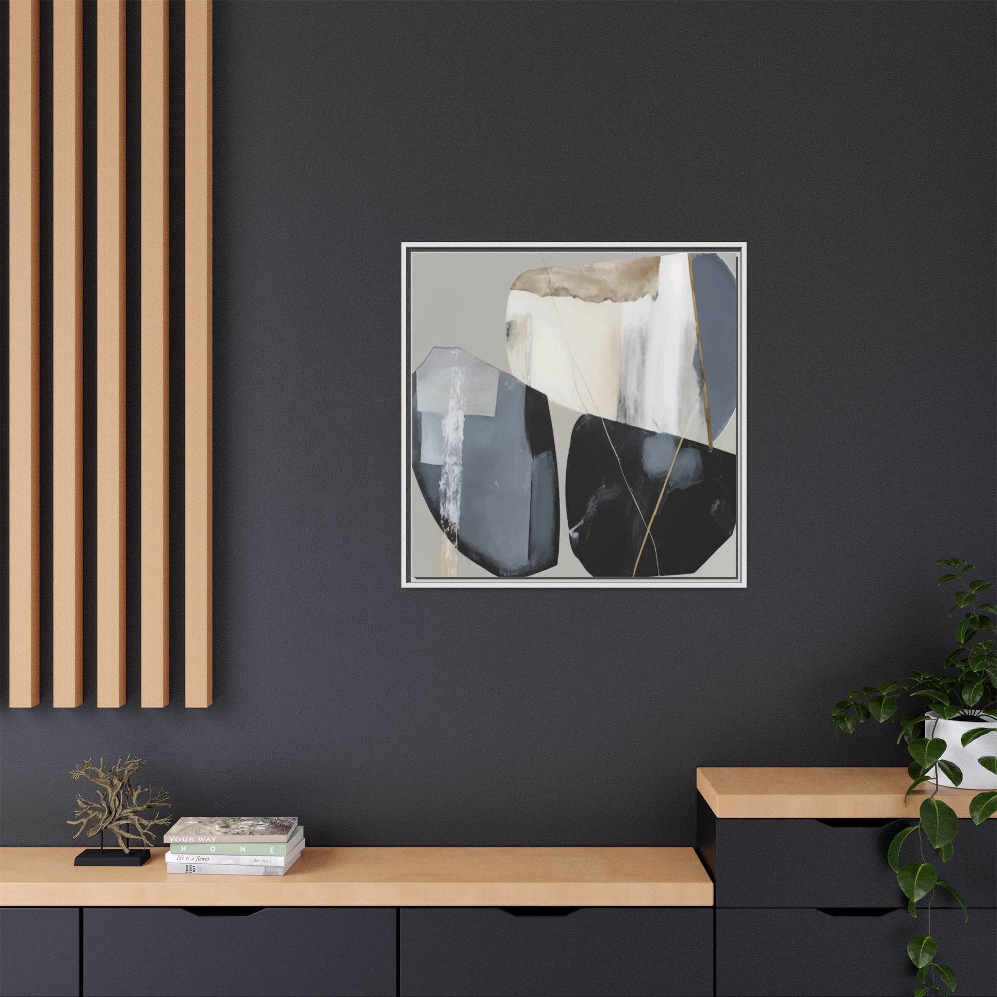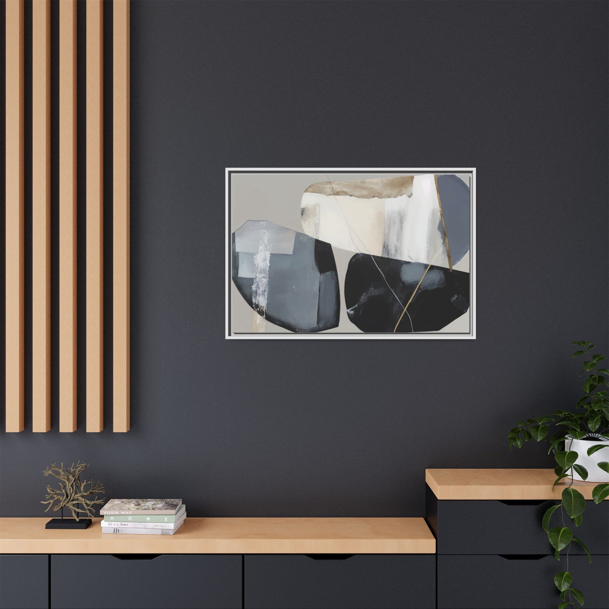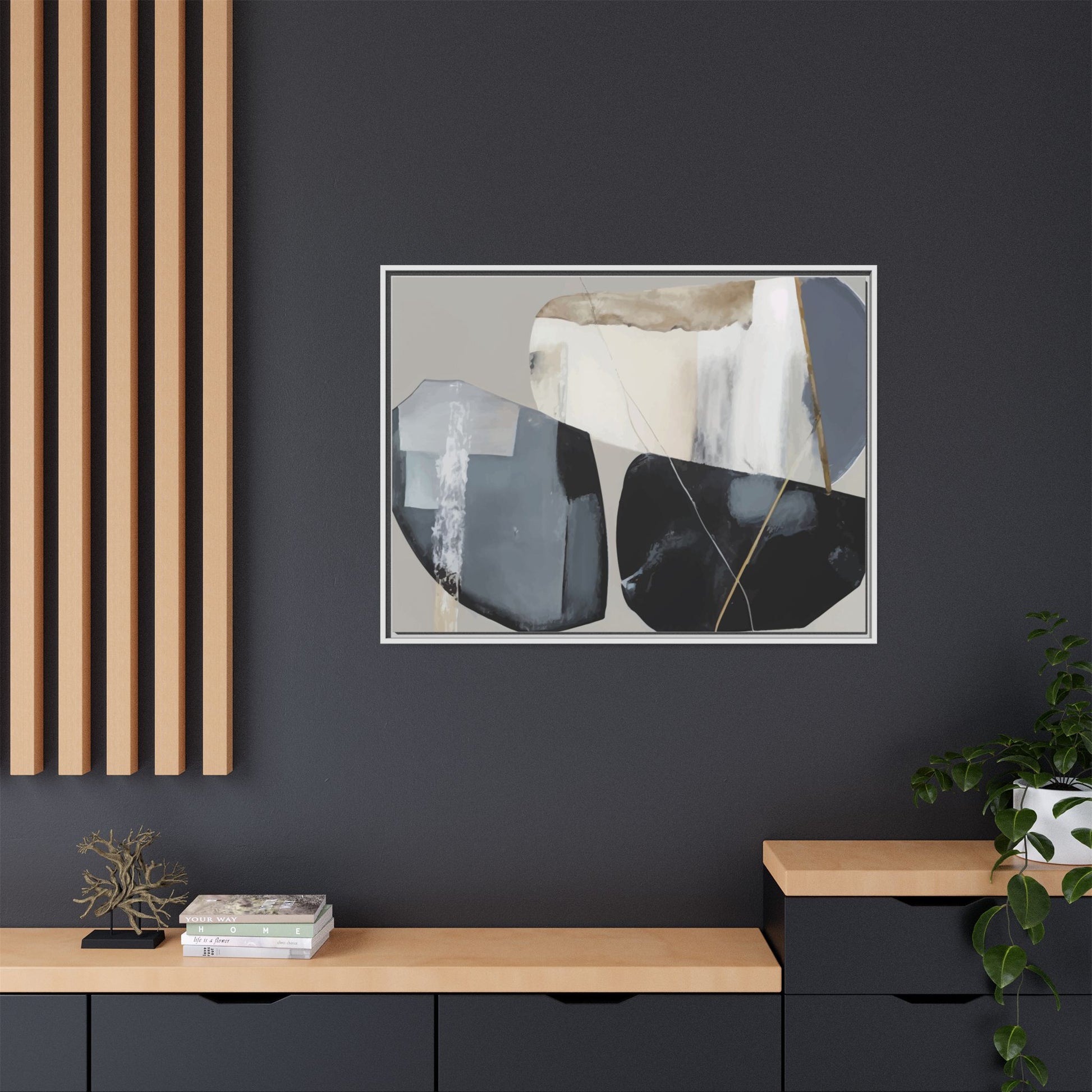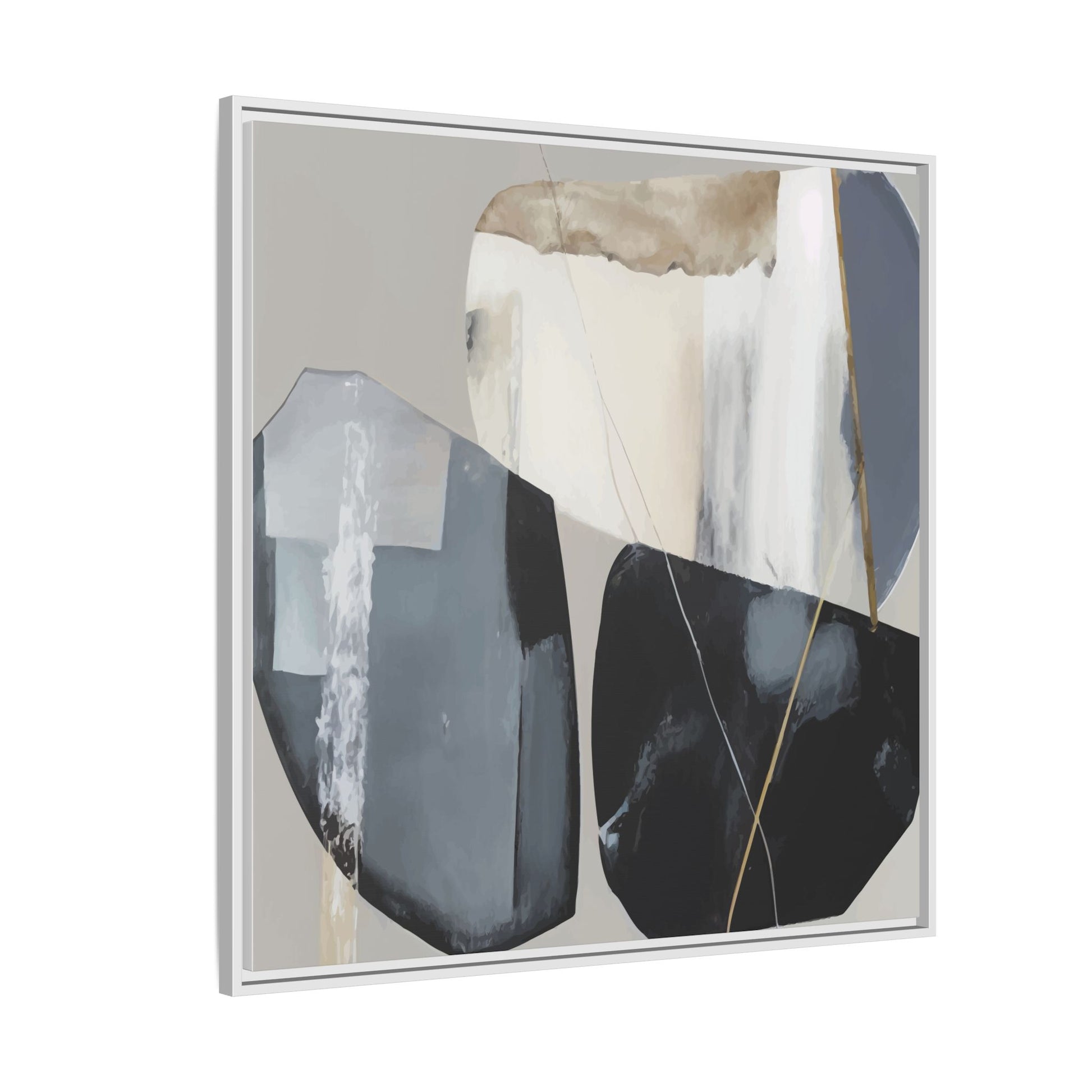 This contemporary abstract painting features a sophisticated composition of geometric shapes in a muted color palette of whites, grays, and blacks. The artwork appears to be divided into curved, irregular sections that overlap and intersect, creating a sense of depth and visual complexity. Soft, blended edges and translucent layers give the piece a fluid, ethereal quality, with hints of beige and silvery tones adding nuanced texture. Thin, precise golden or white lines traverse the canvas, providing linear contrast to the organic, rounded forms. The painting evokes a sense of balance and harmony through its careful arrangement of shapes and deliberate use of negative space, embodying a minimalist yet dynamic aesthetic.