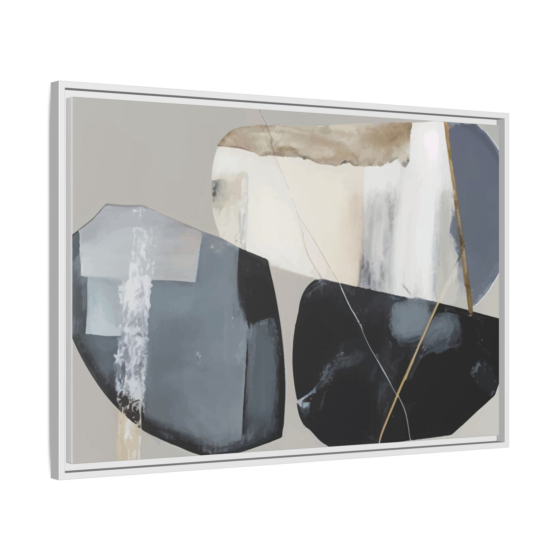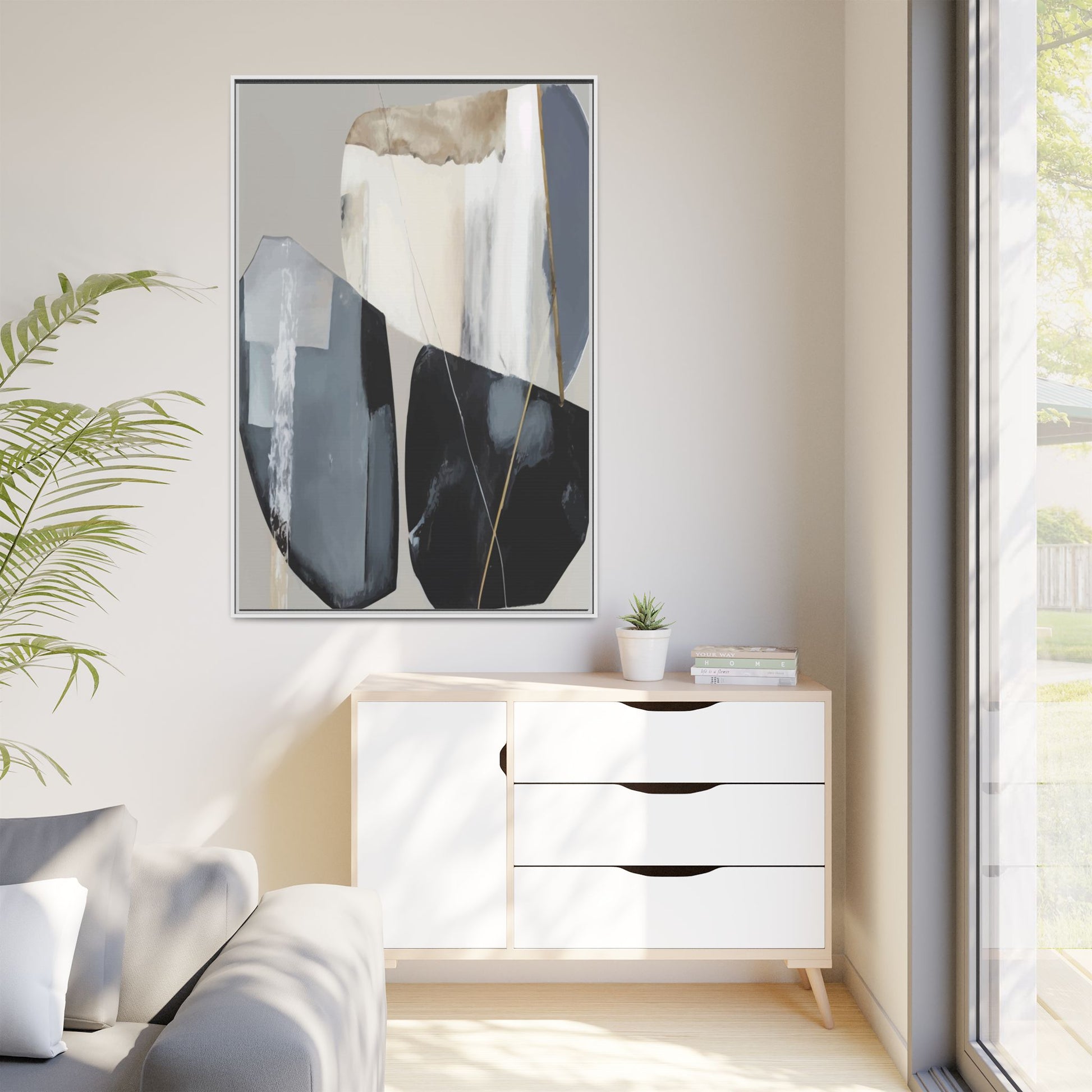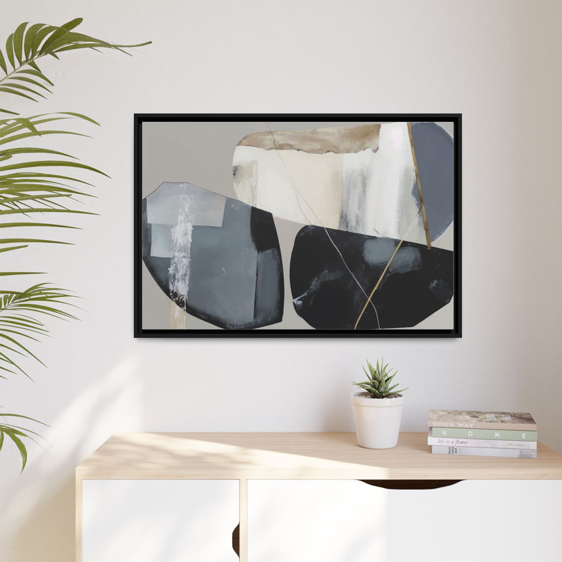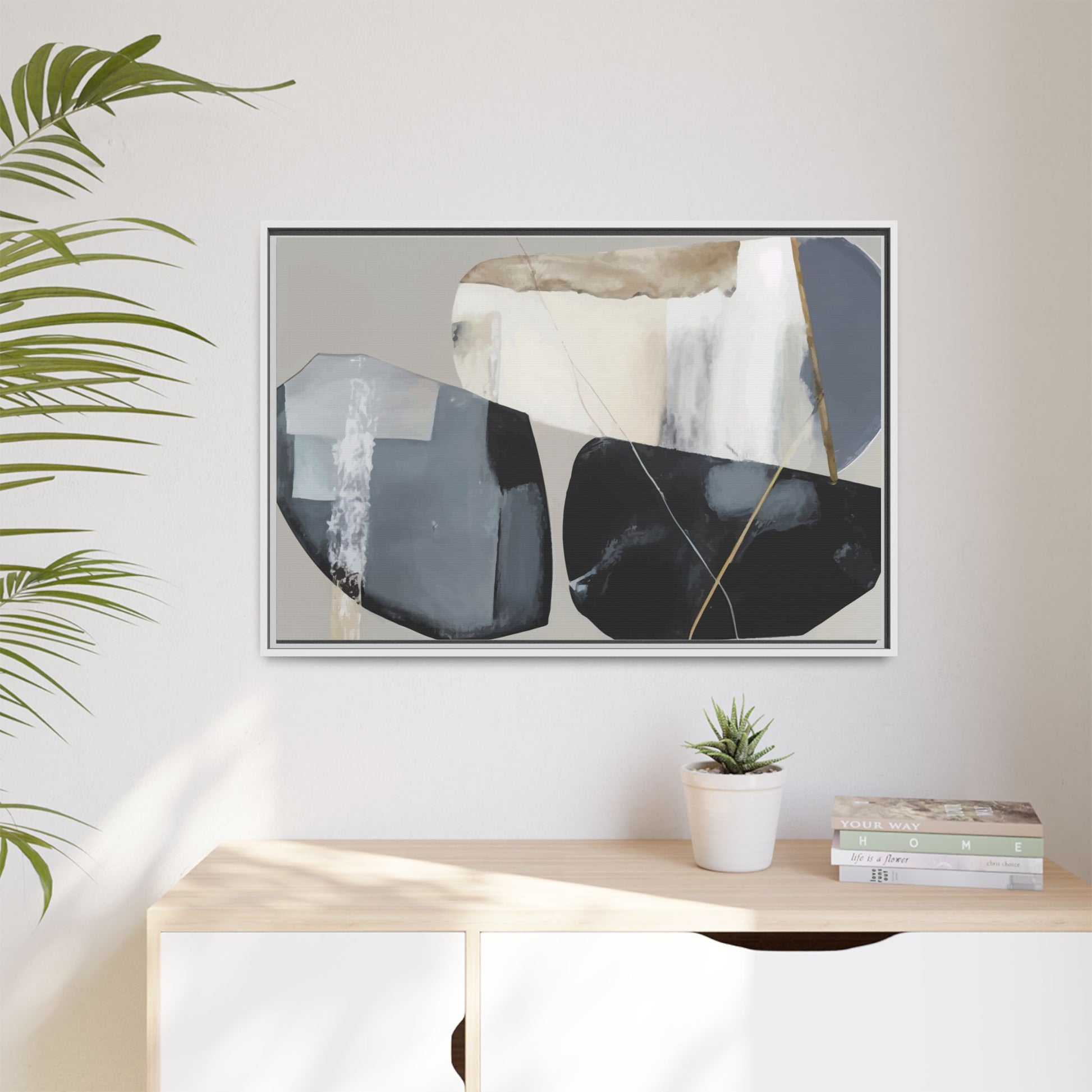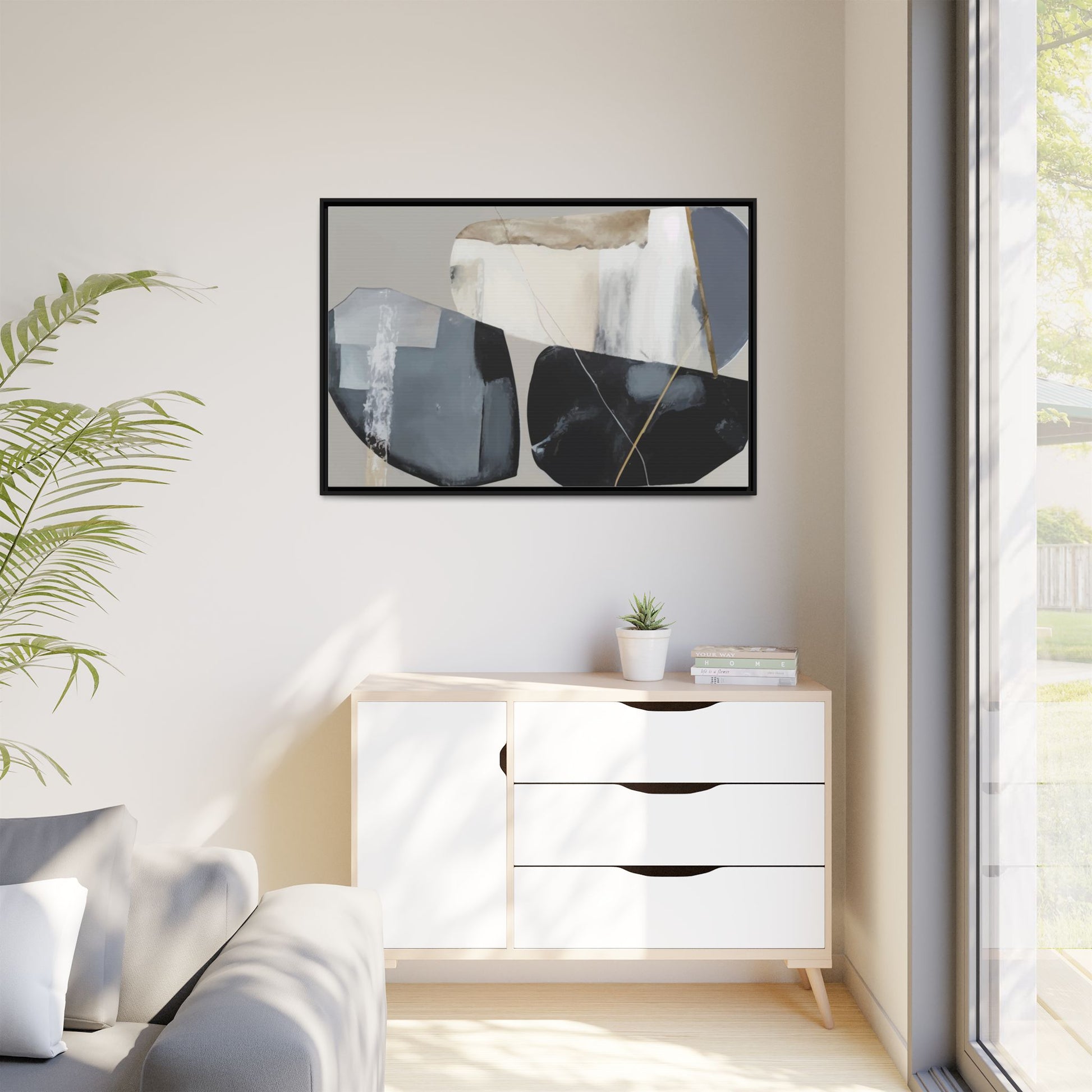 This contemporary abstract painting features a sophisticated composition of geometric shapes in a muted color palette of whites, grays, and blacks. The artwork appears to be divided into curved, irregular sections that overlap and intersect, creating a sense of depth and visual complexity. Soft, blended edges and translucent layers give the piece a fluid, ethereal quality, with hints of beige and silvery tones adding nuanced texture. Thin, precise golden or white lines traverse the canvas, providing linear contrast to the organic, rounded forms. The painting evokes a sense of balance and harmony through its careful arrangement of shapes and deliberate use of negative space, embodying a minimalist yet dynamic aesthetic.