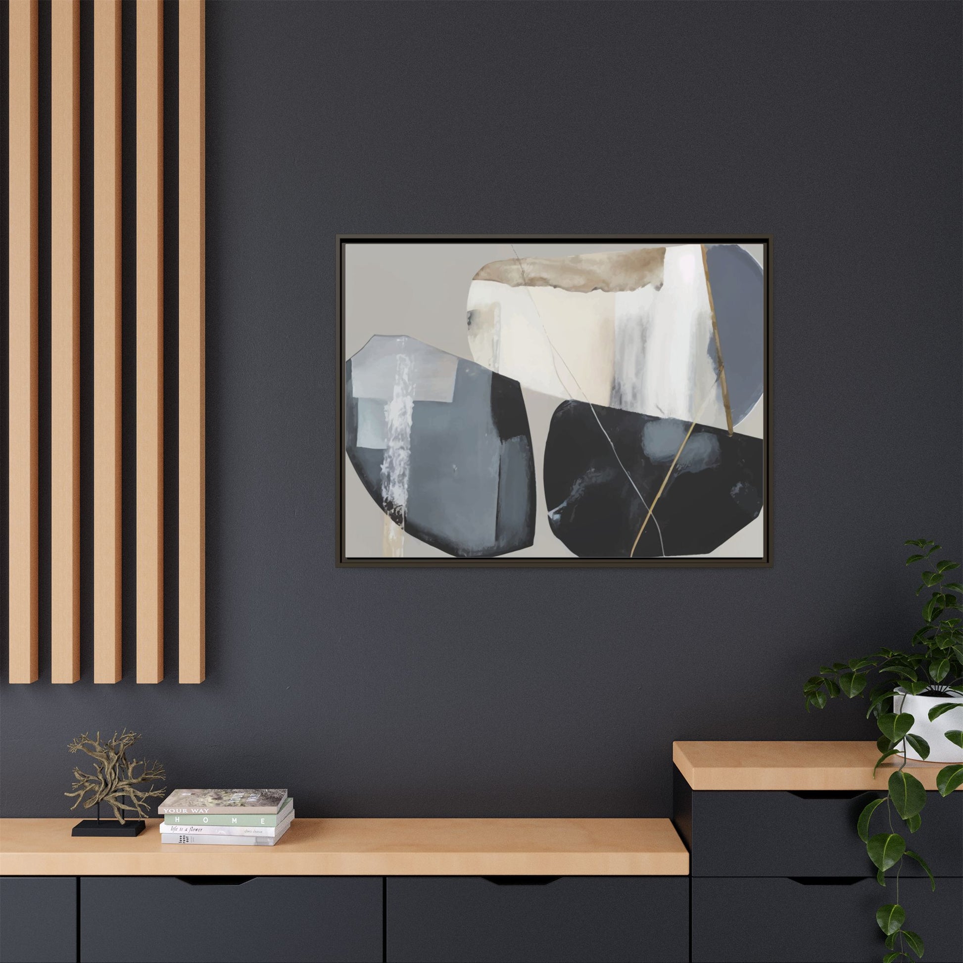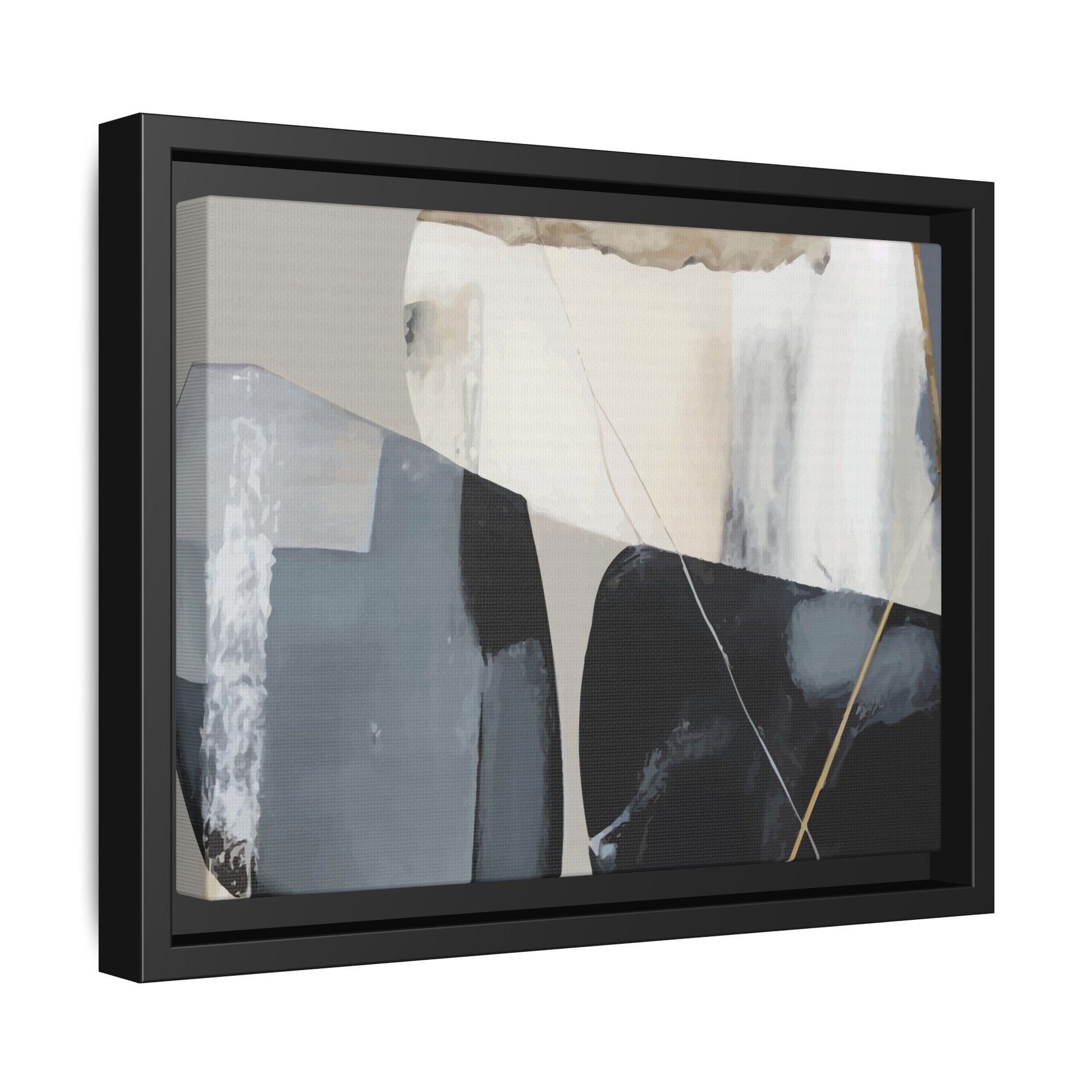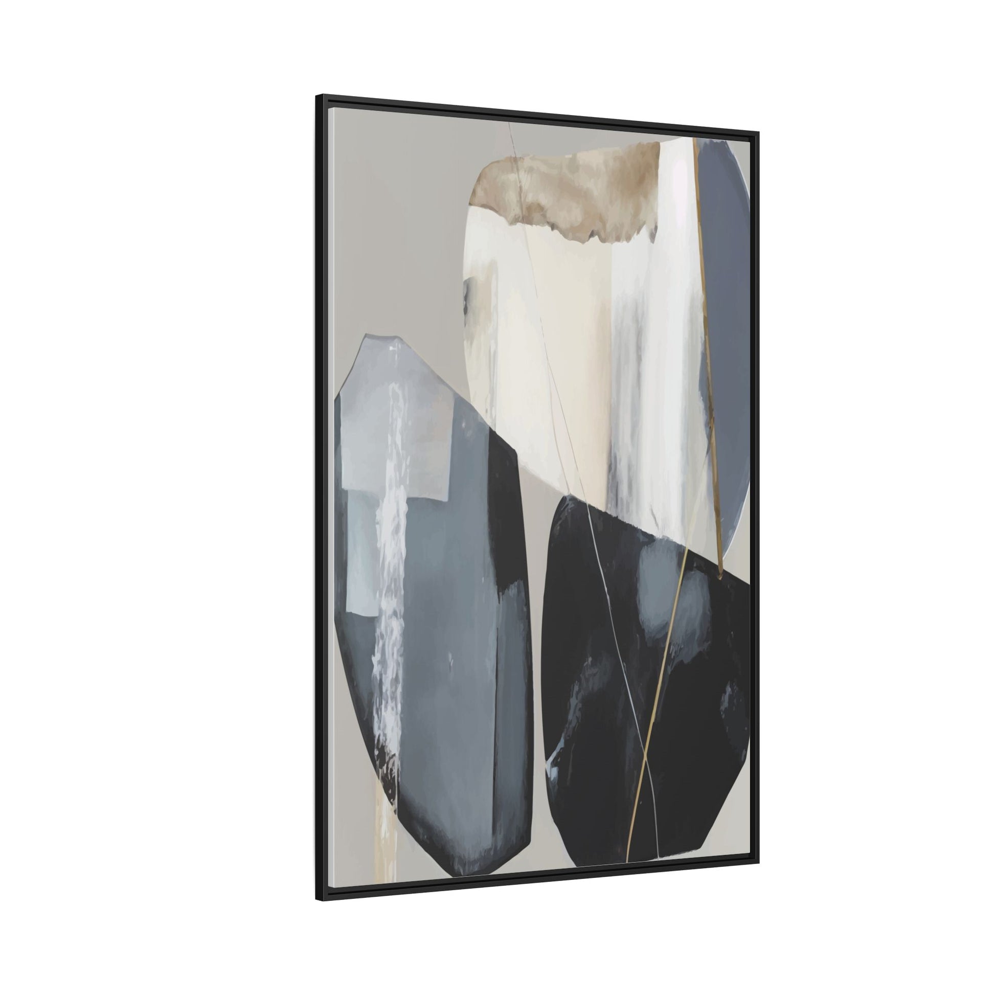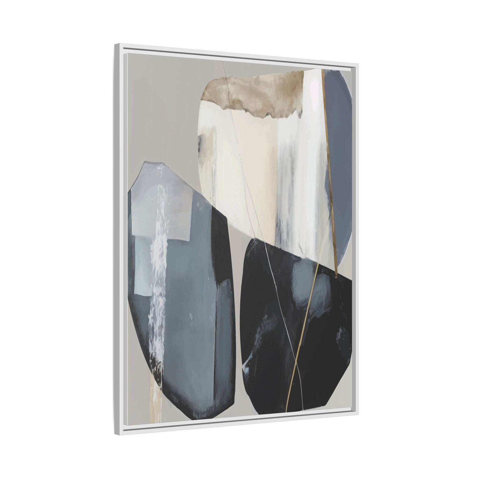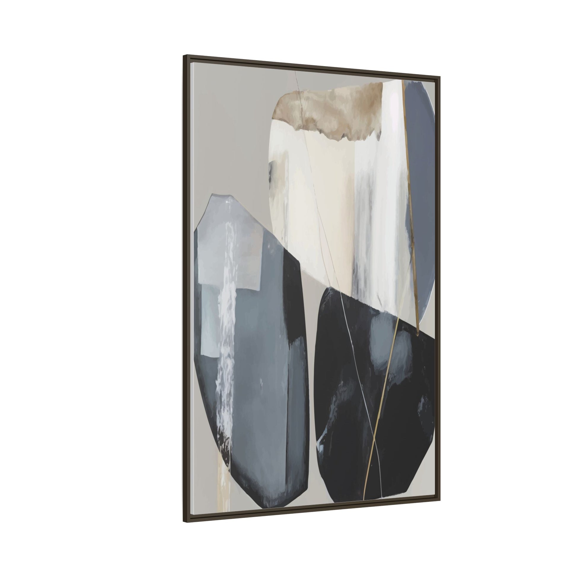 This contemporary abstract painting features a sophisticated composition of geometric shapes in a muted color palette of whites, grays, and blacks. The artwork appears to be divided into curved, irregular sections that overlap and intersect, creating a sense of depth and visual complexity. Soft, blended edges and translucent layers give the piece a fluid, ethereal quality, with hints of beige and silvery tones adding nuanced texture. Thin, precise golden or white lines traverse the canvas, providing linear contrast to the organic, rounded forms. The painting evokes a sense of balance and harmony through its careful arrangement of shapes and deliberate use of negative space, embodying a minimalist yet dynamic aesthetic.