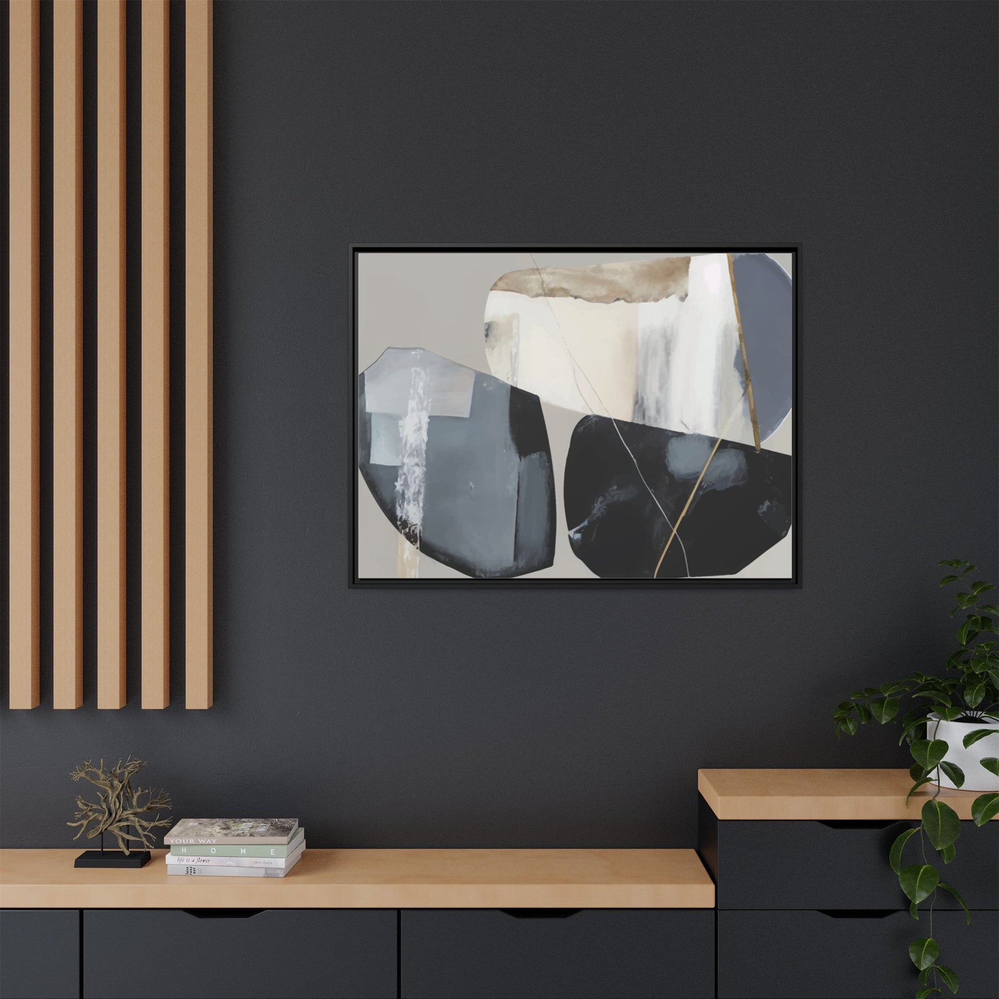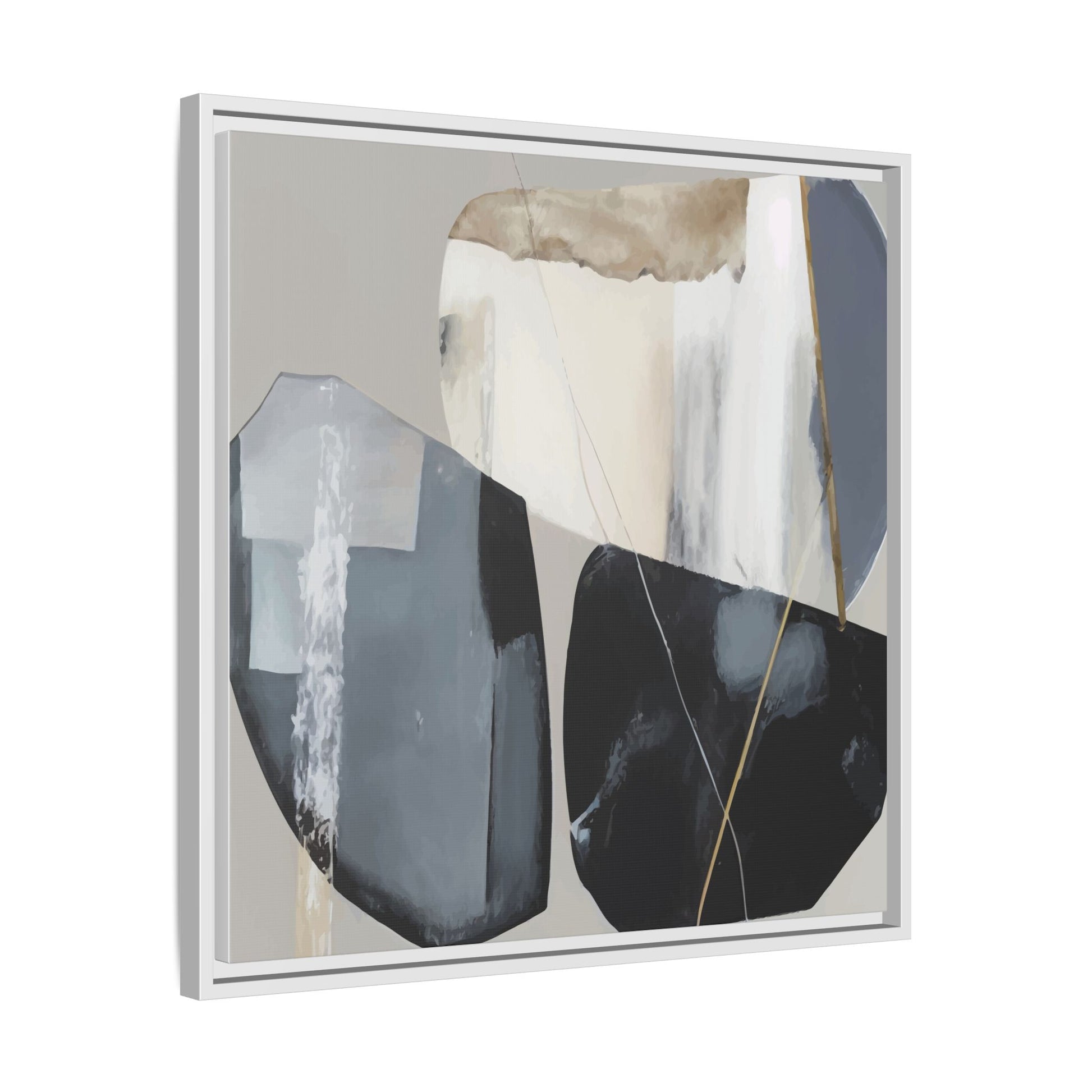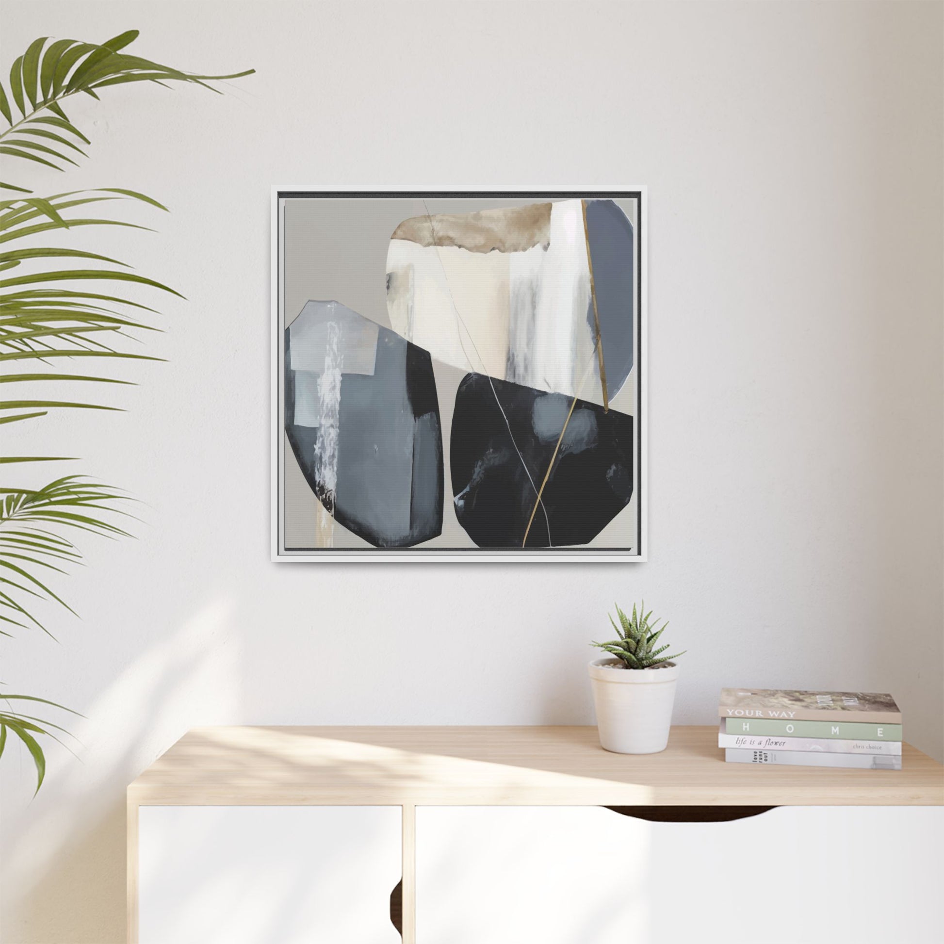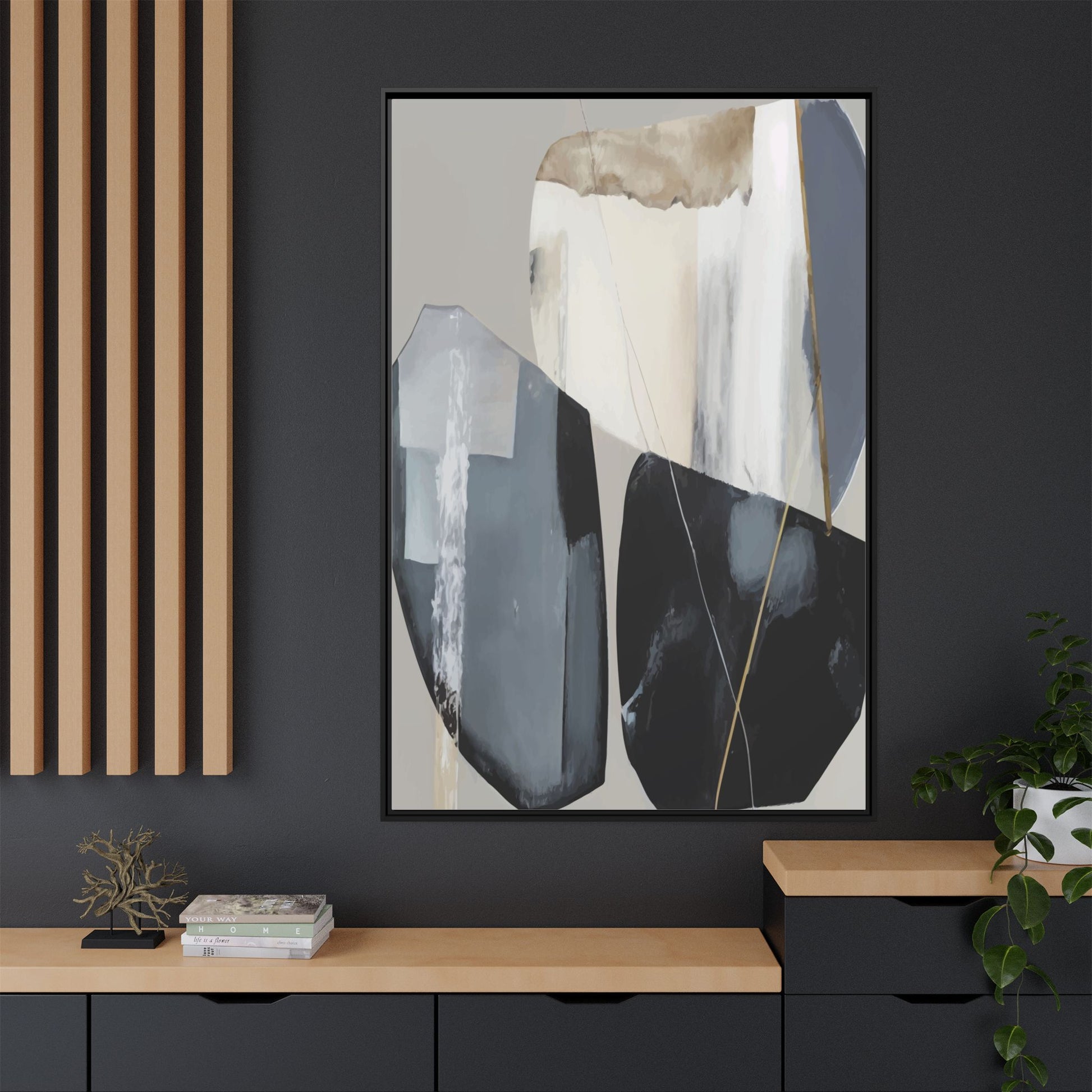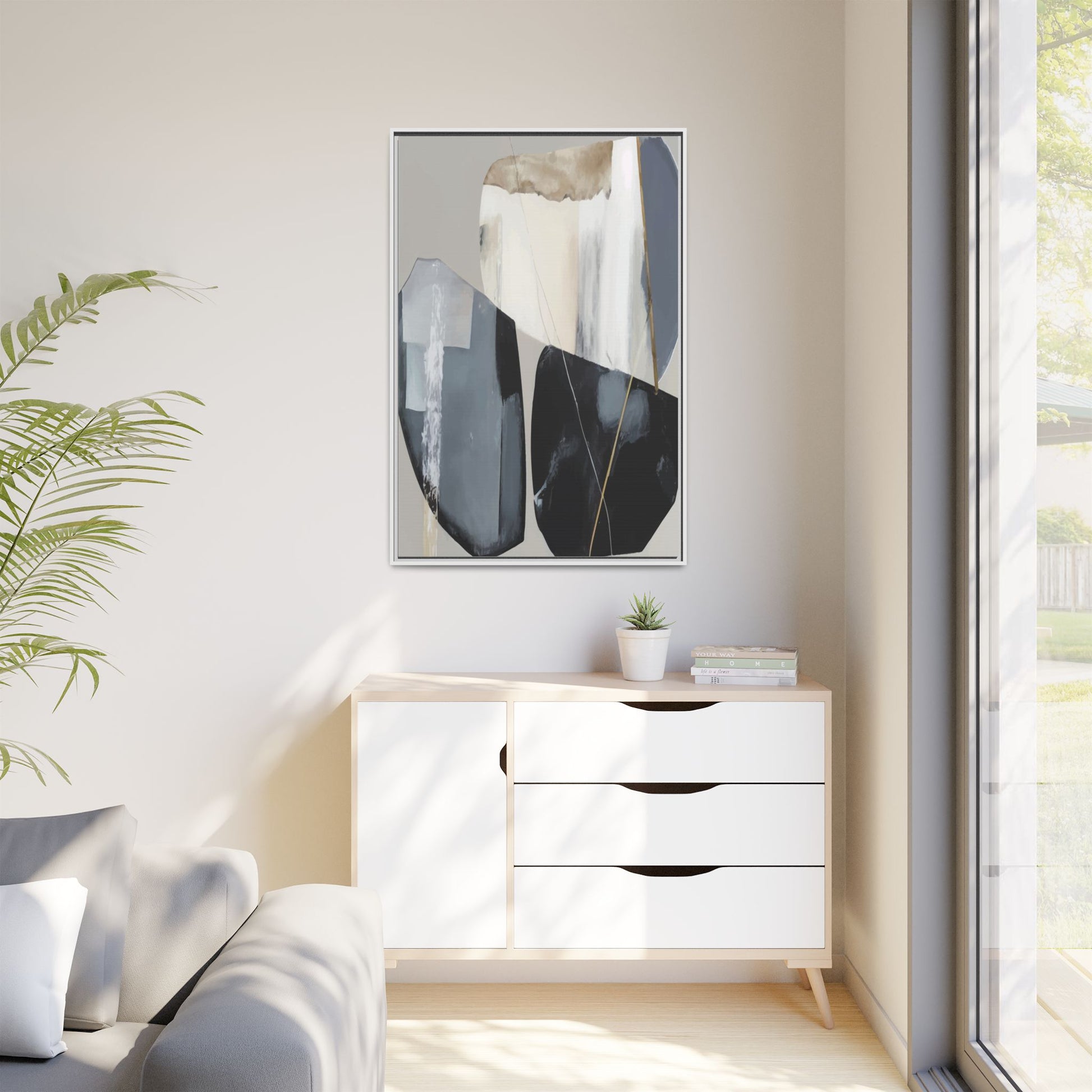 This contemporary abstract painting features a sophisticated composition of geometric shapes in a muted color palette of whites, grays, and blacks. The artwork appears to be divided into curved, irregular sections that overlap and intersect, creating a sense of depth and visual complexity. Soft, blended edges and translucent layers give the piece a fluid, ethereal quality, with hints of beige and silvery tones adding nuanced texture. Thin, precise golden or white lines traverse the canvas, providing linear contrast to the organic, rounded forms. The painting evokes a sense of balance and harmony through its careful arrangement of shapes and deliberate use of negative space, embodying a minimalist yet dynamic aesthetic.