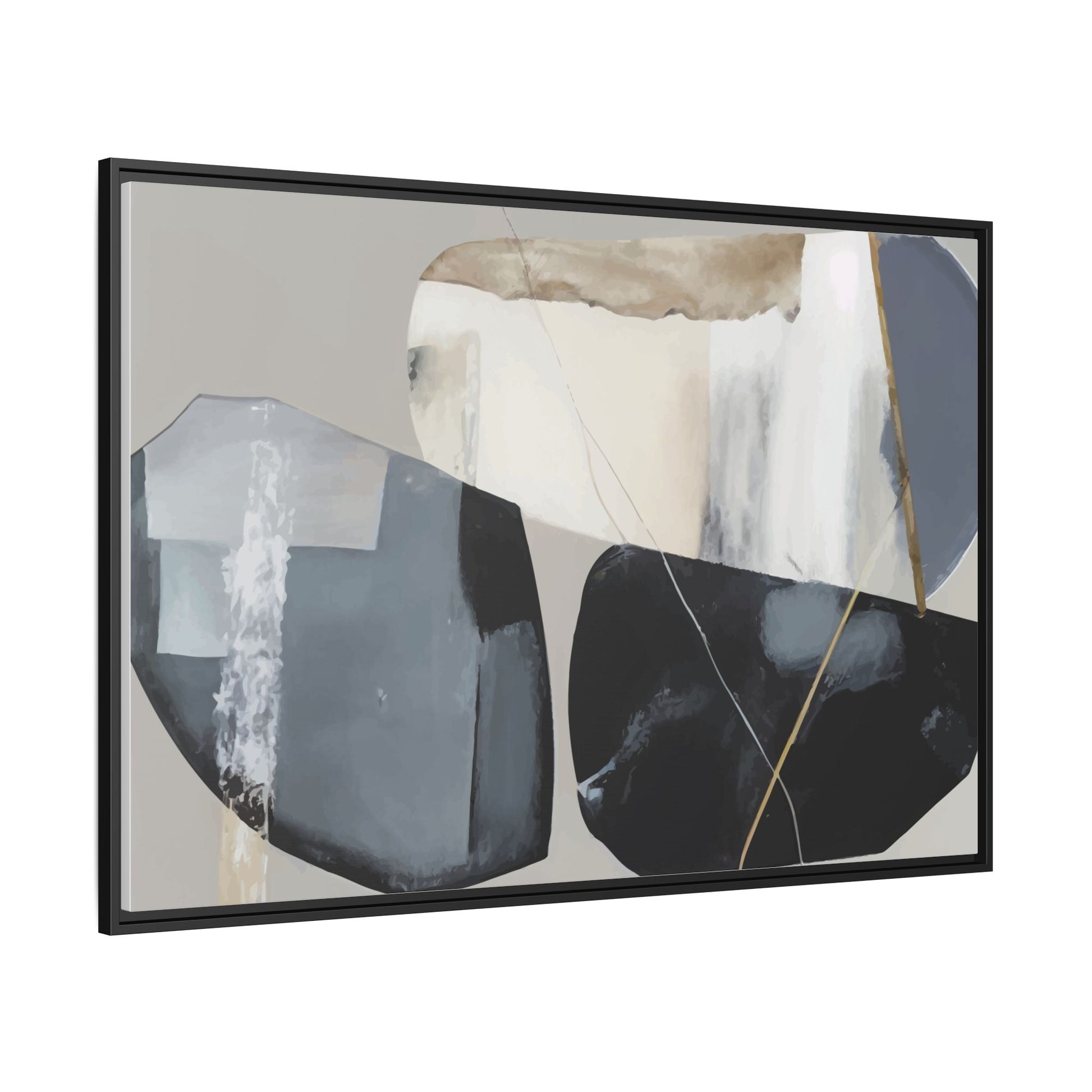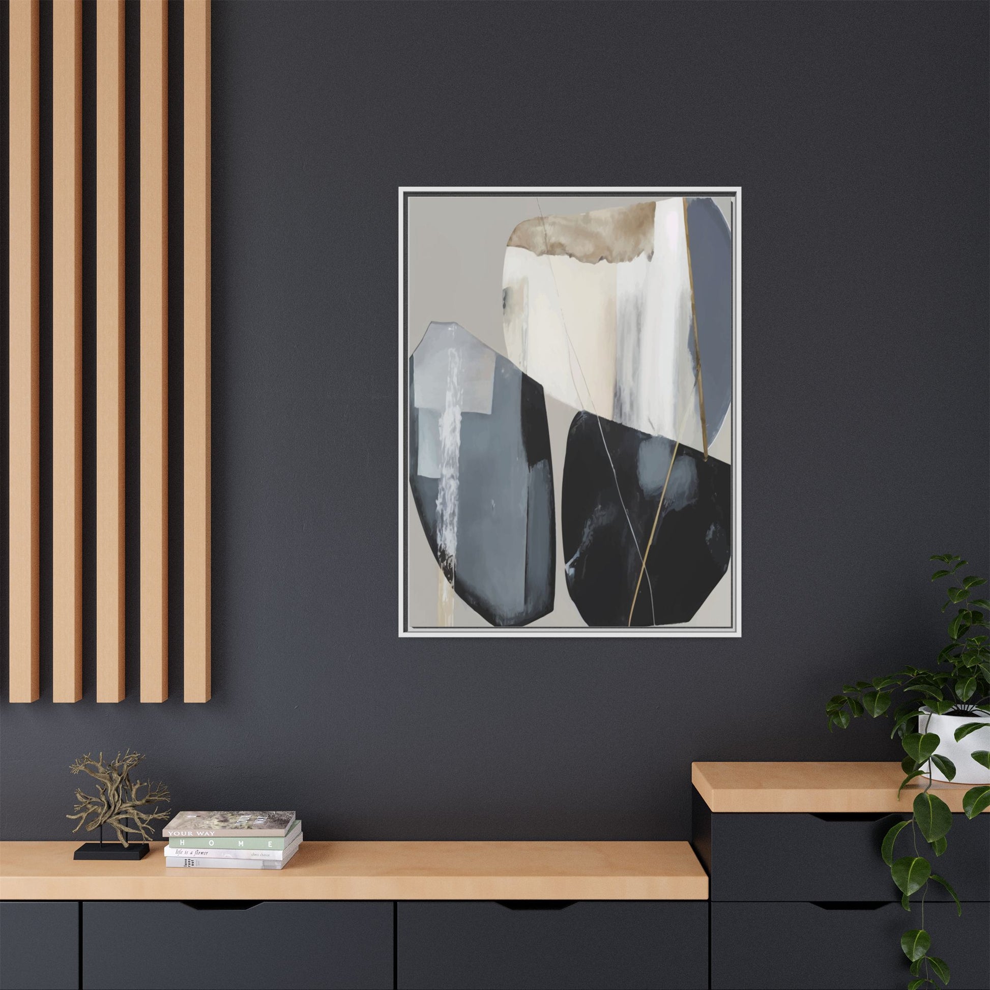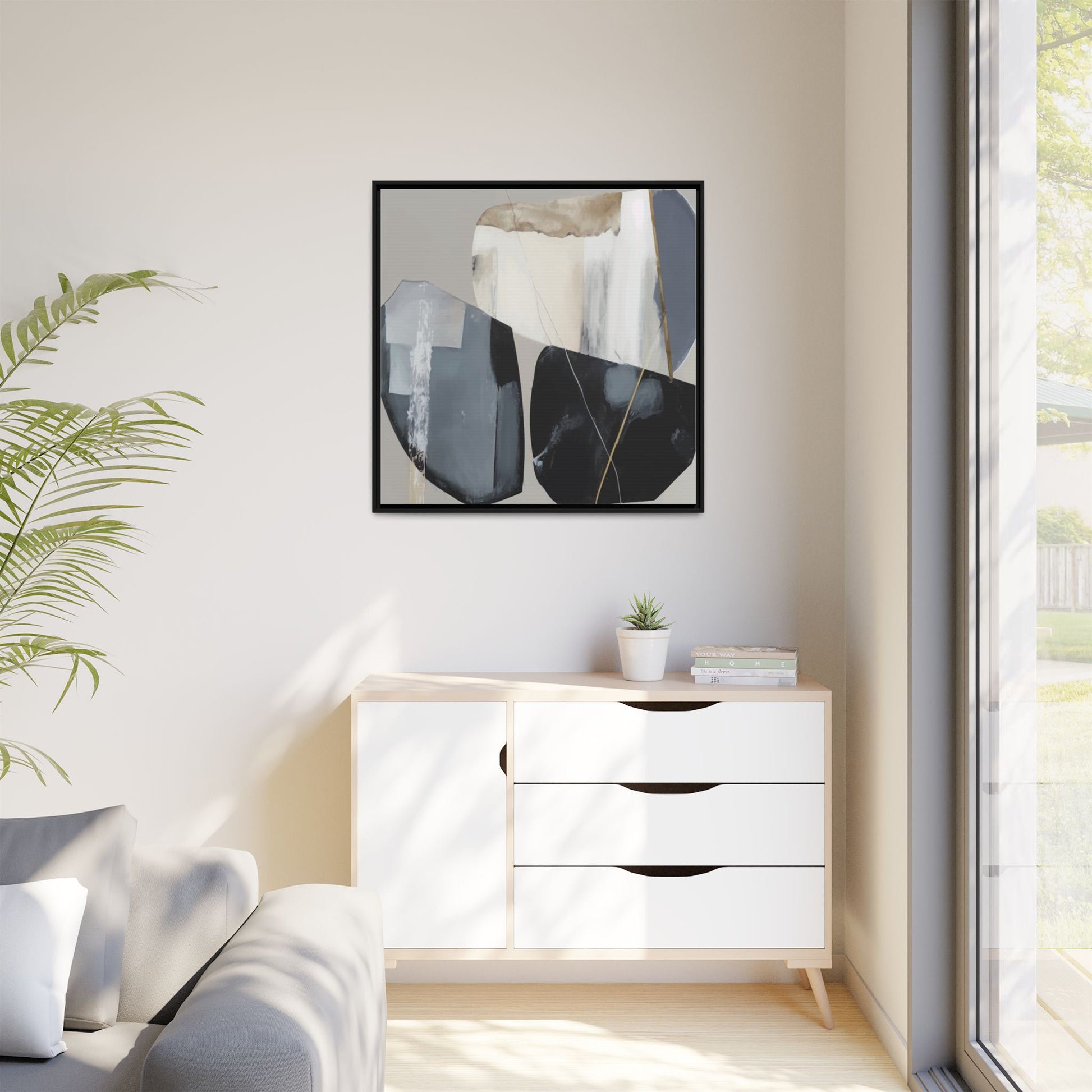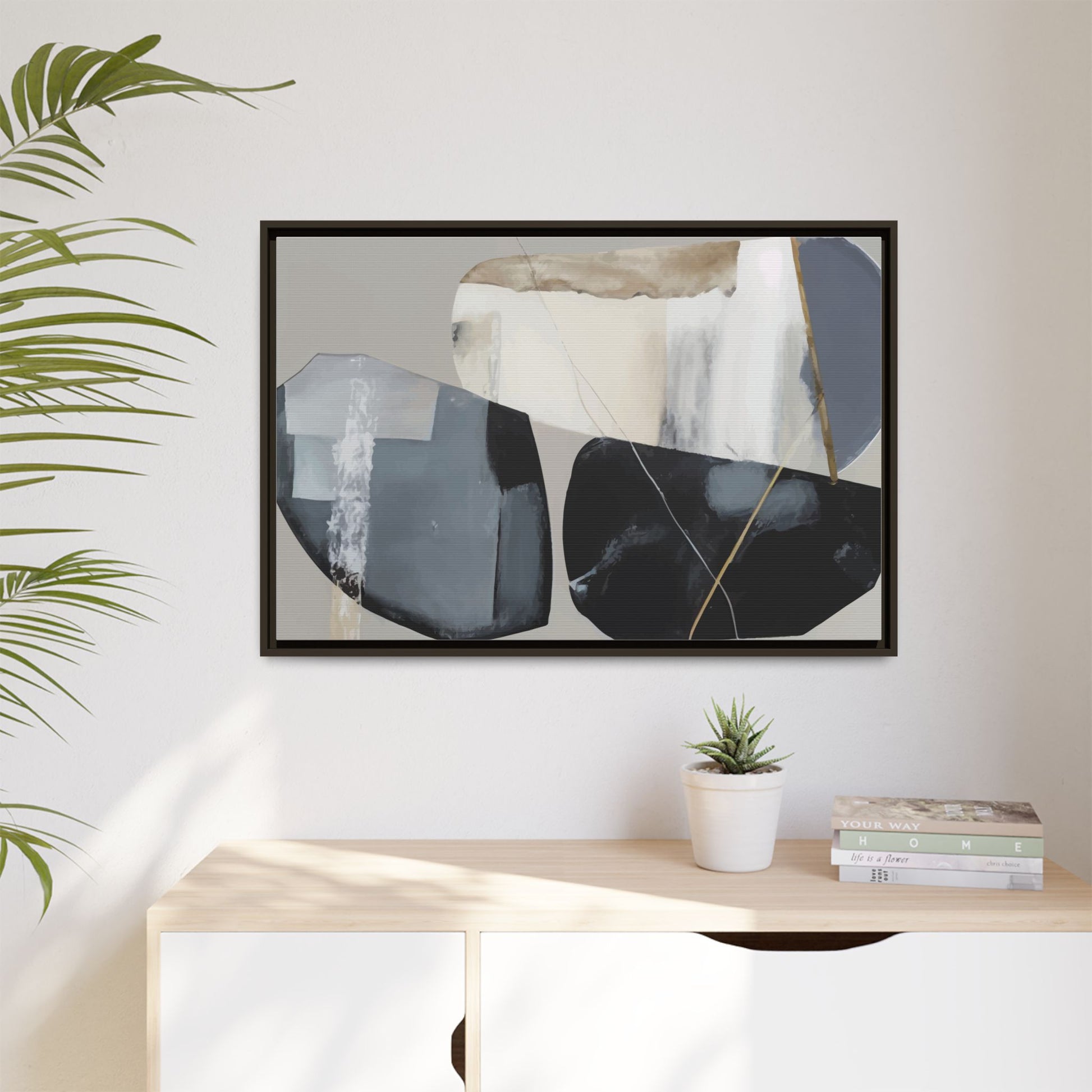 This contemporary abstract painting features a sophisticated composition of geometric shapes in a muted color palette of whites, grays, and blacks. The artwork appears to be divided into curved, irregular sections that overlap and intersect, creating a sense of depth and visual complexity. Soft, blended edges and translucent layers give the piece a fluid, ethereal quality, with hints of beige and silvery tones adding nuanced texture. Thin, precise golden or white lines traverse the canvas, providing linear contrast to the organic, rounded forms. The painting evokes a sense of balance and harmony through its careful arrangement of shapes and deliberate use of negative space, embodying a minimalist yet dynamic aesthetic.