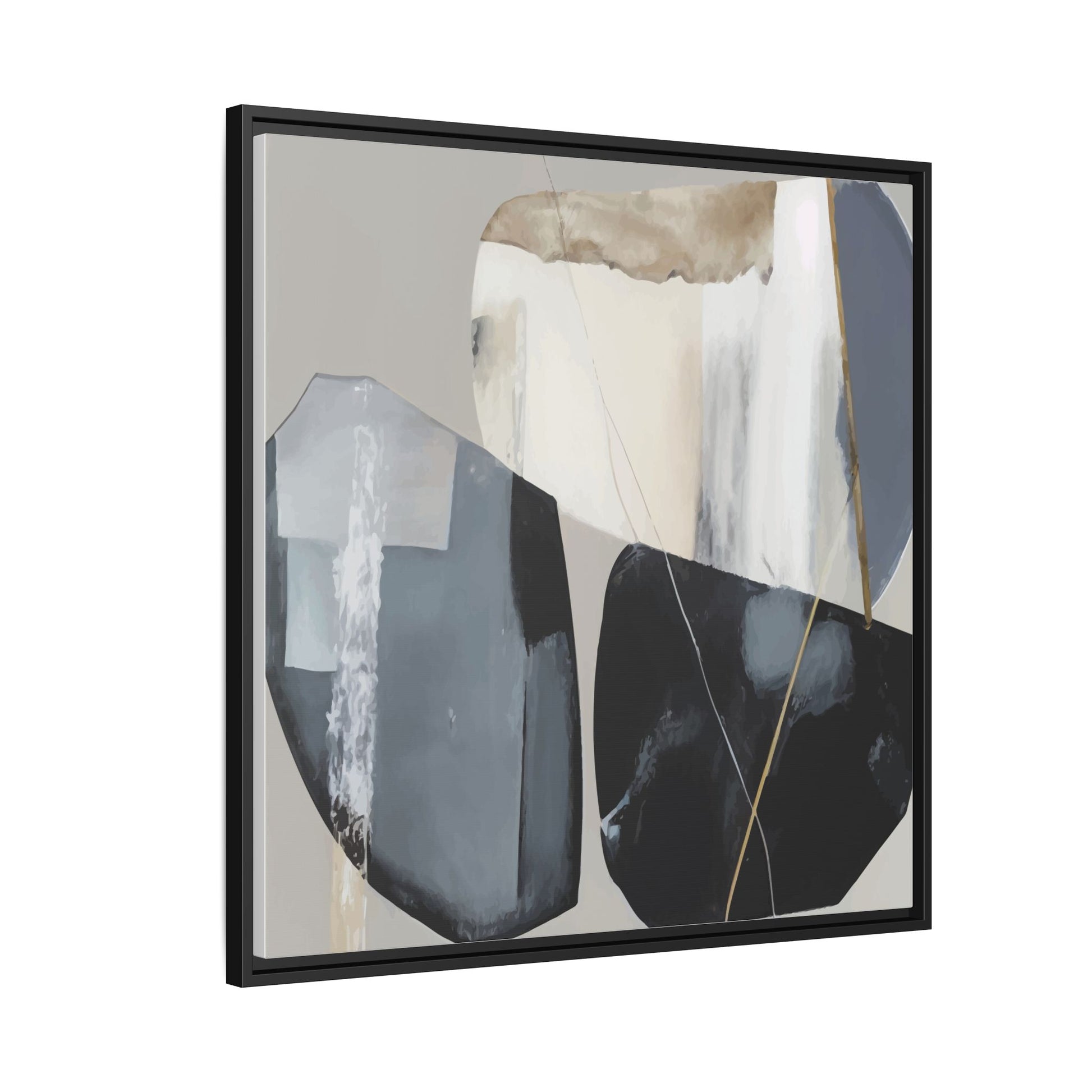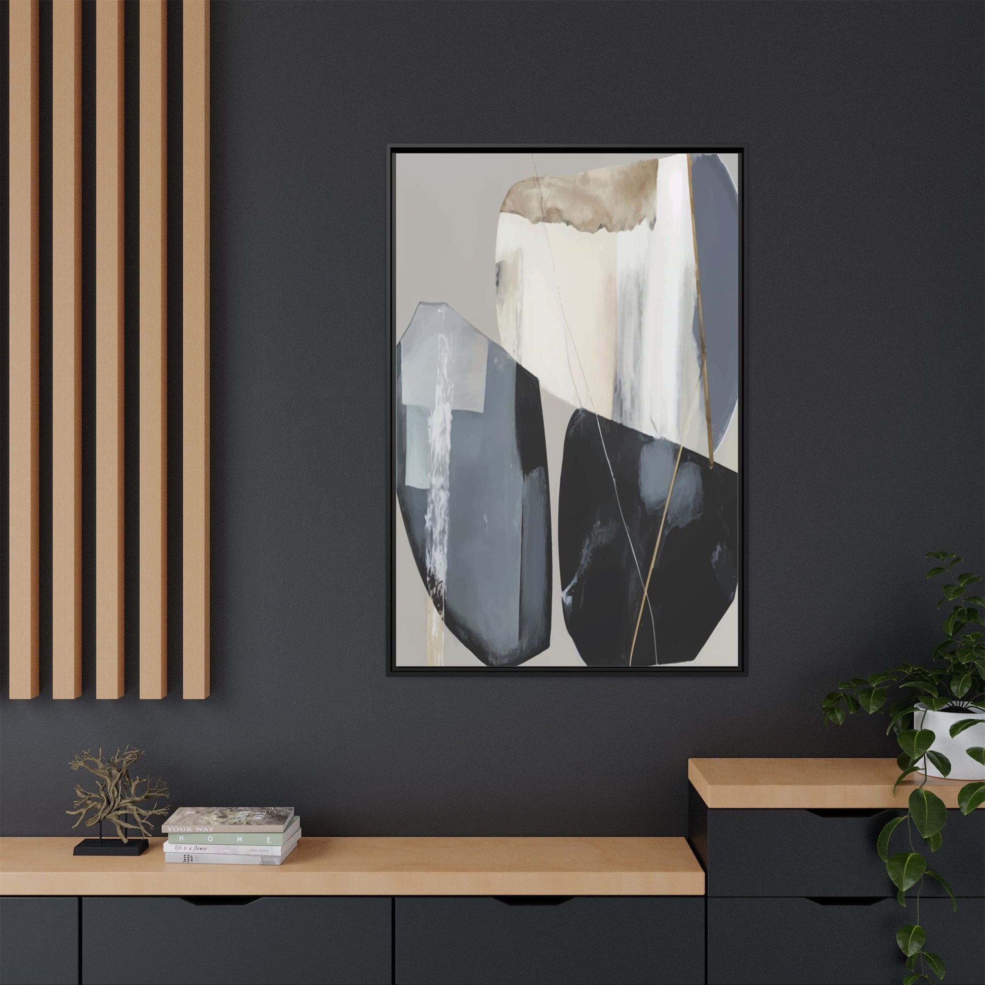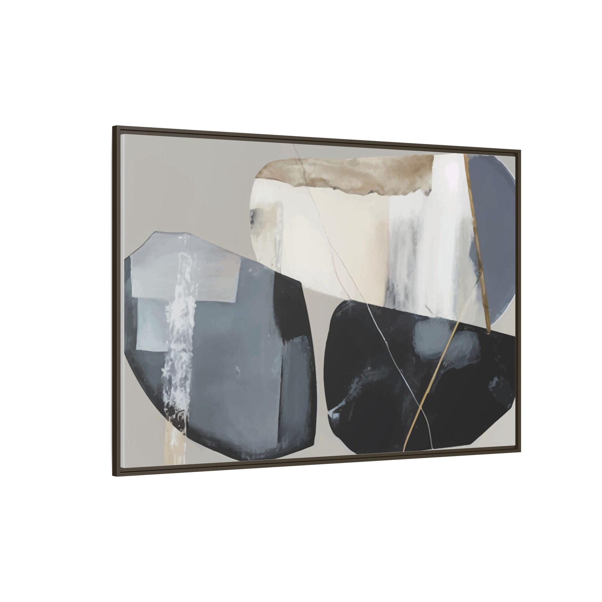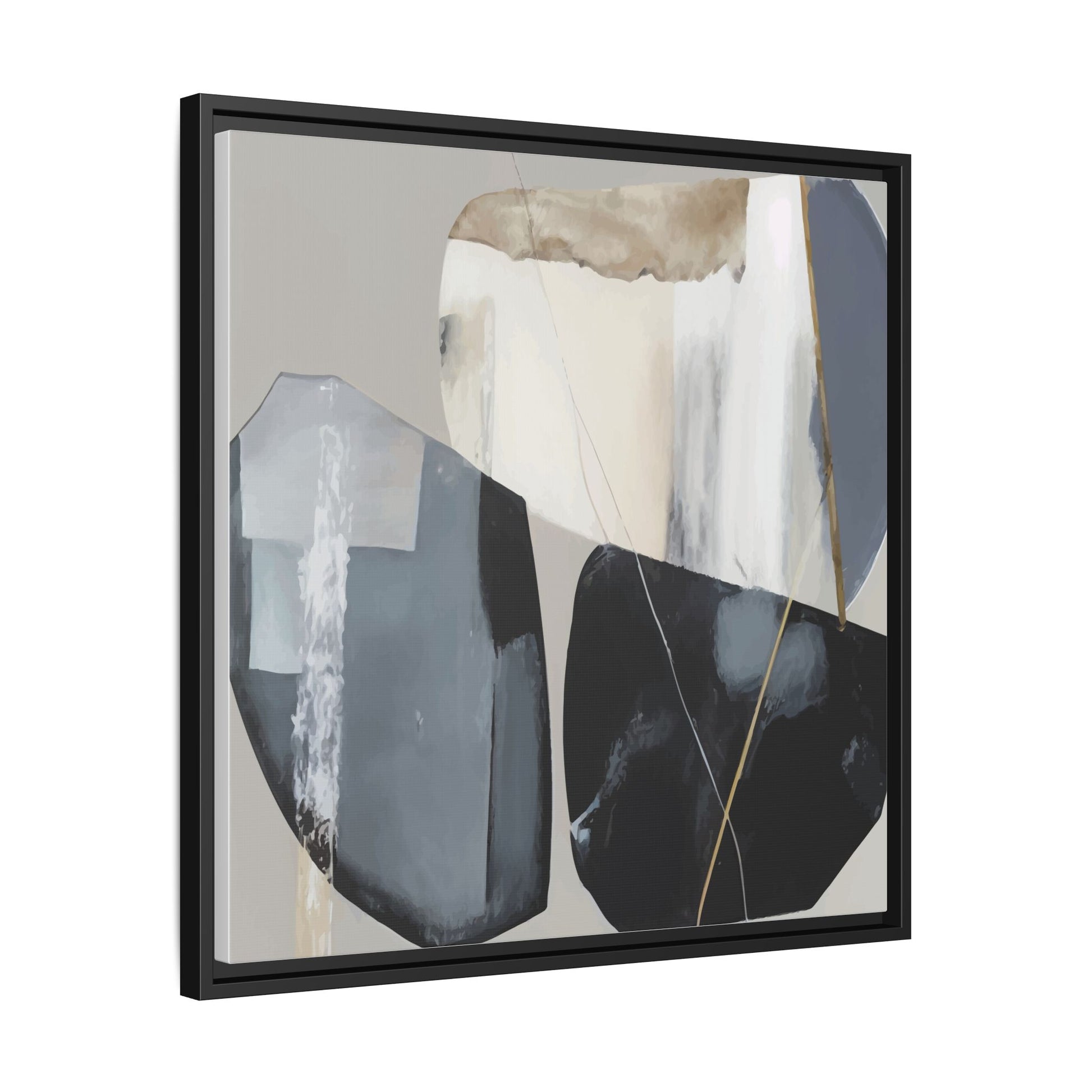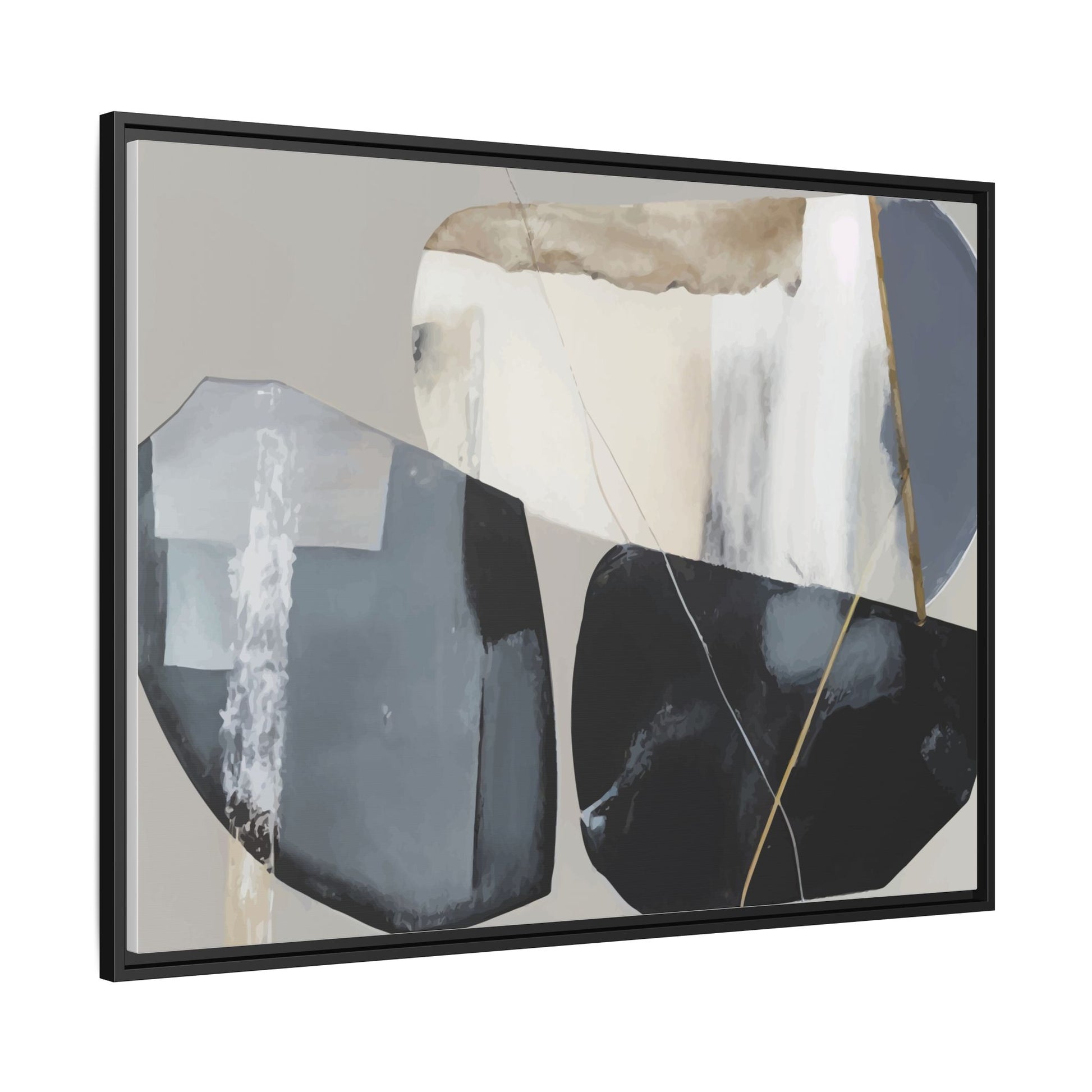 This contemporary abstract painting features a sophisticated composition of geometric shapes in a muted color palette of whites, grays, and blacks. The artwork appears to be divided into curved, irregular sections that overlap and intersect, creating a sense of depth and visual complexity. Soft, blended edges and translucent layers give the piece a fluid, ethereal quality, with hints of beige and silvery tones adding nuanced texture. Thin, precise golden or white lines traverse the canvas, providing linear contrast to the organic, rounded forms. The painting evokes a sense of balance and harmony through its careful arrangement of shapes and deliberate use of negative space, embodying a minimalist yet dynamic aesthetic.