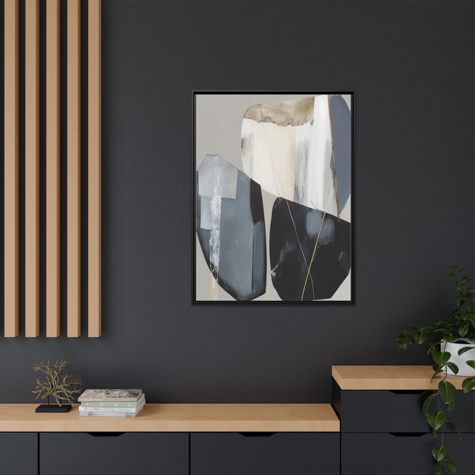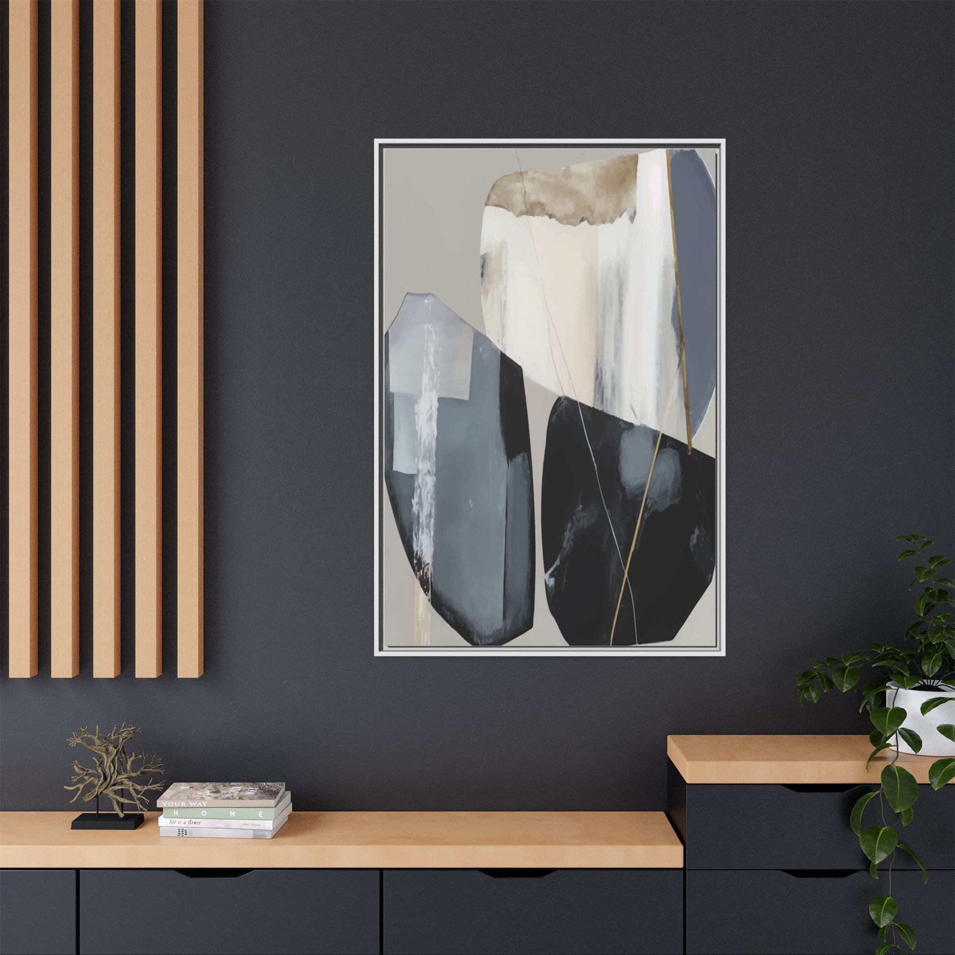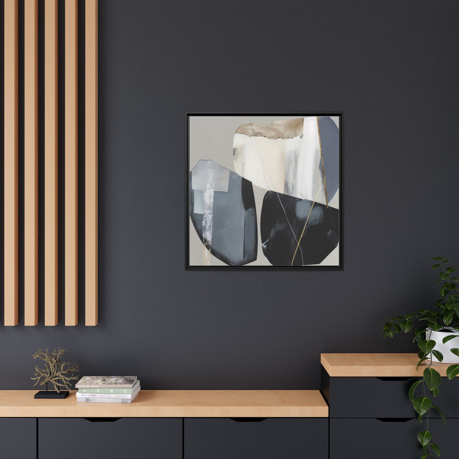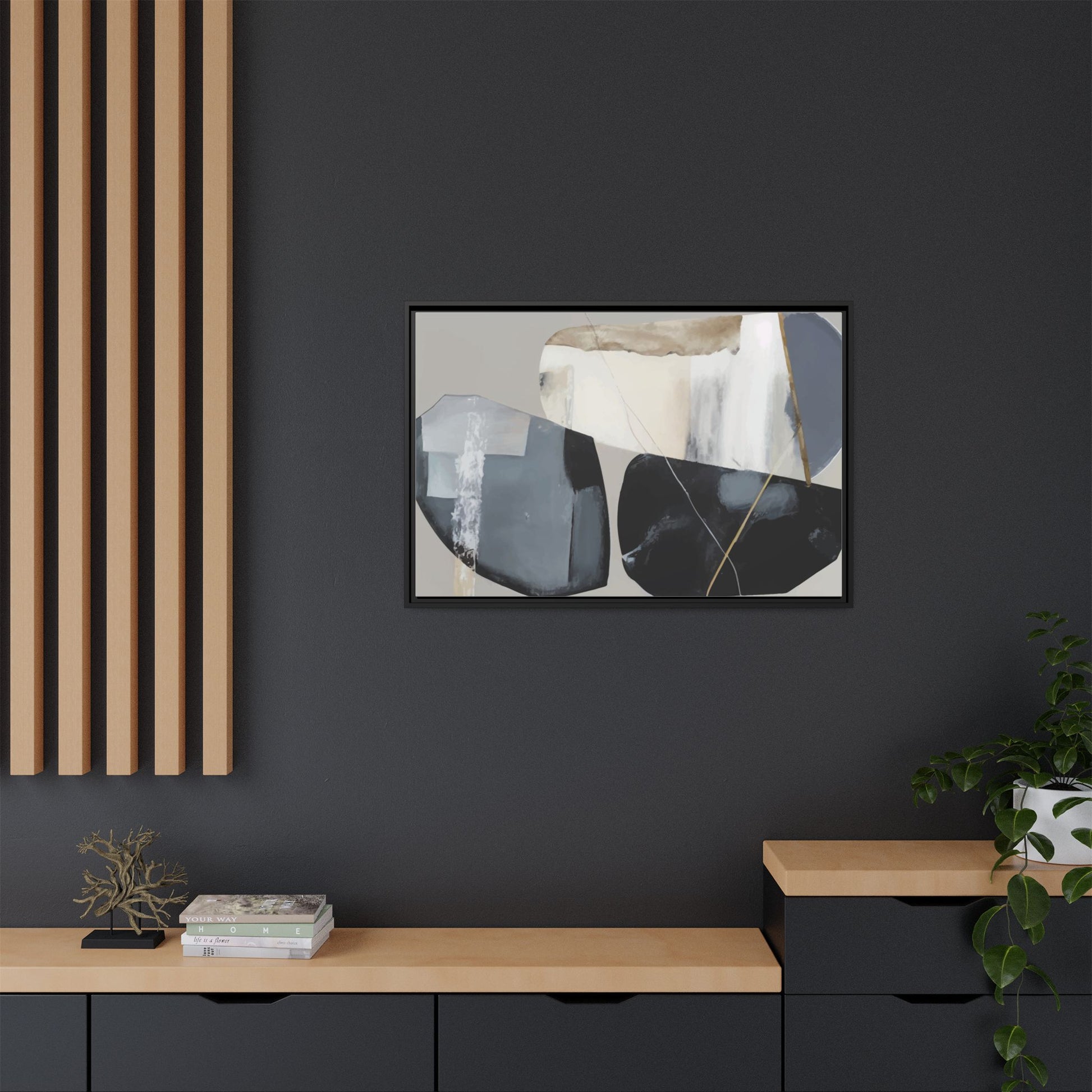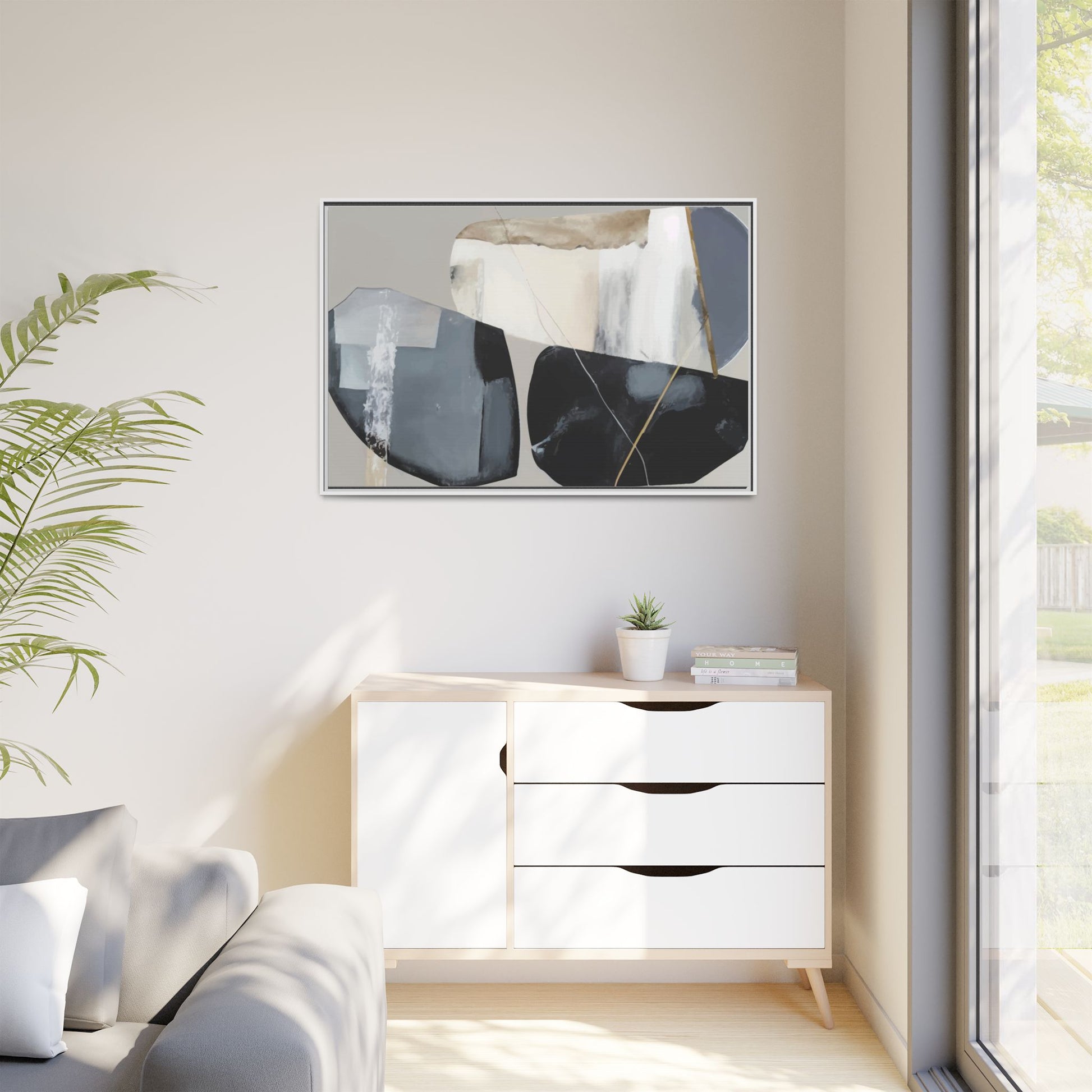 This contemporary abstract painting features a sophisticated composition of geometric shapes in a muted color palette of whites, grays, and blacks. The artwork appears to be divided into curved, irregular sections that overlap and intersect, creating a sense of depth and visual complexity. Soft, blended edges and translucent layers give the piece a fluid, ethereal quality, with hints of beige and silvery tones adding nuanced texture. Thin, precise golden or white lines traverse the canvas, providing linear contrast to the organic, rounded forms. The painting evokes a sense of balance and harmony through its careful arrangement of shapes and deliberate use of negative space, embodying a minimalist yet dynamic aesthetic.