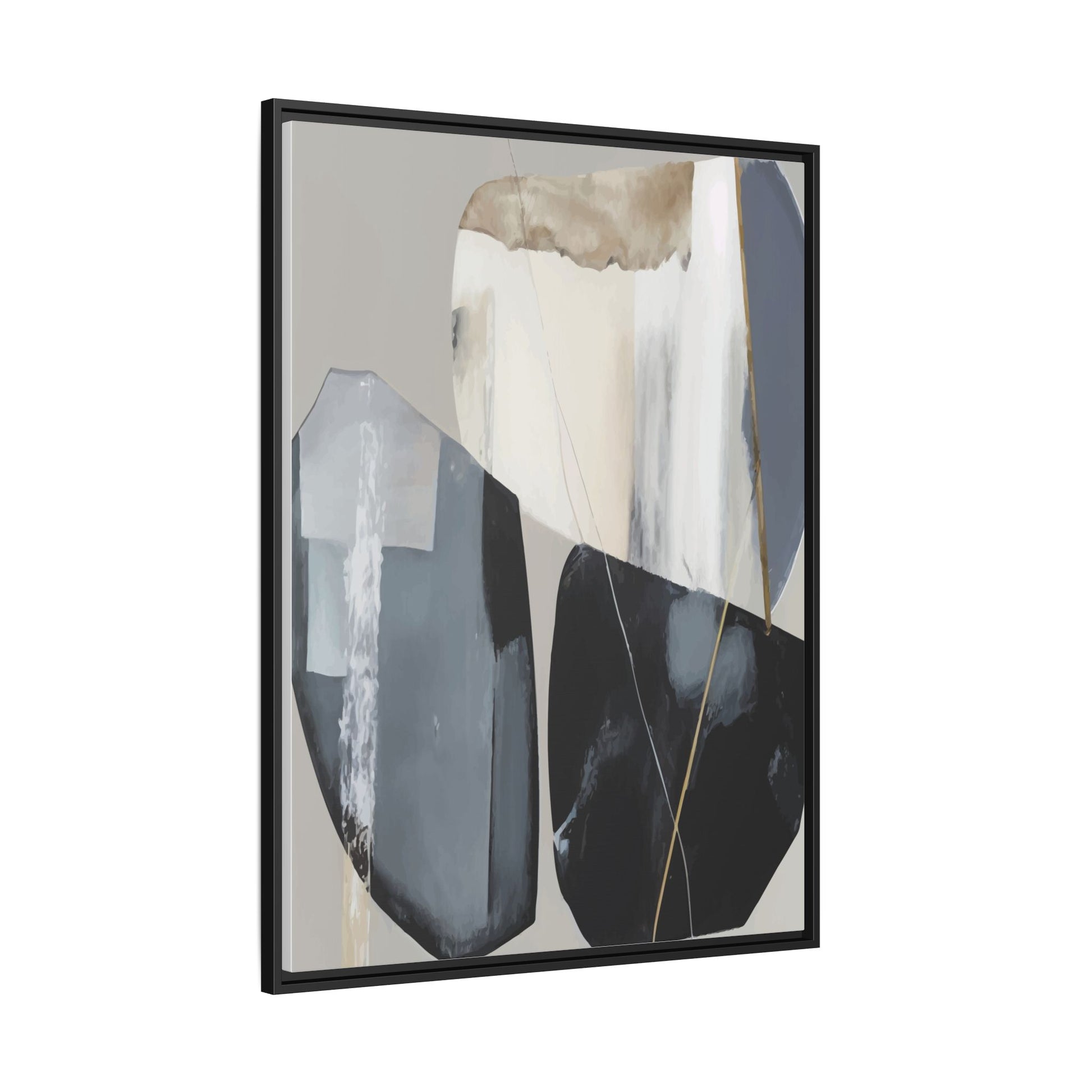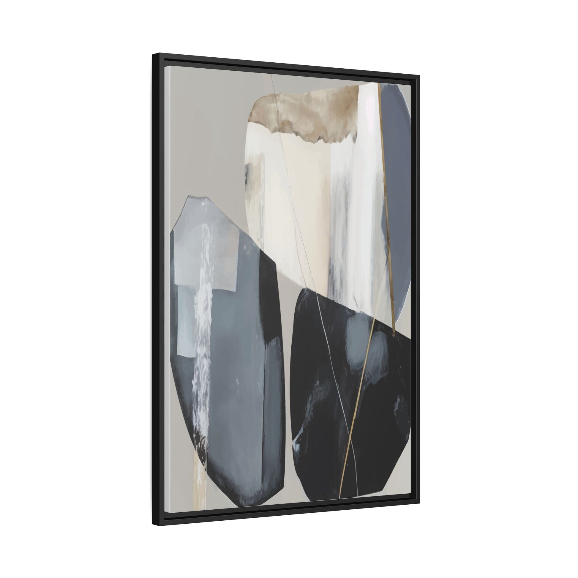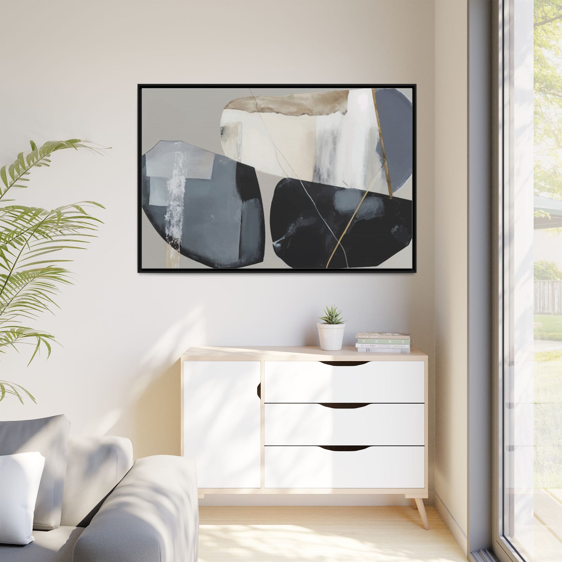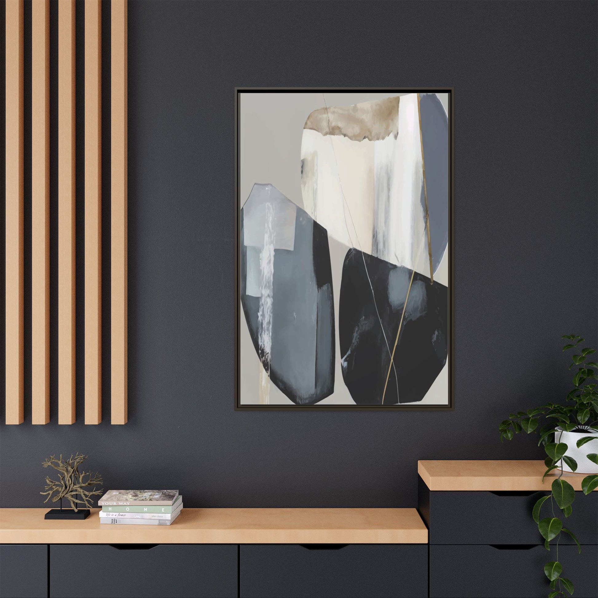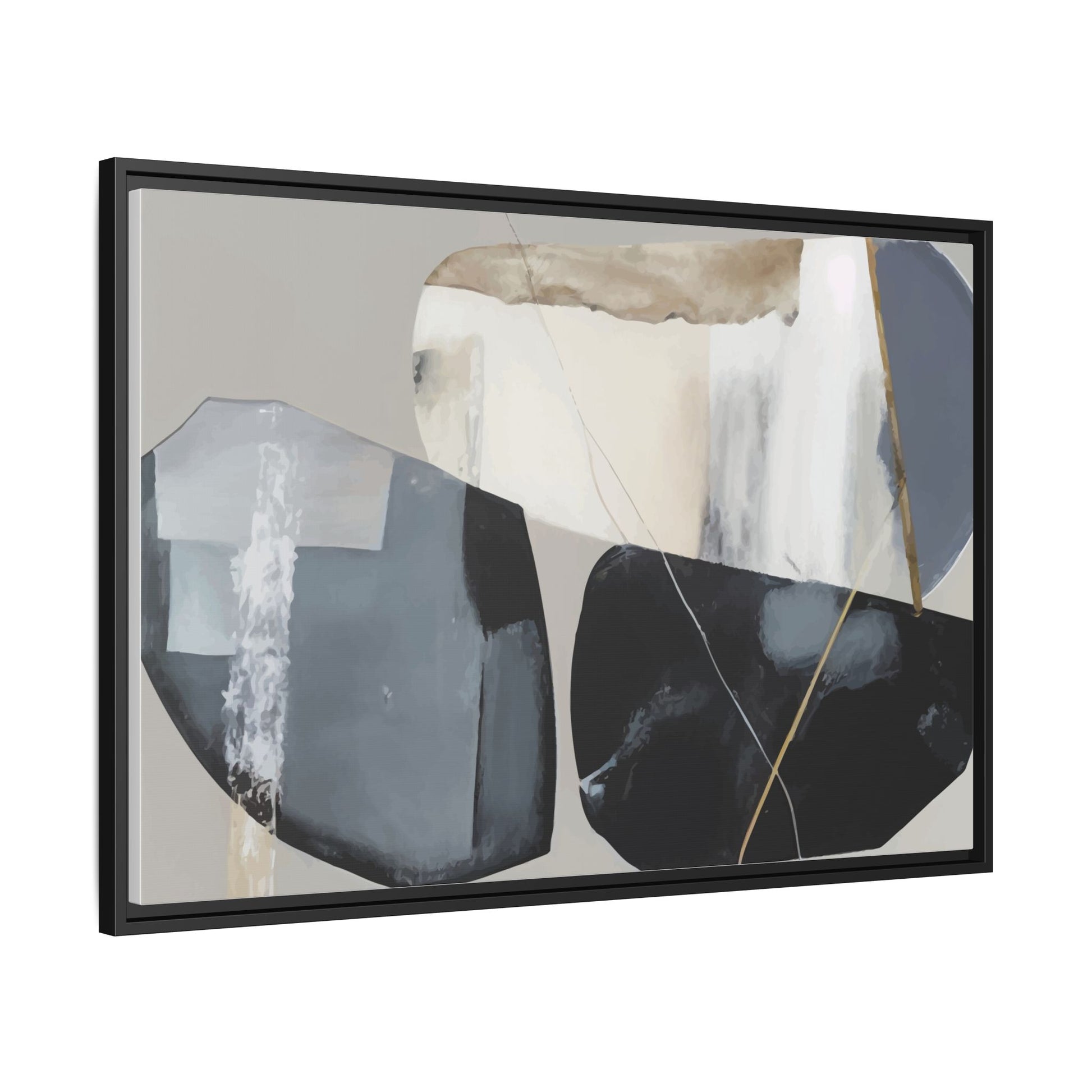 This contemporary abstract painting features a sophisticated composition of geometric shapes in a muted color palette of whites, grays, and blacks. The artwork appears to be divided into curved, irregular sections that overlap and intersect, creating a sense of depth and visual complexity. Soft, blended edges and translucent layers give the piece a fluid, ethereal quality, with hints of beige and silvery tones adding nuanced texture. Thin, precise golden or white lines traverse the canvas, providing linear contrast to the organic, rounded forms. The painting evokes a sense of balance and harmony through its careful arrangement of shapes and deliberate use of negative space, embodying a minimalist yet dynamic aesthetic.