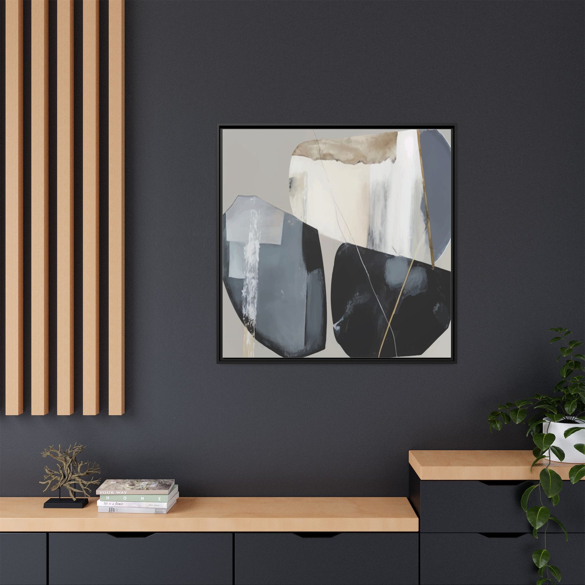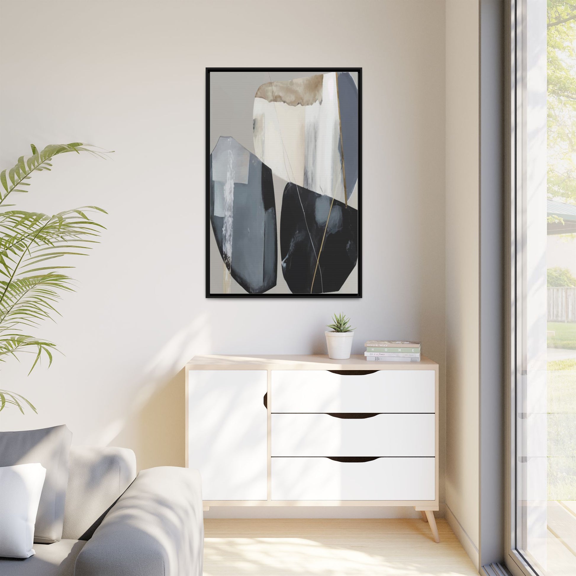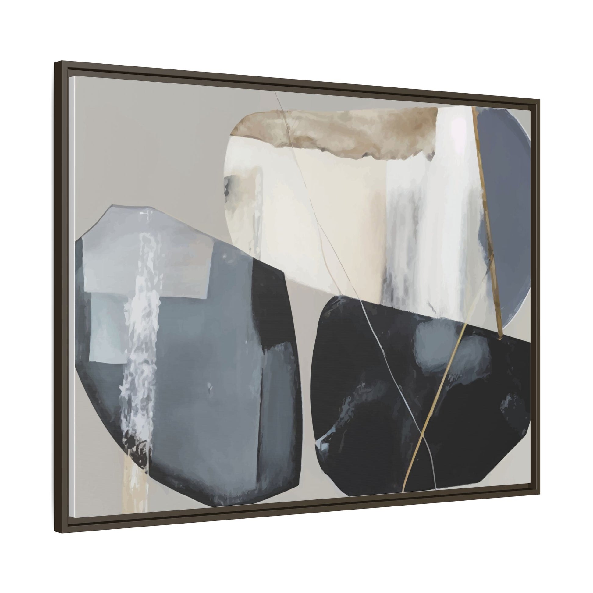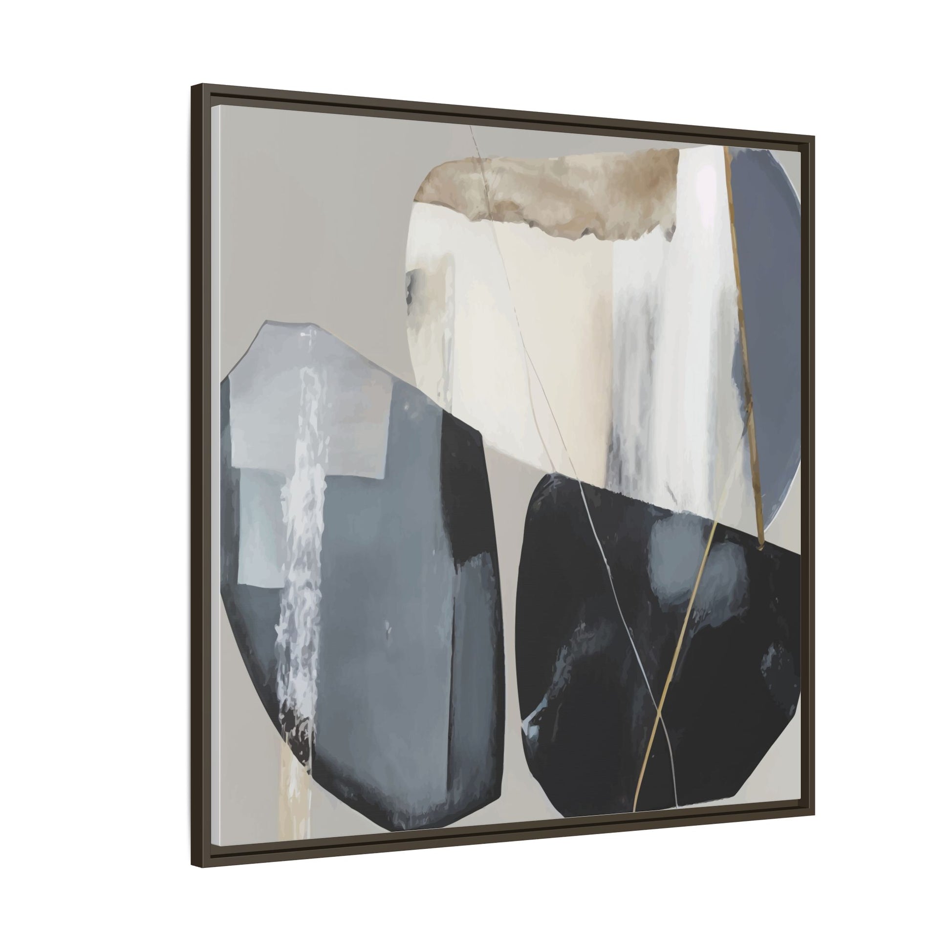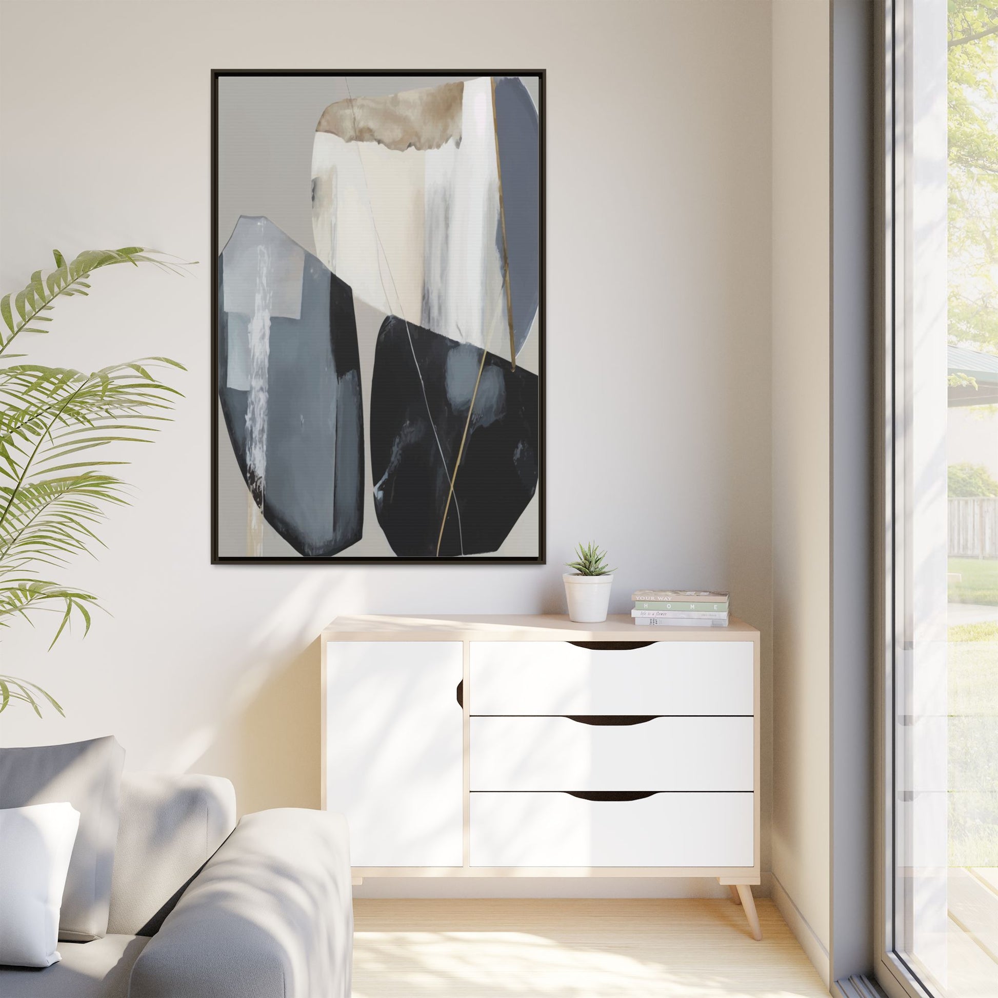 This contemporary abstract painting features a sophisticated composition of geometric shapes in a muted color palette of whites, grays, and blacks. The artwork appears to be divided into curved, irregular sections that overlap and intersect, creating a sense of depth and visual complexity. Soft, blended edges and translucent layers give the piece a fluid, ethereal quality, with hints of beige and silvery tones adding nuanced texture. Thin, precise golden or white lines traverse the canvas, providing linear contrast to the organic, rounded forms. The painting evokes a sense of balance and harmony through its careful arrangement of shapes and deliberate use of negative space, embodying a minimalist yet dynamic aesthetic.