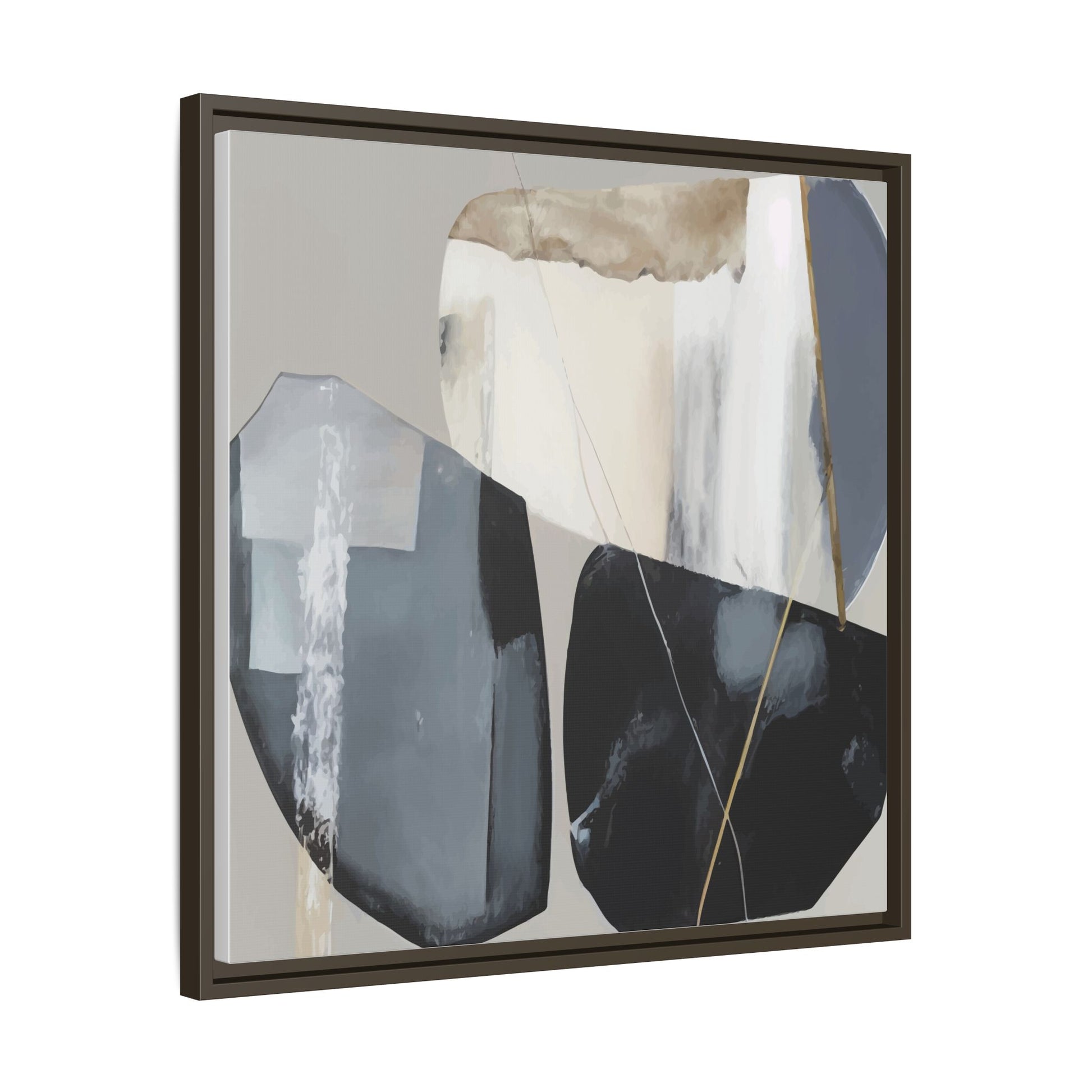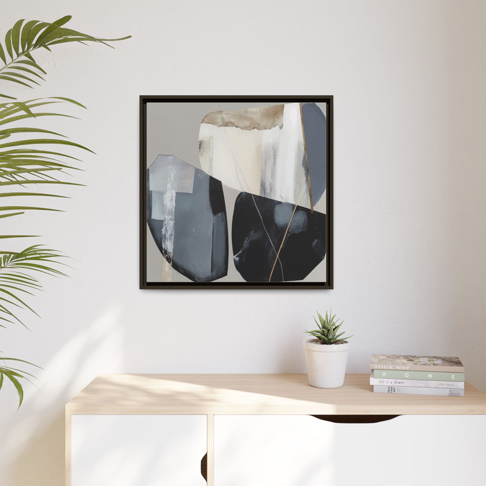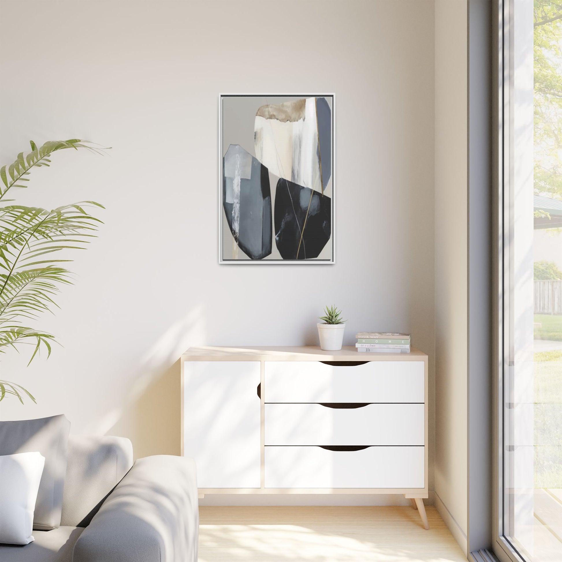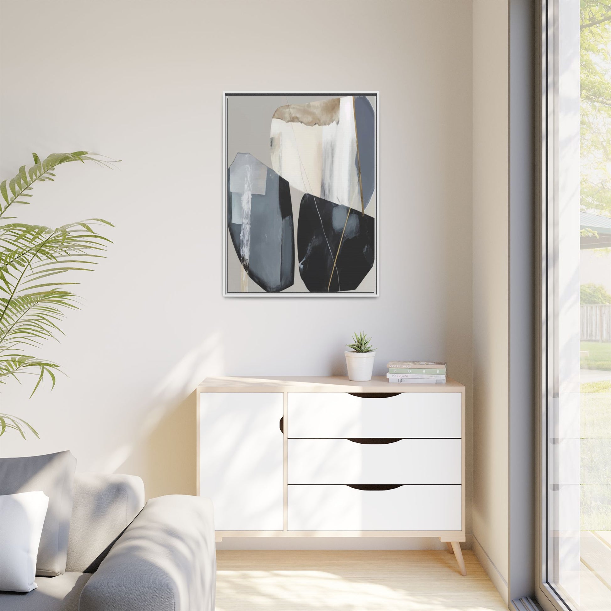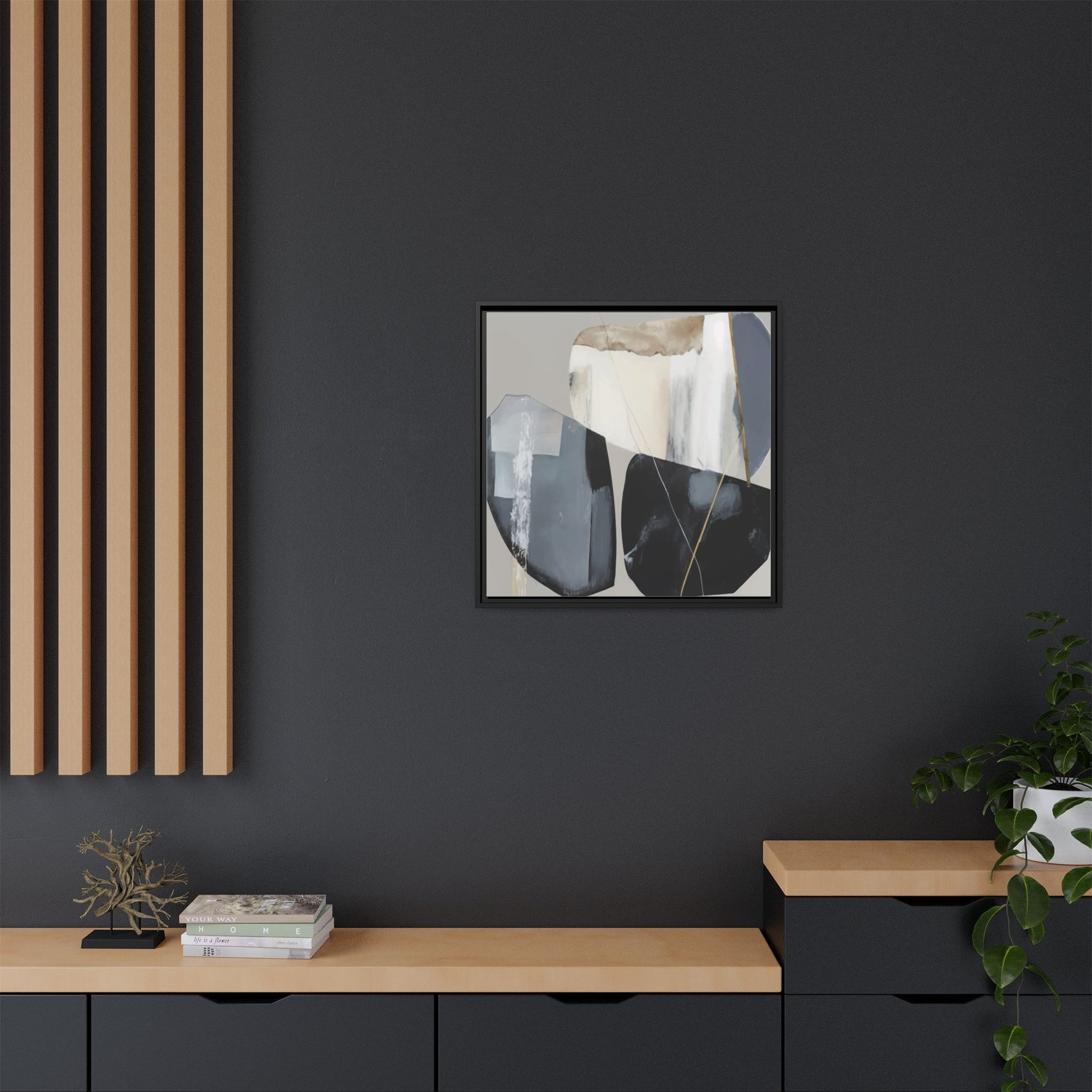 This contemporary abstract painting features a sophisticated composition of geometric shapes in a muted color palette of whites, grays, and blacks. The artwork appears to be divided into curved, irregular sections that overlap and intersect, creating a sense of depth and visual complexity. Soft, blended edges and translucent layers give the piece a fluid, ethereal quality, with hints of beige and silvery tones adding nuanced texture. Thin, precise golden or white lines traverse the canvas, providing linear contrast to the organic, rounded forms. The painting evokes a sense of balance and harmony through its careful arrangement of shapes and deliberate use of negative space, embodying a minimalist yet dynamic aesthetic.