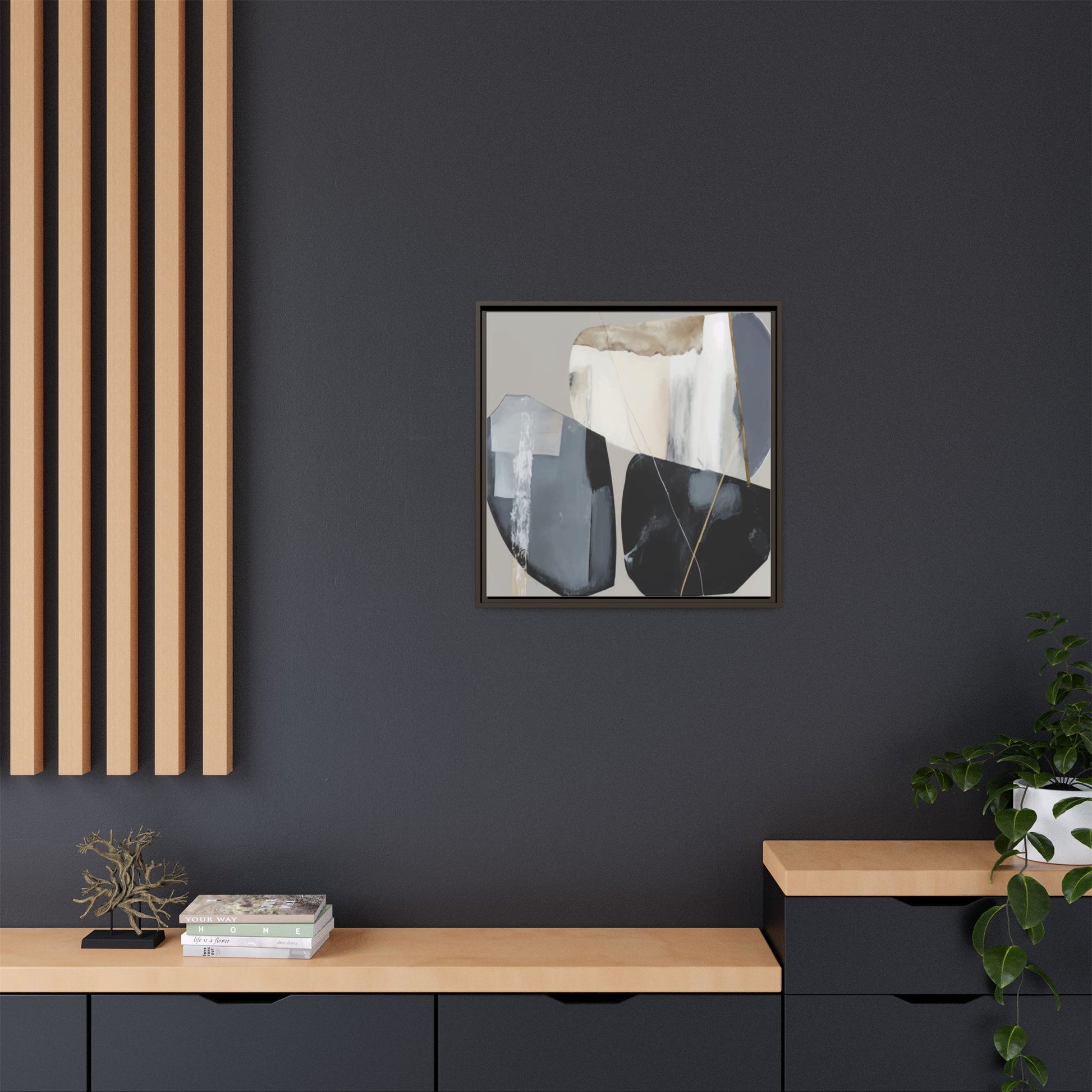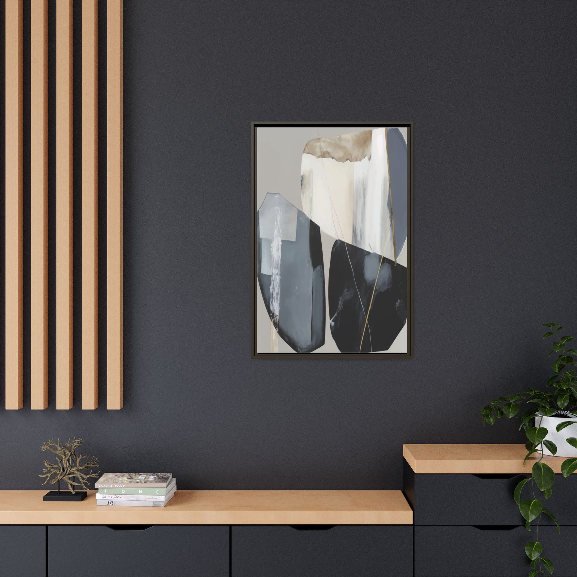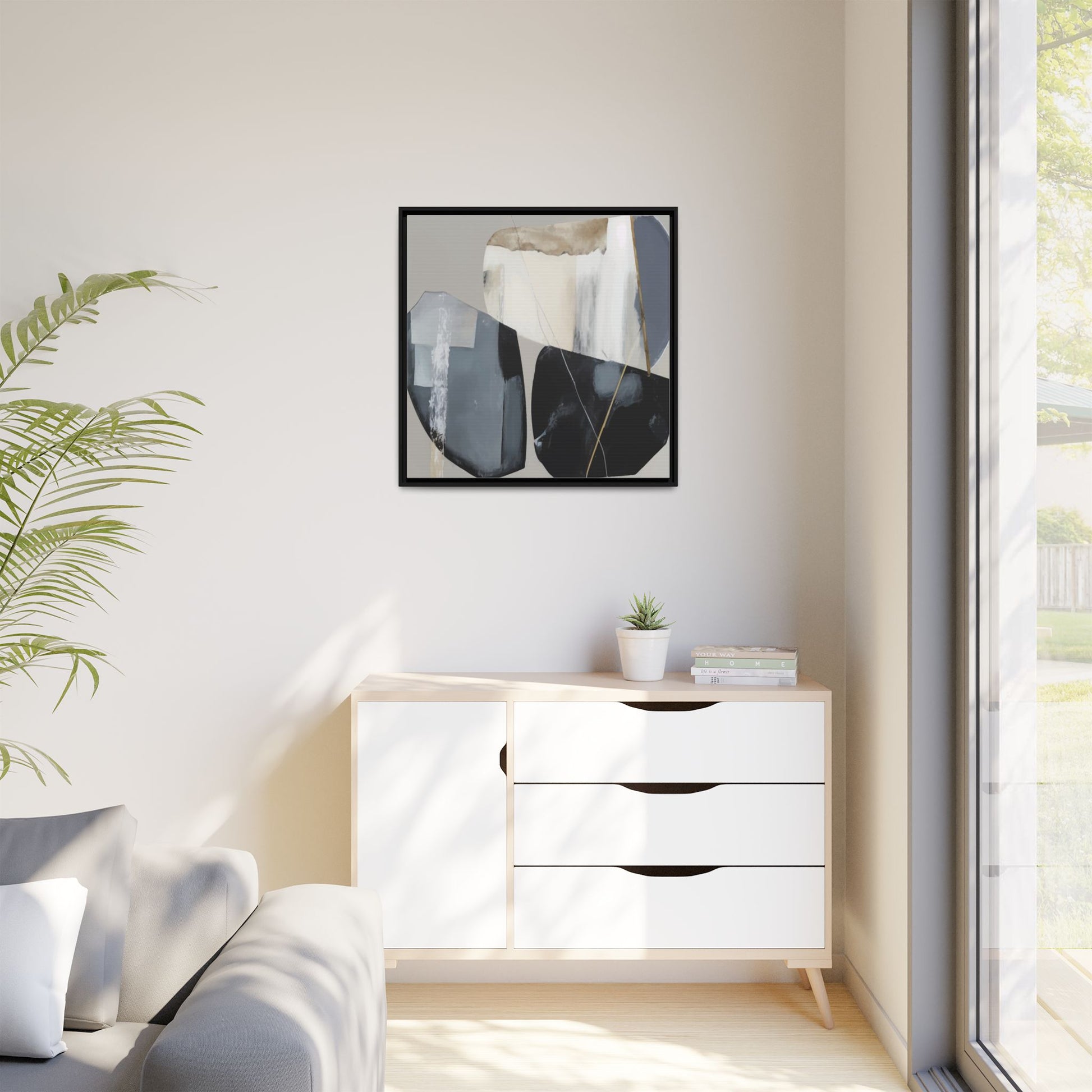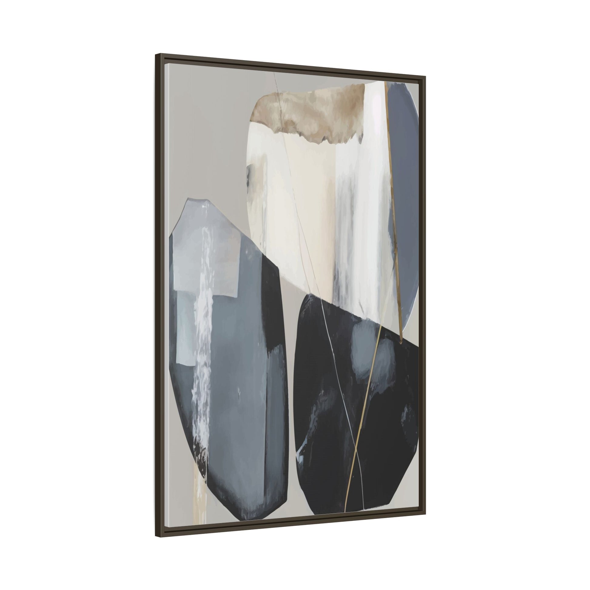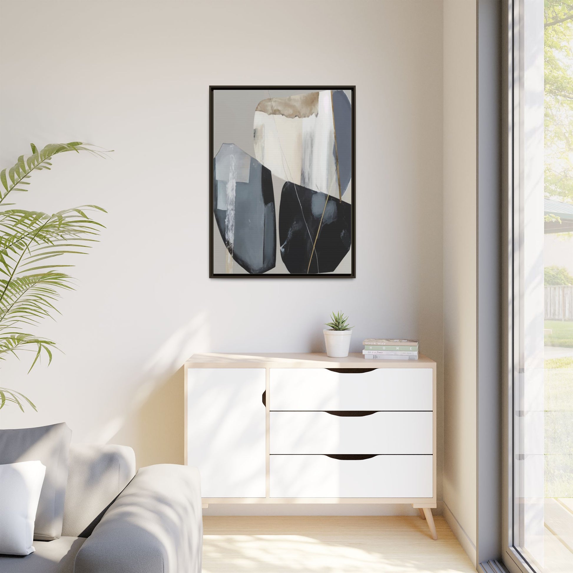 This contemporary abstract painting features a sophisticated composition of geometric shapes in a muted color palette of whites, grays, and blacks. The artwork appears to be divided into curved, irregular sections that overlap and intersect, creating a sense of depth and visual complexity. Soft, blended edges and translucent layers give the piece a fluid, ethereal quality, with hints of beige and silvery tones adding nuanced texture. Thin, precise golden or white lines traverse the canvas, providing linear contrast to the organic, rounded forms. The painting evokes a sense of balance and harmony through its careful arrangement of shapes and deliberate use of negative space, embodying a minimalist yet dynamic aesthetic.