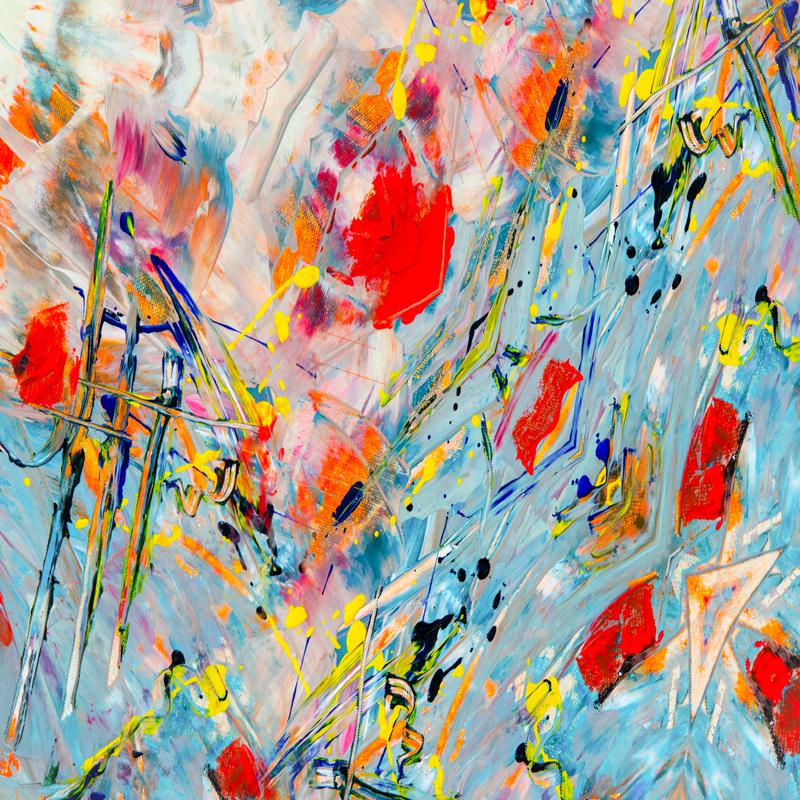 An energetic explosion of colors and forms dances across the canvas, invoking a sense of movement and chaos, intertwined with glimpses of calm.