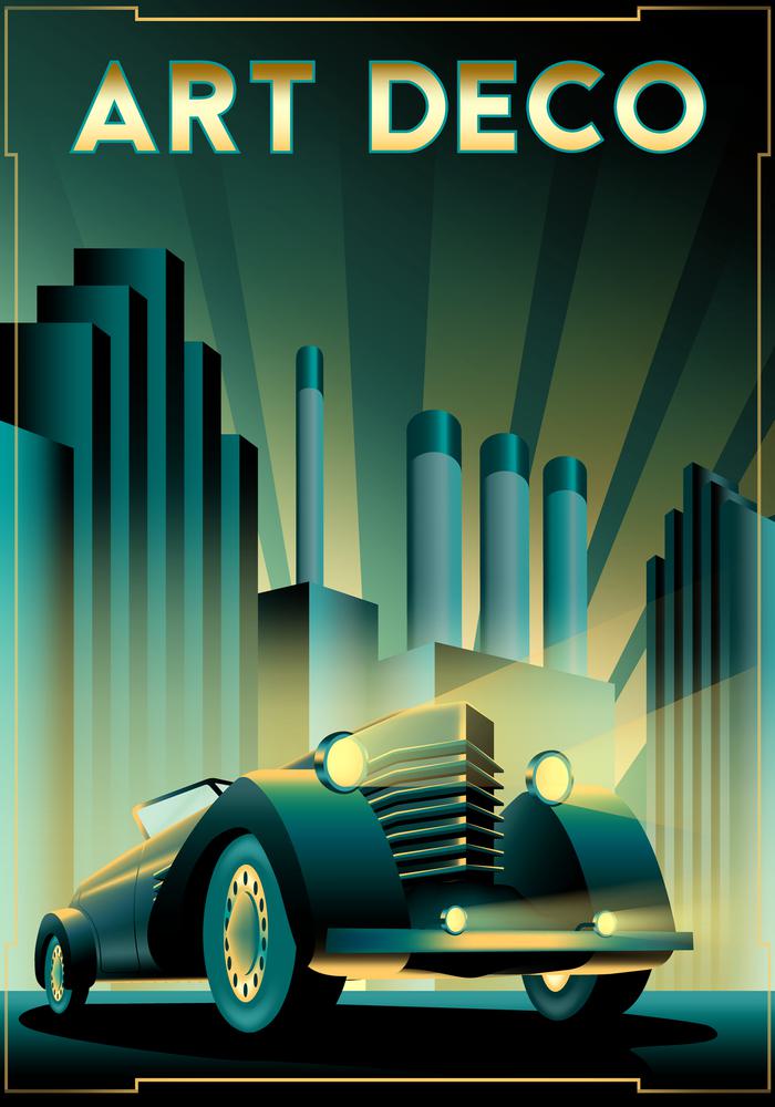 An evocative depiction of a sleek automobile set against towering industrial silhouettes, capturing the opulence and forward momentum of an era. The artwork radiates a sense of optimism and technological triumph.