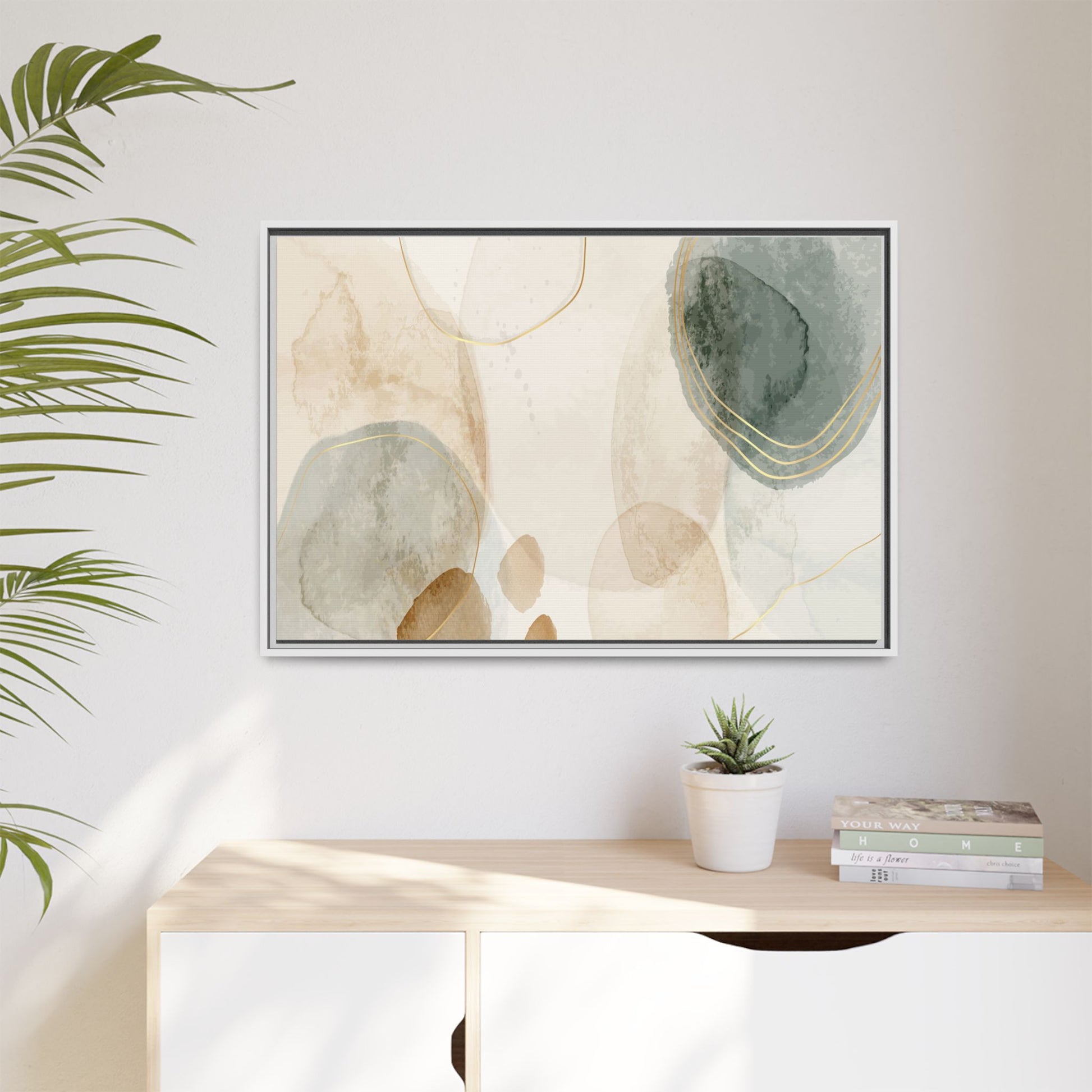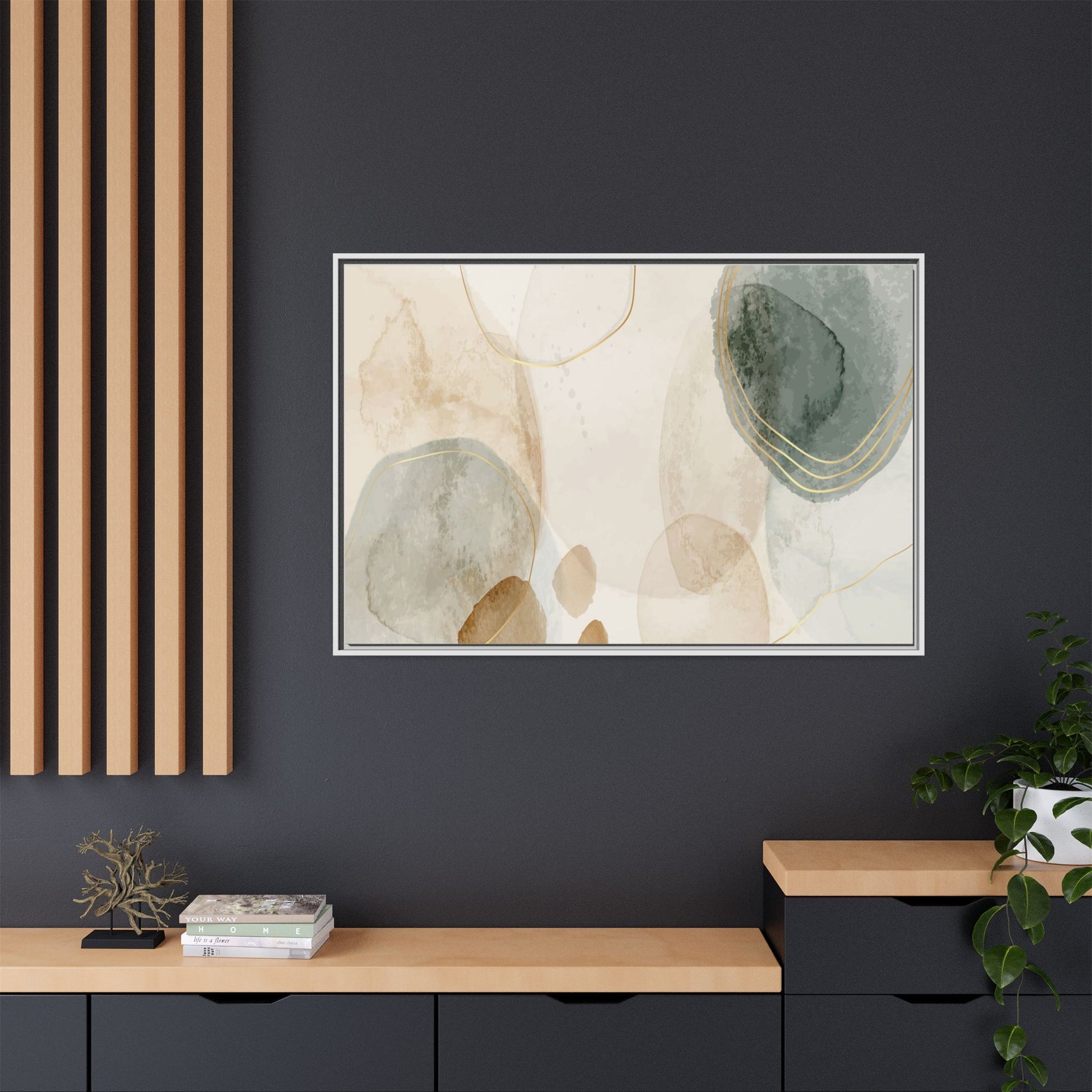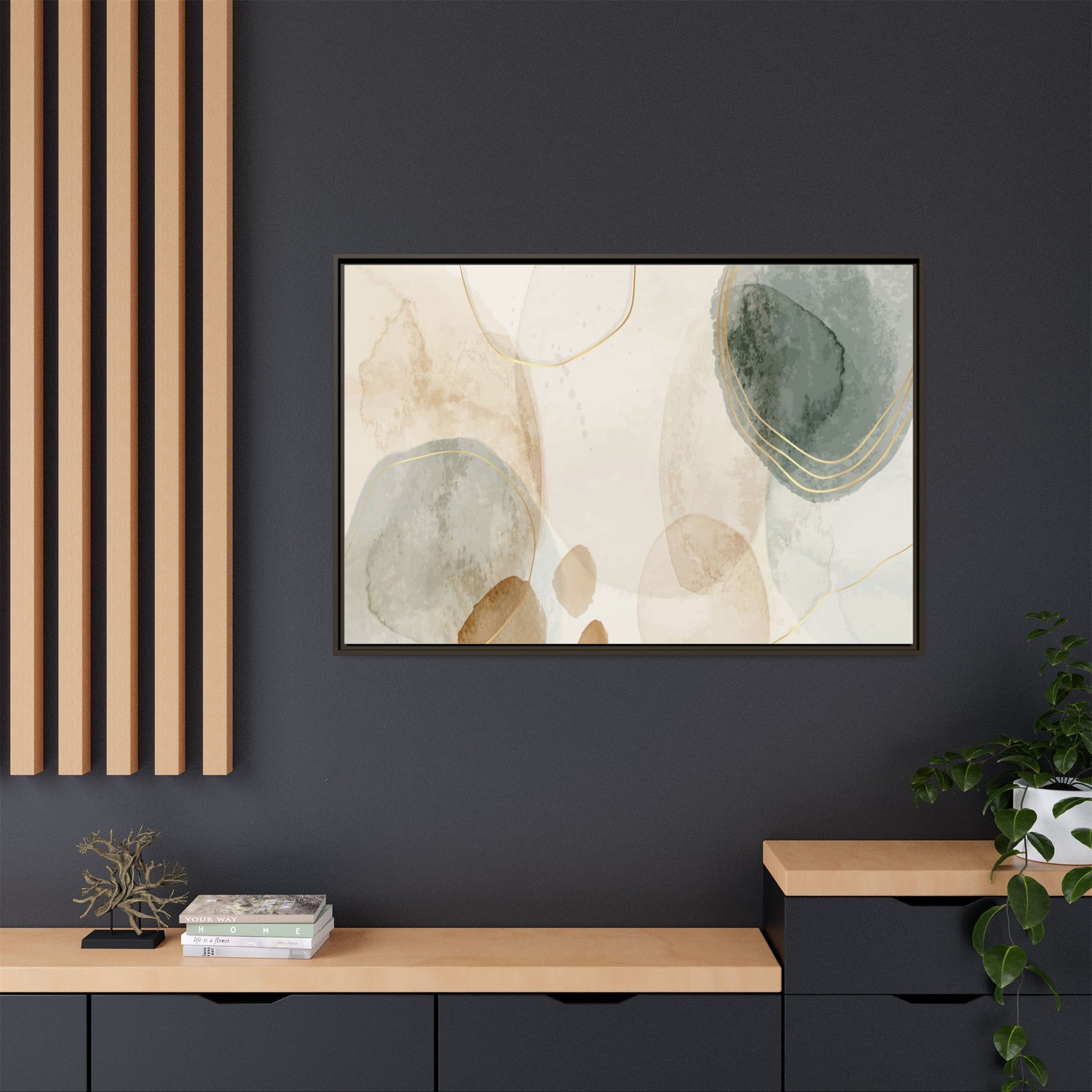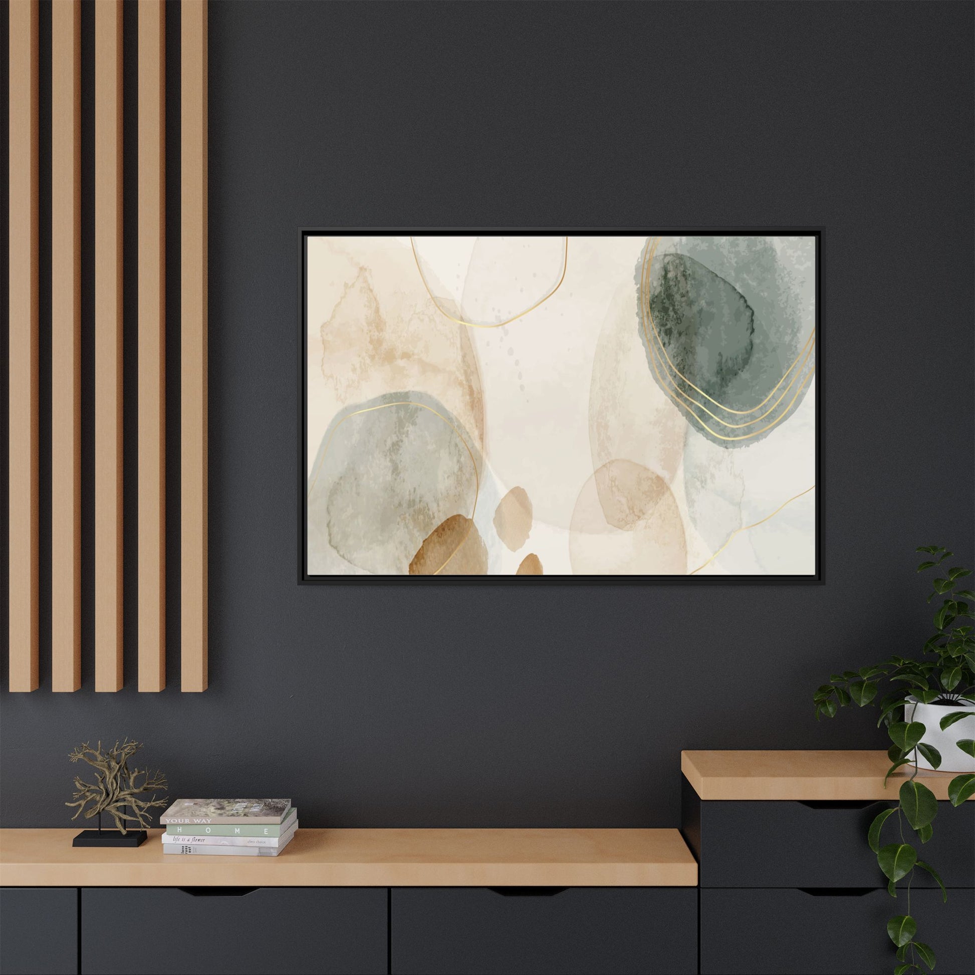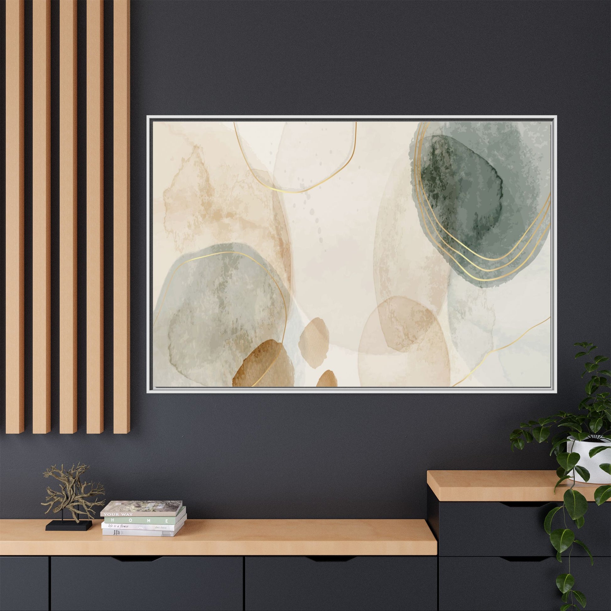 This abstract watercolor artwork features a soft, ethereal composition of organic shapes in muted tones of beige, green, and gray. Delicate golden lines weave through the image, creating elegant connections between translucent, stone-like forms that appear to float on a light background. The watercolor technique lends a dreamy, textured quality to each shape, with gentle gradients and subtle variations in color that evoke a sense of natural landscape or mineral formations. Circular and oval shapes of varying sizes are arranged in a balanced, asymmetrical layout, suggesting a modern and minimalist aesthetic. The color palette and fluid design create a sense of calm and sophistication, making this piece ideal for contemporary interior design and abstract art collections.
