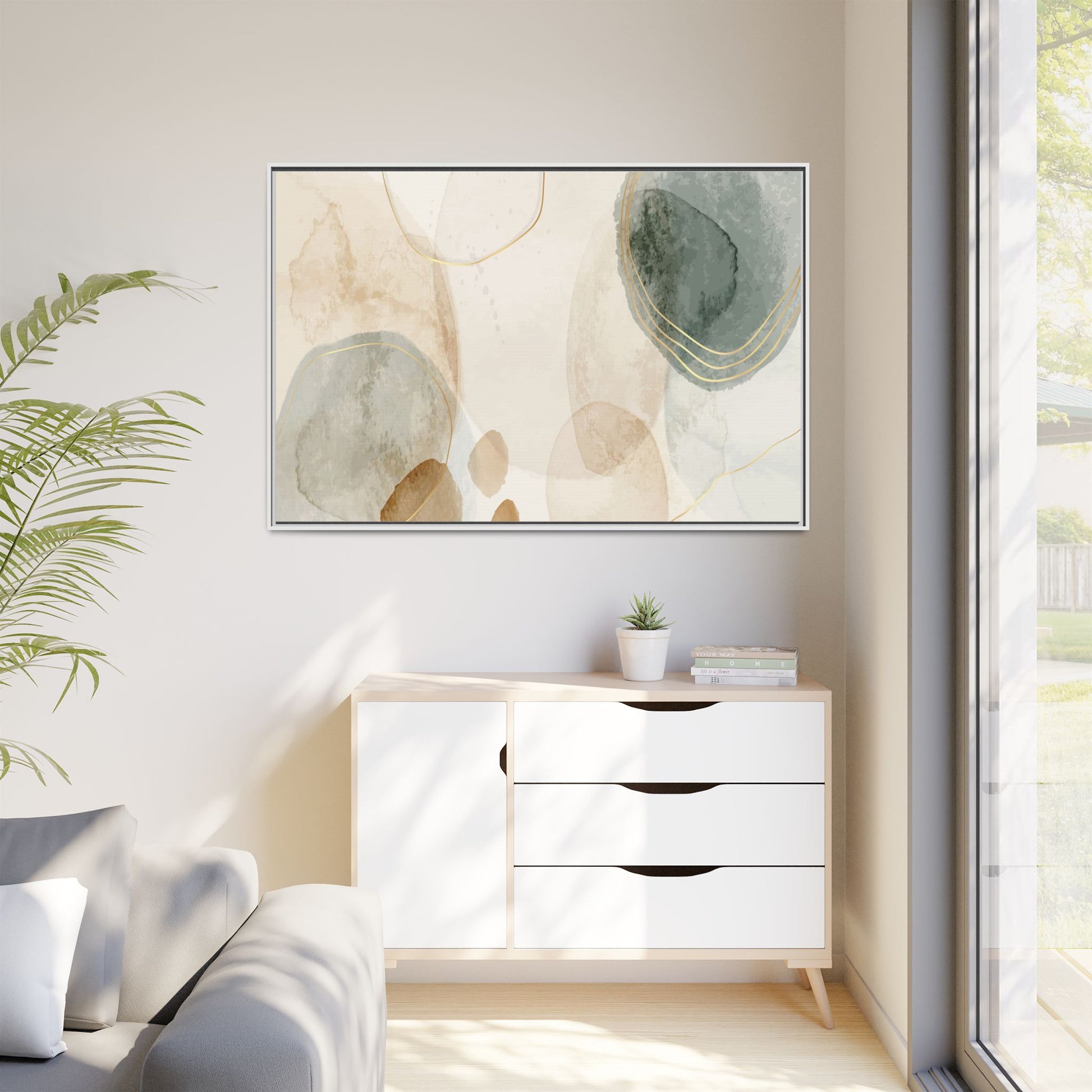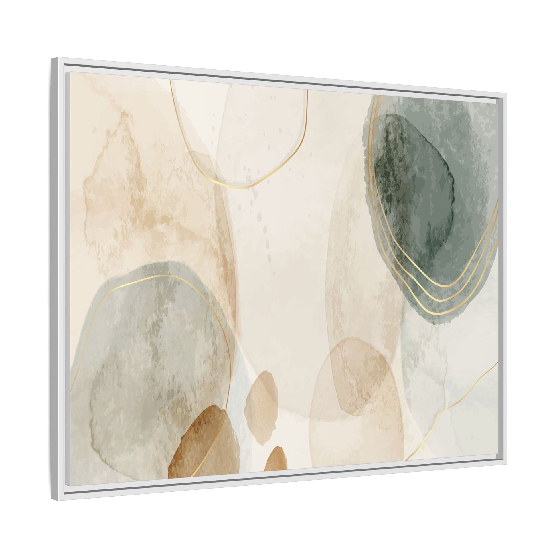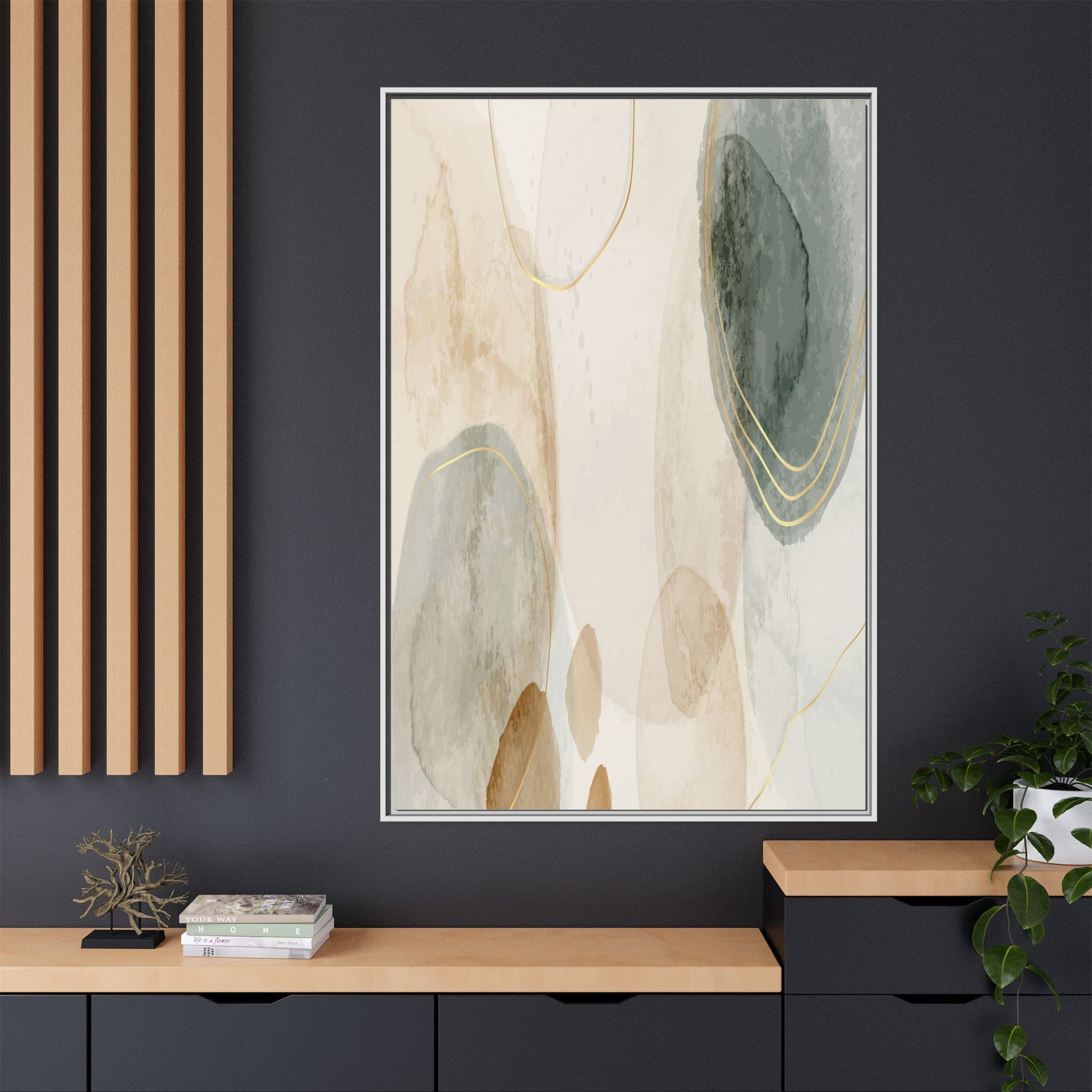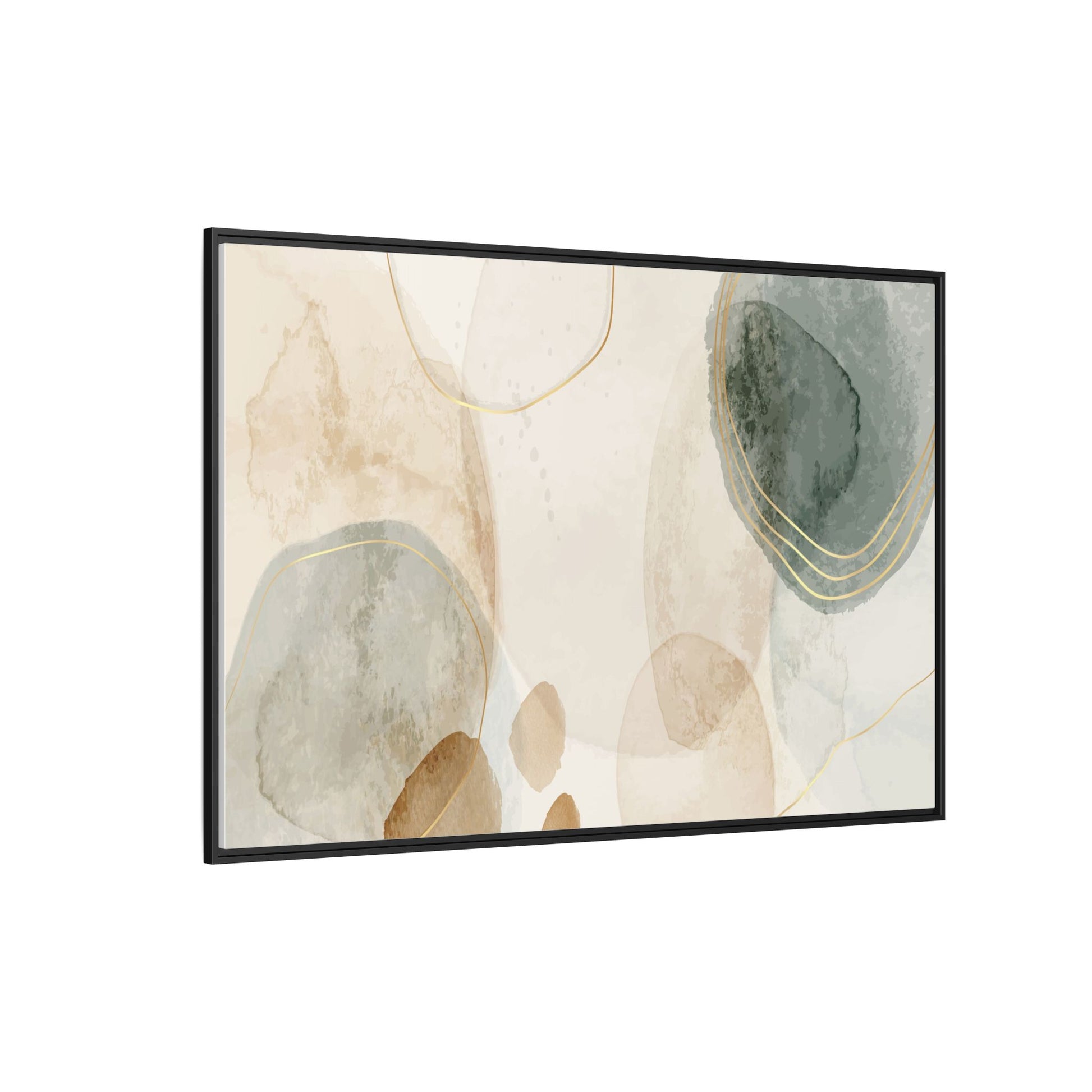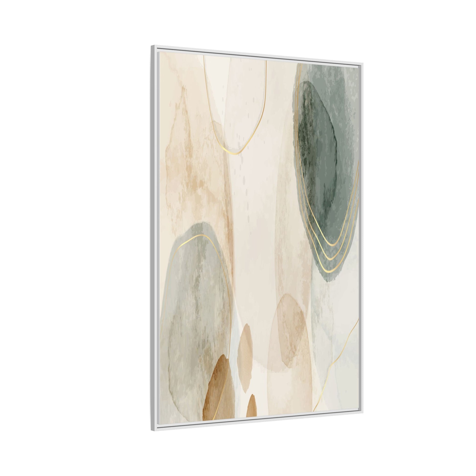 This abstract watercolor artwork features a soft, ethereal composition of organic shapes in muted tones of beige, green, and gray. Delicate golden lines weave through the image, creating elegant connections between translucent, stone-like forms that appear to float on a light background. The watercolor technique lends a dreamy, textured quality to each shape, with gentle gradients and subtle variations in color that evoke a sense of natural landscape or mineral formations. Circular and oval shapes of varying sizes are arranged in a balanced, asymmetrical layout, suggesting a modern and minimalist aesthetic. The color palette and fluid design create a sense of calm and sophistication, making this piece ideal for contemporary interior design and abstract art collections.