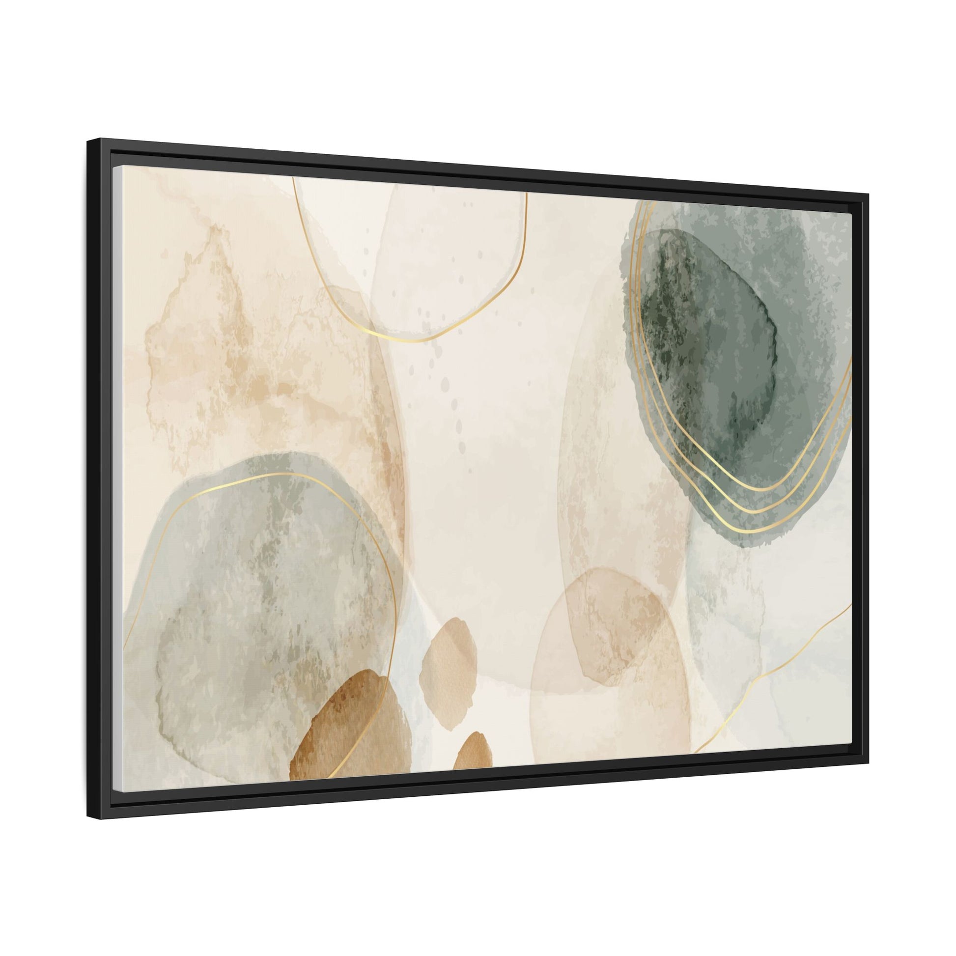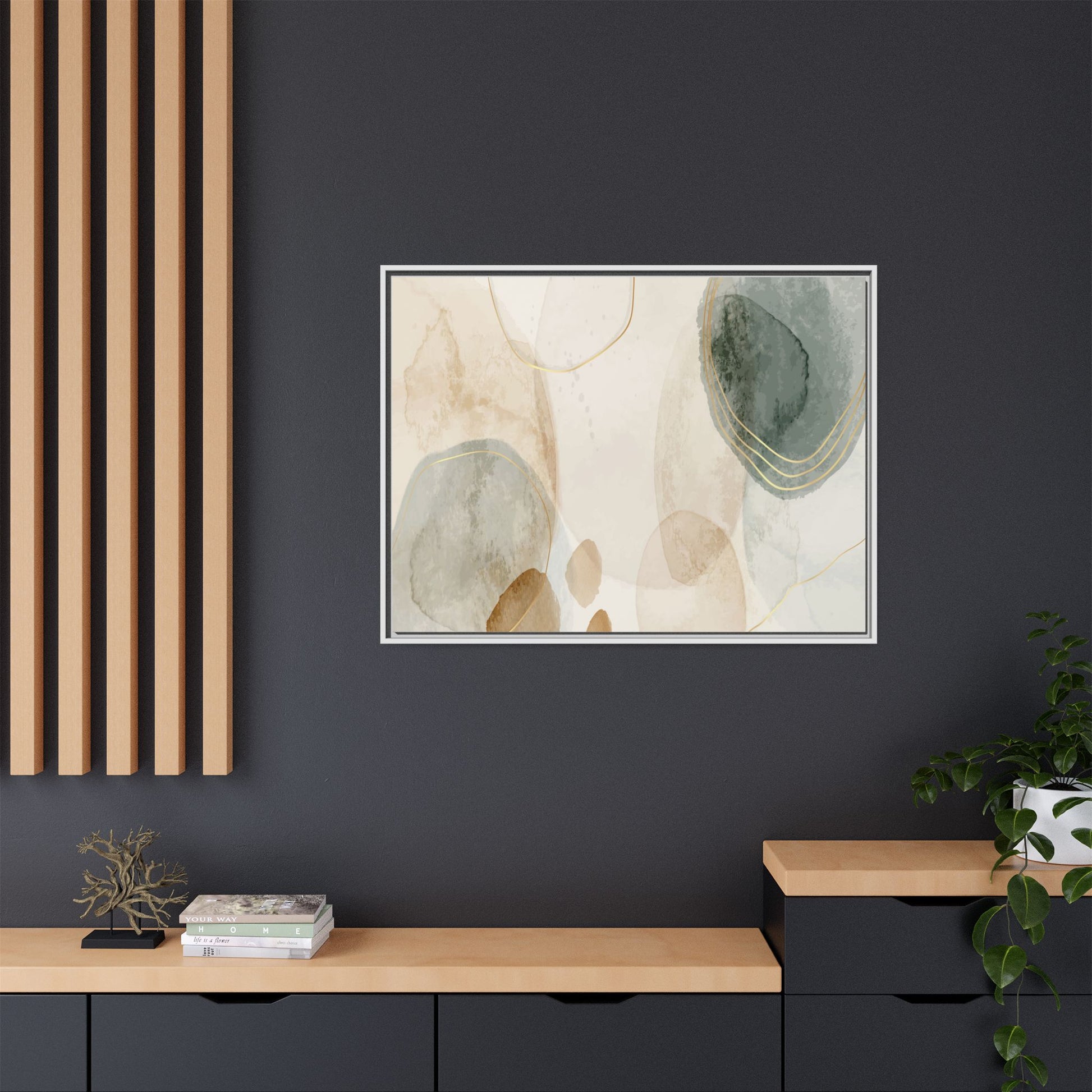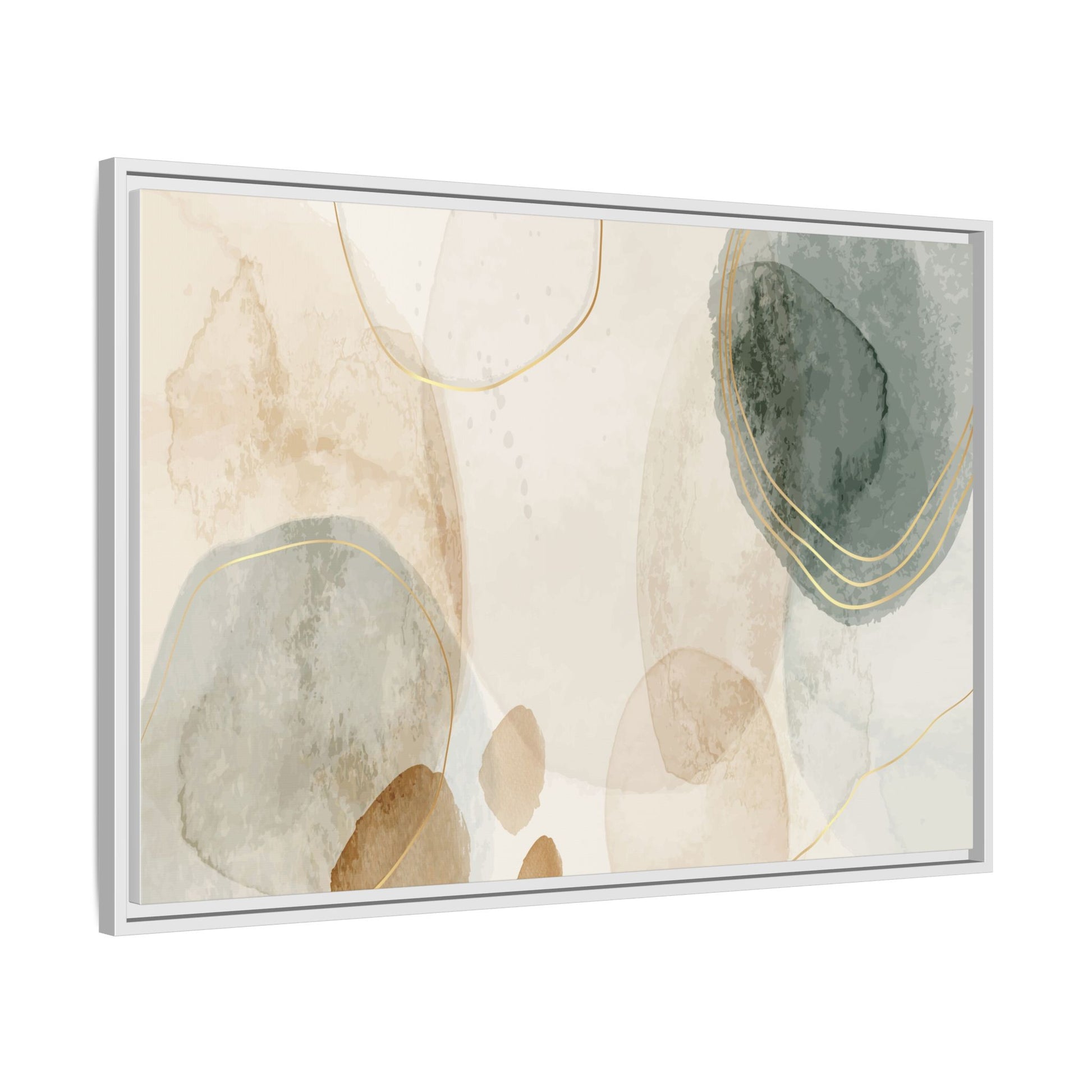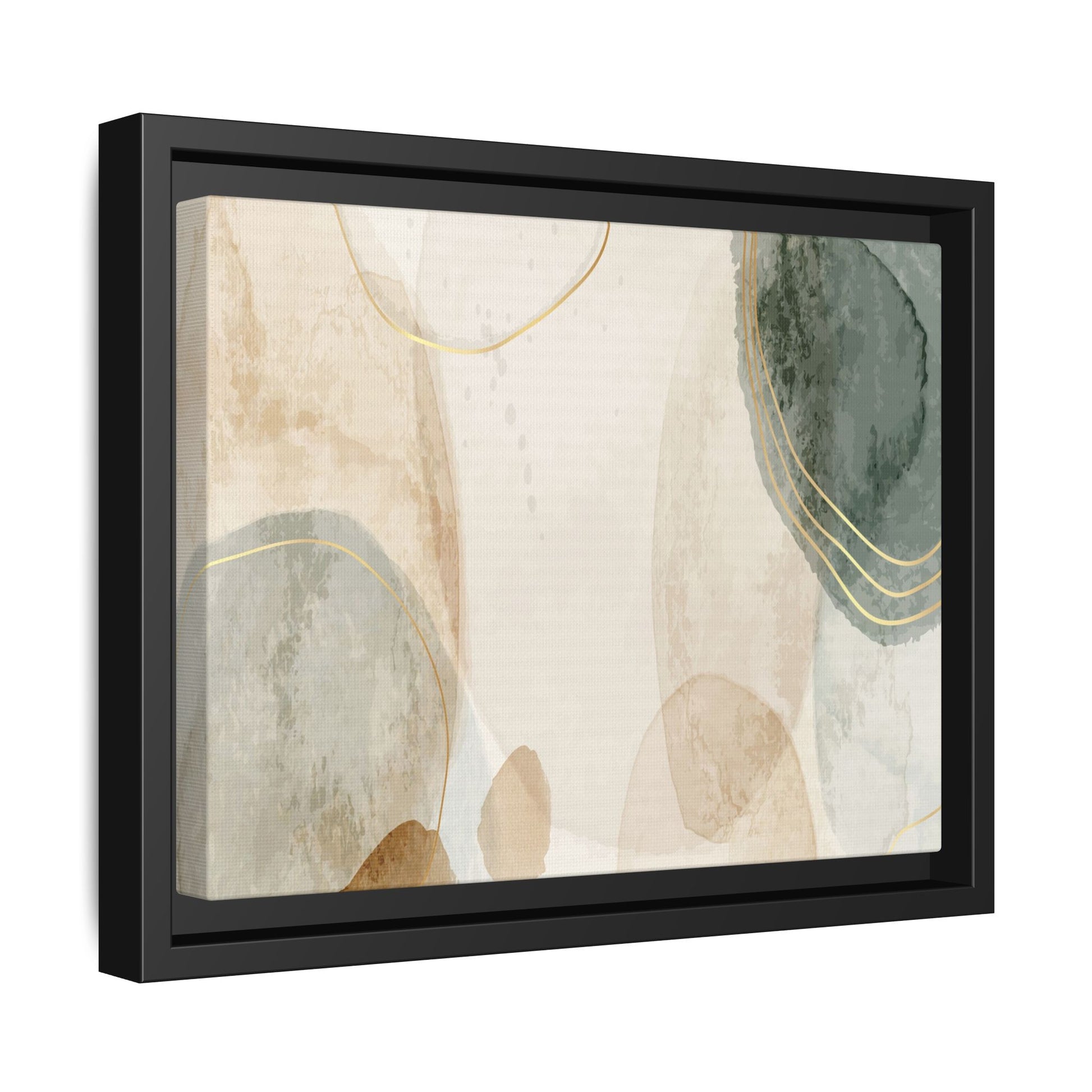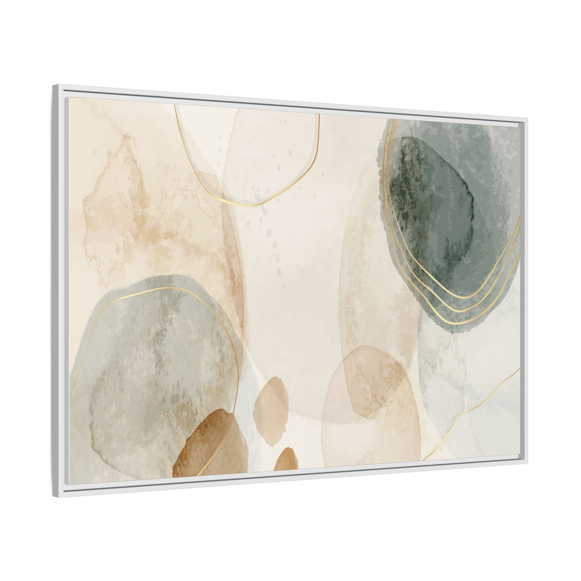 This abstract watercolor artwork features a soft, ethereal composition of organic shapes in muted tones of beige, green, and gray. Delicate golden lines weave through the image, creating elegant connections between translucent, stone-like forms that appear to float on a light background. The watercolor technique lends a dreamy, textured quality to each shape, with gentle gradients and subtle variations in color that evoke a sense of natural landscape or mineral formations. Circular and oval shapes of varying sizes are arranged in a balanced, asymmetrical layout, suggesting a modern and minimalist aesthetic. The color palette and fluid design create a sense of calm and sophistication, making this piece ideal for contemporary interior design and abstract art collections.