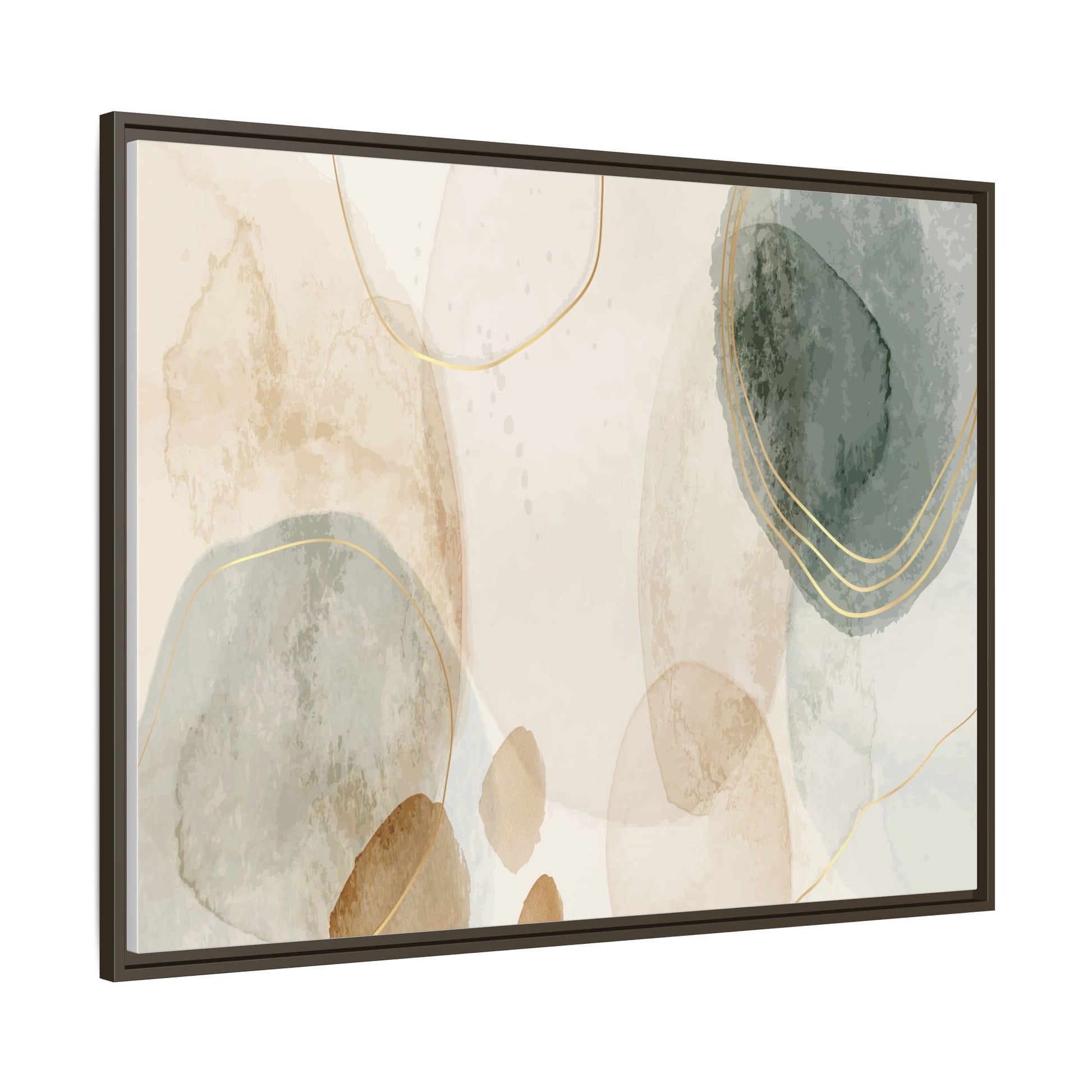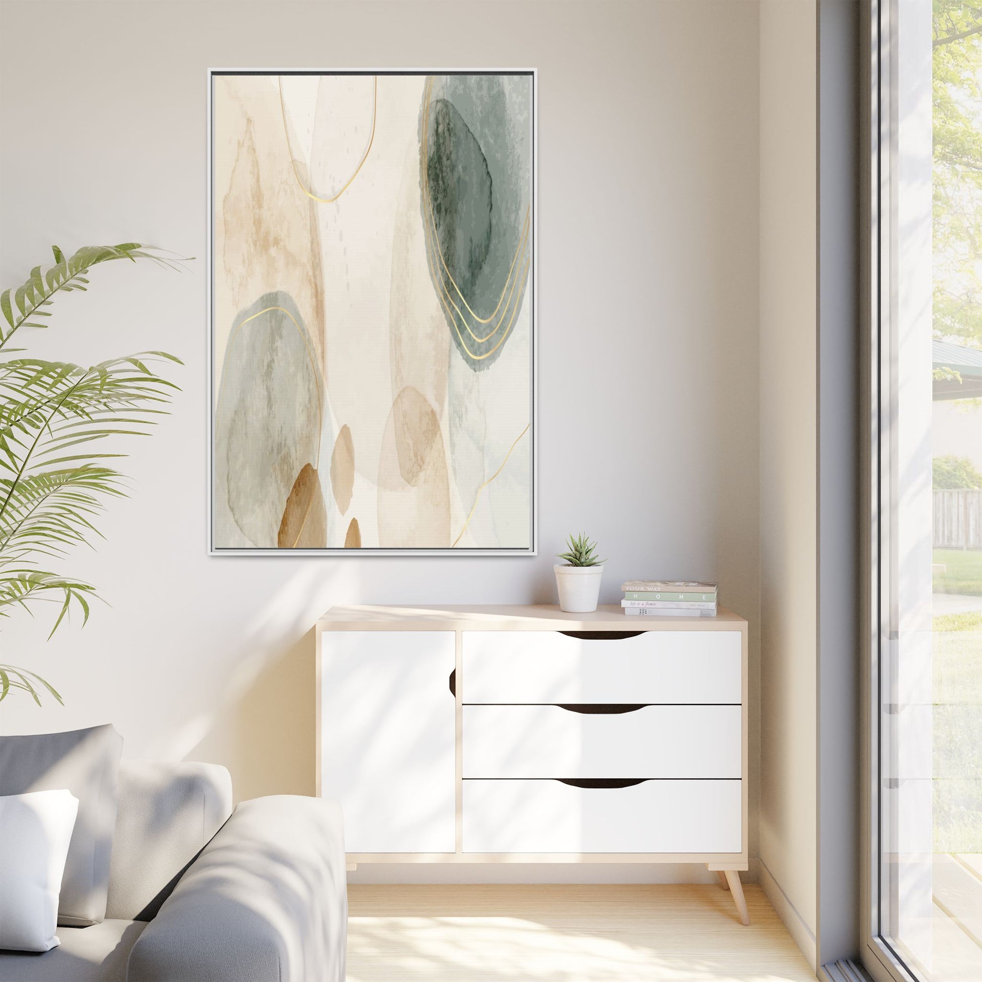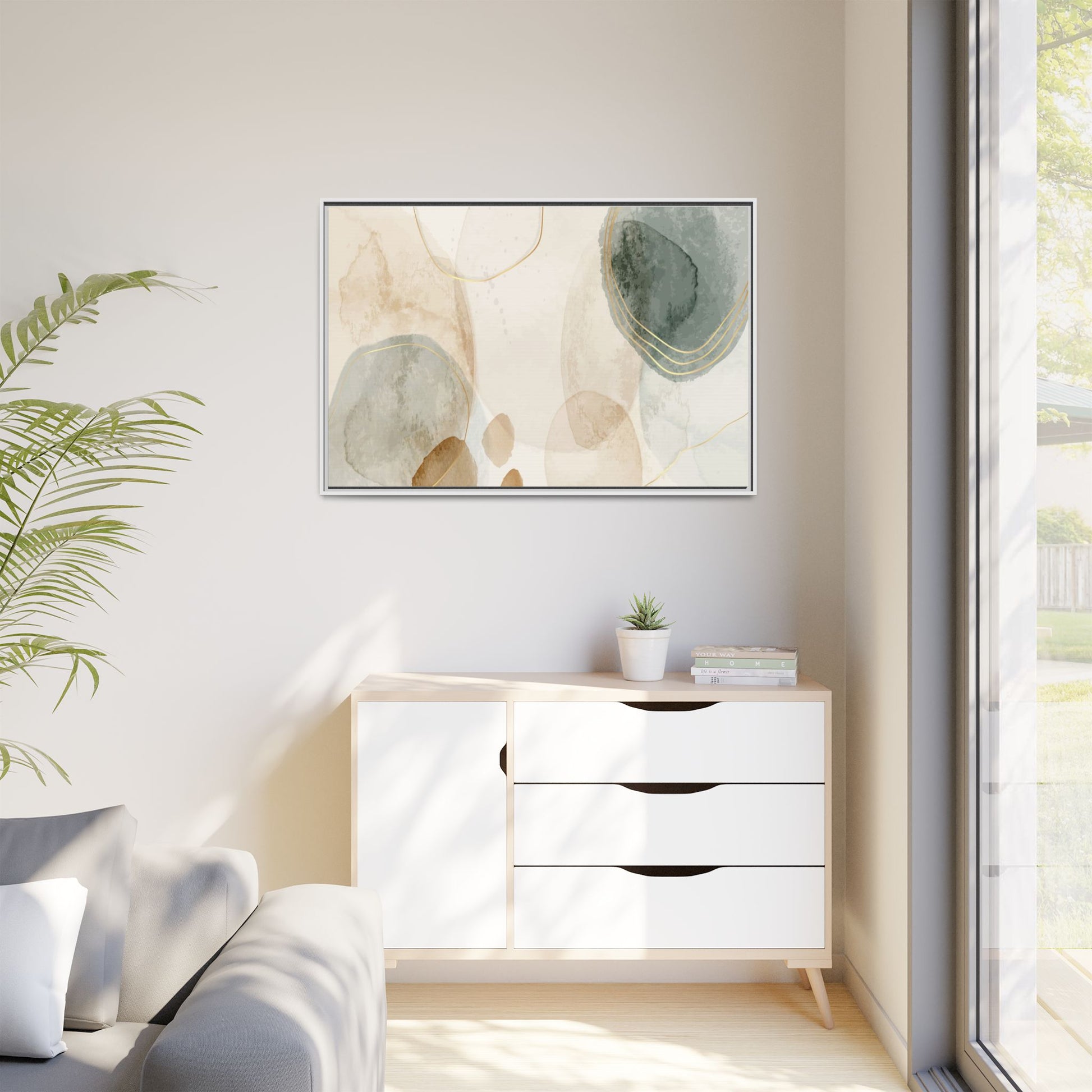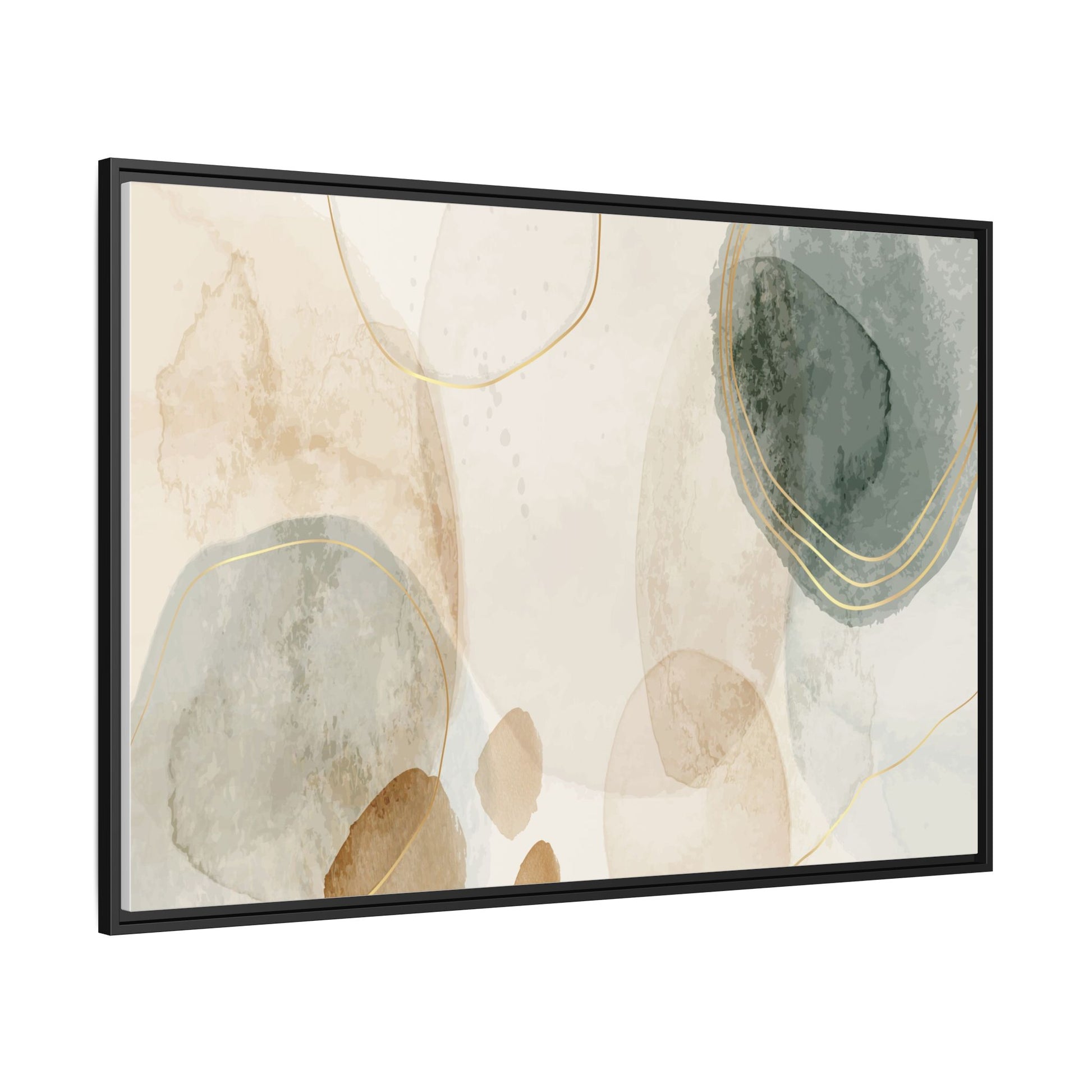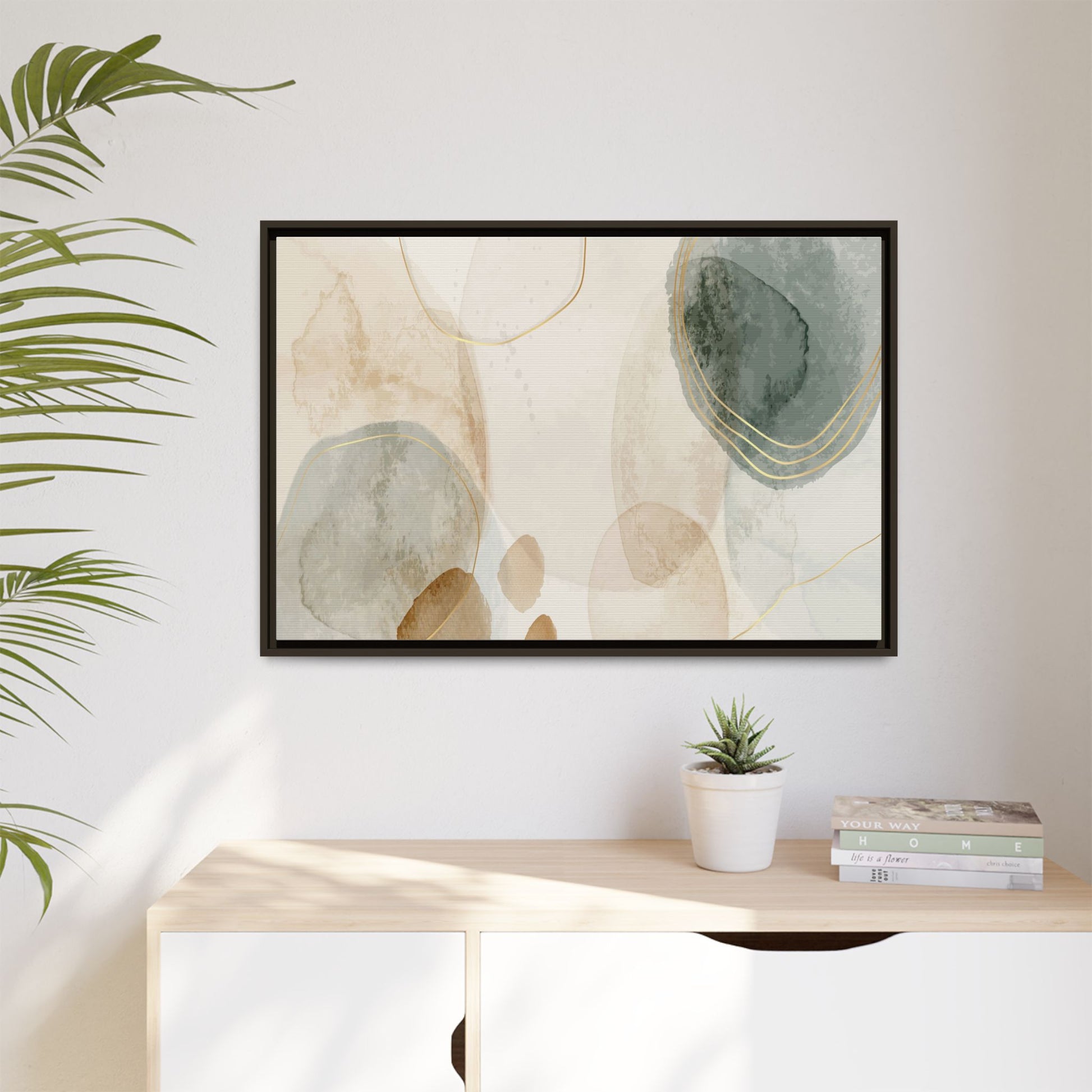 This abstract watercolor artwork features a soft, ethereal composition of organic shapes in muted tones of beige, green, and gray. Delicate golden lines weave through the image, creating elegant connections between translucent, stone-like forms that appear to float on a light background. The watercolor technique lends a dreamy, textured quality to each shape, with gentle gradients and subtle variations in color that evoke a sense of natural landscape or mineral formations. Circular and oval shapes of varying sizes are arranged in a balanced, asymmetrical layout, suggesting a modern and minimalist aesthetic. The color palette and fluid design create a sense of calm and sophistication, making this piece ideal for contemporary interior design and abstract art collections.