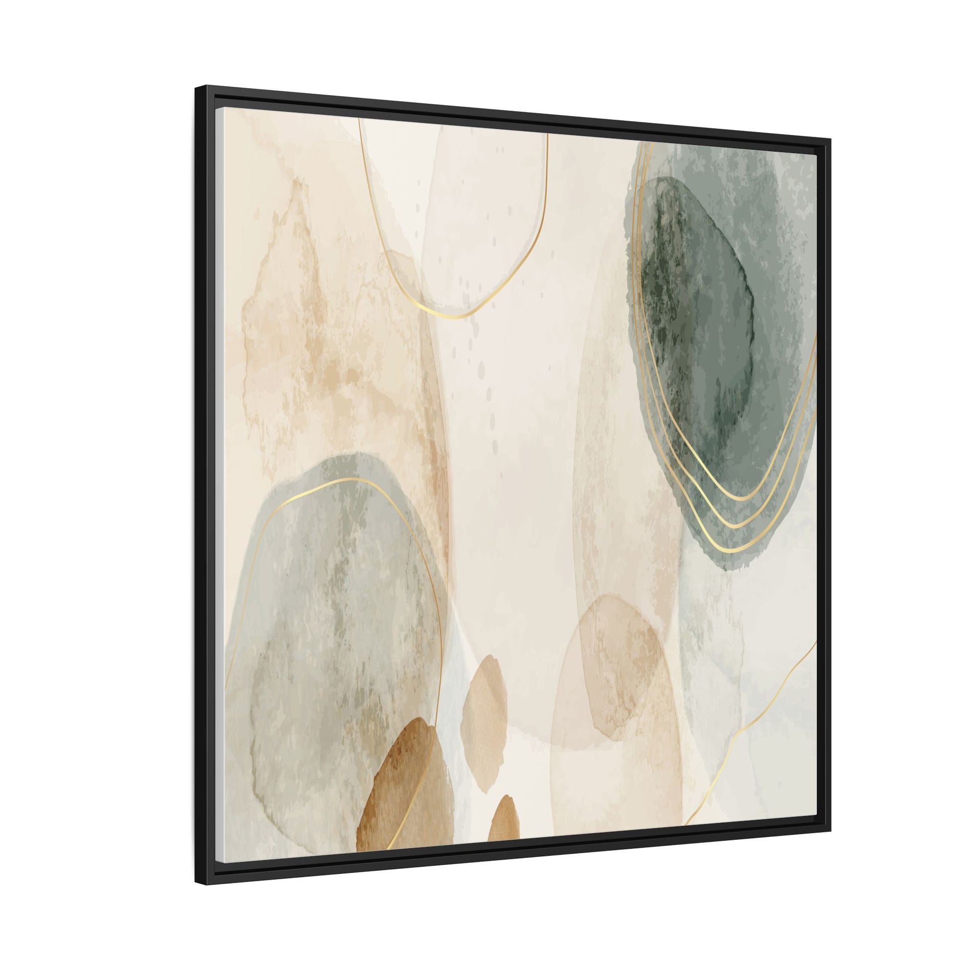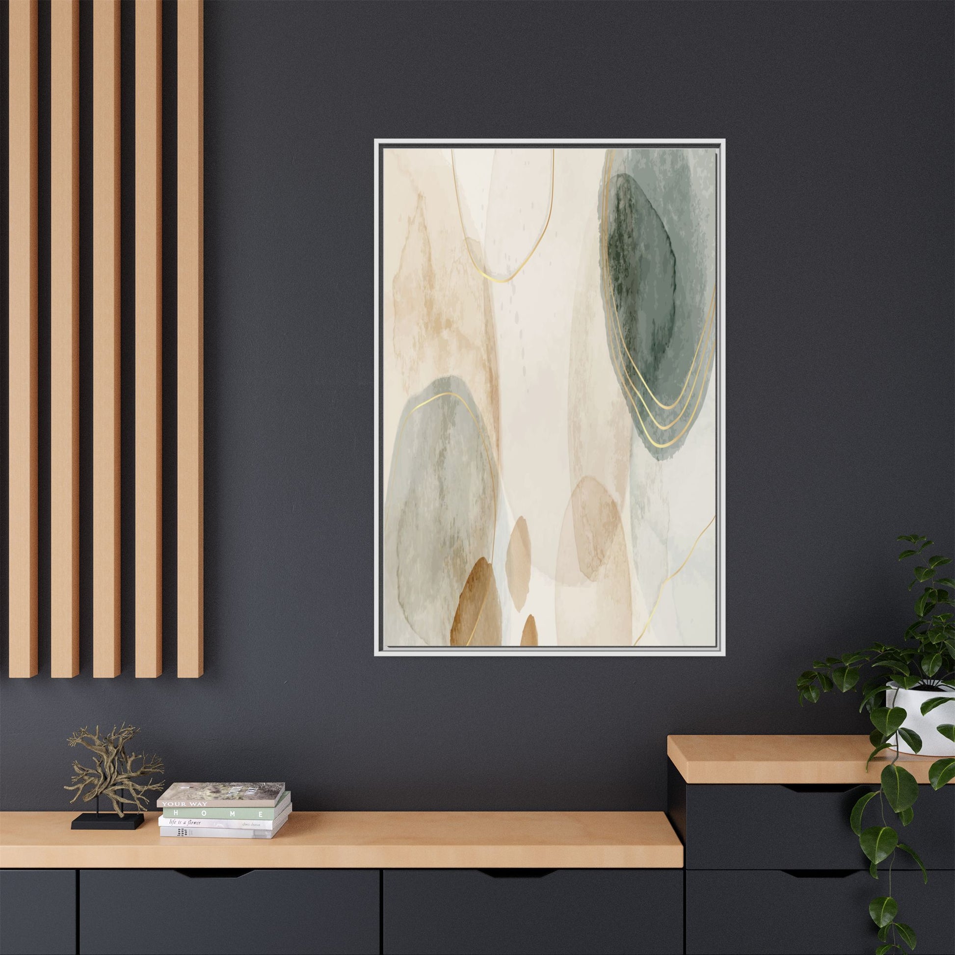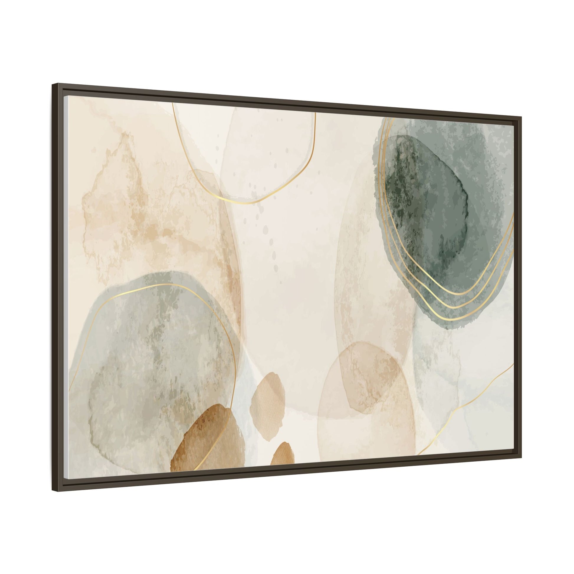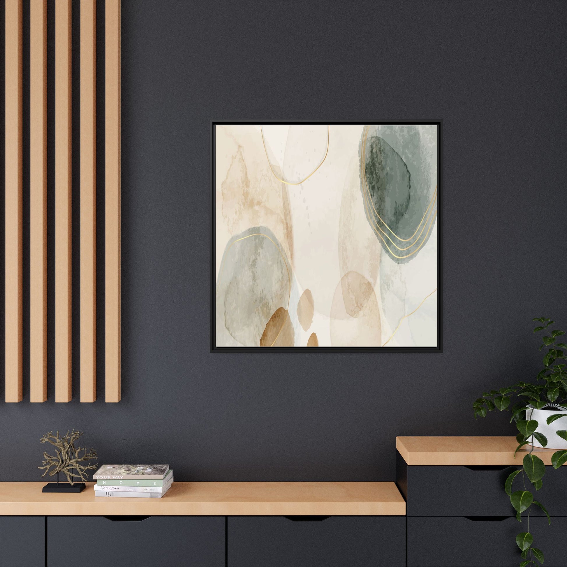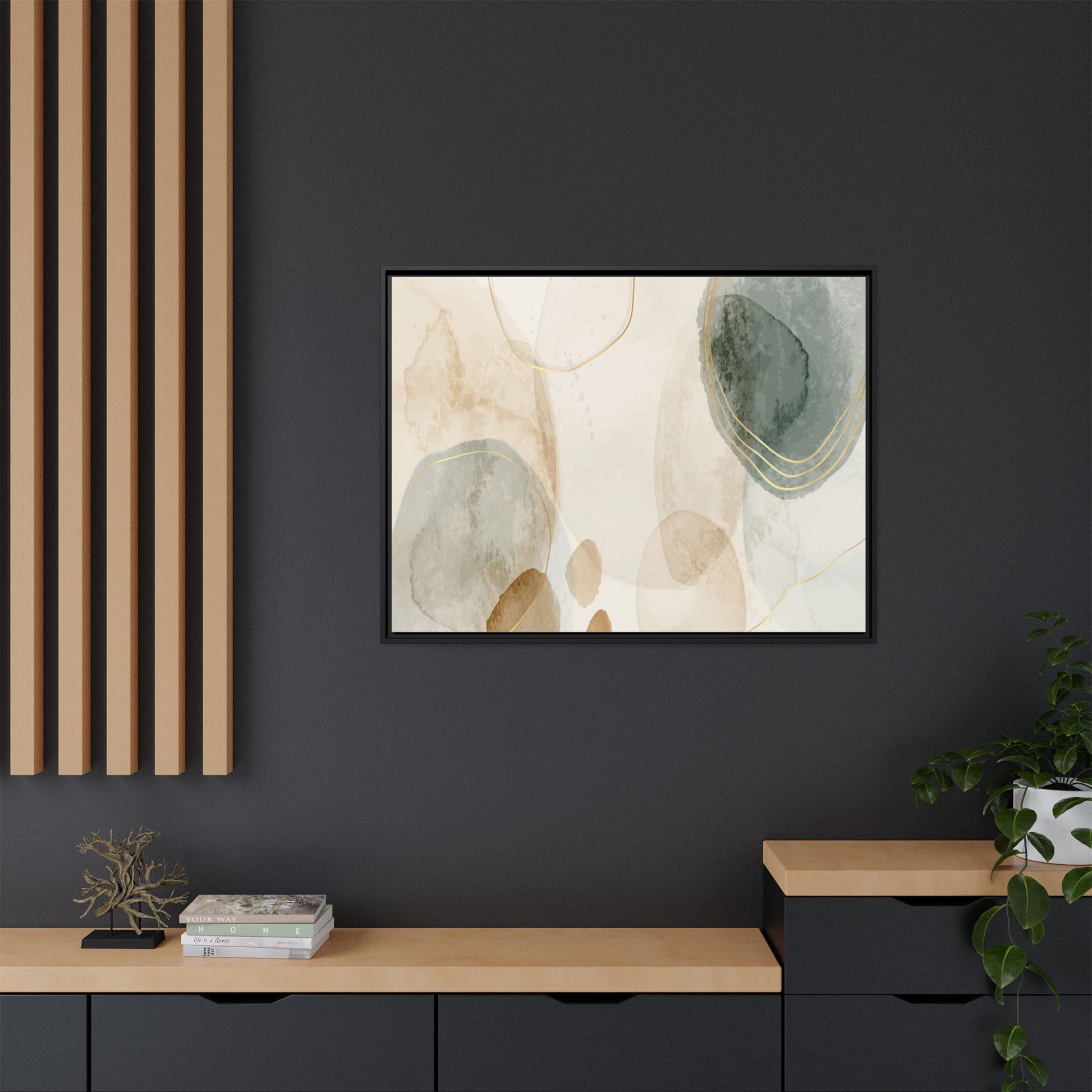 This abstract watercolor artwork features a soft, ethereal composition of organic shapes in muted tones of beige, green, and gray. Delicate golden lines weave through the image, creating elegant connections between translucent, stone-like forms that appear to float on a light background. The watercolor technique lends a dreamy, textured quality to each shape, with gentle gradients and subtle variations in color that evoke a sense of natural landscape or mineral formations. Circular and oval shapes of varying sizes are arranged in a balanced, asymmetrical layout, suggesting a modern and minimalist aesthetic. The color palette and fluid design create a sense of calm and sophistication, making this piece ideal for contemporary interior design and abstract art collections.