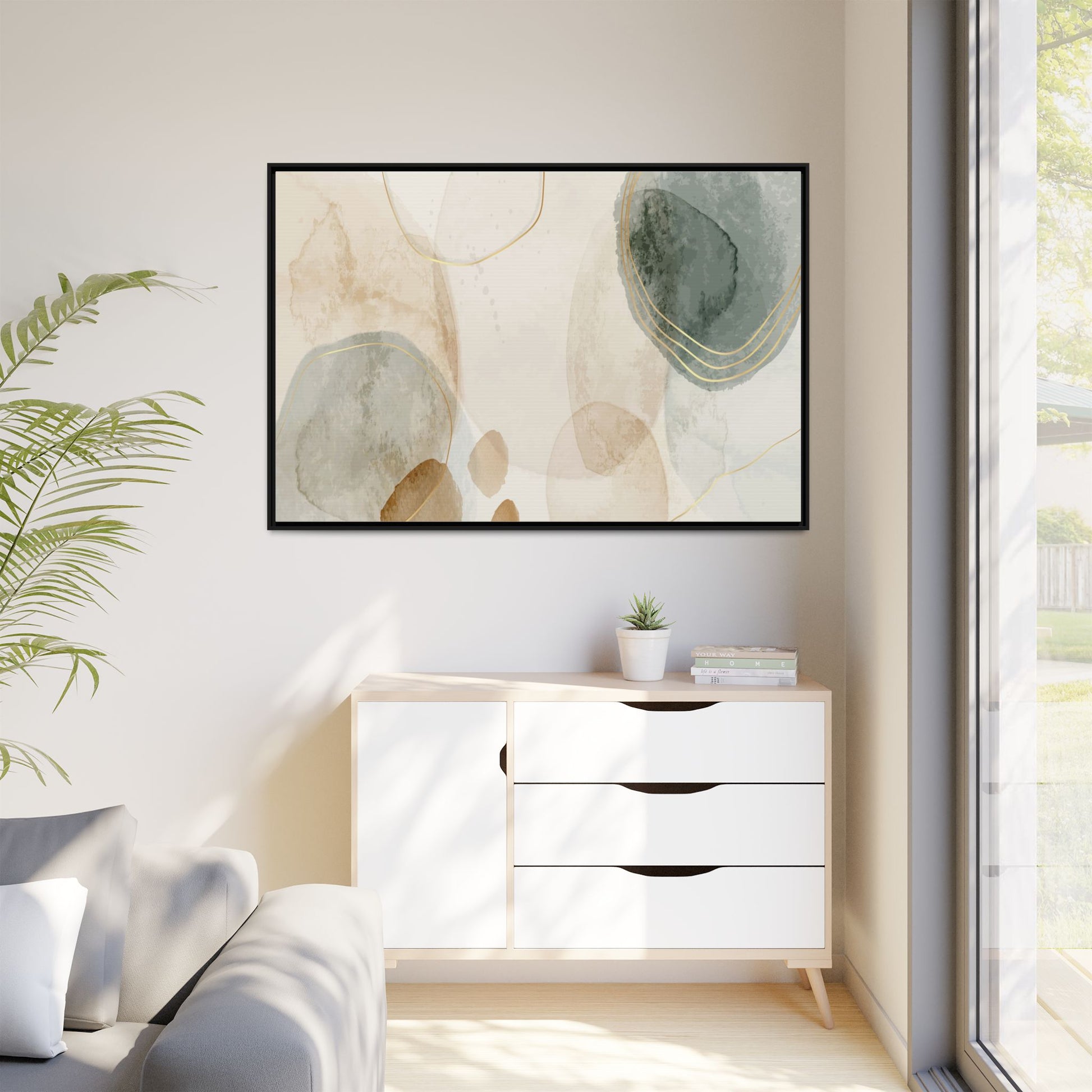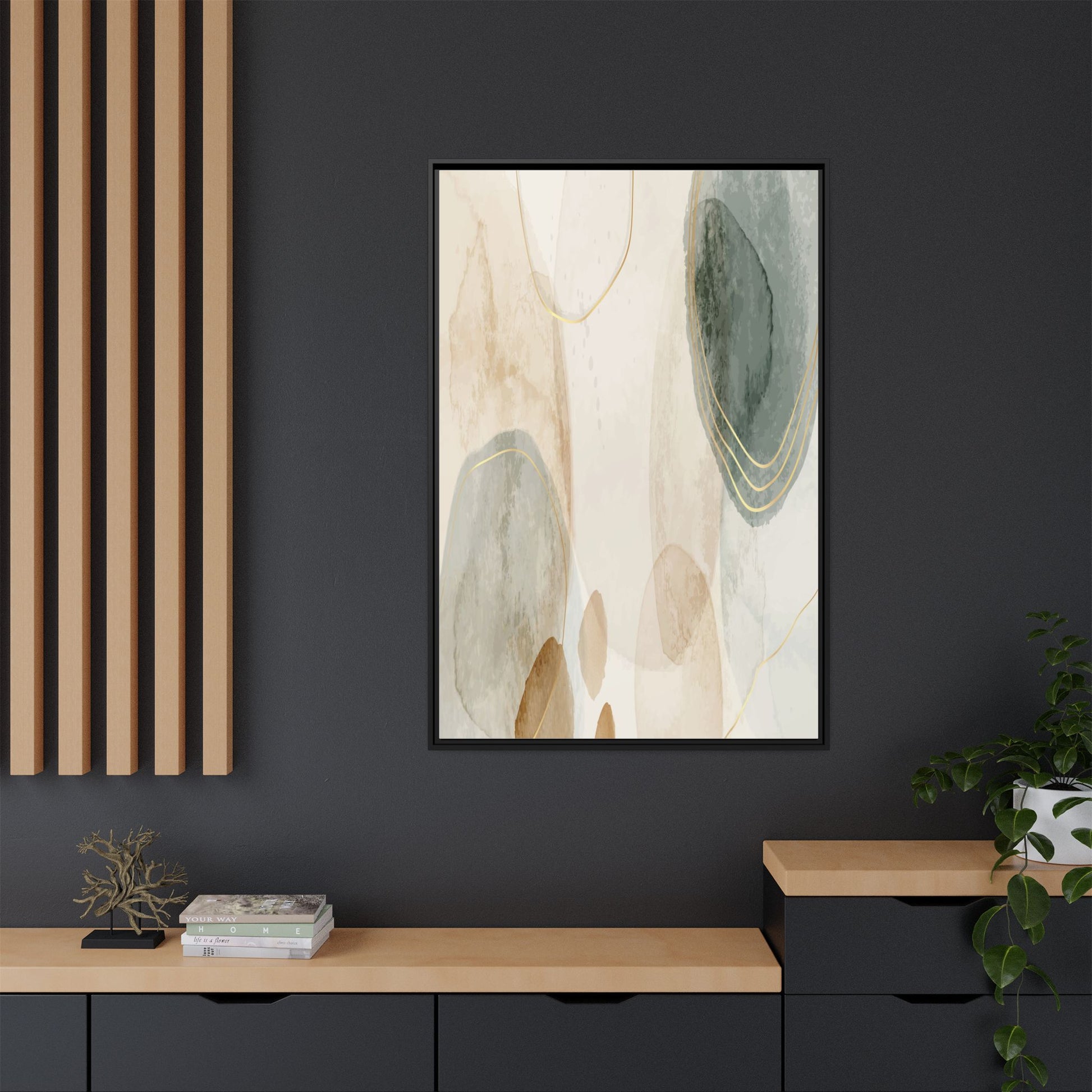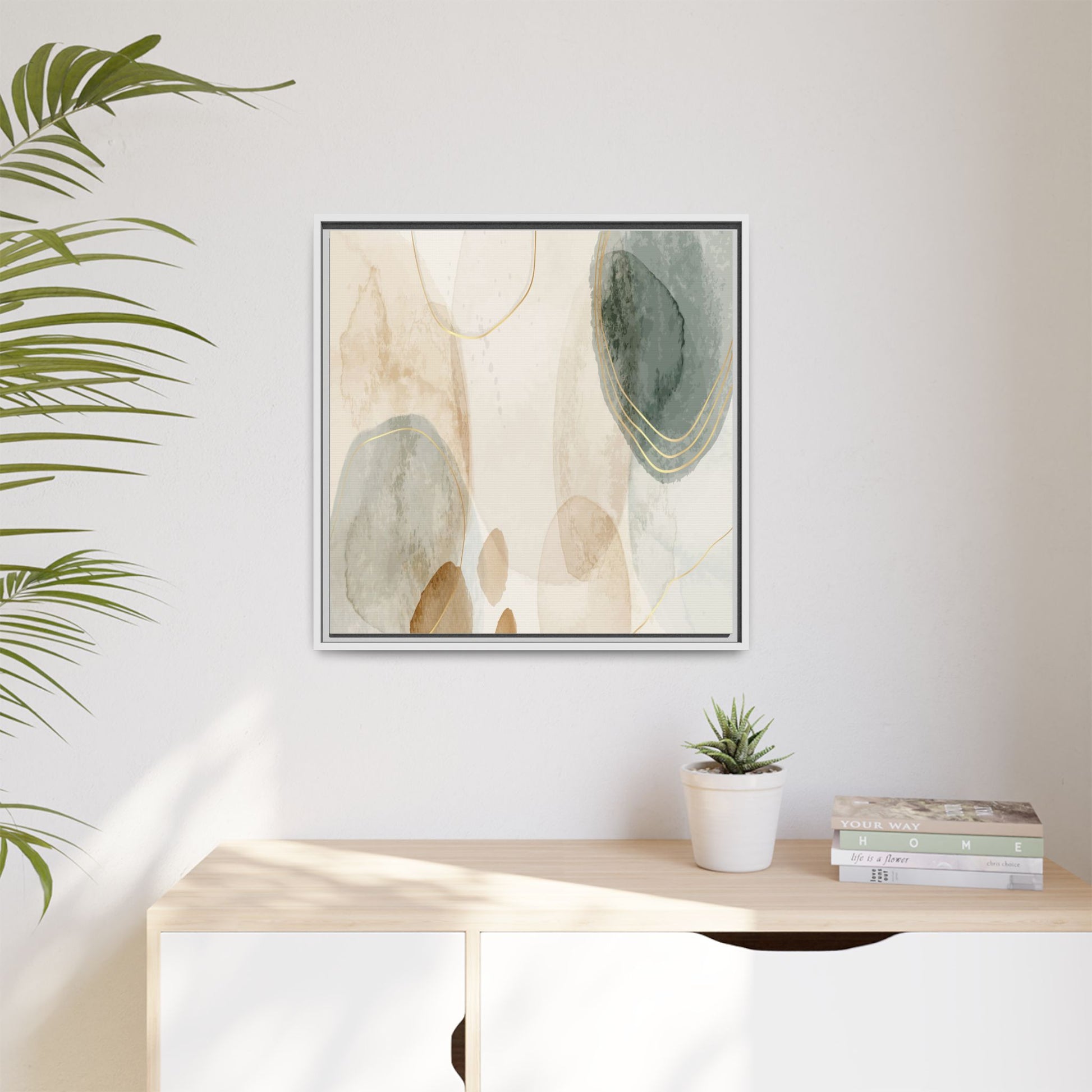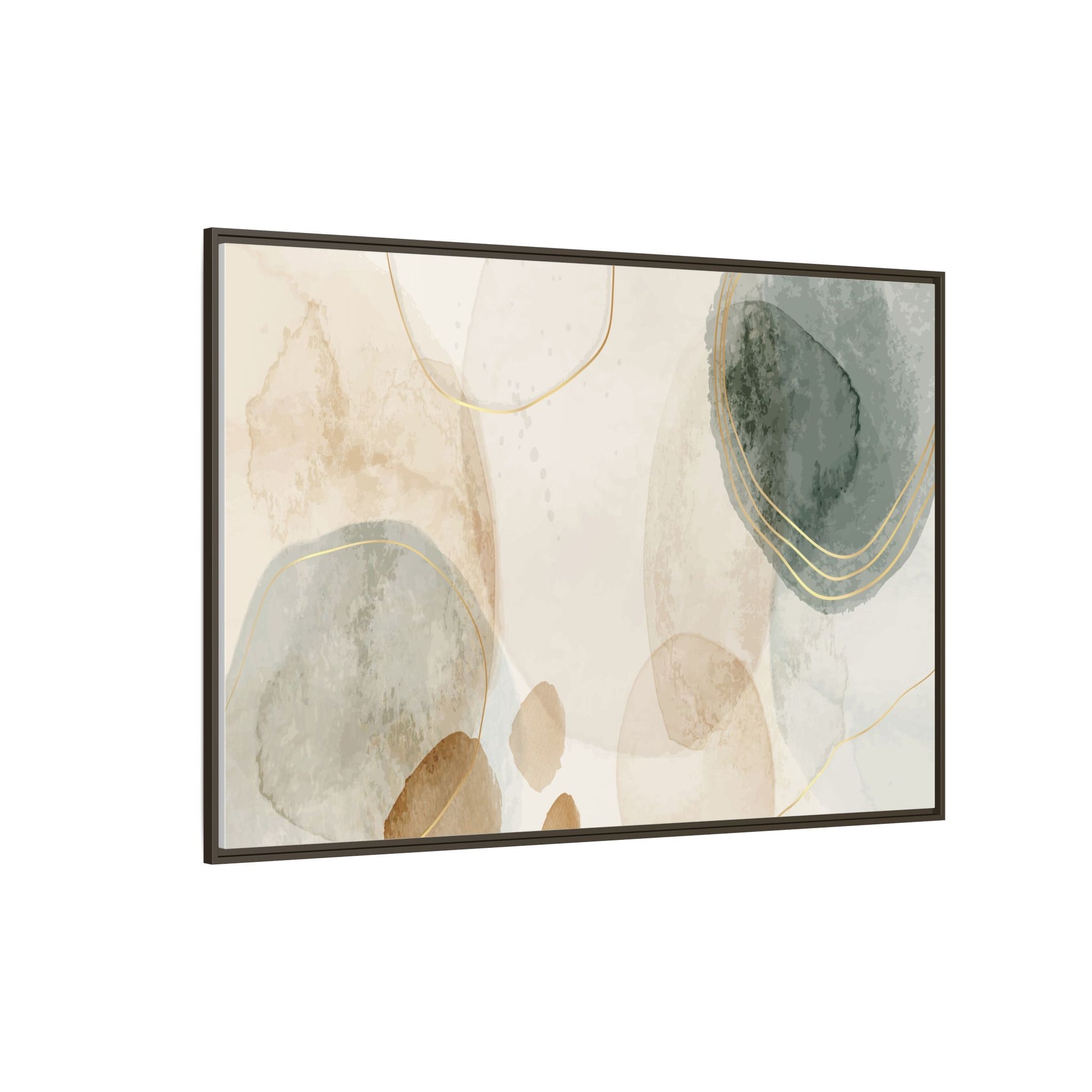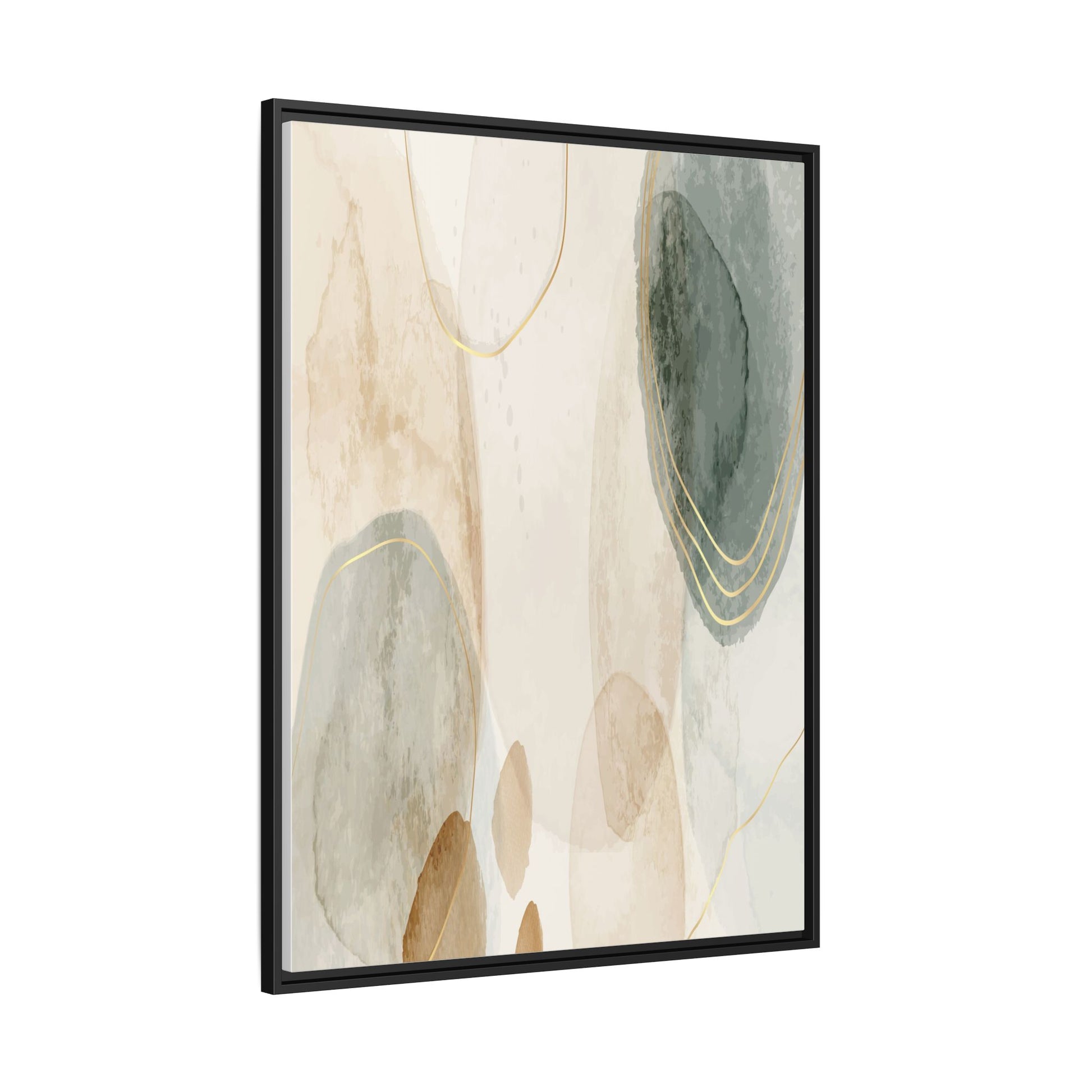 This abstract watercolor artwork features a soft, ethereal composition of organic shapes in muted tones of beige, green, and gray. Delicate golden lines weave through the image, creating elegant connections between translucent, stone-like forms that appear to float on a light background. The watercolor technique lends a dreamy, textured quality to each shape, with gentle gradients and subtle variations in color that evoke a sense of natural landscape or mineral formations. Circular and oval shapes of varying sizes are arranged in a balanced, asymmetrical layout, suggesting a modern and minimalist aesthetic. The color palette and fluid design create a sense of calm and sophistication, making this piece ideal for contemporary interior design and abstract art collections.